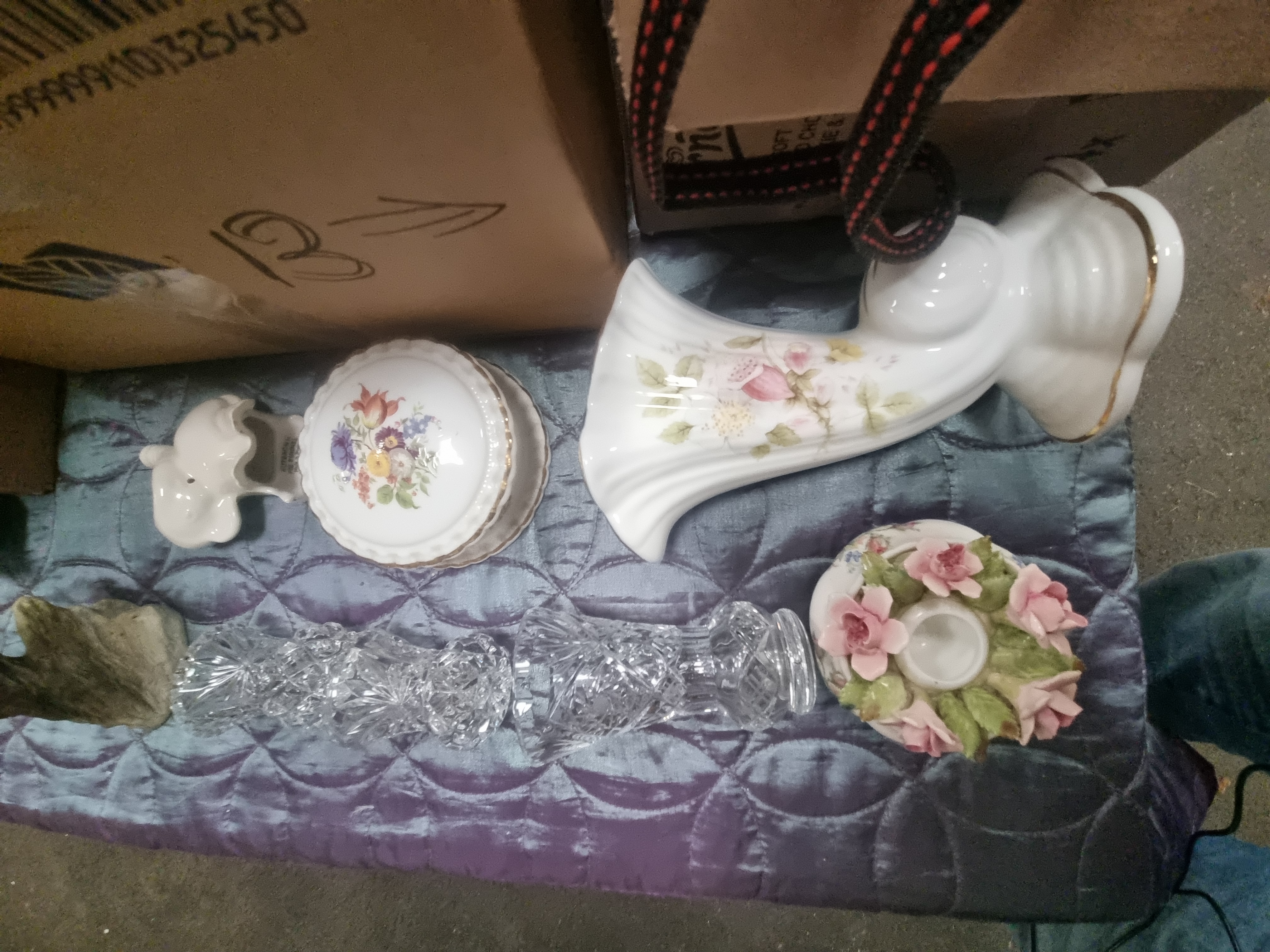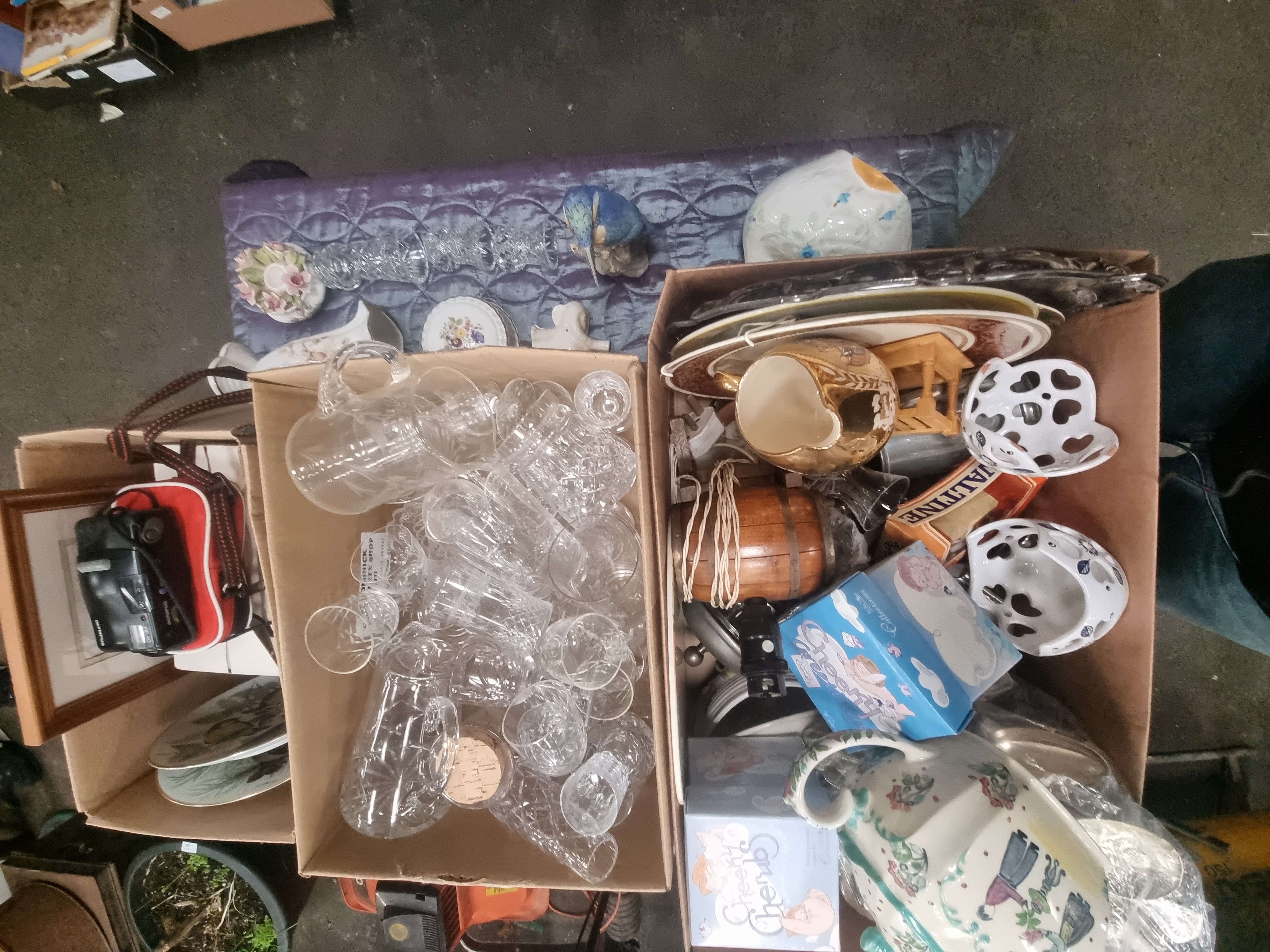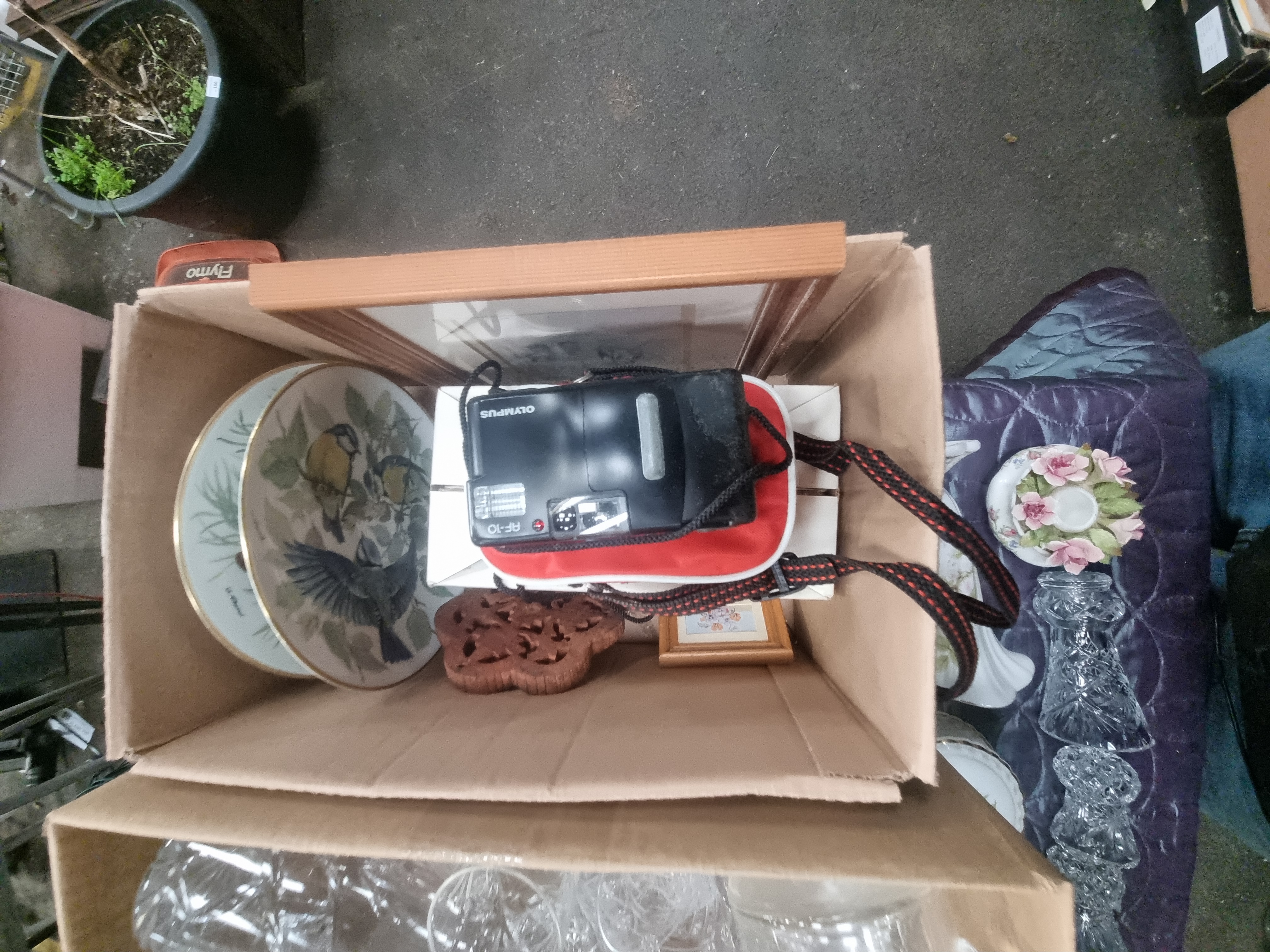The items appear in varied condition across the group. Some pieces retain their original retail packaging. General surface wear and minor rubbing to gilding are visible on certain ceramic and glass items. The Olympus camera is untested.