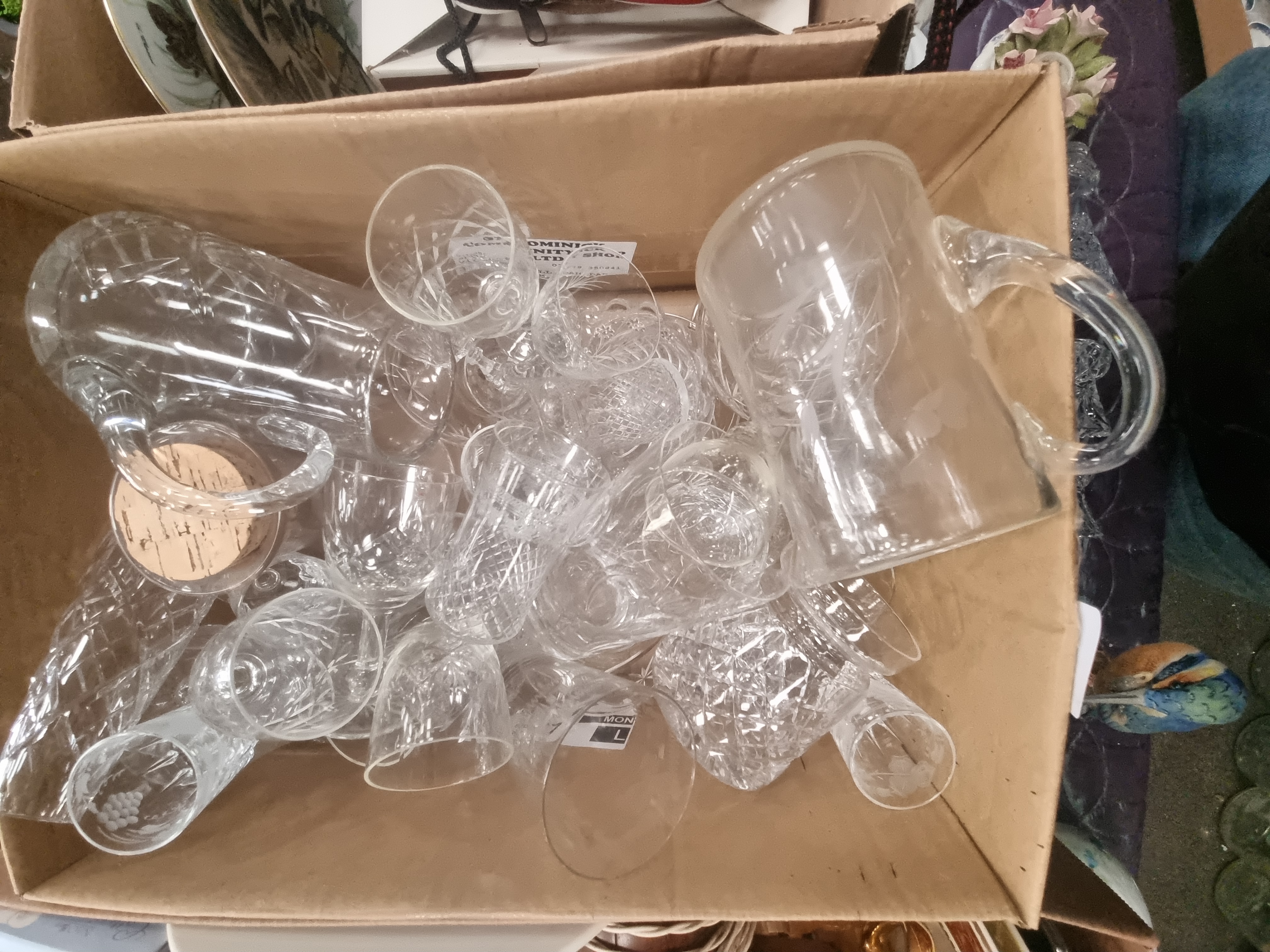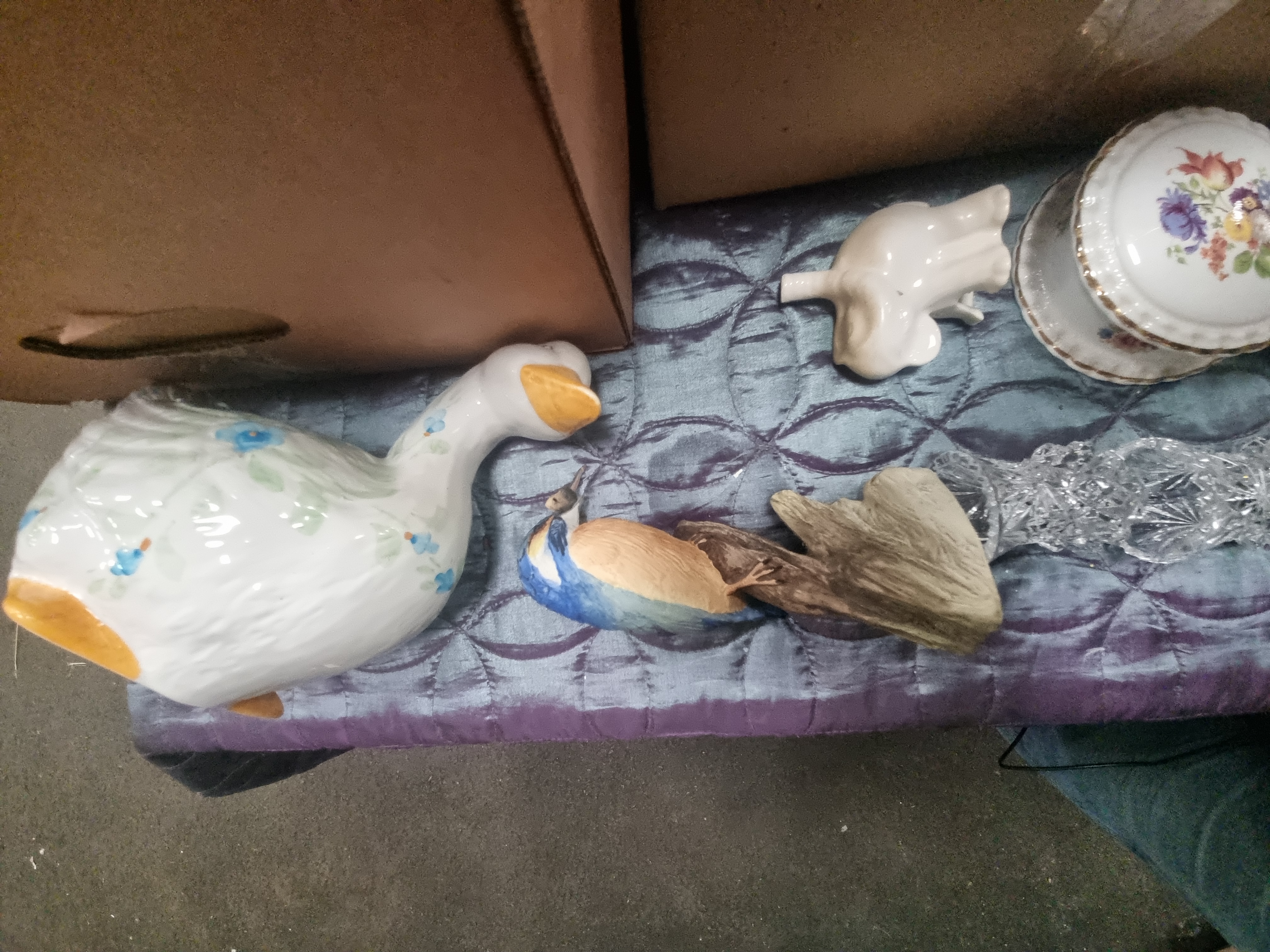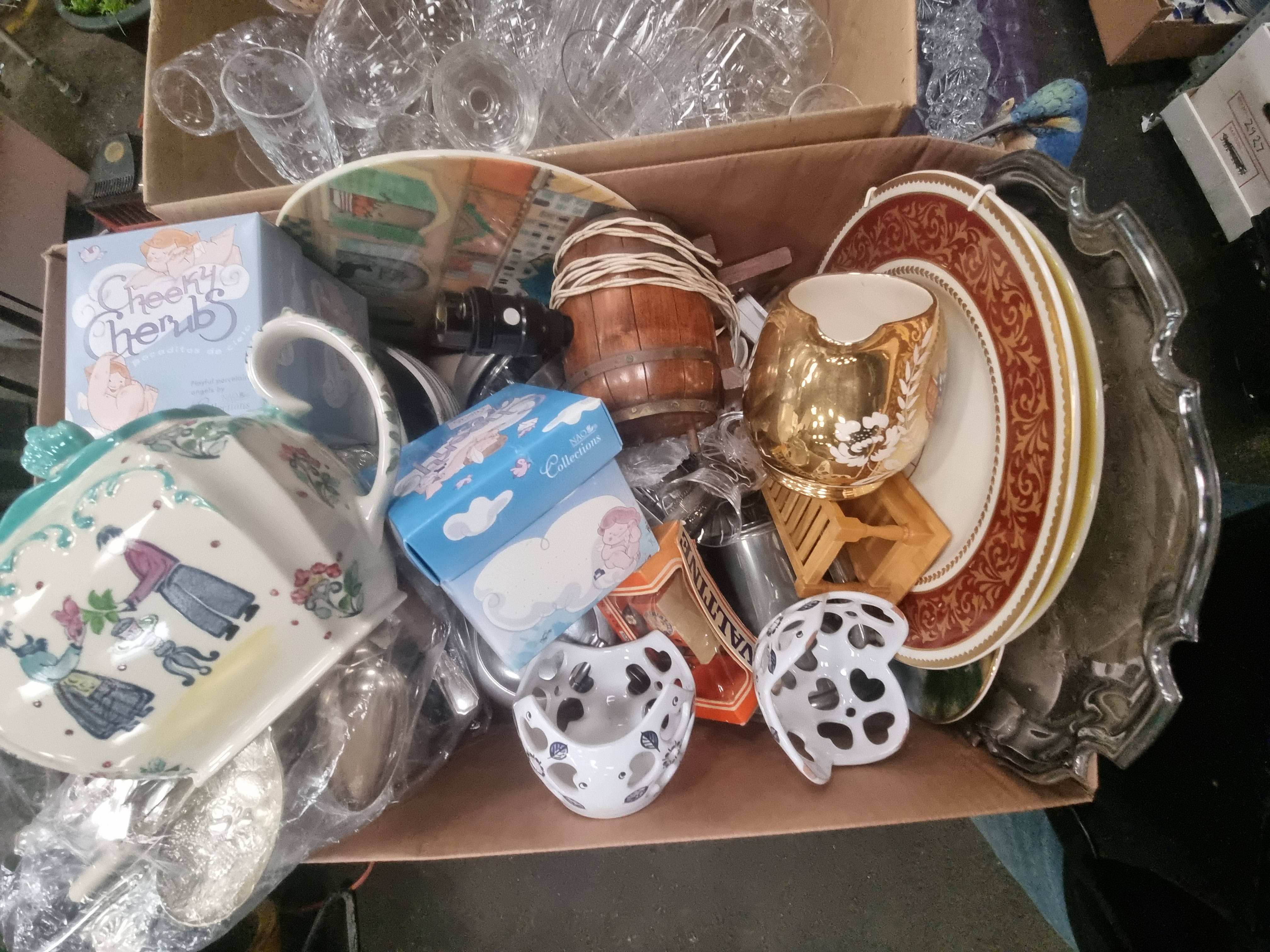An assortment of decorative arts and collectibles comprising various glassware, ceramics, and photographic equipment. The glass component includes clear cut glass items such as a pitcher, a tankard, and multiple drinking vessels featuring cross-hatch and grapevine motifs. Ceramic wares include a large teapot with figural transfer-printed decoration, a gold-toned glazed creamer, and two white tea light holders with heart-shaped piercings. The group also contains several porcelain figurines, notably a duck with floral sprays and a kingfisher on a naturalistic base, alongside floral-encrusted ornaments and a fan-shaped vase. Decorative plates with bird motifs and gilt scrolled borders are present. Retail packaging is included for NAO Collections and Cheeky Cherubs (pequeñitos de cielo). Other items include an Ovaltine branded piece, a small wooden novelty barrel, and a black Olympus AF-10 35mm compact camera with a red and black strap and case.
