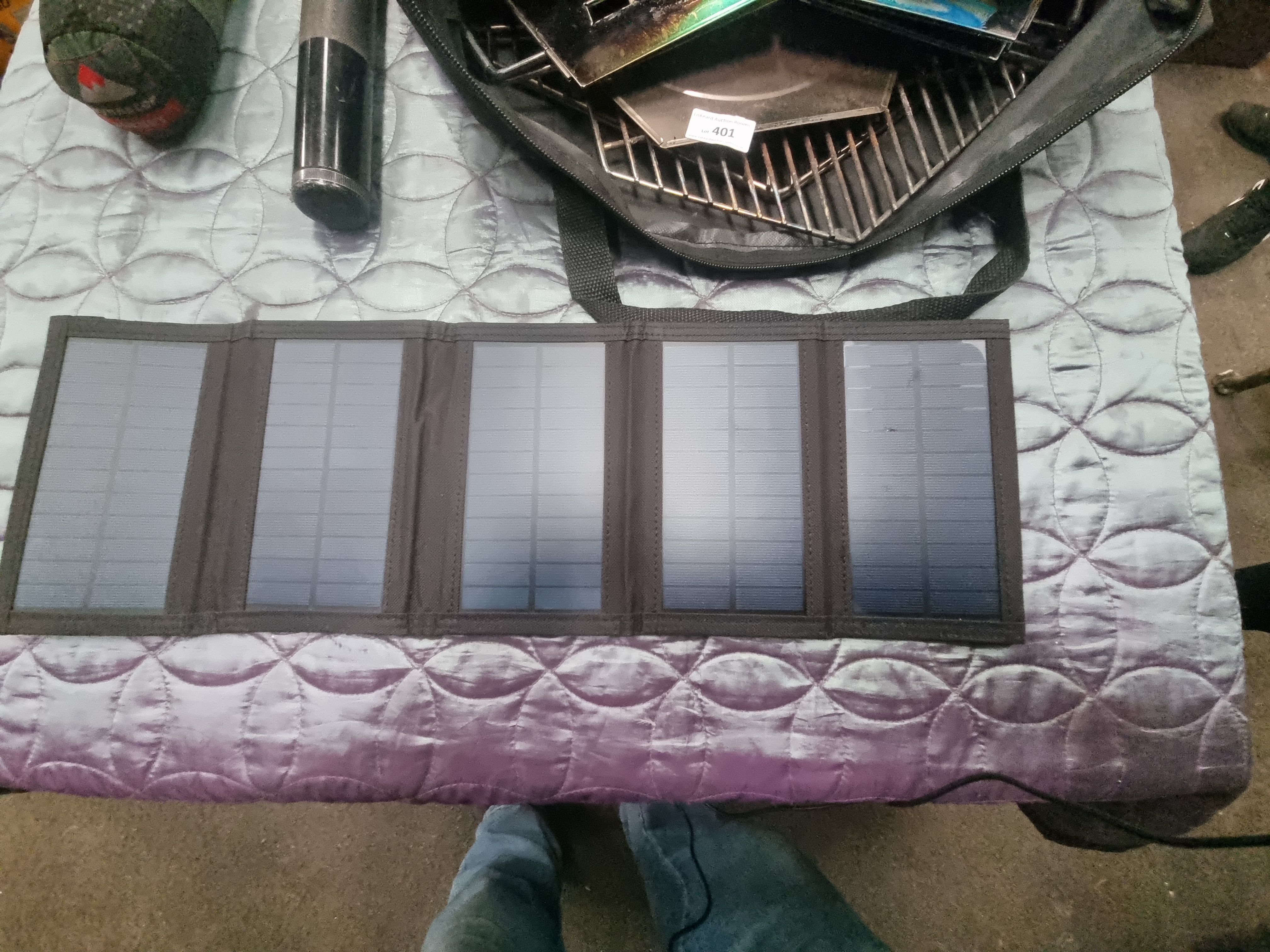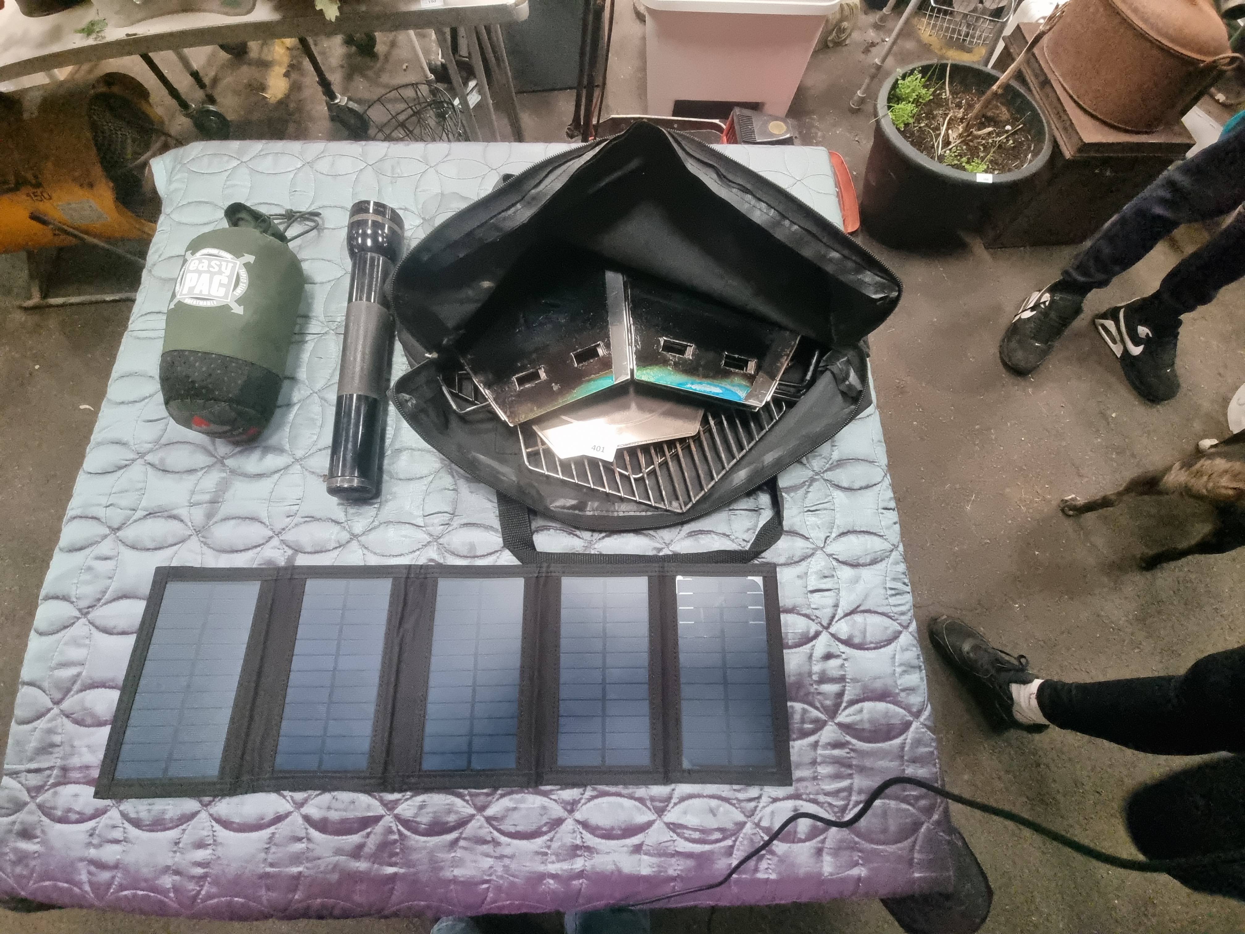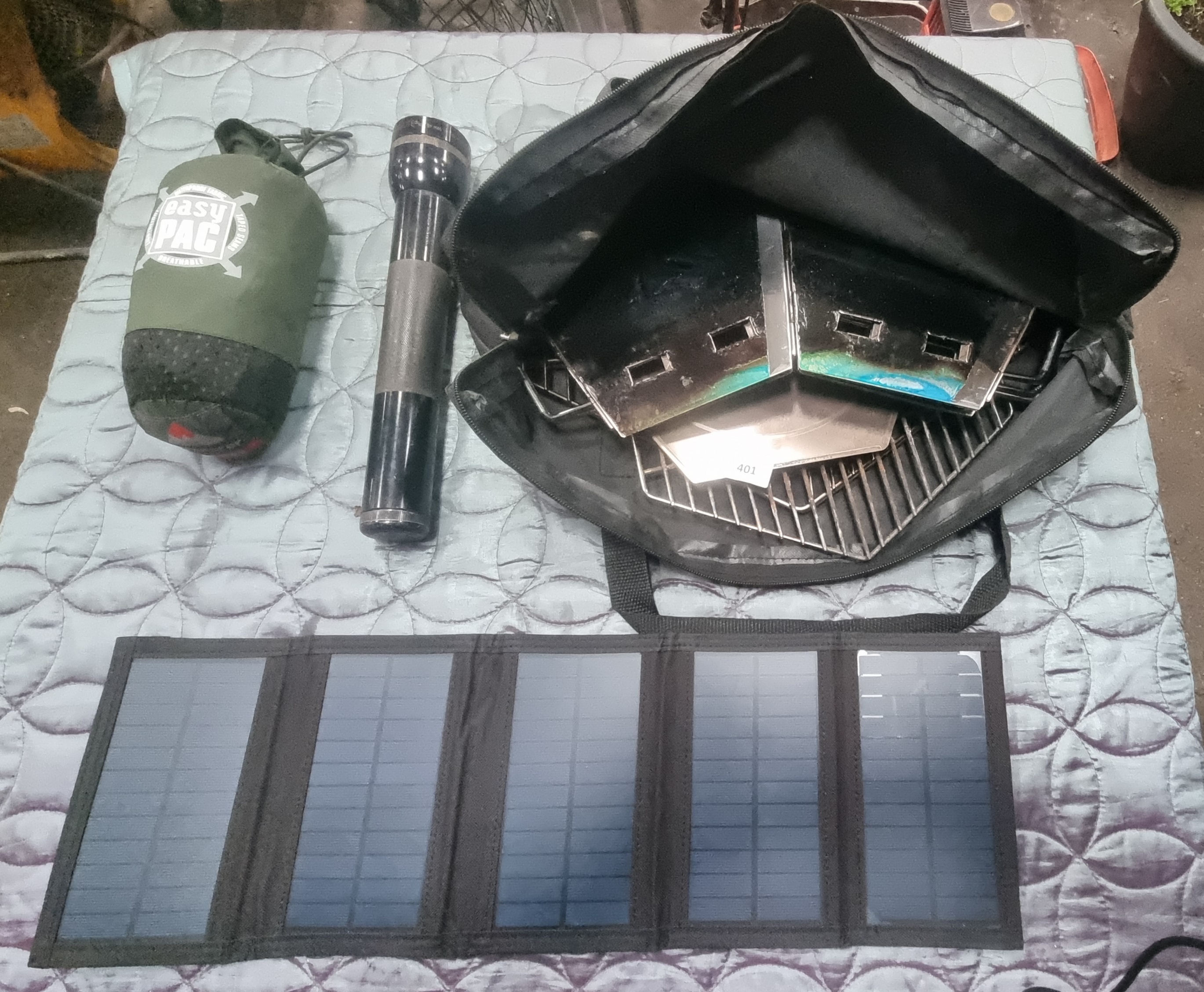 The items generally appear to be in good condition. The barbecue components retain original blue protective film, suggesting minimal use. The Maglite torch shows minor surface scuffing and wear consistent with handling. The fabric elements of the solar charger and stuff sack appear well-preserved with no visible tears or significant staining.