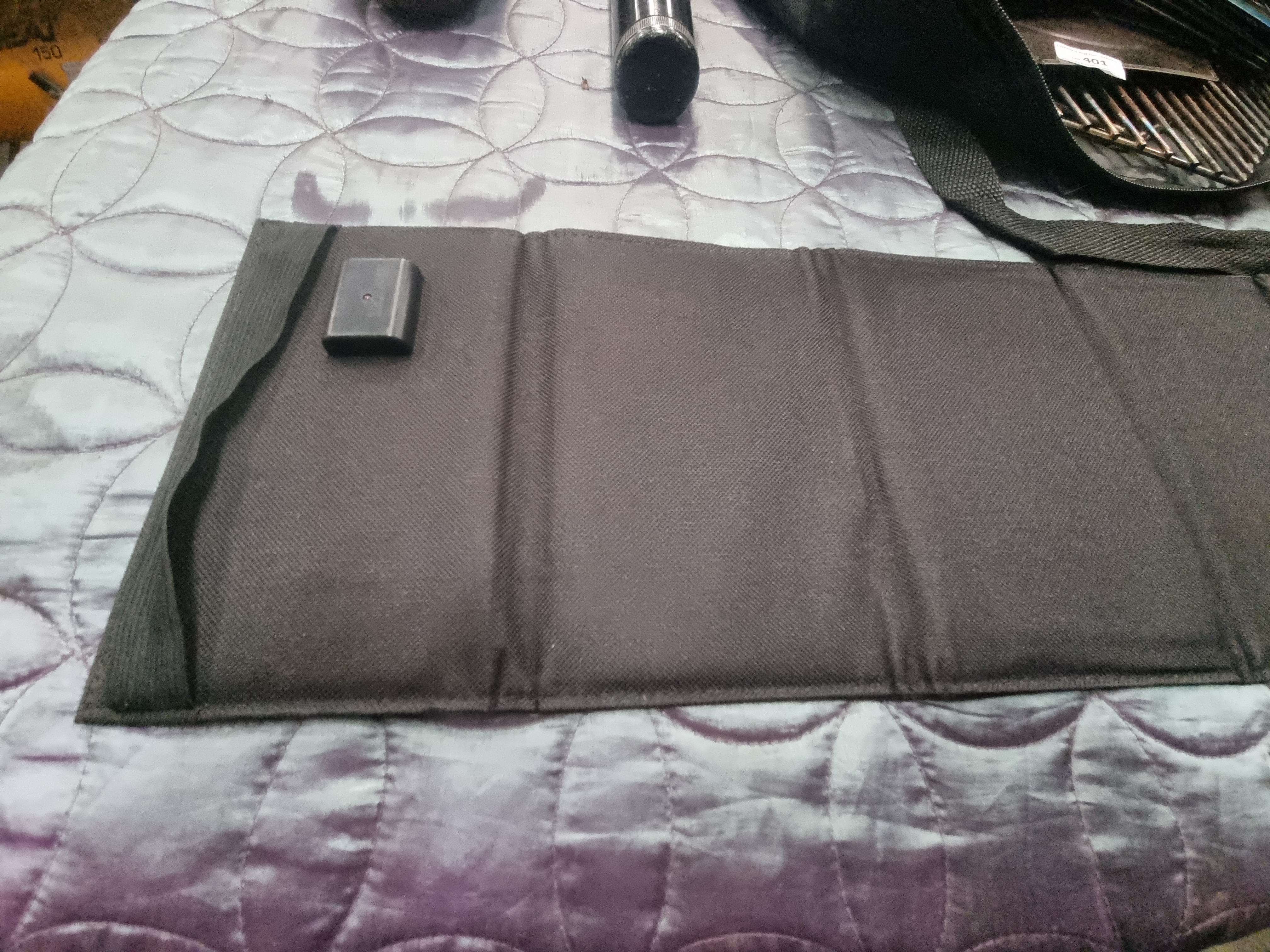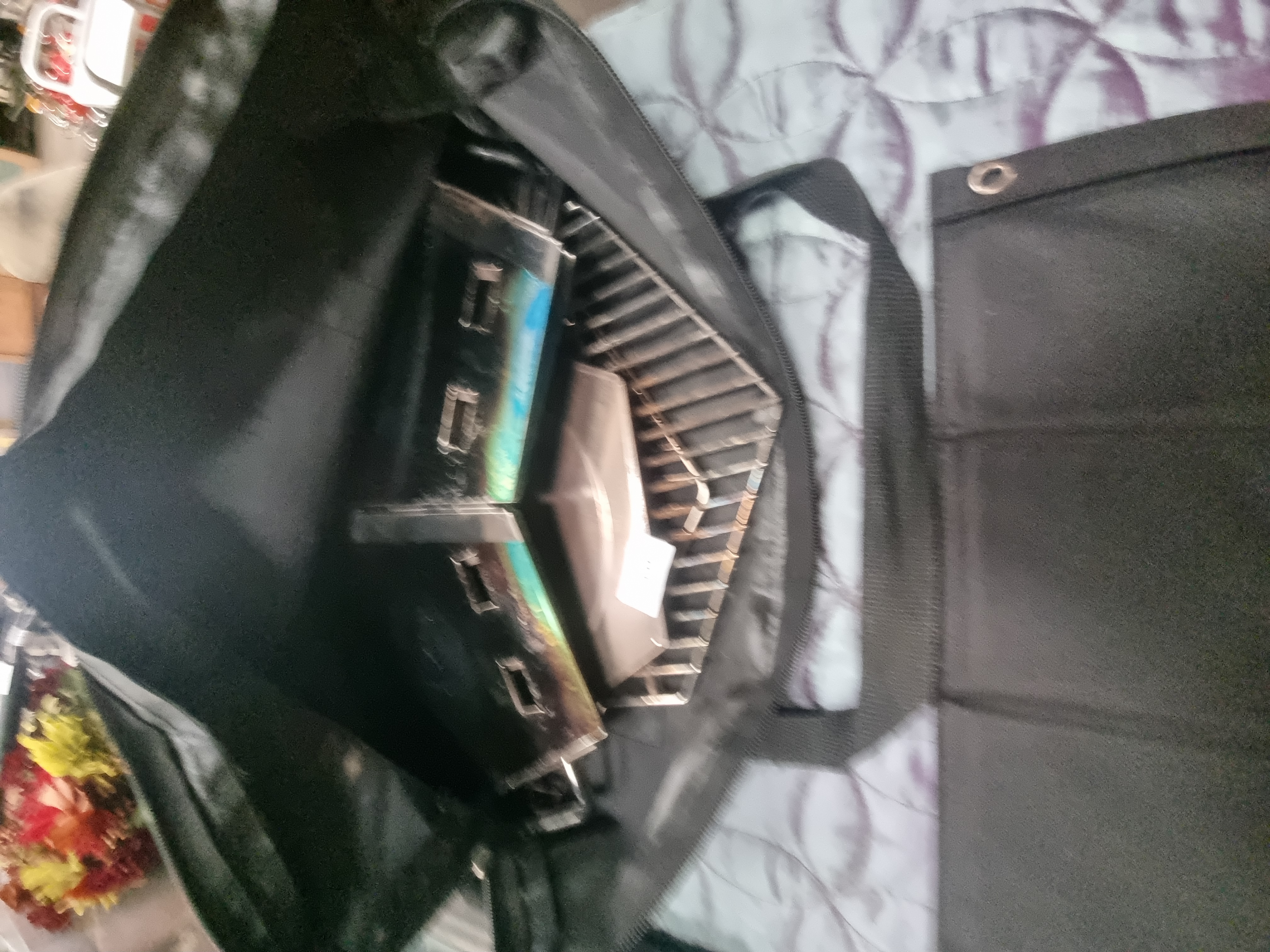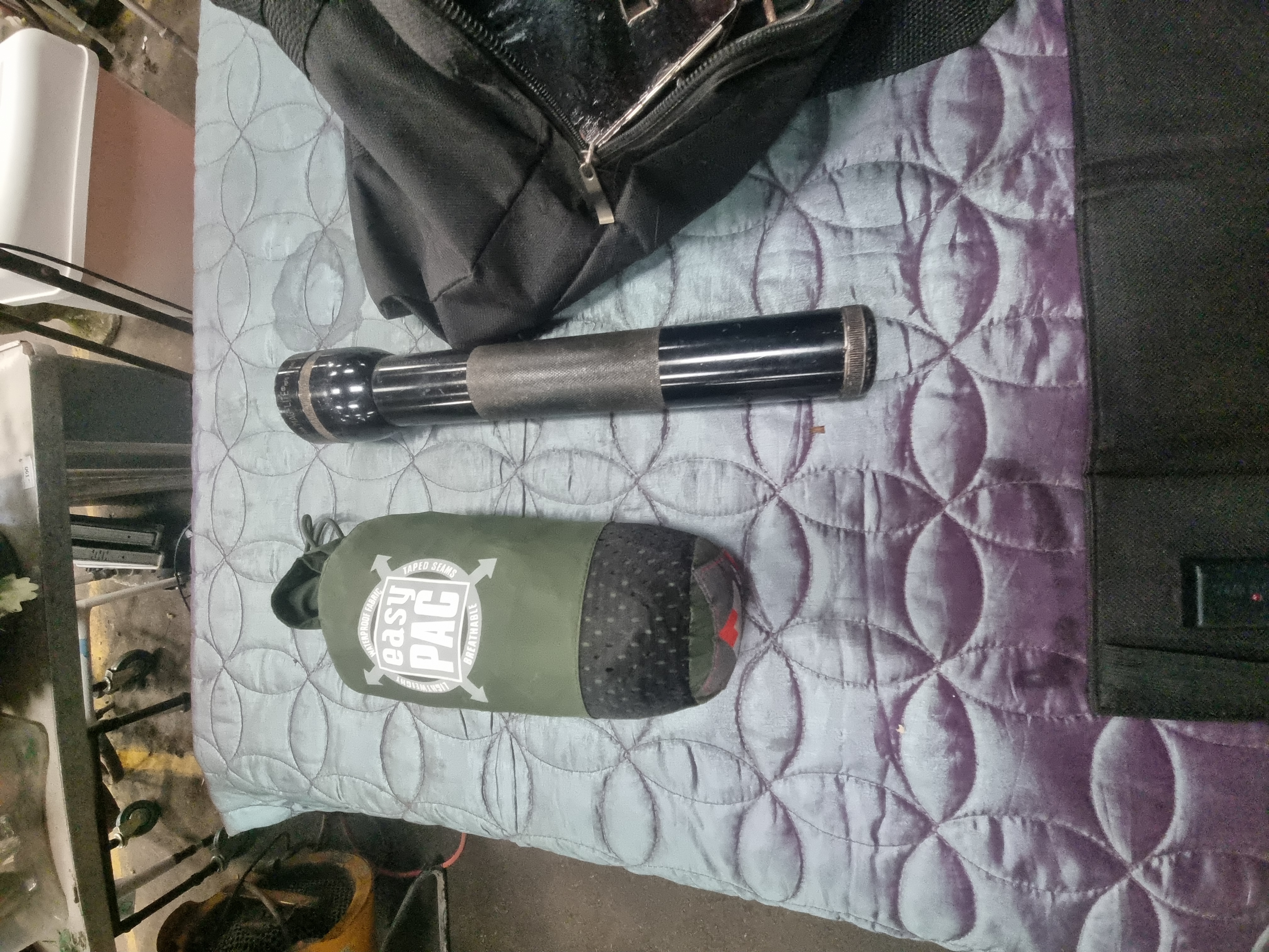 The items generally appear to be in good condition. The barbecue components retain original blue protective film, suggesting minimal use. The Maglite torch shows minor surface scuffing and wear consistent with handling. The fabric elements of the solar charger and stuff sack appear well-preserved with no visible tears or significant staining.