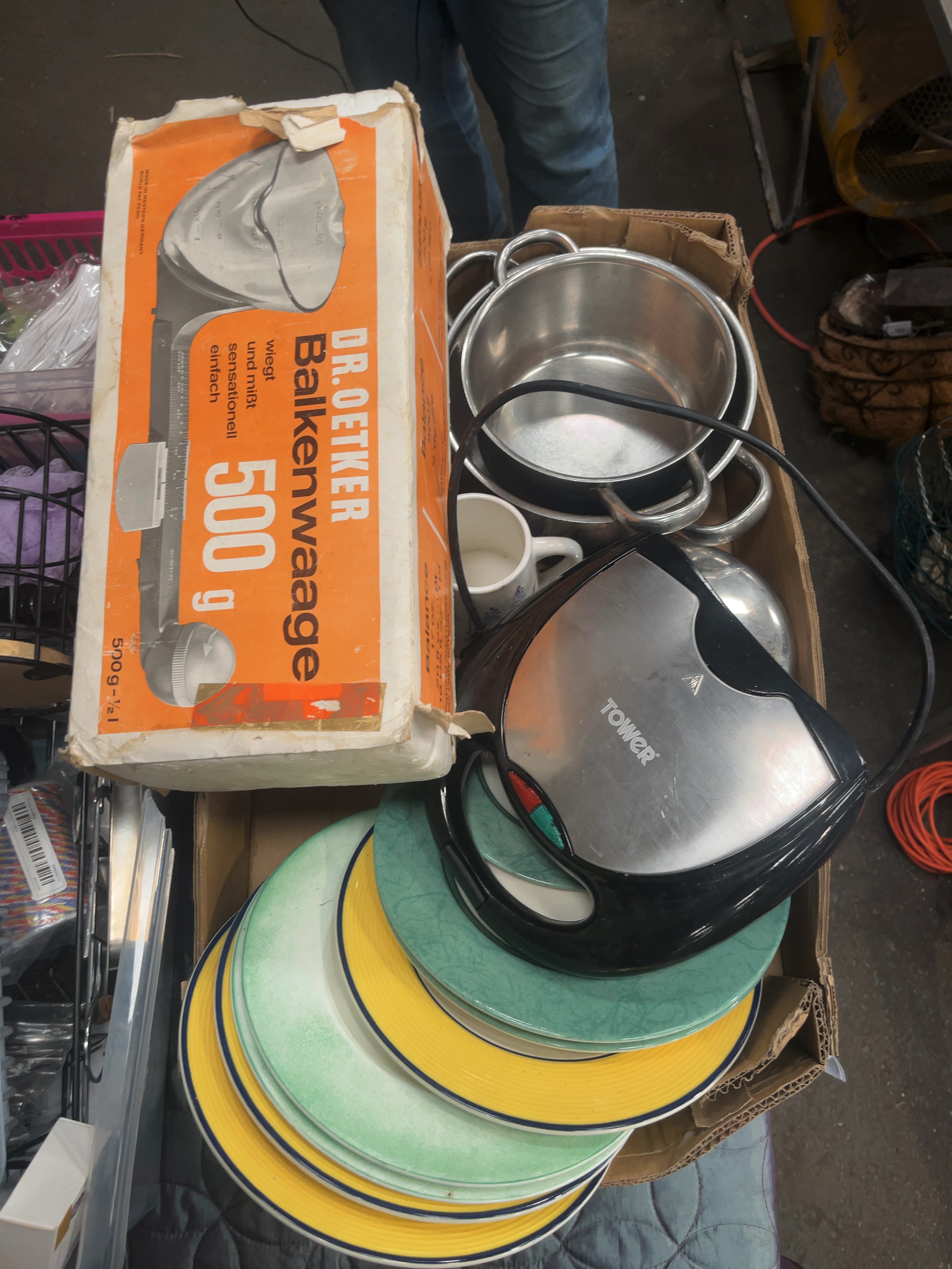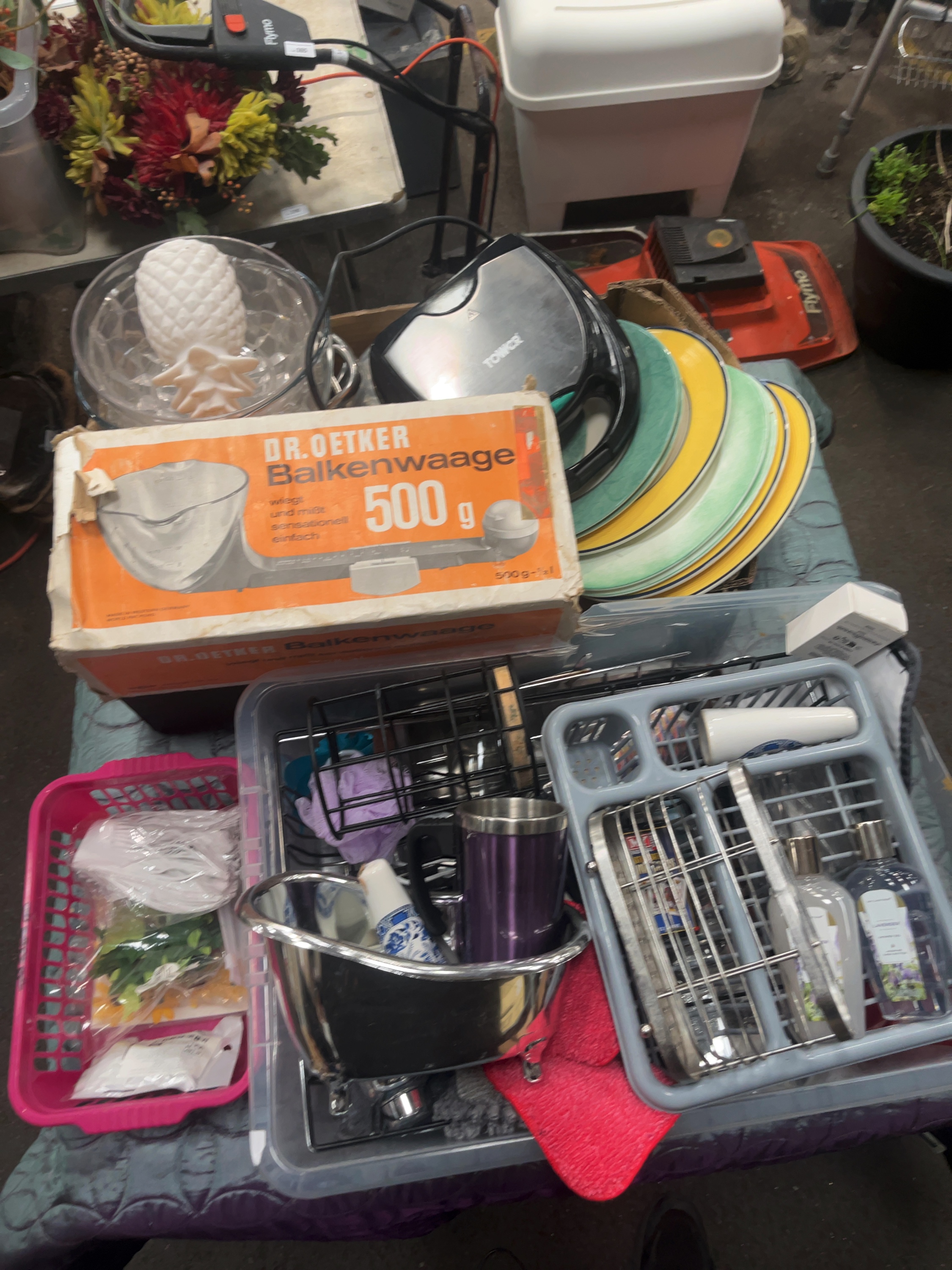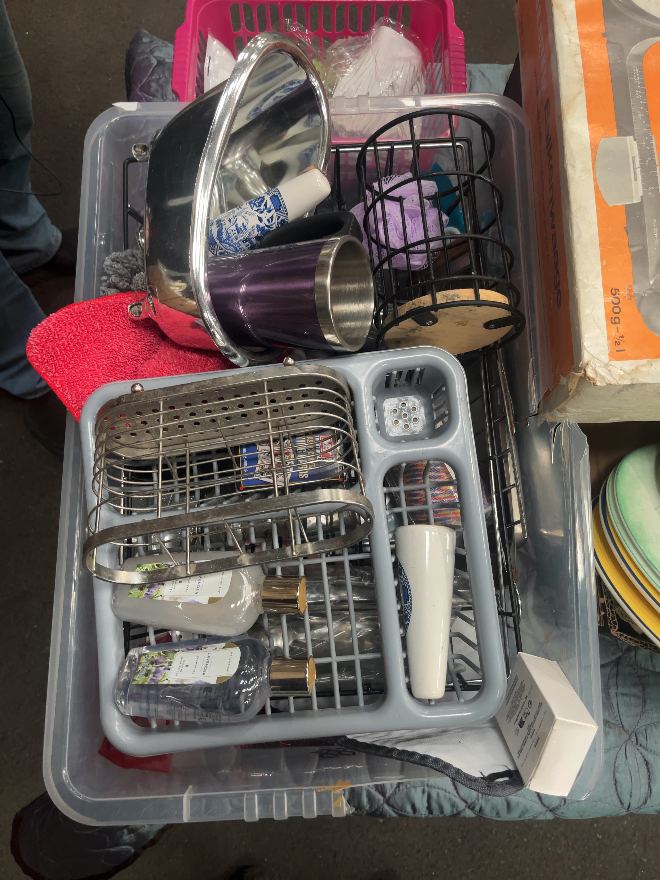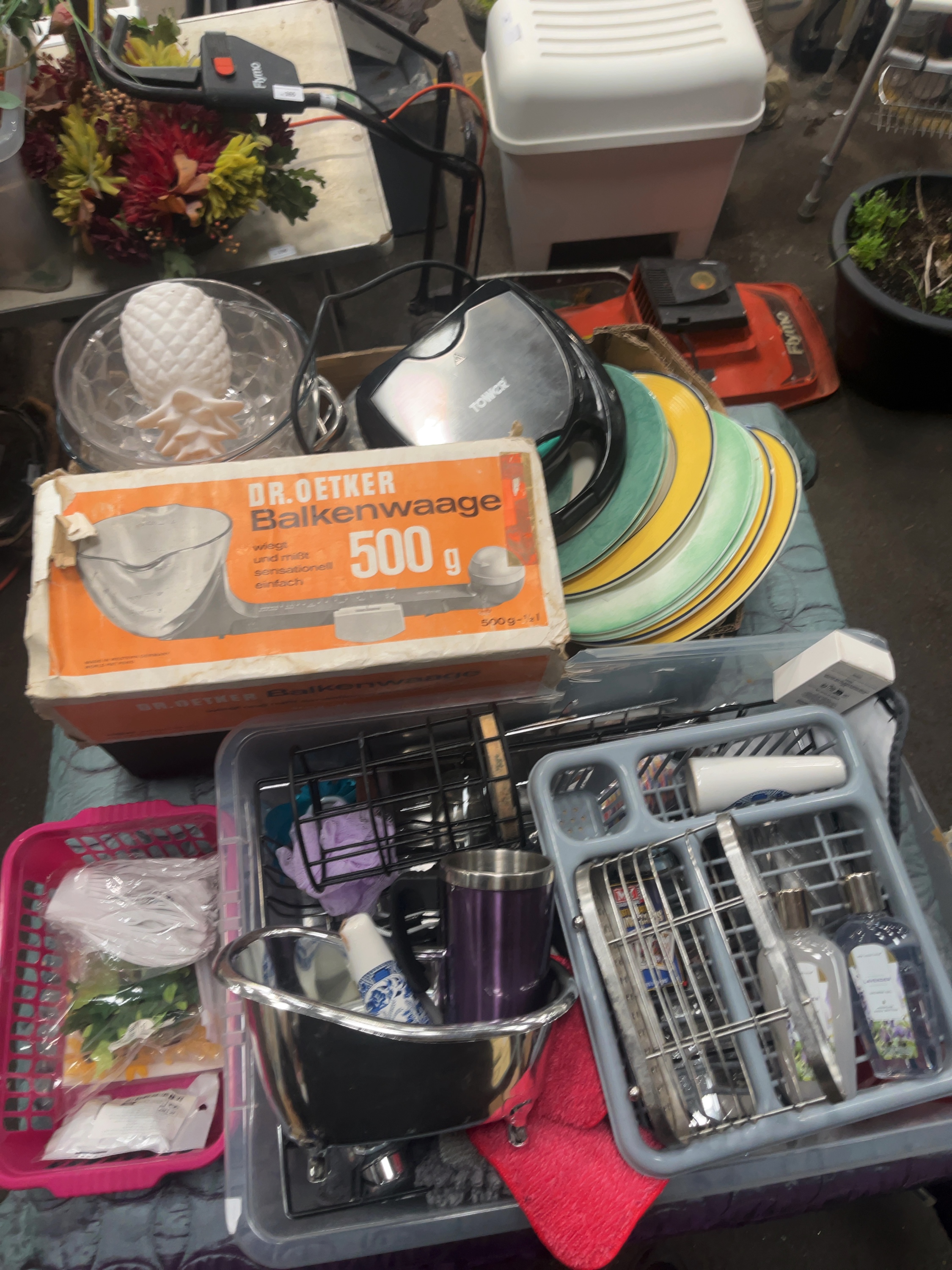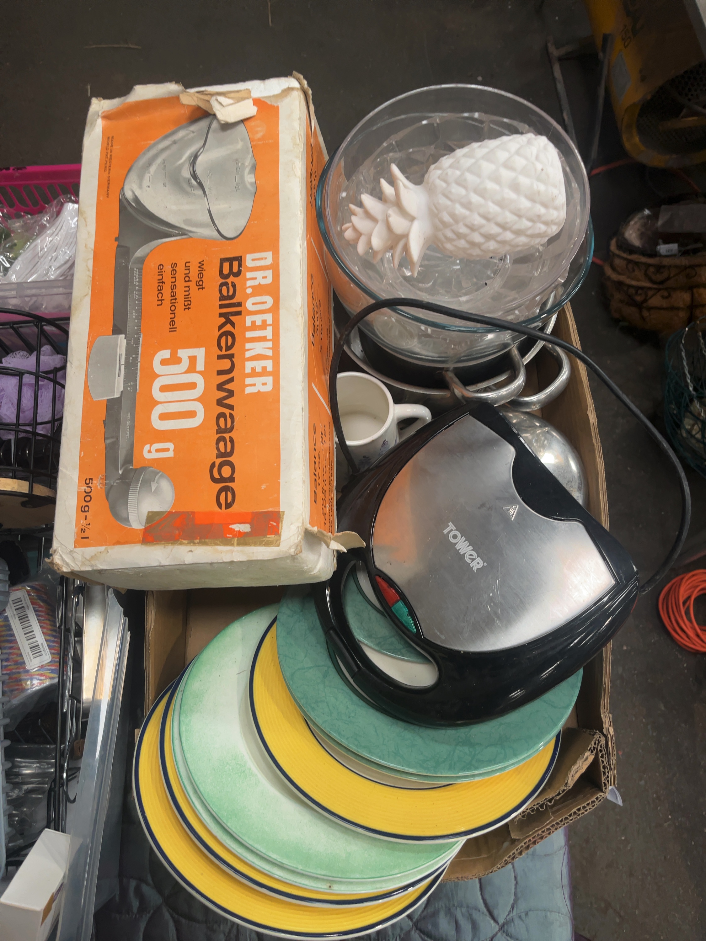 This lot comprises a diverse collection of household goods, kitchen equipment, and personal care products. Featured items include a Tower brand sandwich maker with a black and silver-tone finish and a vintage Dr. Oetker Balkenwaage 500g beam scale, which remains in its original commercial box marked Made in Western Germany. The kitchenware selection includes several stainless steel saucepans, a clear glass bowl with a white pineapple-shaped decorative lid, and a collection of glazed ceramic plates in yellow and green colour palettes with blue rim accents. Personal care and novelty items consist of two bottles of Spa Savvy lavender and shea butter shower gel, a purple insulated travel mug, a miniature chrome-effect decorative roll-top bathtub, and a purple bath loofah. Household organisation items include a grey plastic dish drying rack, a wire cutlery drainer, and multiple plastic storage baskets in pink and clear. The items are primarily loose or grouped within larger plastic storage bins and a cardboard box.