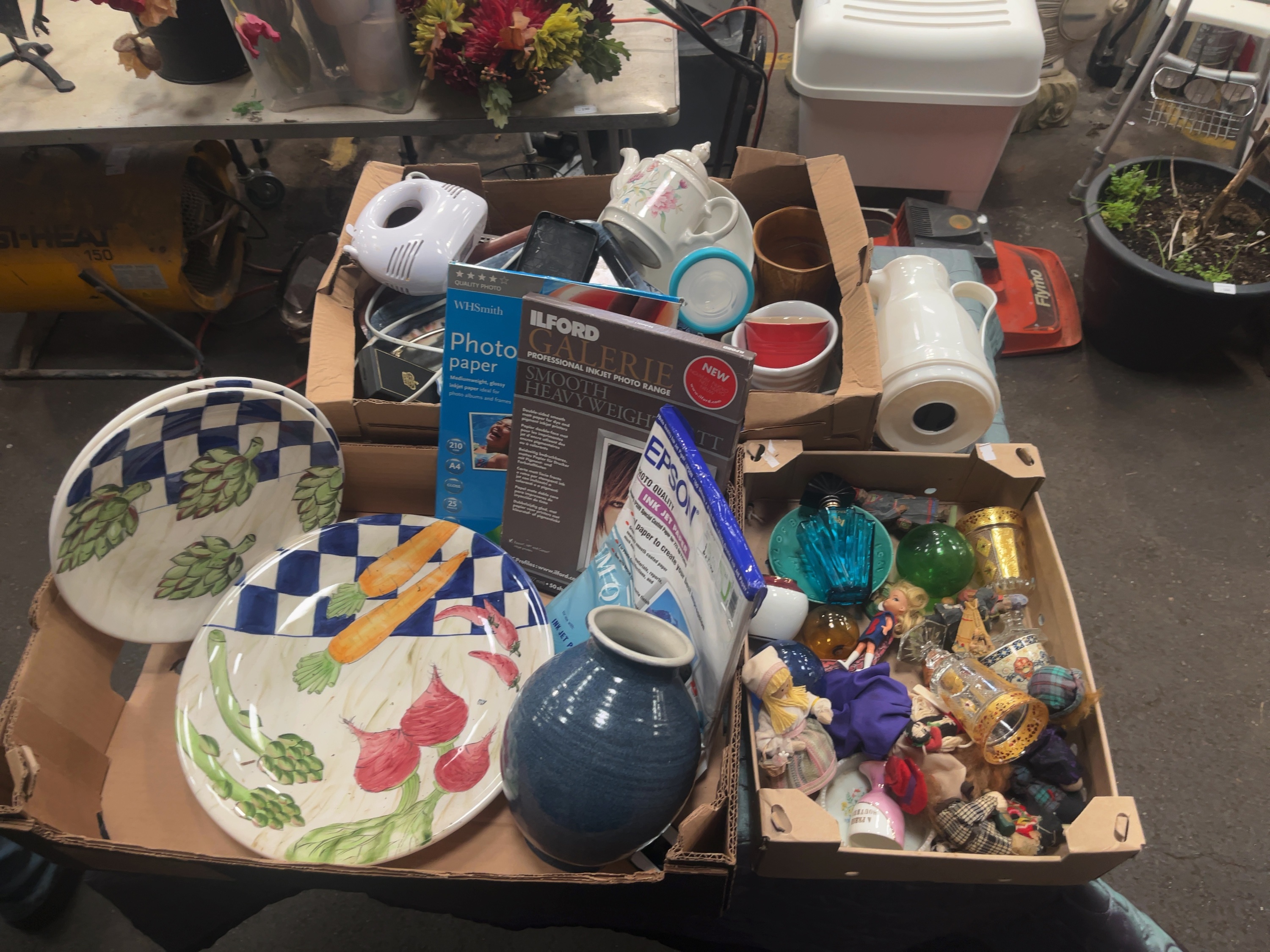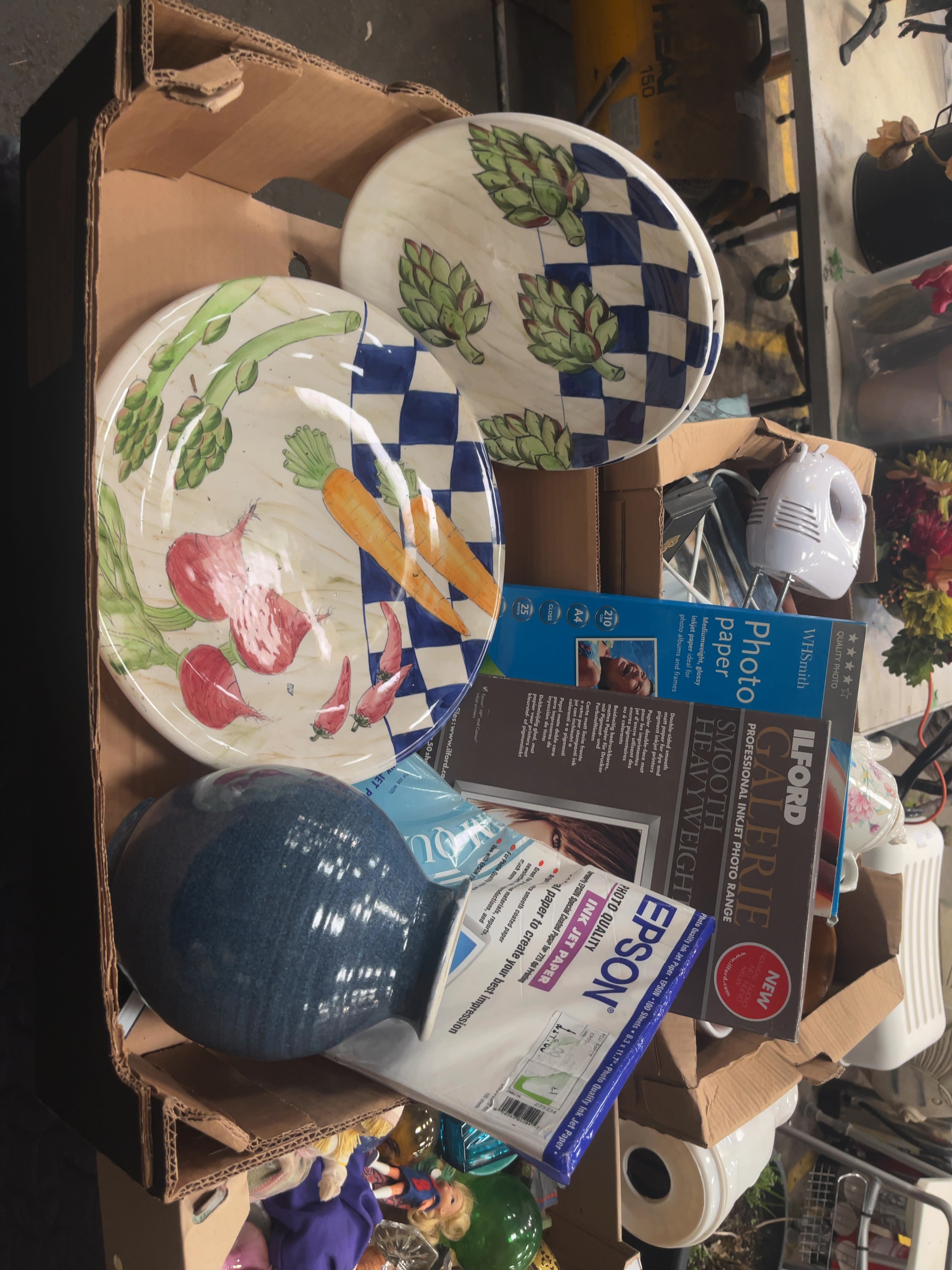 This lot consists of a diverse collection of household items, ceramics, and office supplies distributed across several cardboard boxes. The ceramic and tableware selection includes a pair of large hand-painted display plates featuring vegetable motifs including carrots and artichokes with blue-and-white chequered borders. Other ceramic items include a floral-patterned teapot, a blue glazed stoneware vase, several terracotta and ceramic bowls, and a white thermal jug. The glassware includes a turquoise art glass bottle with a black fan-shaped stopper, bearing the mark Veronese above a stylised V logo. Also included is a collection of glass paperweights in blue, green, and amber, alongside gilt-detailed glassware and a green commemorative ceramic plate marked with the date 1951. The lot contains a variety of collectibles such as a cloth souvenir doll in traditional dress and a small fashion doll. The photography and office supply component includes multiple packs of professional inkjet photo paper from brands including Epson, Ilford Galerie Smooth Heavyweight range, and WHSmith. Small domestic appliances include a white electric hand mixer with accompanying beaters.