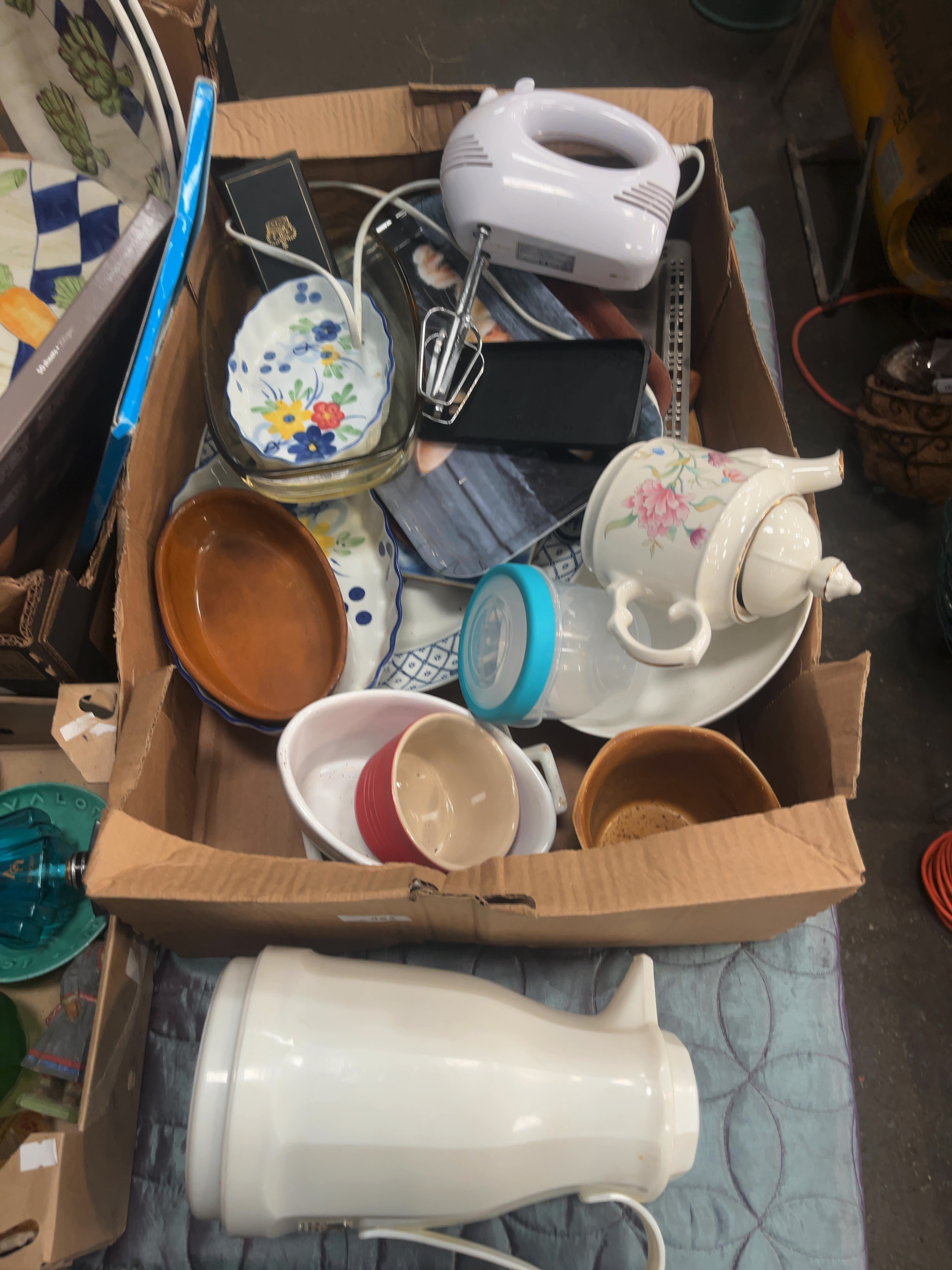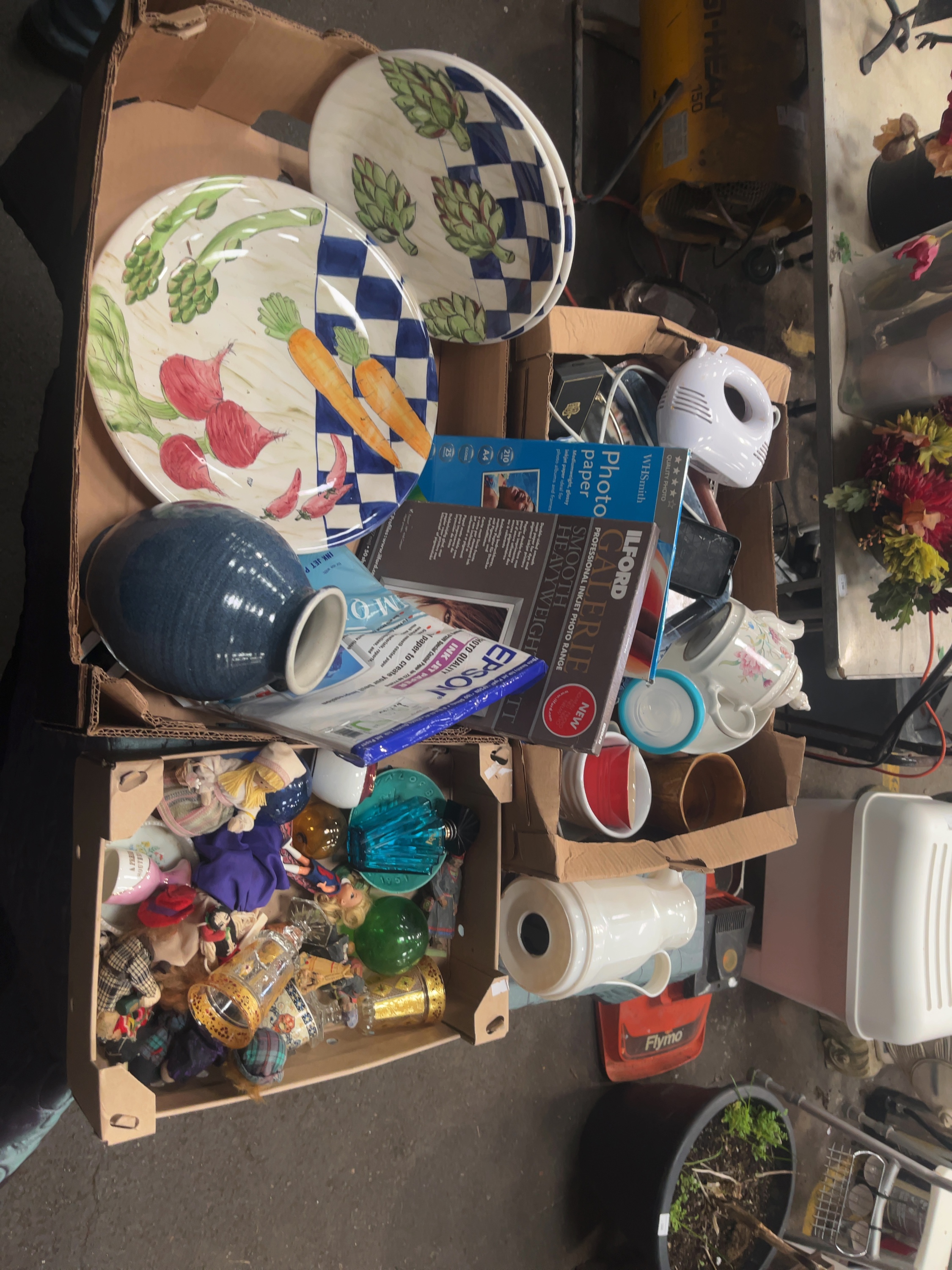 Items are in mixed, used condition consistent with estate clearance. Ceramics and glassware are presented loose in boxes without individual protection and may show surface wear or minor abrasions. Photo paper remains in original retail sleeves, although some outer packaging shows signs of shelf wear. Electrical items are untested.