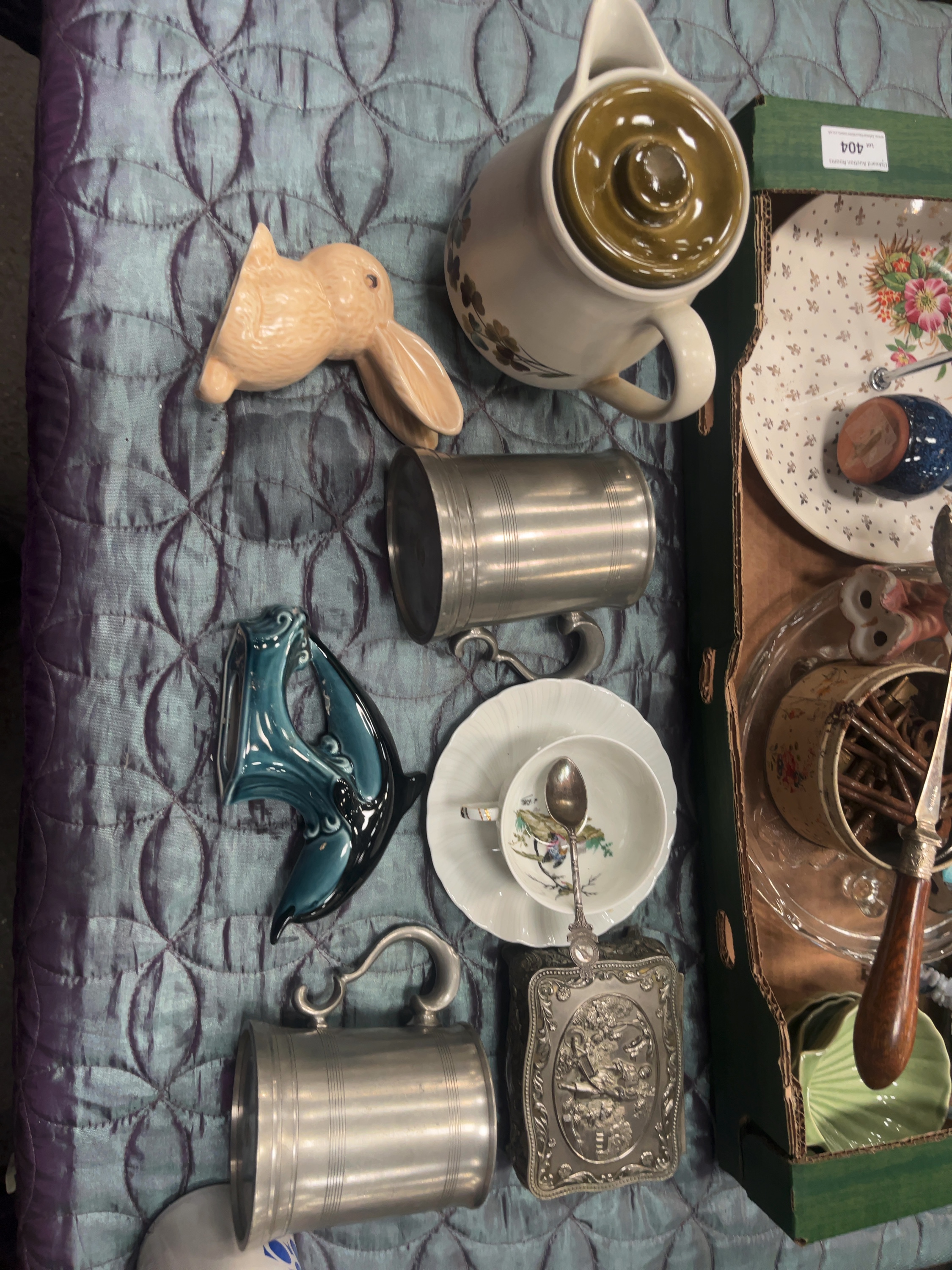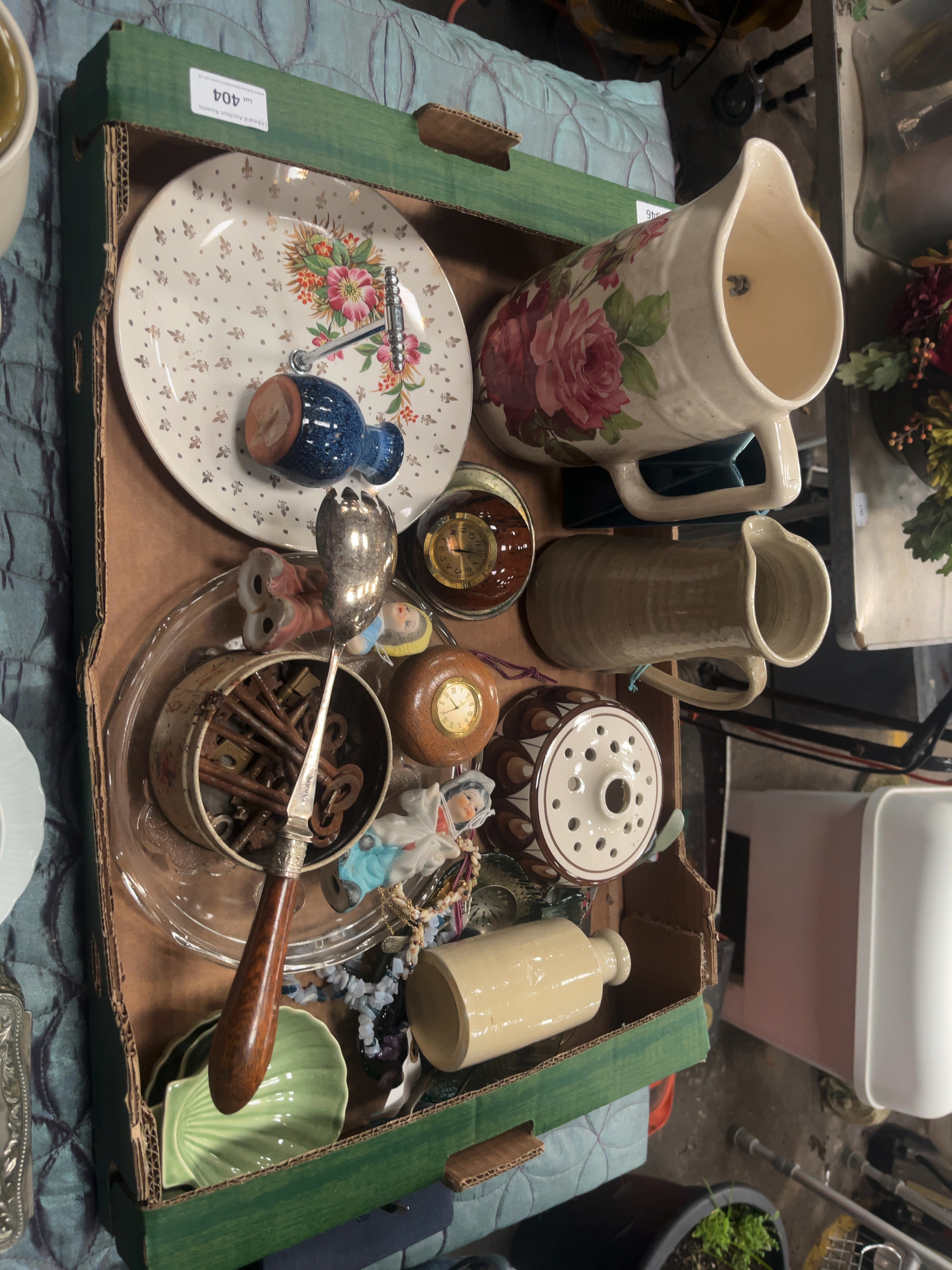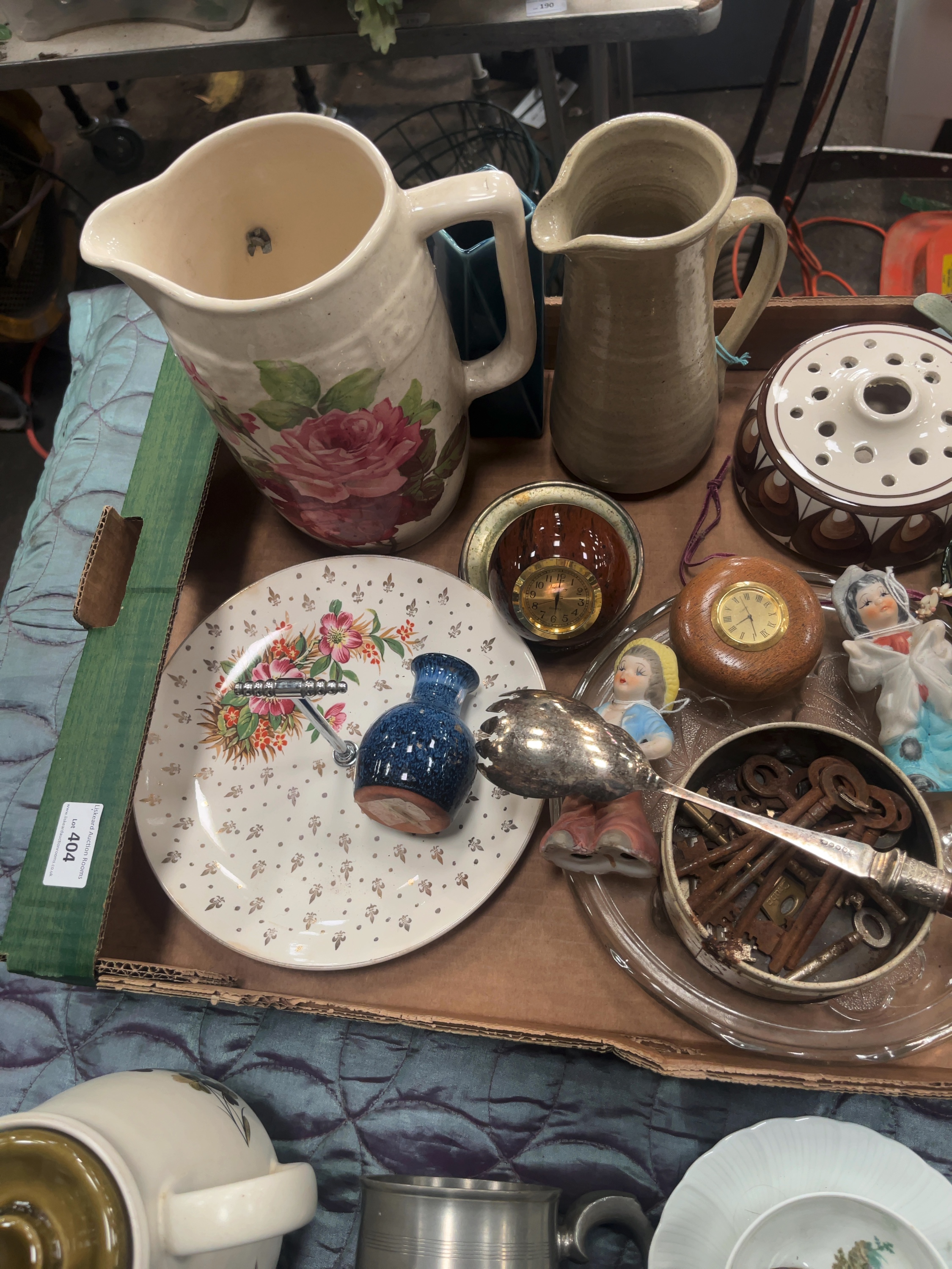 A collection of various decorative and functional items comprising ceramics, metalware, and domestic objects. The ceramic group includes a large pitcher with a transfer-printed pink rose motif, a stoneware jug, and a teapot with a brown lid and floral decoration. Further ceramic items consist of a shell-shaped green dish, a teacup and saucer with a bird design, a cream-coloured crock, and a patterned circular flower frog. Figurative elements include a peach-coloured rabbit, a teal-glazed bird, and two small figurines of children. Metalware is represented by two tankards with scrolled handles, a rectangular metal box with embossed tavern-style scenes in relief, and a metal tin containing a group of rusted iron keys. The lot also contains two small circular wooden-cased desk clocks, a glass platter, a floral-patterned plate with a metal cake-stand handle, and a large serving spoon with a turned wooden handle. A lot tag from Liskeard Auction Rooms for Lot 404 is present.