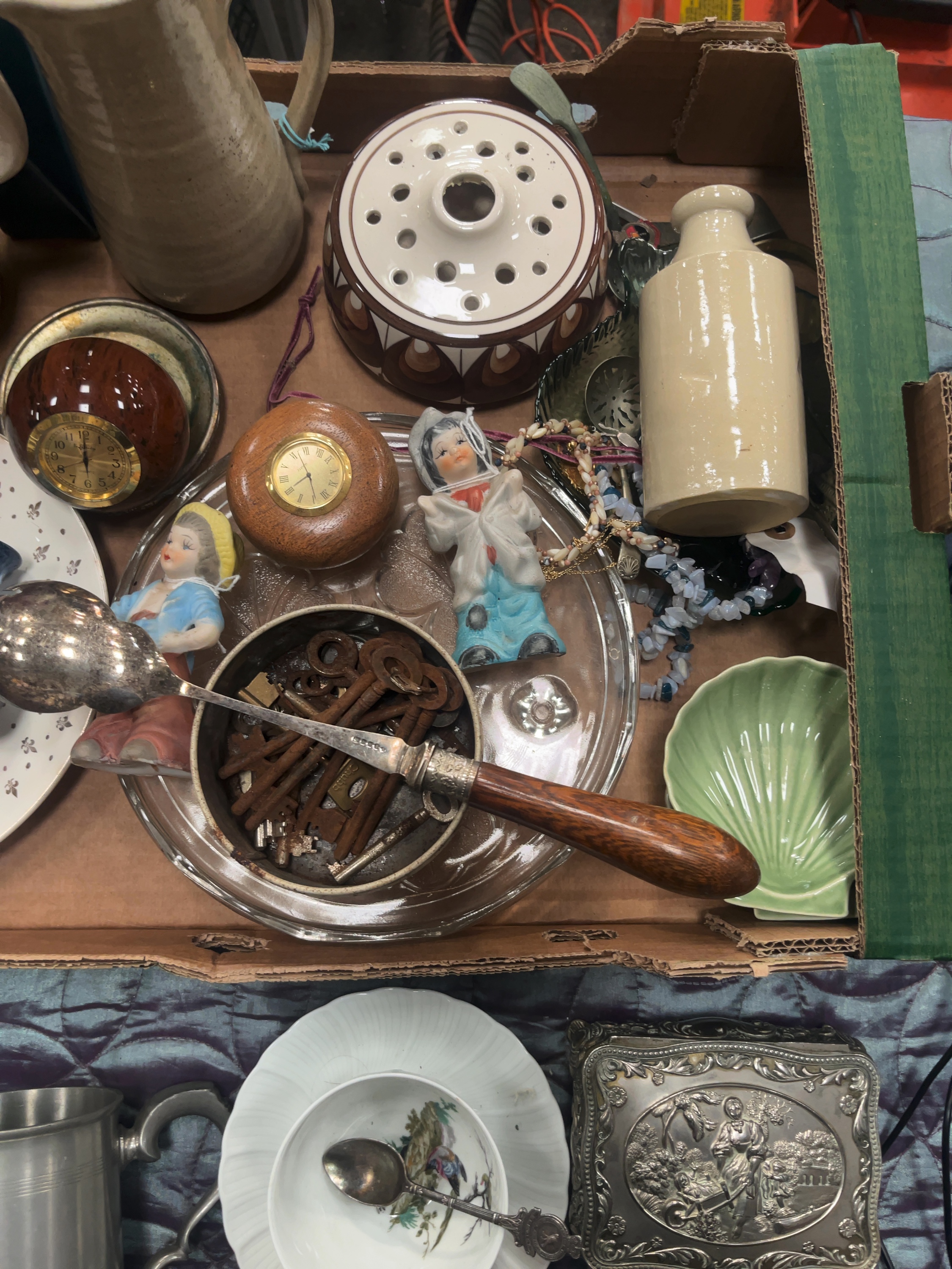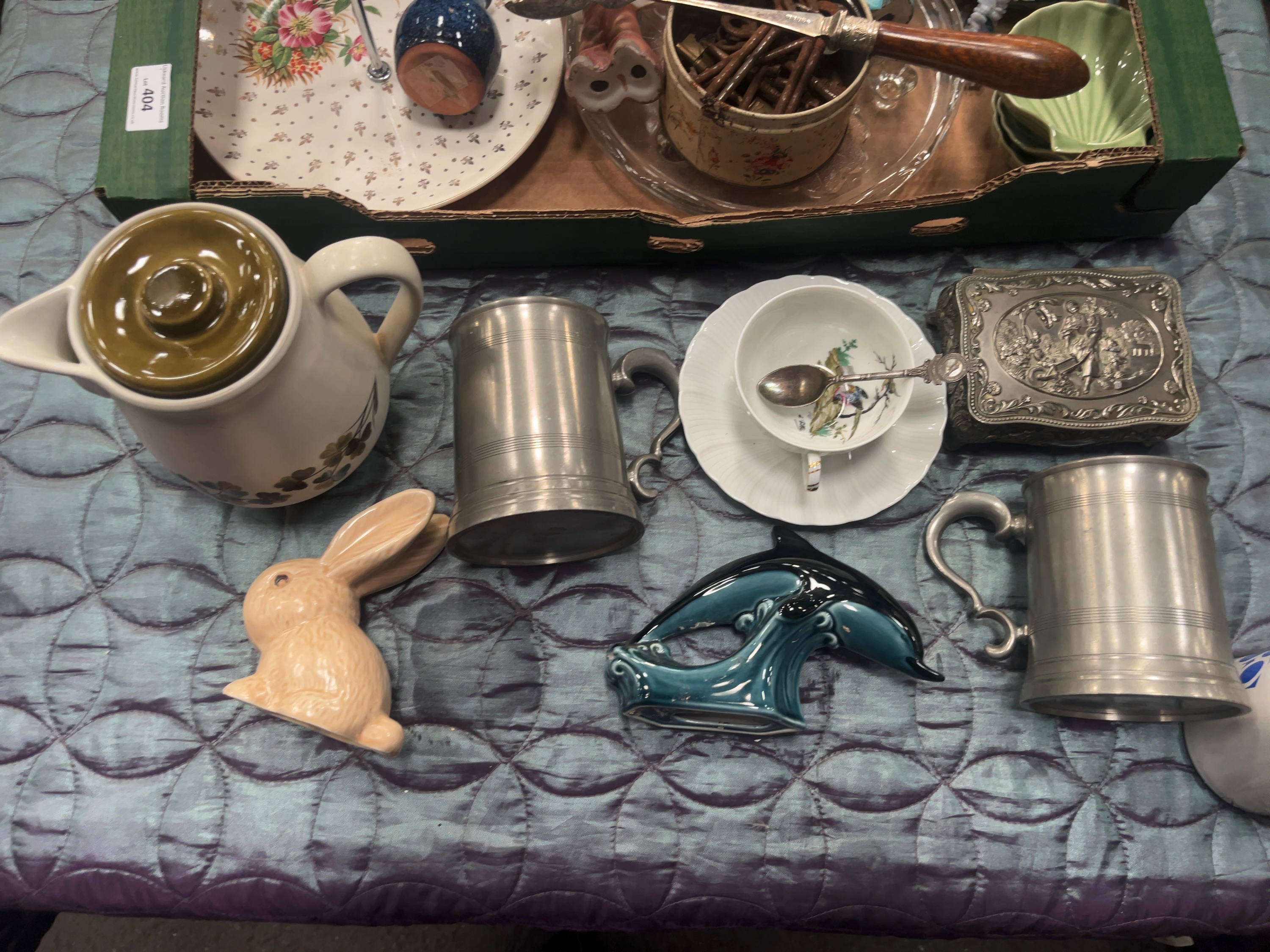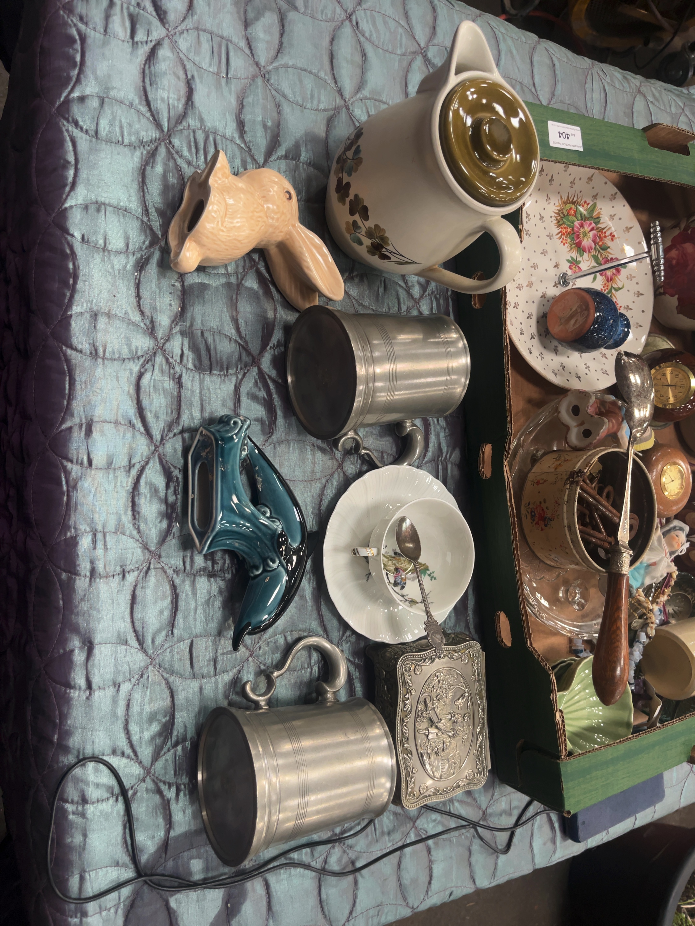 A collection of various decorative and functional items comprising ceramics, metalware, and domestic objects. The ceramic group includes a large pitcher with a transfer-printed pink rose motif, a stoneware jug, and a teapot with a brown lid and floral decoration. Further ceramic items consist of a shell-shaped green dish, a teacup and saucer with a bird design, a cream-coloured crock, and a patterned circular flower frog. Figurative elements include a peach-coloured rabbit, a teal-glazed bird, and two small figurines of children. Metalware is represented by two tankards with scrolled handles, a rectangular metal box with embossed tavern-style scenes in relief, and a metal tin containing a group of rusted iron keys. The lot also contains two small circular wooden-cased desk clocks, a glass platter, a floral-patterned plate with a metal cake-stand handle, and a large serving spoon with a turned wooden handle. A lot tag from Liskeard Auction Rooms for Lot 404 is present.