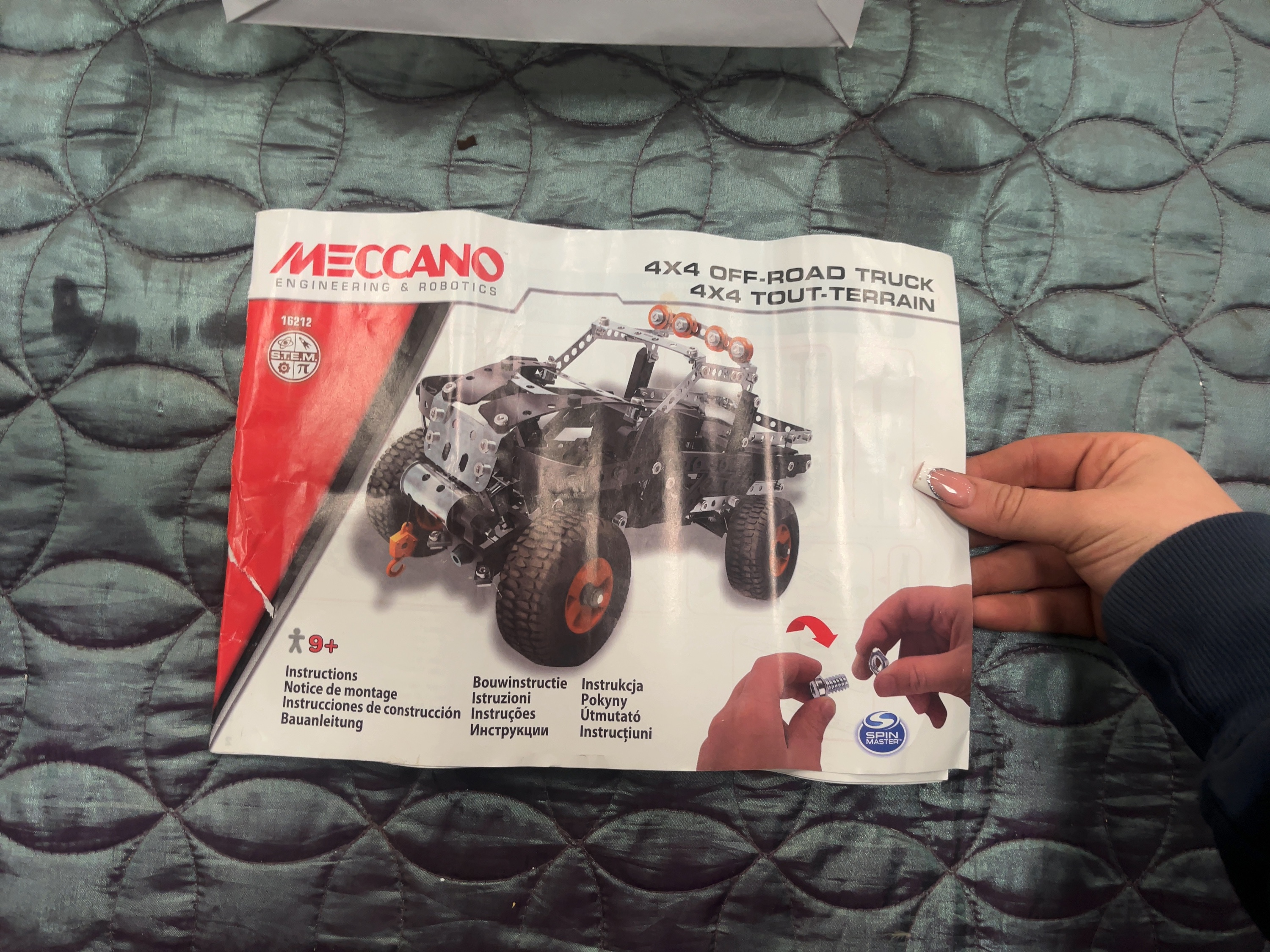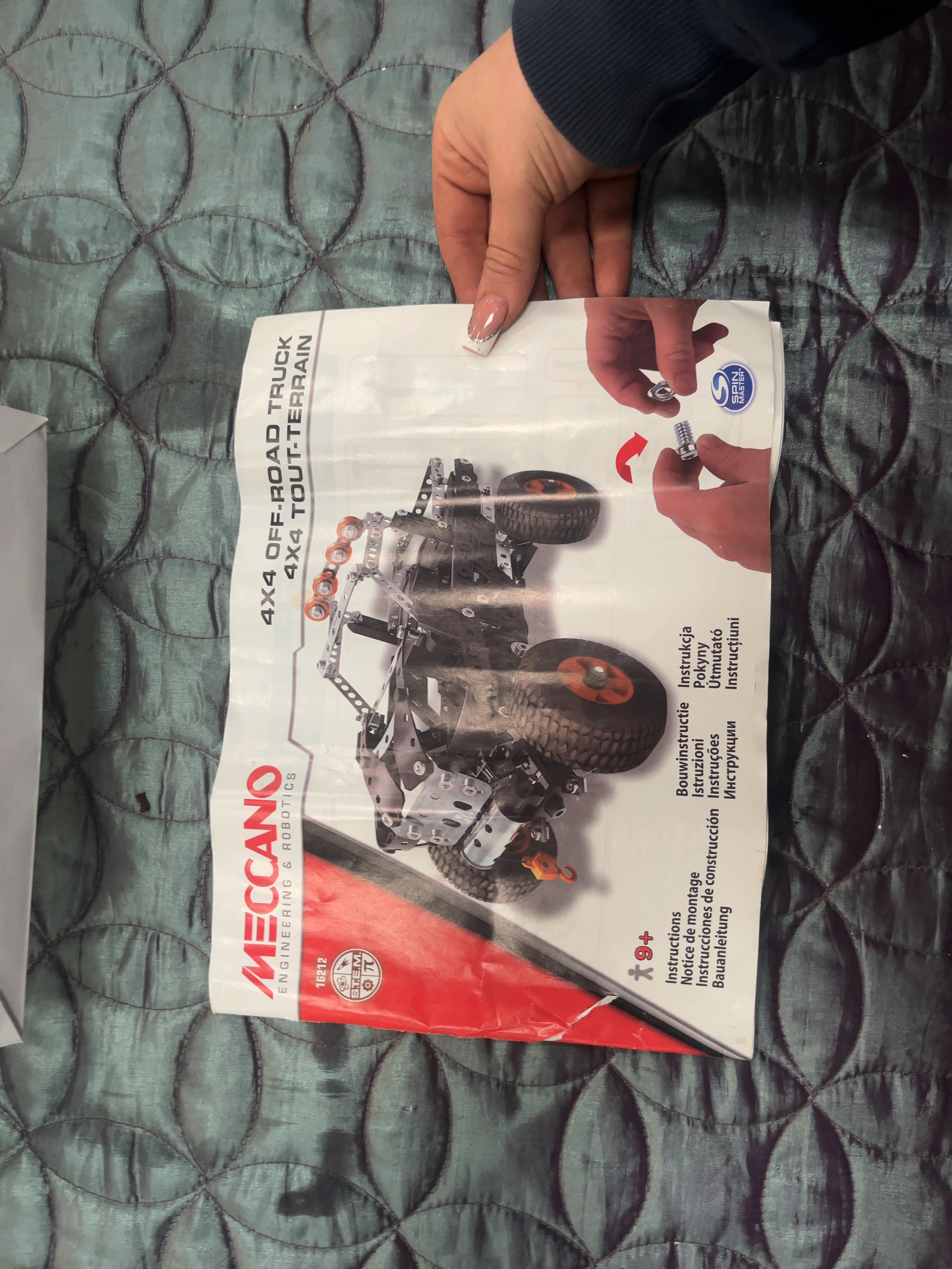 A collection of modern construction toys featuring components from Meccano and LEGO Technic. The Meccano elements include the Maker System 4×4 Off-Road Truck (Set 16212) produced by Spin Master. This set comprises perforated metal strips, plastic connectors, and large rubber-tread tyres with orange rims. Electrical wiring components are visible within original internal plastic packaging. The lot is accompanied by the original instruction manual for model 16212, bearing the Meccano Engineering and Robotics and Spin Master branding. The LEGO Technic components include a partially assembled chassis and bodywork for an orange and black vehicle, together with an assortment of loose plastic beams, pins, gears, and wheels. The items are presented in a clear plastic storage container.
