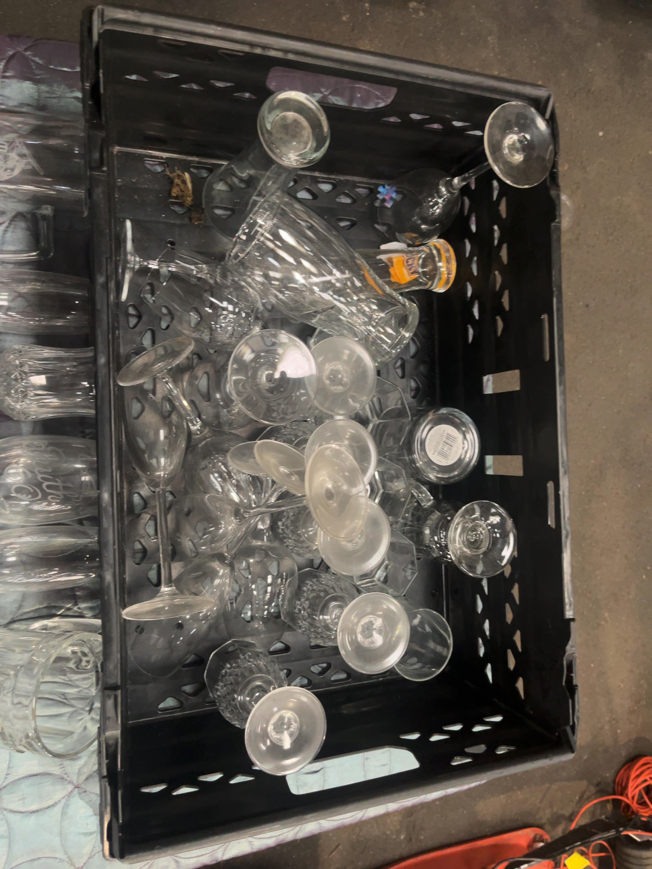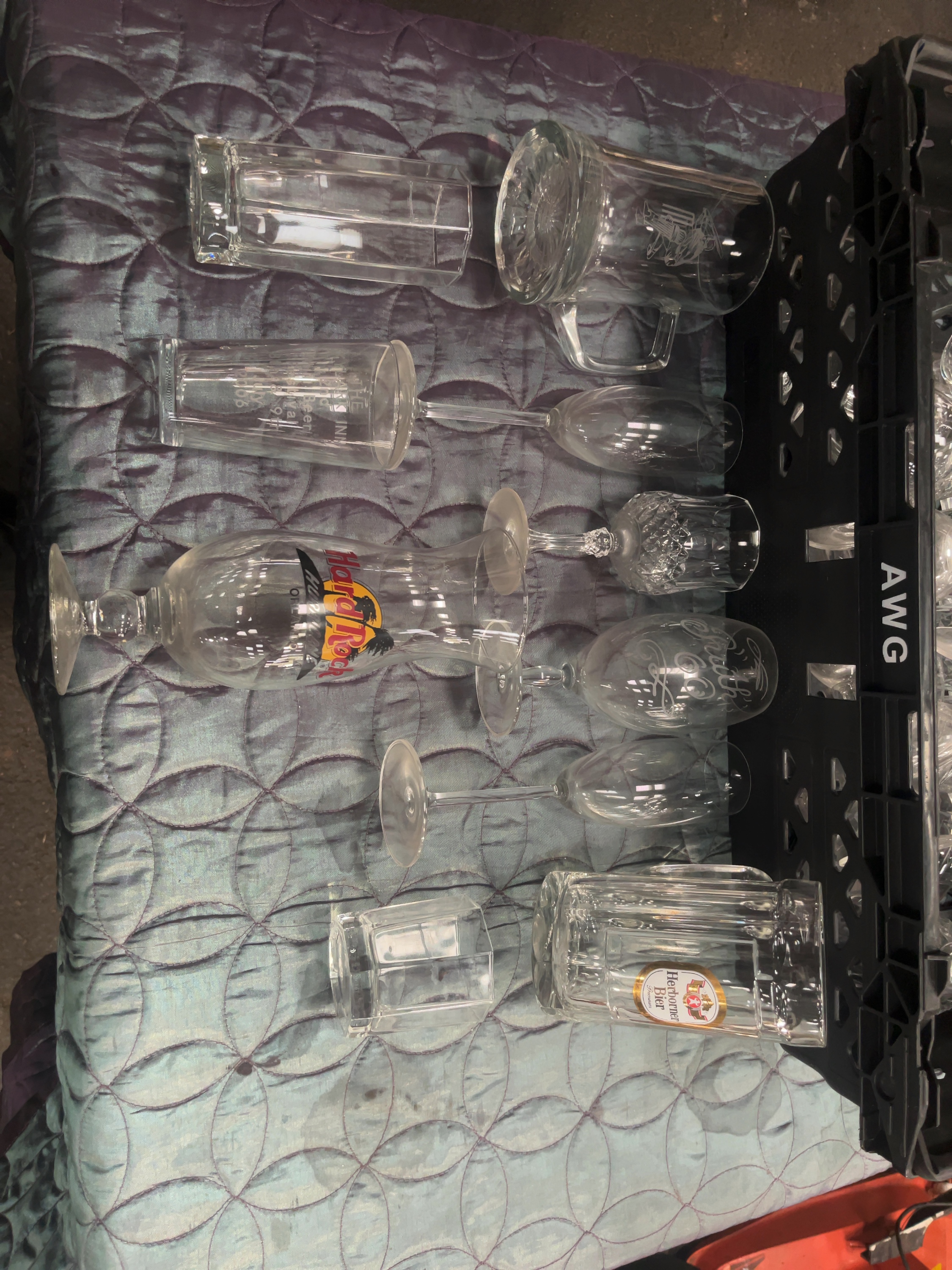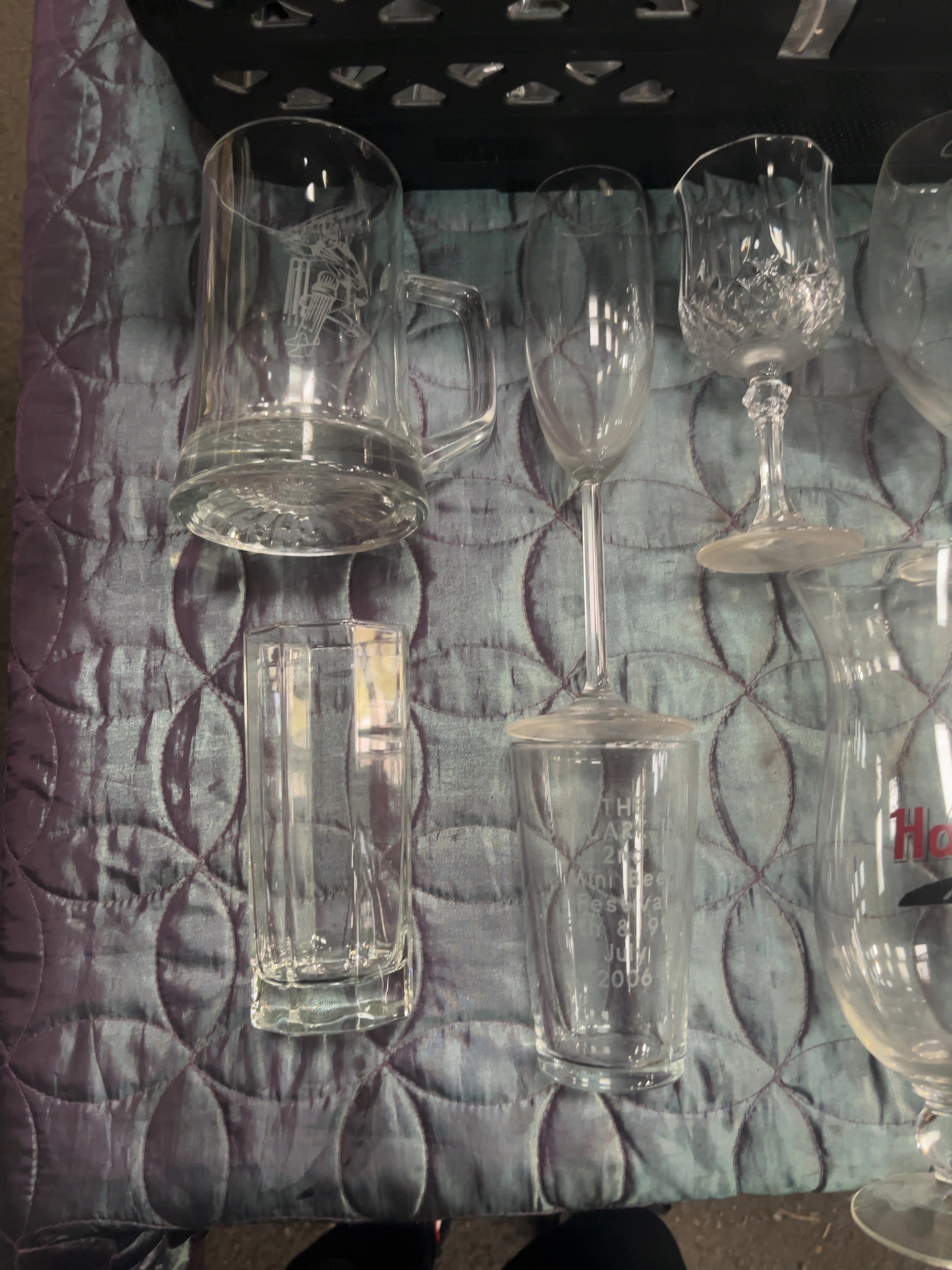 A mixed collection of contemporary glassware, comprising various stems, tumblers, and souvenir items. The lot includes a Hard Rock Cafe hurricane glass with a printed logo and guitar motif, featuring the word HURRICANE printed below; a heavy glass beer tankard with a gold-bordered paper label for Herborner Bier Premium; and a conical beer glass etched for THE ARMS INN 2006 Mini Beer Festival, 7th 8th 9th July 2006. Decorative pieces include a tankard with an etched illustration of a cricket player and a wine glass etched with Happy Birthday. The collection features a single cut glass wine goblet with a diamond-cut pattern to the bowl and a multi-faceted stem, resembling Austrian lead crystal such as the Le Grande Fleur pattern by Oscar De La Renta. Also included are multiple champagne flutes, wine stems, and straight-sided highball glasses. The items are housed in a large black plastic storage crate.