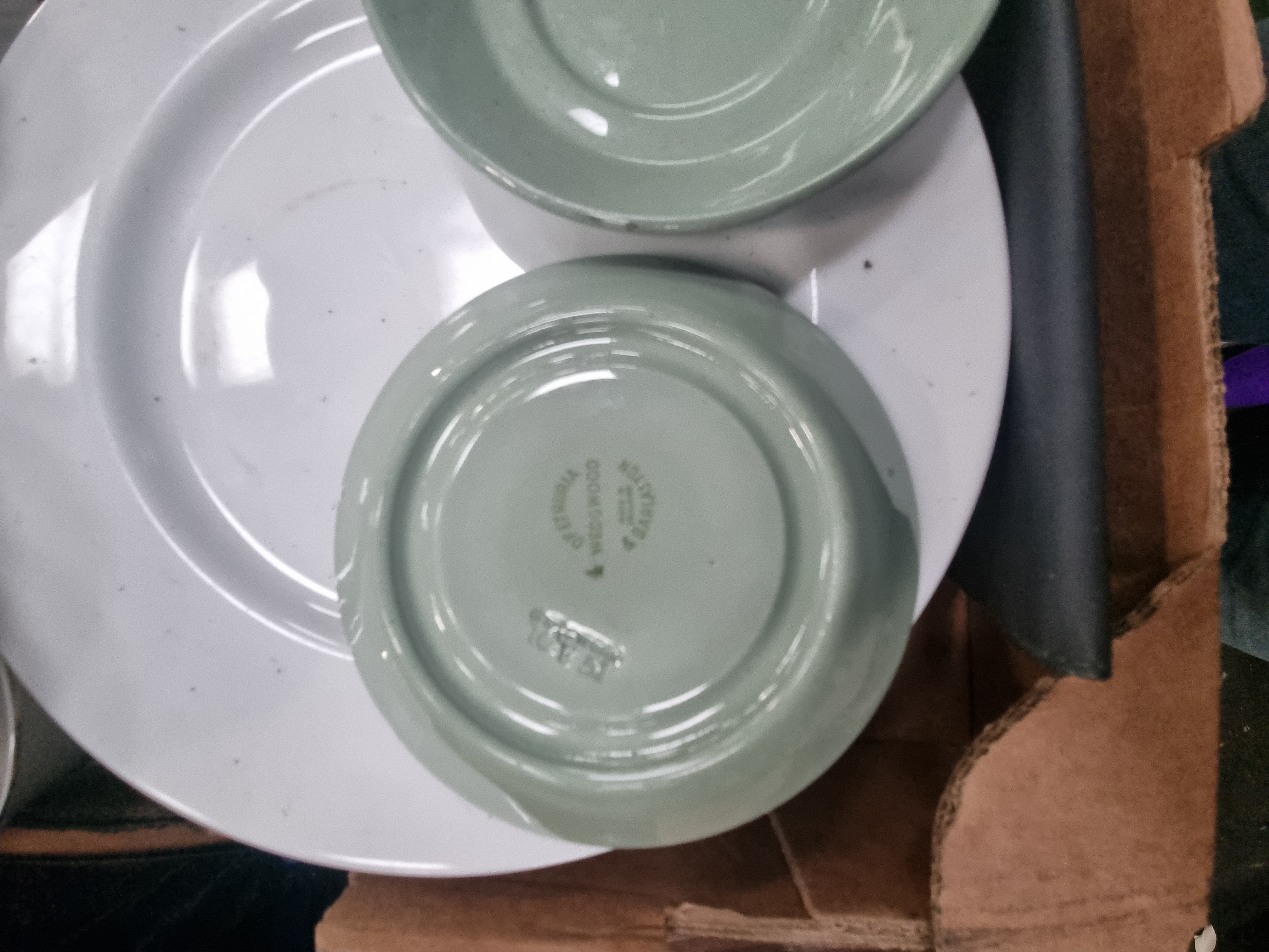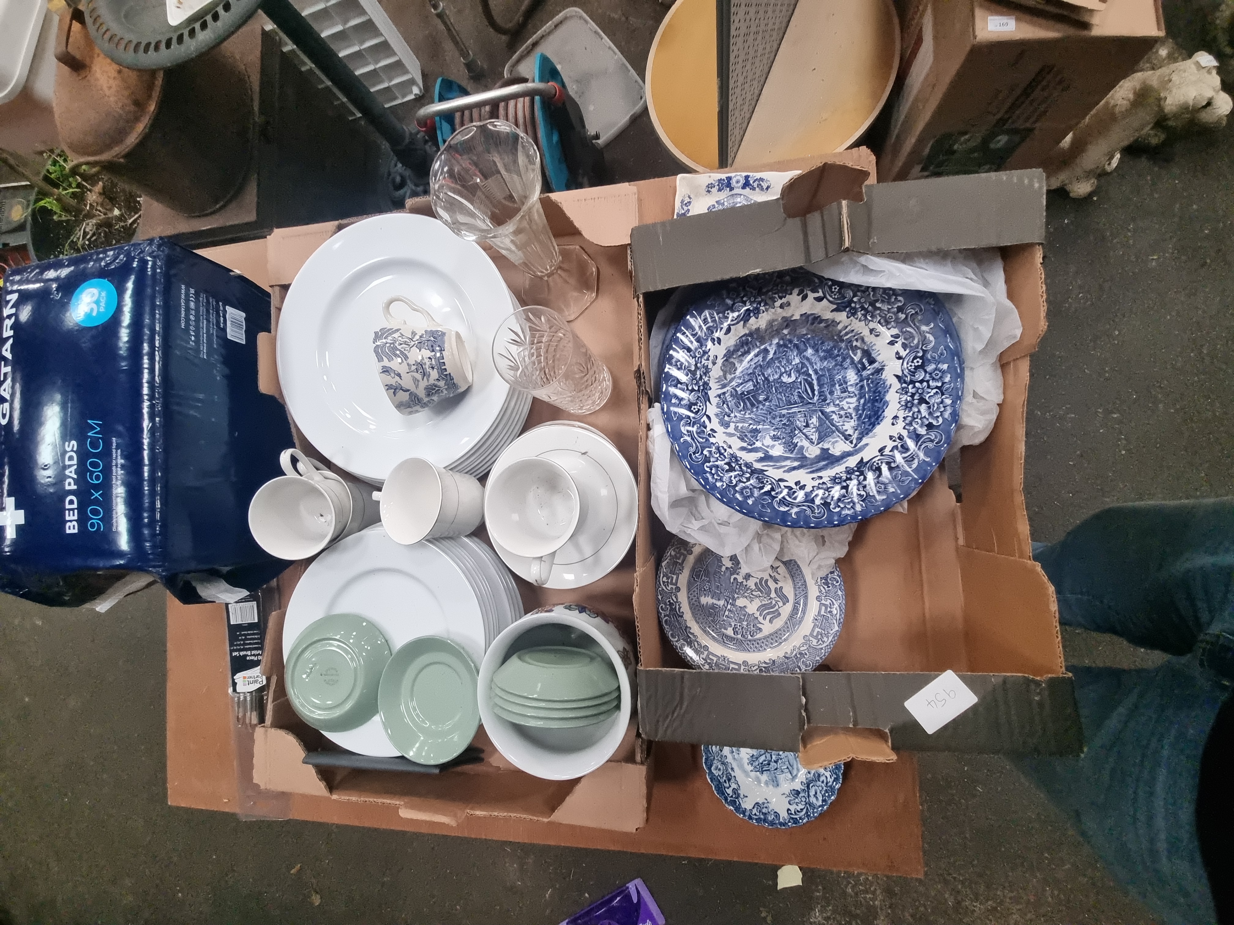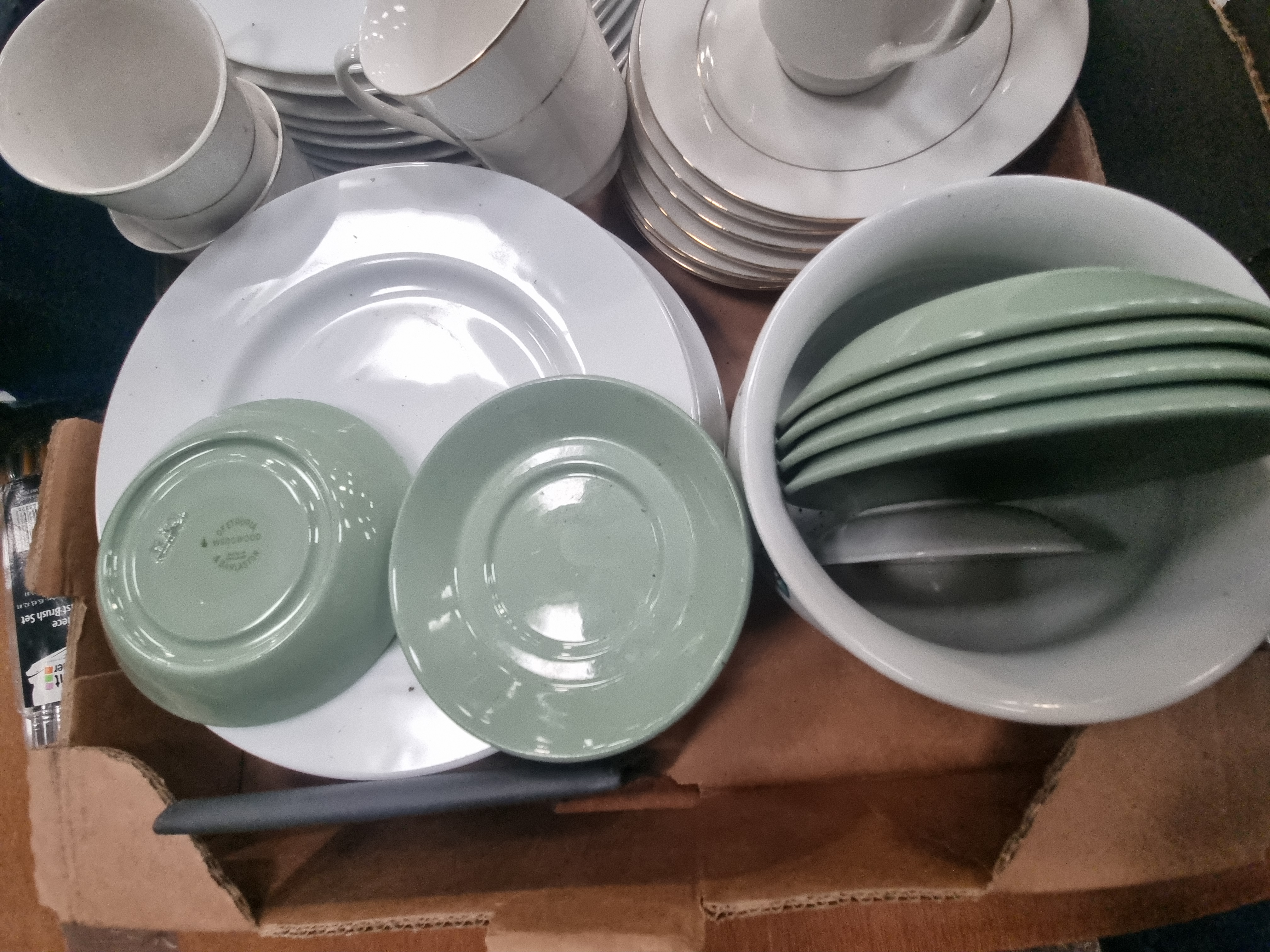 This mixed lot comprises an assortment of ceramics, glassware, and household items. The ceramic selection includes a group of Wedgwood sage green matte-glazed earthenware saucers and small bowls, bearing the circular printed mark OF ETRURIA WEDGWOOD & BARLASTON. The blue and white transferware includes a large circular plate featuring a central landscape with a windmill and figures, a plate in the traditional Willow pattern, a scalloped-rim bowl decorated with a coaching scene, and a tea cup with a landscape pattern. Also included is a quantity of plain white glazed dinnerware, comprising plates, cups, and saucers, some of which feature gilt rims. The glassware consists of a tall clear glass vase with a fluted body and a smaller cut-glass vessel with a diamond-textured pattern. The lot is completed by a new 10-piece artist brush set in original packaging and an unopened 30-pack of Gatarn disposable bed pads.