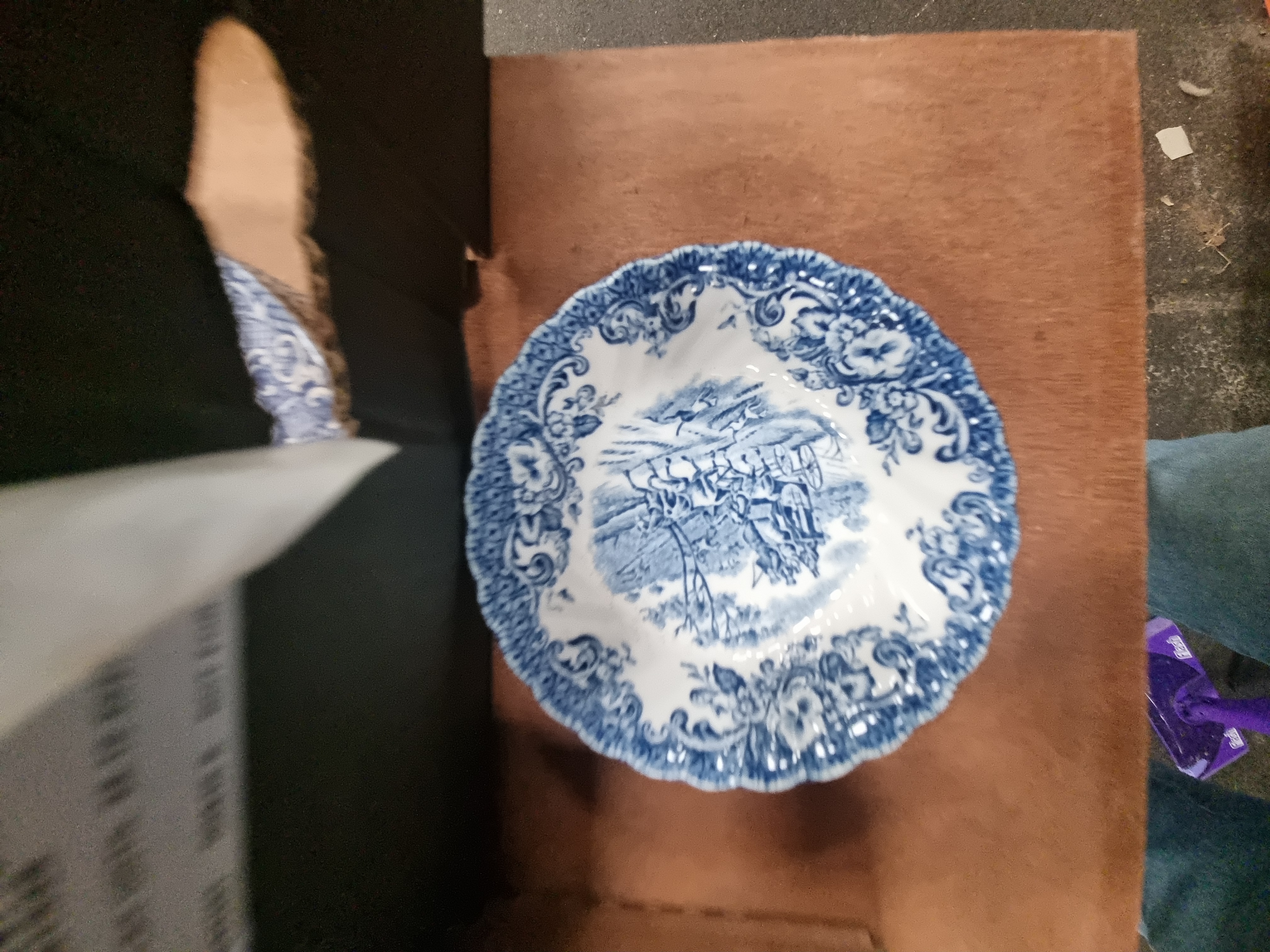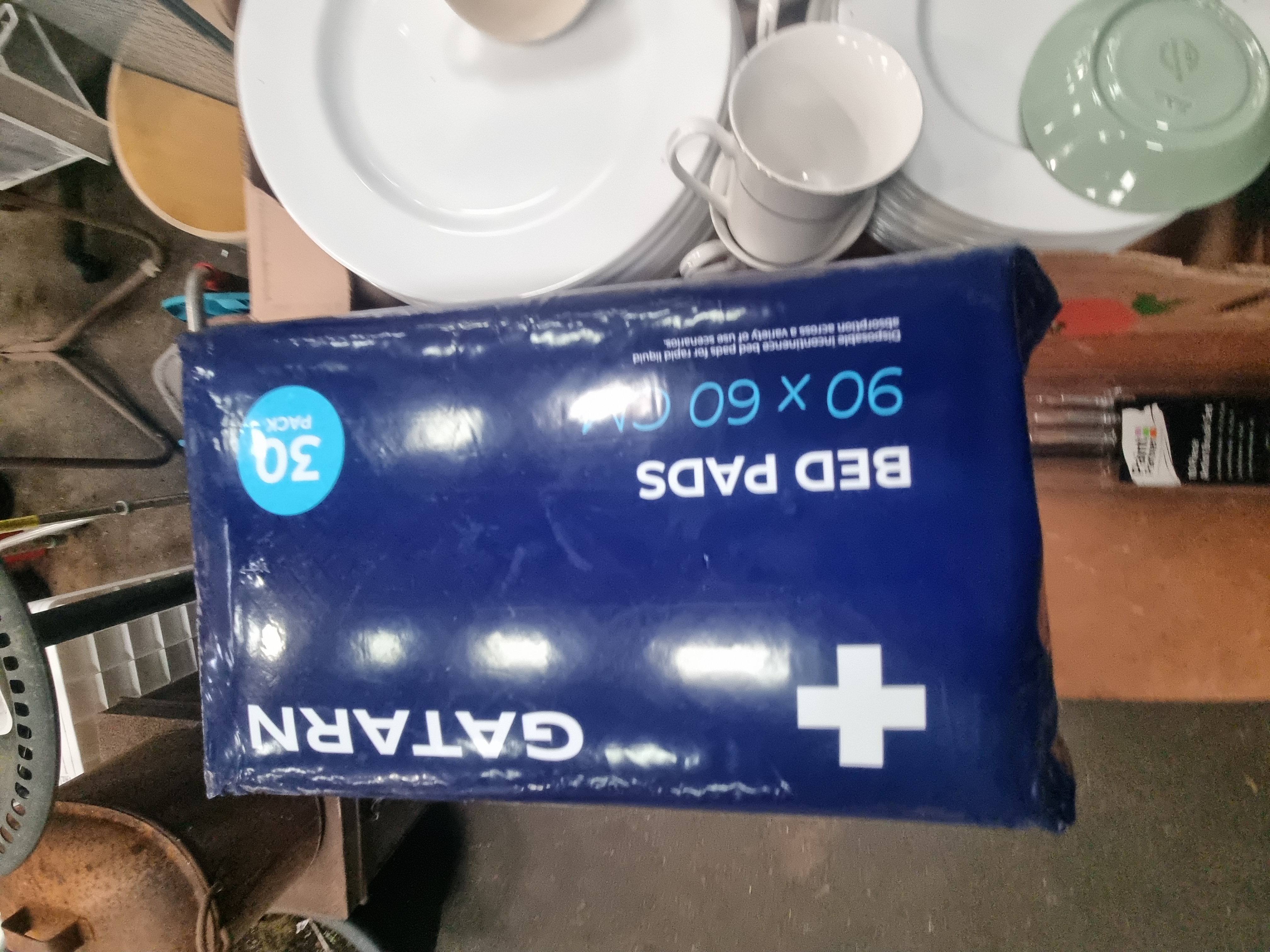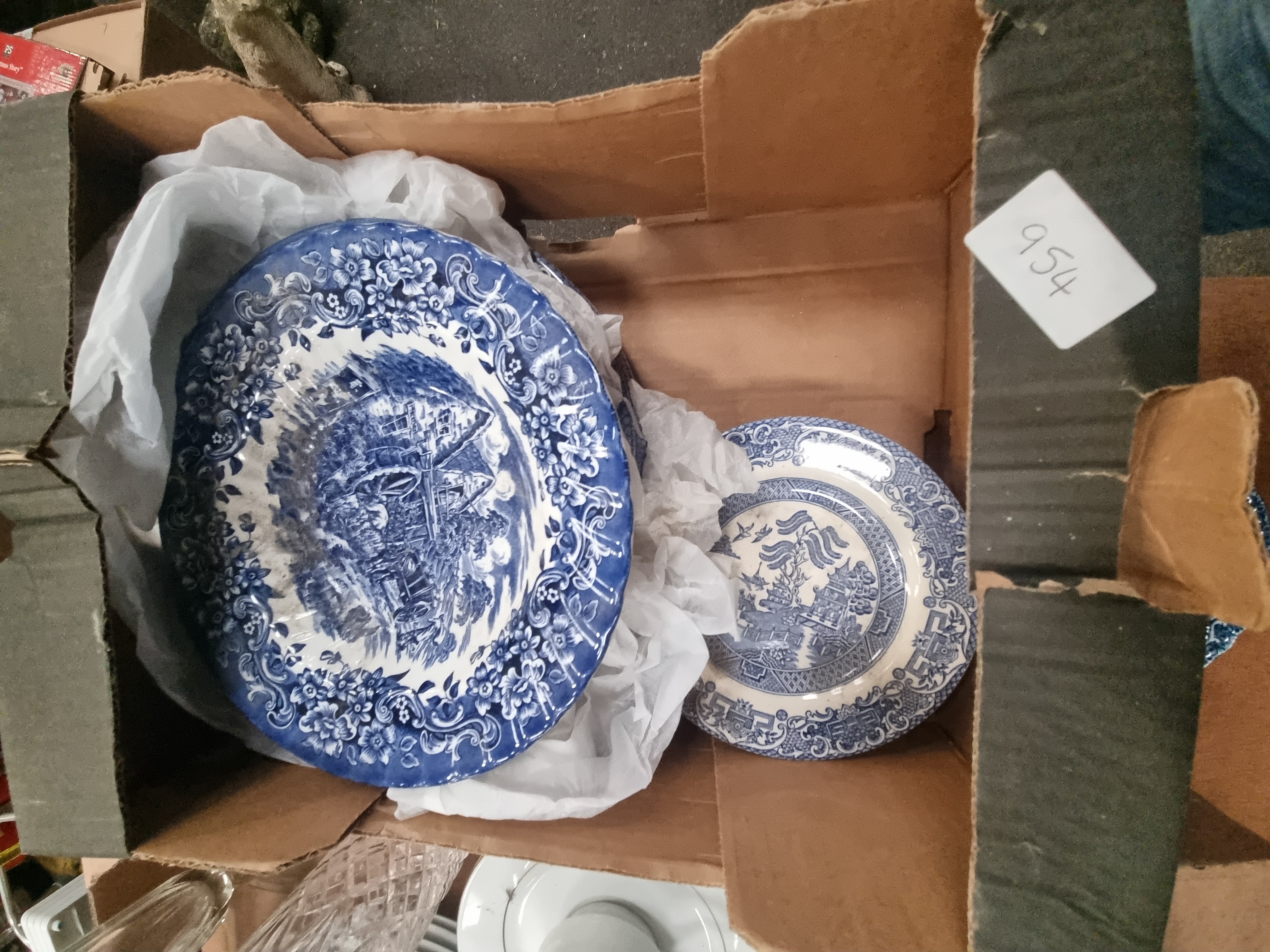 This mixed lot comprises an assortment of ceramics, glassware, and household items. The ceramic selection includes a group of Wedgwood sage green matte-glazed earthenware saucers and small bowls, bearing the circular printed mark OF ETRURIA WEDGWOOD & BARLASTON. The blue and white transferware includes a large circular plate featuring a central landscape with a windmill and figures, a plate in the traditional Willow pattern, a scalloped-rim bowl decorated with a coaching scene, and a tea cup with a landscape pattern. Also included is a quantity of plain white glazed dinnerware, comprising plates, cups, and saucers, some of which feature gilt rims. The glassware consists of a tall clear glass vase with a fluted body and a smaller cut-glass vessel with a diamond-textured pattern. The lot is completed by a new 10-piece artist brush set in original packaging and an unopened 30-pack of Gatarn disposable bed pads.
