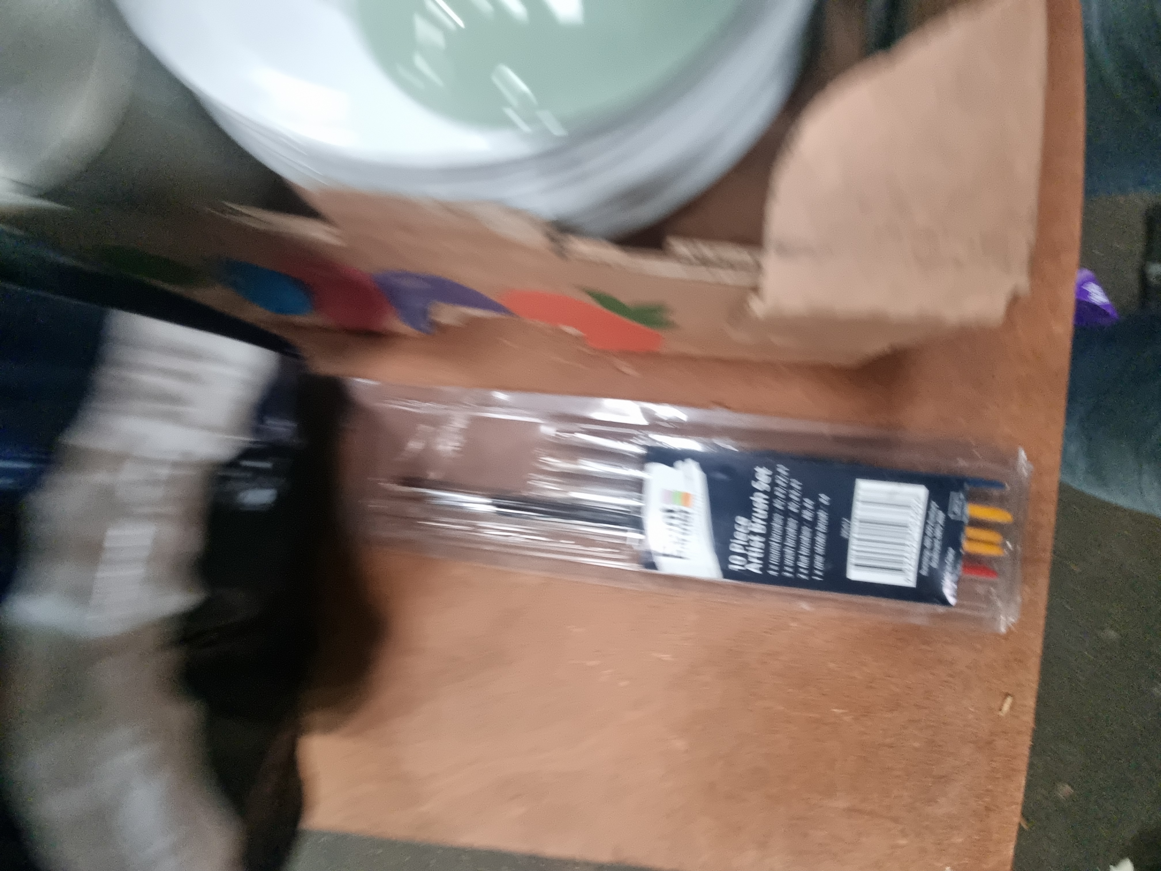 The ceramic and glass items are in used condition with visible surface marks and accumulated dust. Potential bidders should account for possible minor chips or hairline cracks consistent with age and use. The artist brushes and bed pads are in original, unopened packaging.