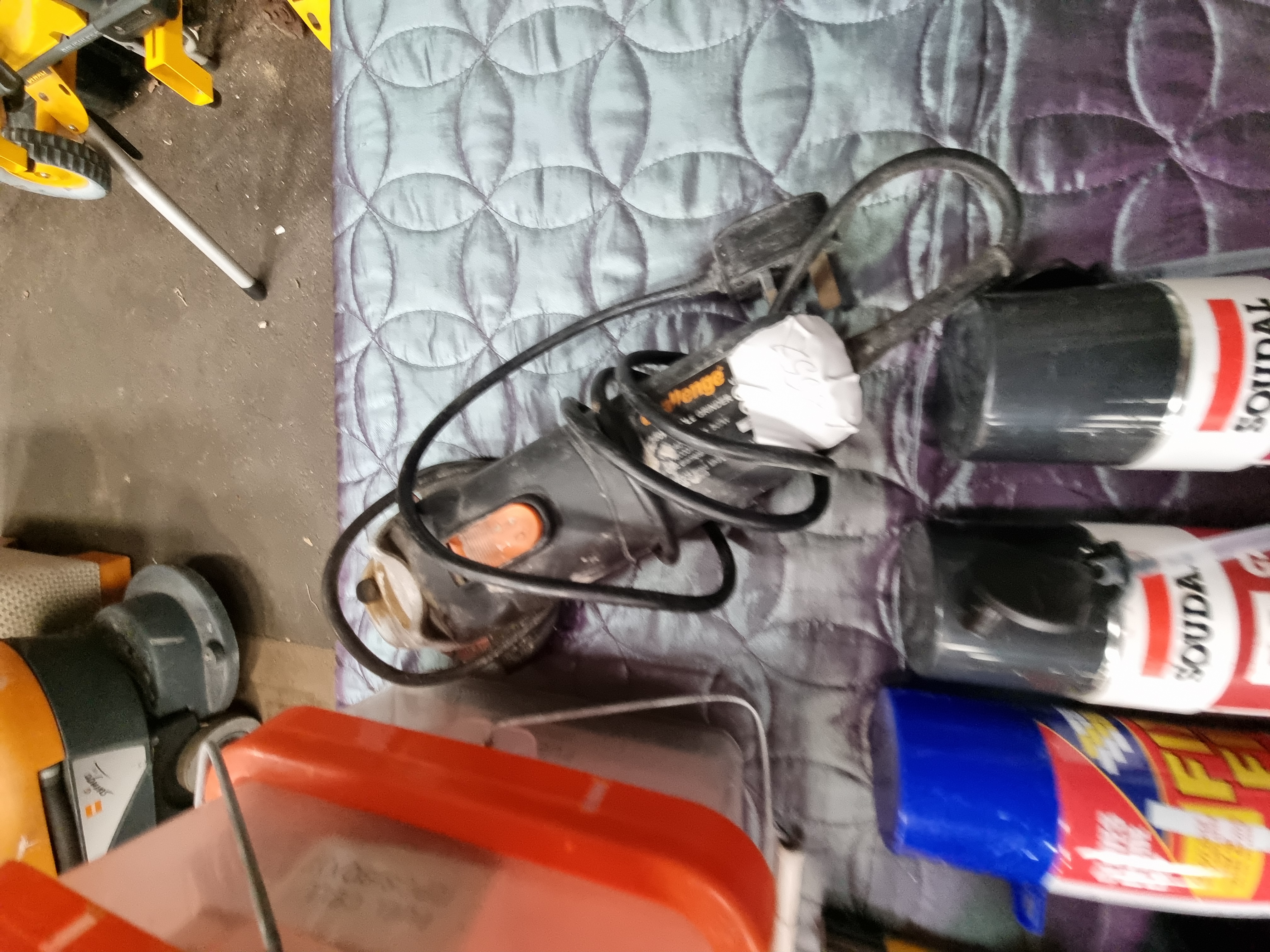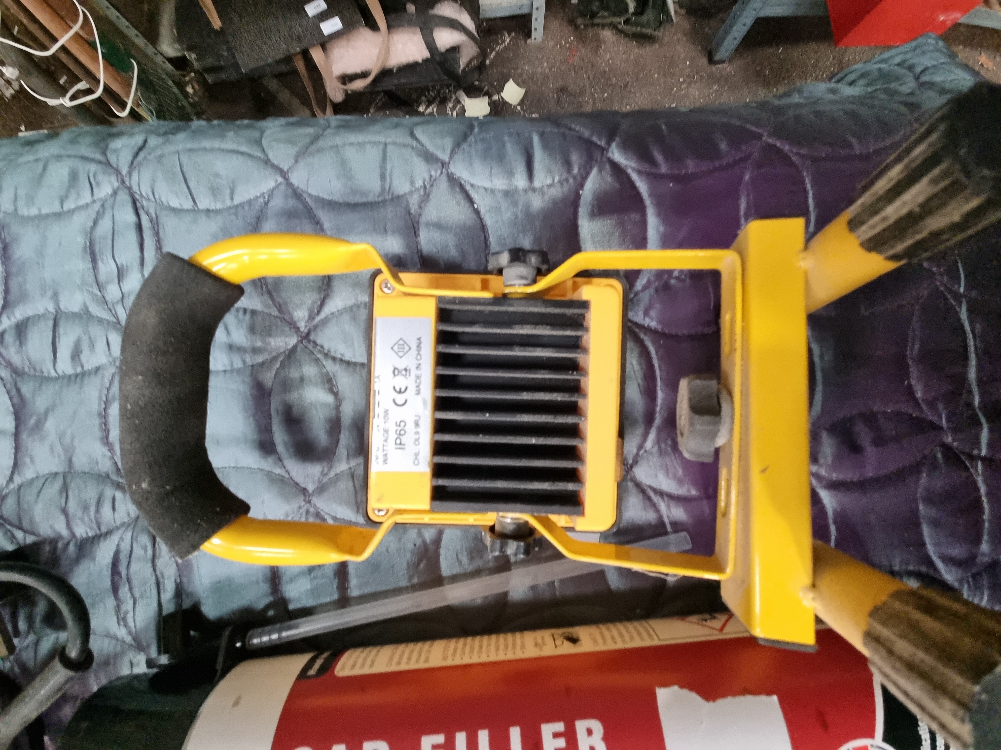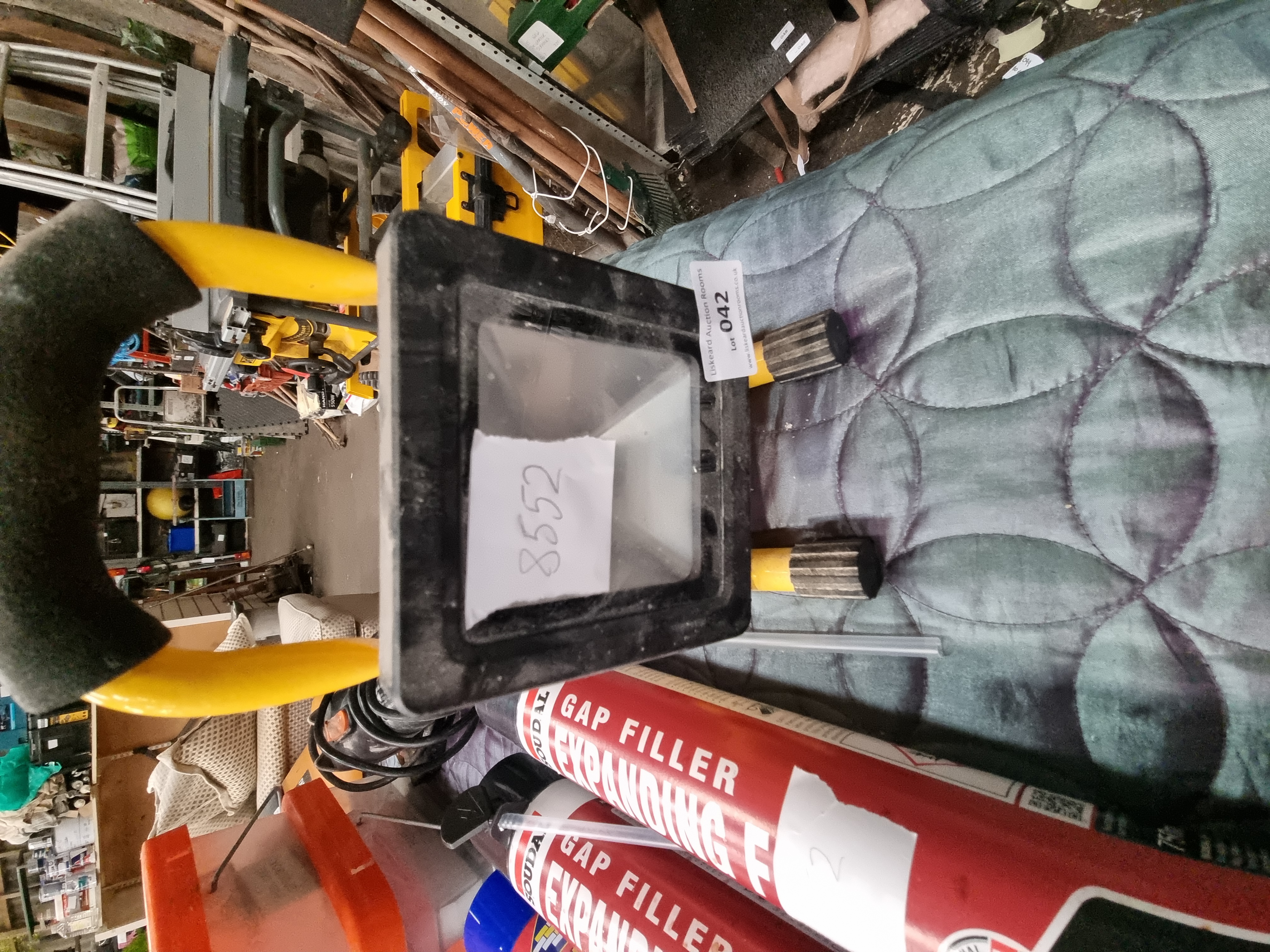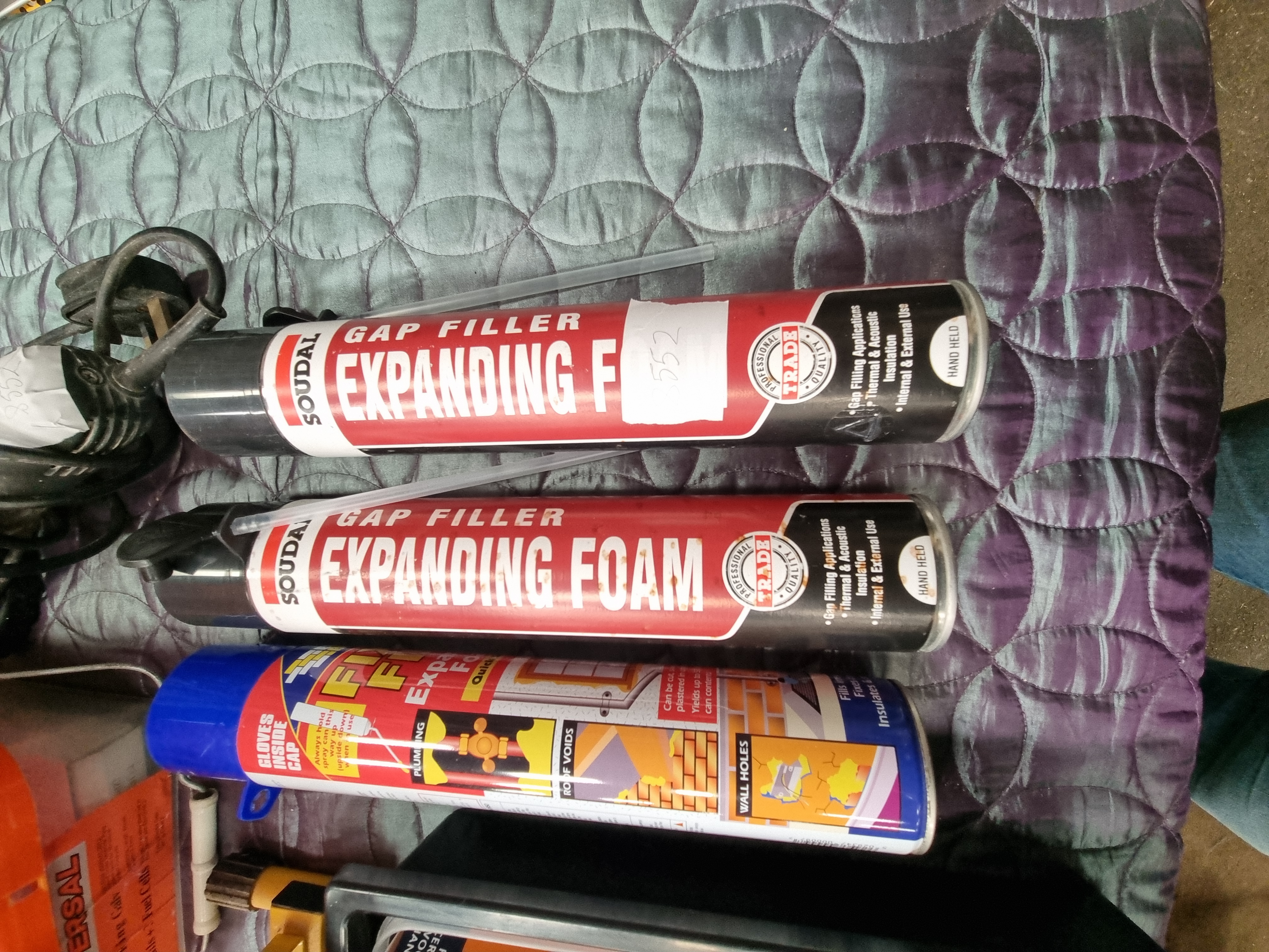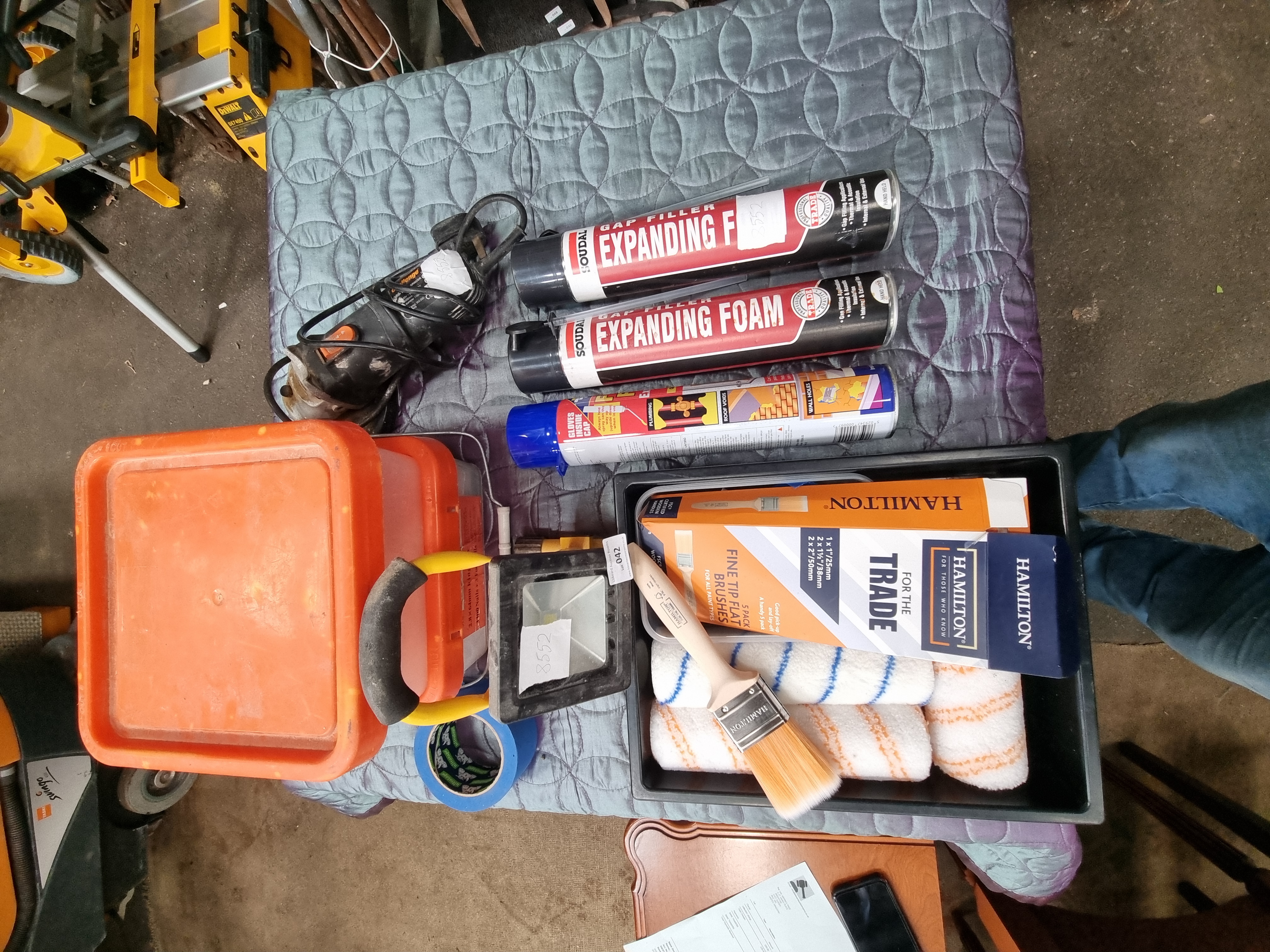 The items are in mixed condition. The Soudal expanding foam canisters and Hamilton painting supplies appear to be in new, unused condition, with some items remaining in their original retail packaging. The Challenge angle grinder and the LED work light are in used condition, showing visible dust and signs of previous use. The Universal nail and fuel cell tub has been opened. All mechanical and electrical items are sold as seen.