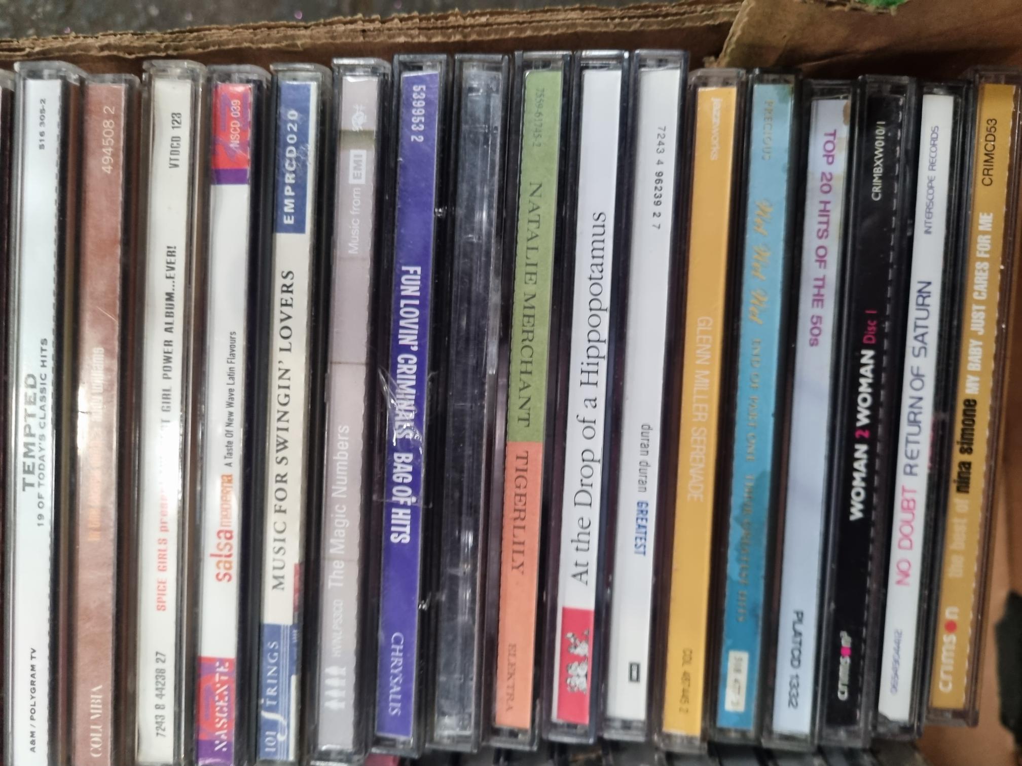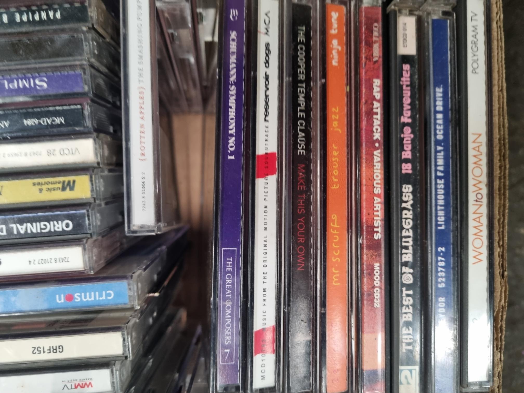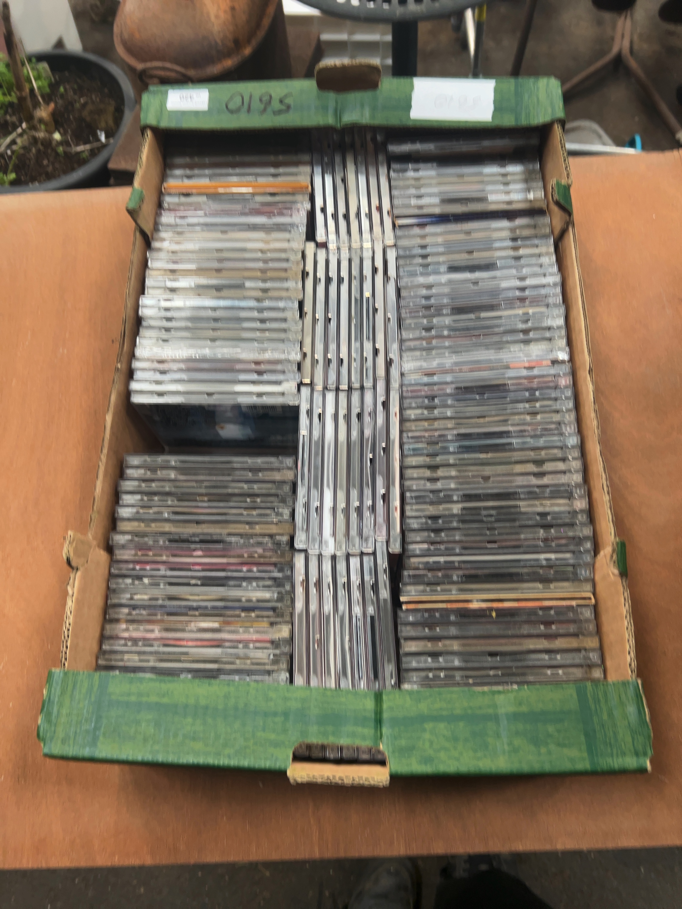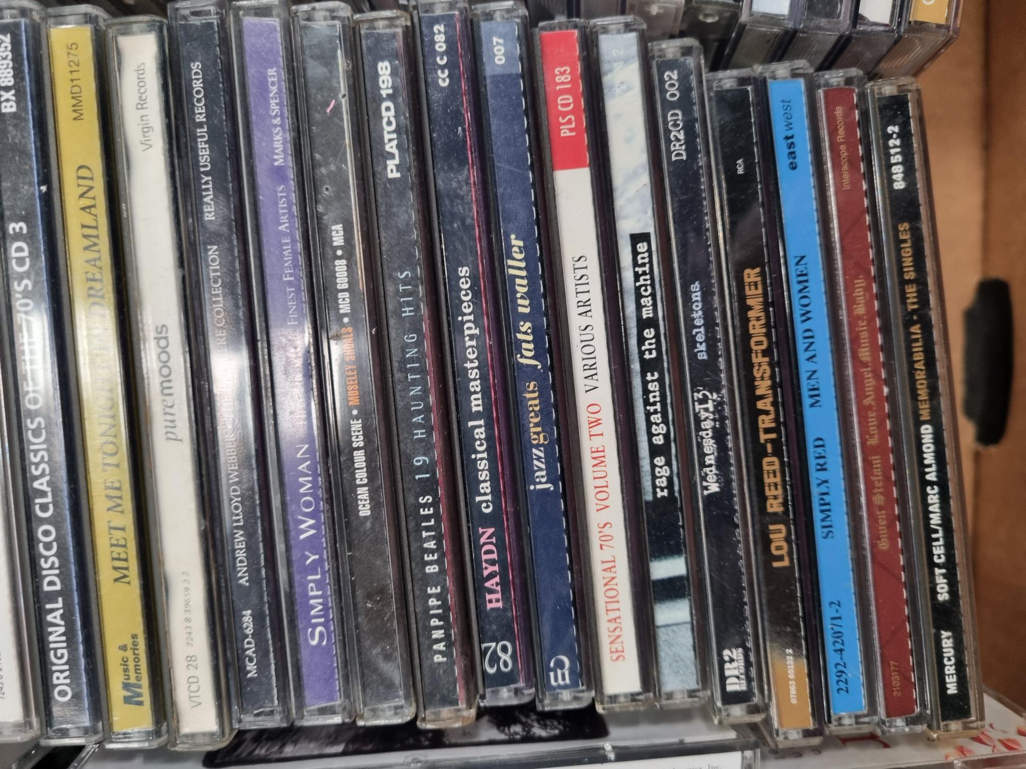 The jewel cases show typical signs of age and handling, including surface scuffing and occasional minor cracks. Some cases bear retail price stickers or handwritten notations. Disc condition and completeness have not been individually verified.