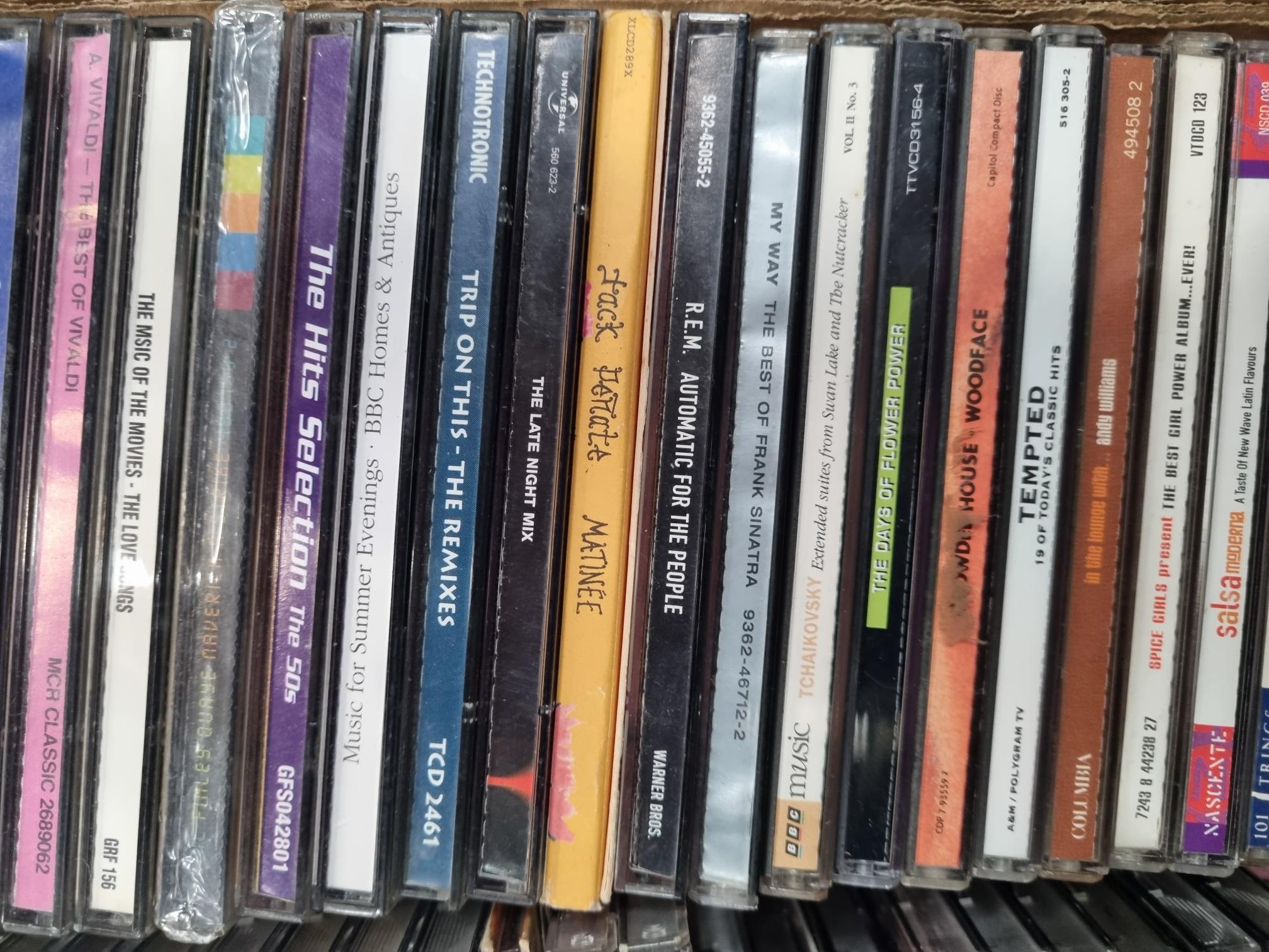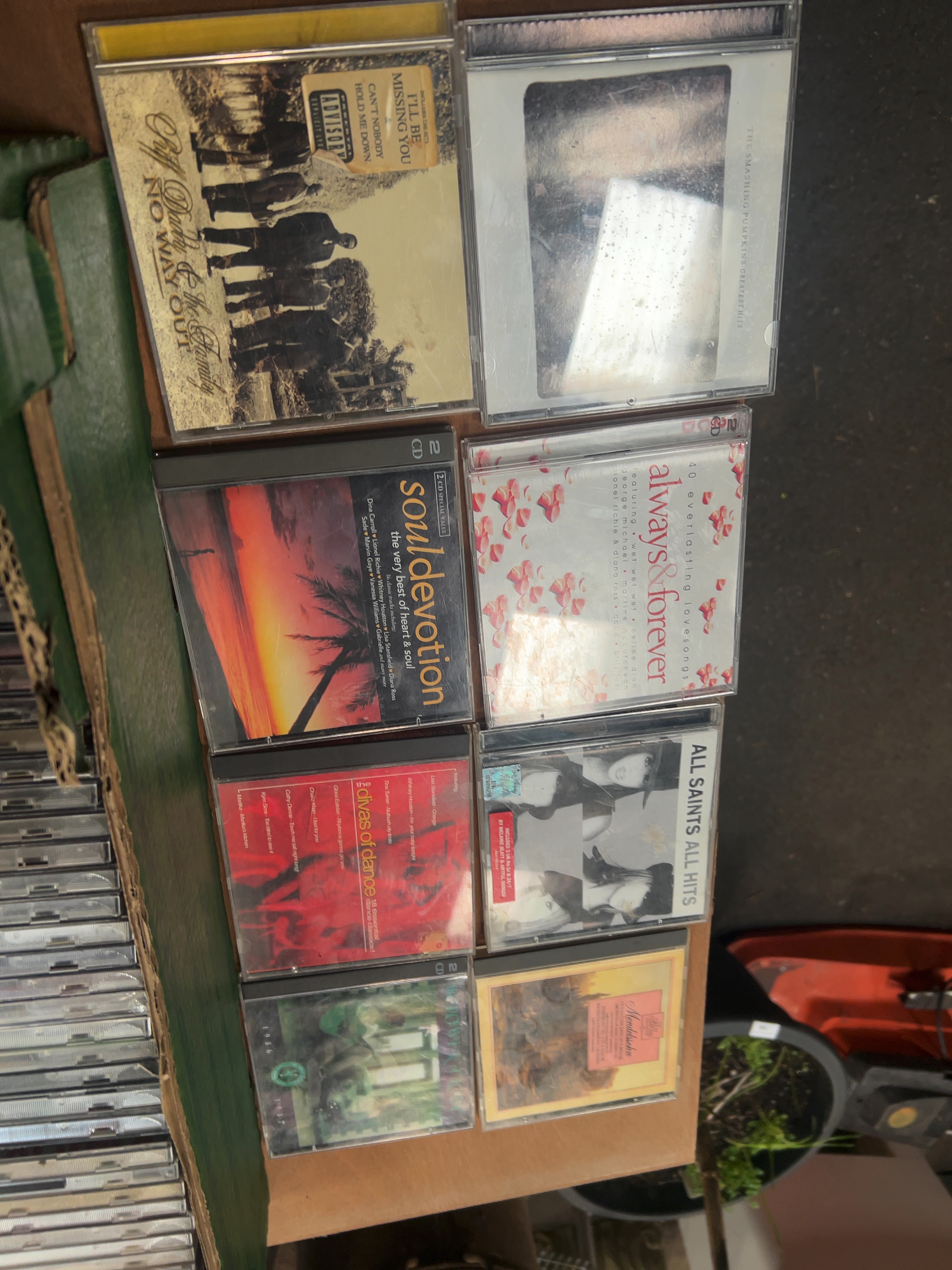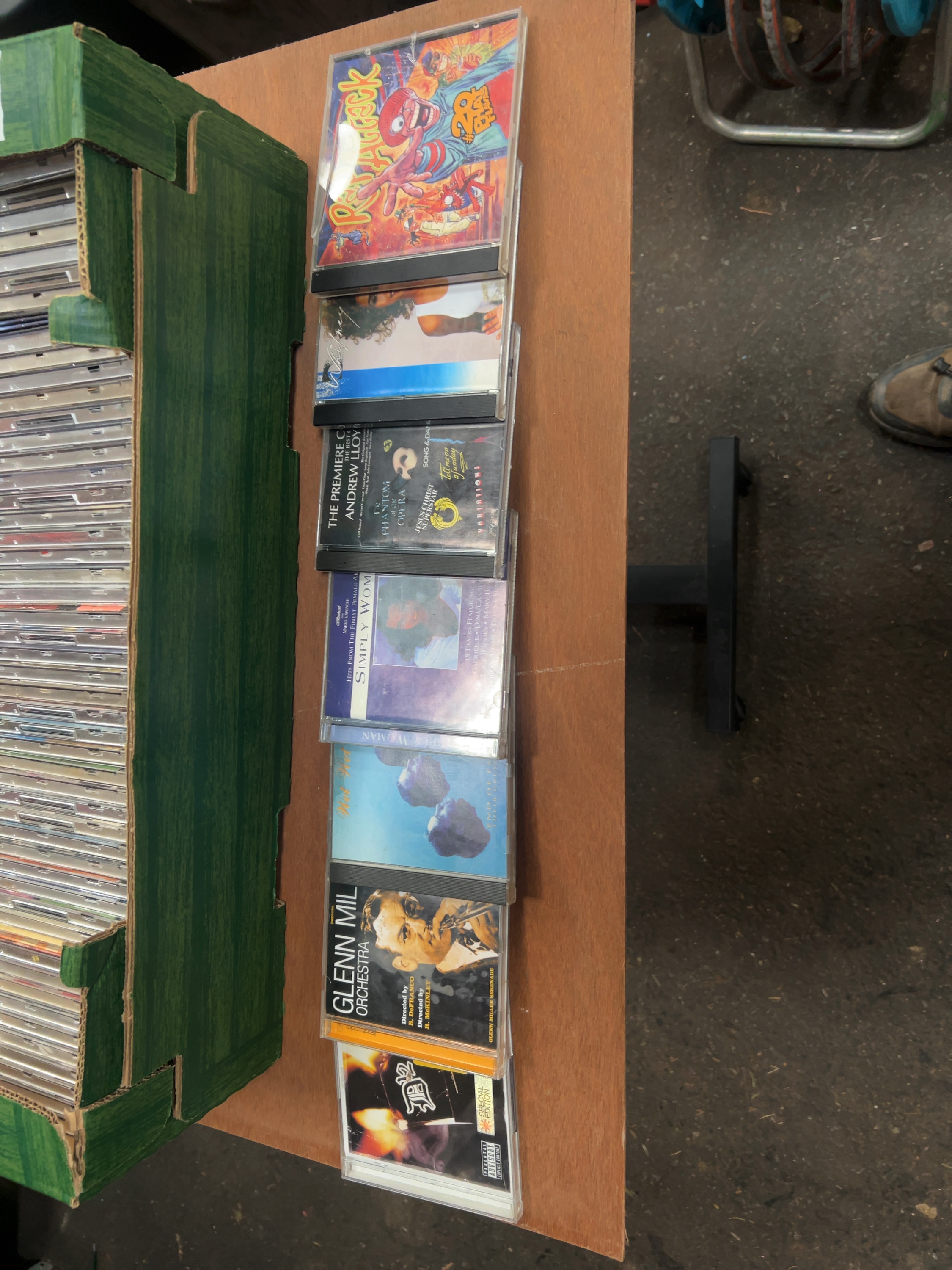 The jewel cases show typical signs of age and handling, including surface scuffing and occasional minor cracks. Some cases bear retail price stickers or handwritten notations. Disc condition and completeness have not been individually verified.