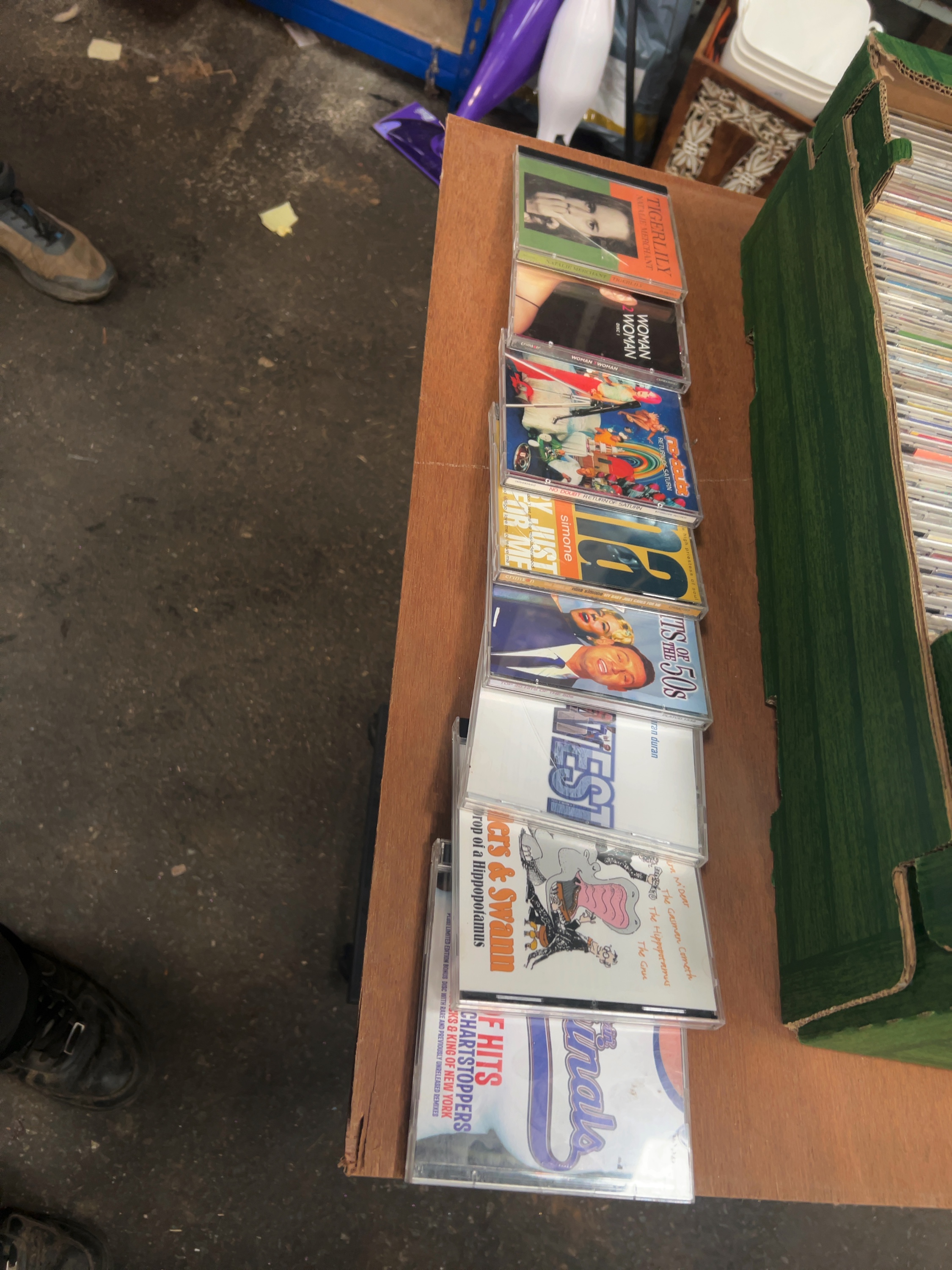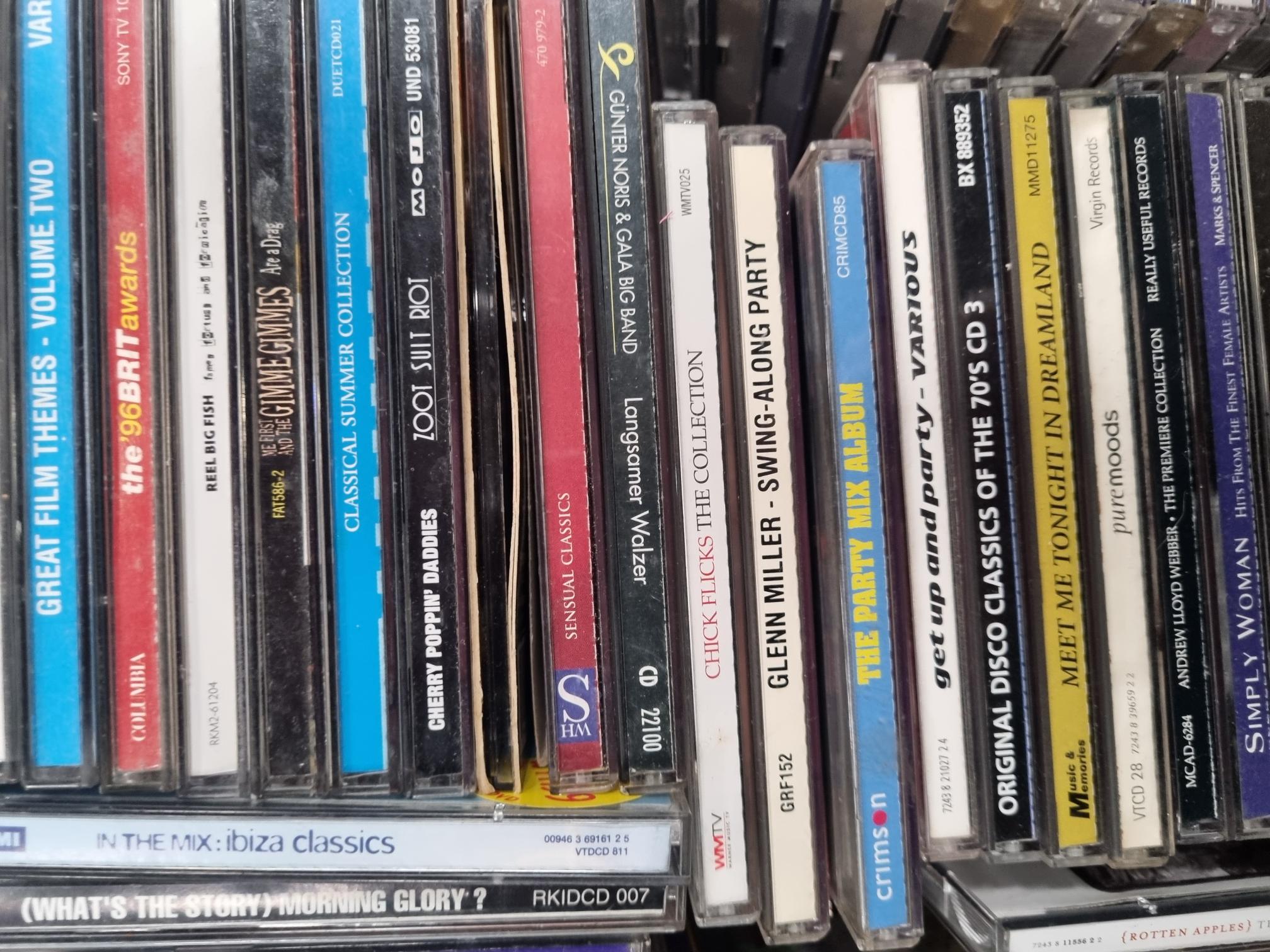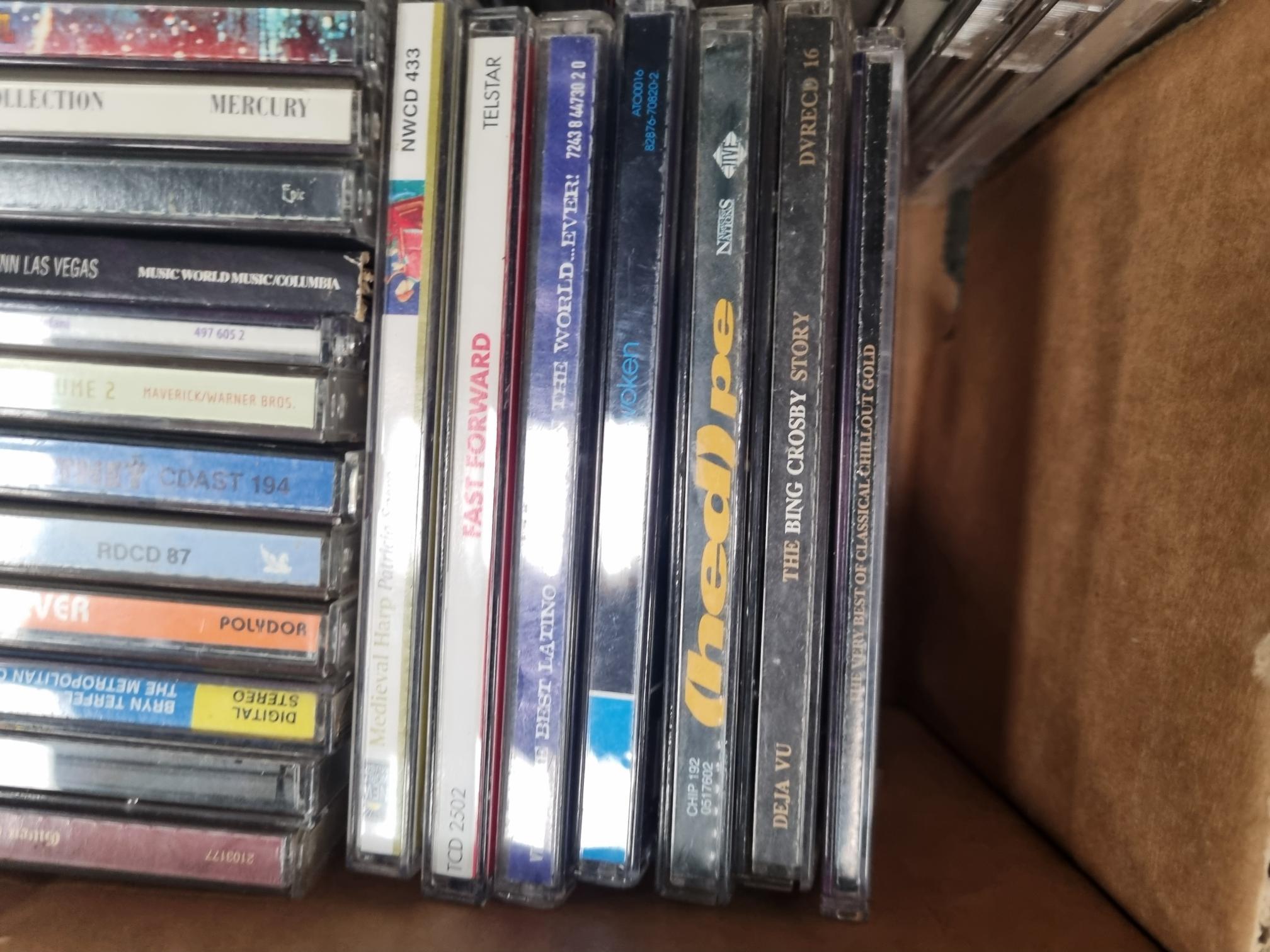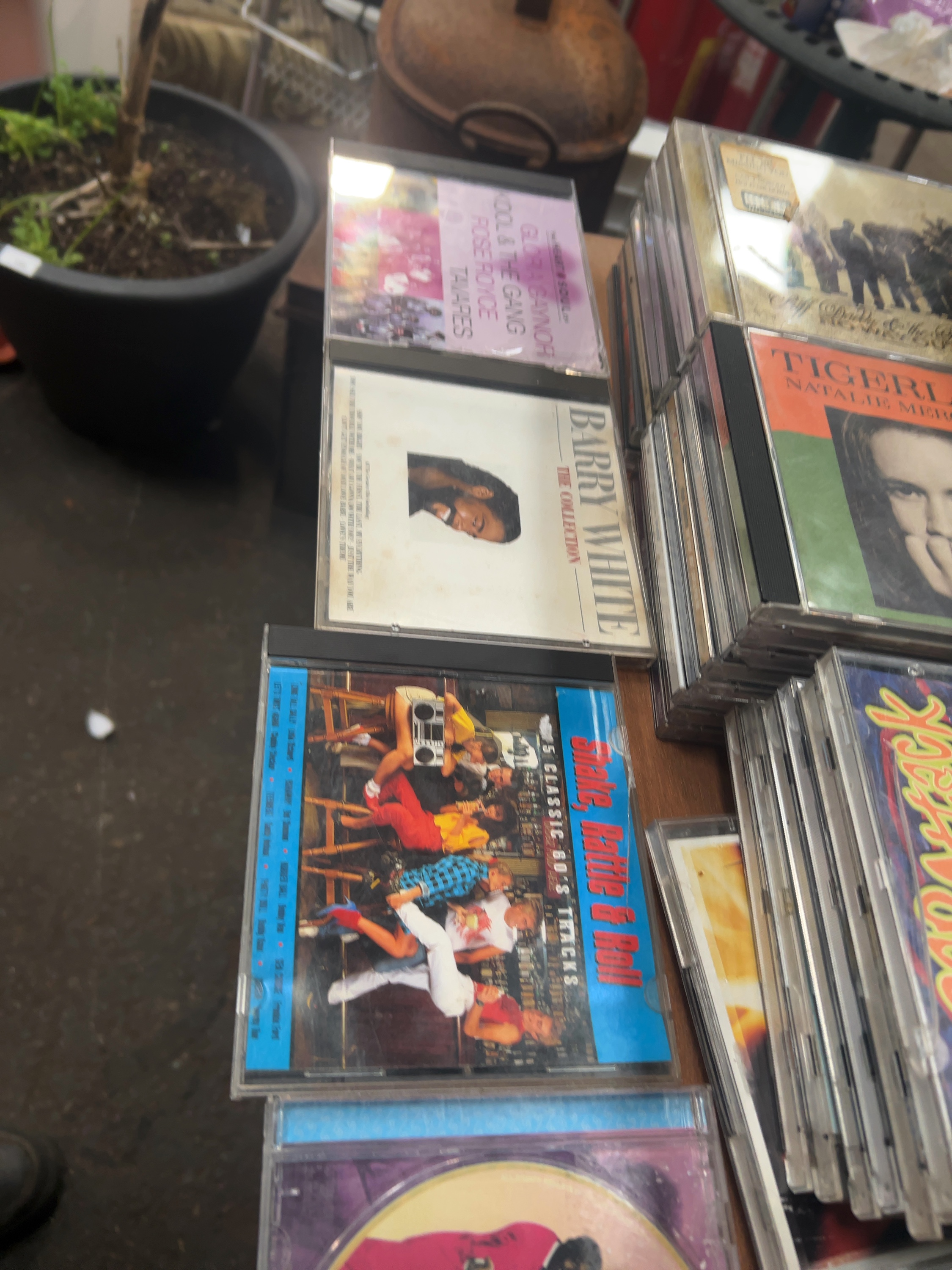 The jewel cases show typical signs of age and handling, including surface scuffing and occasional minor cracks. Some cases bear retail price stickers or handwritten notations. Disc condition and completeness have not been individually verified.