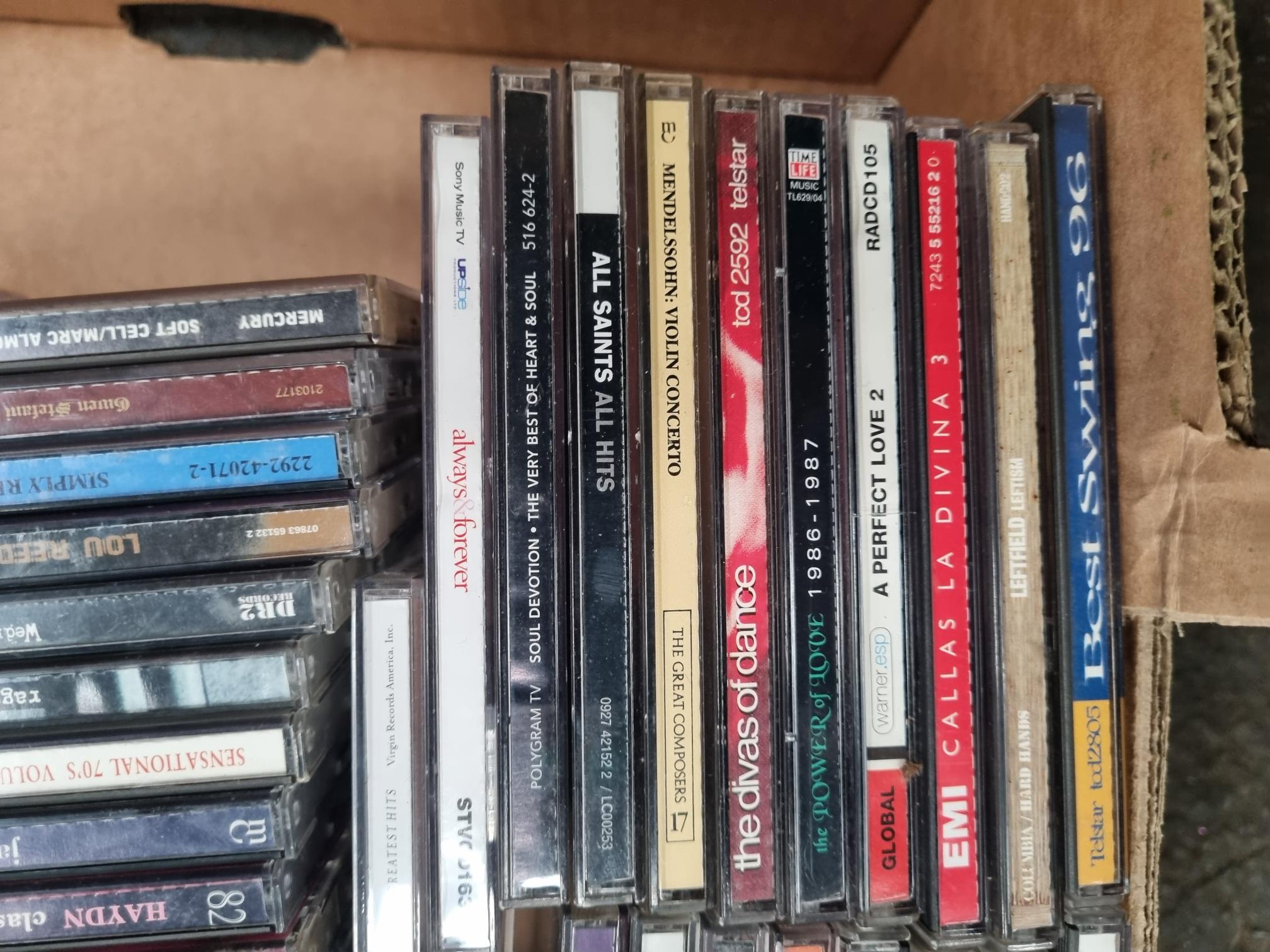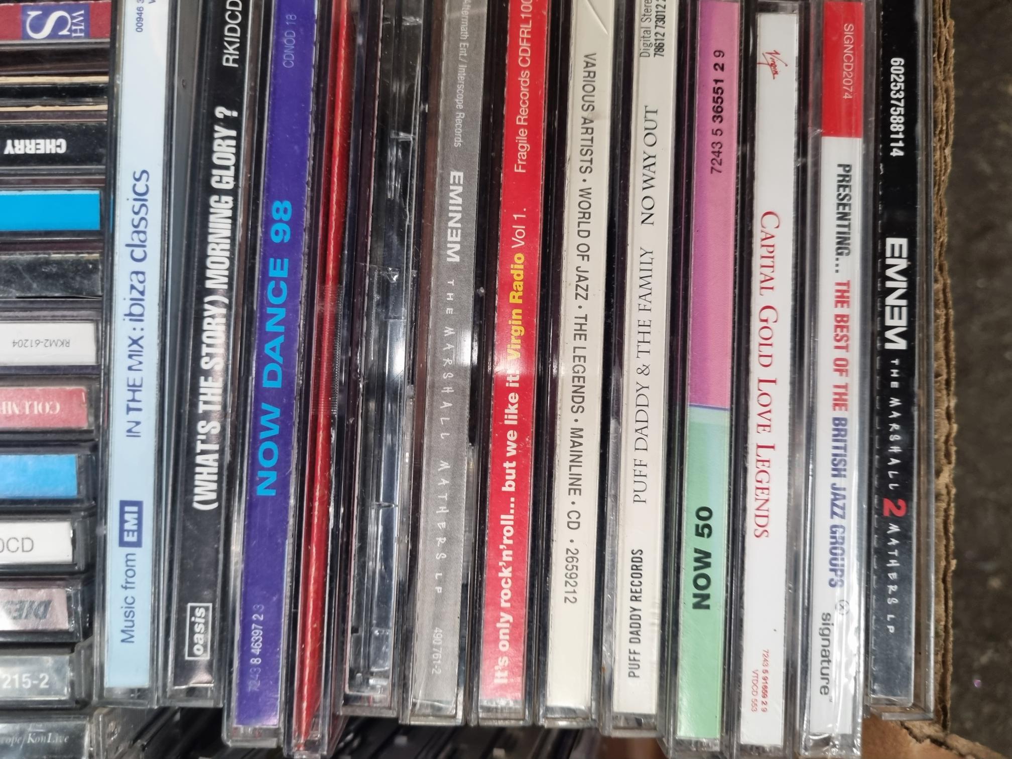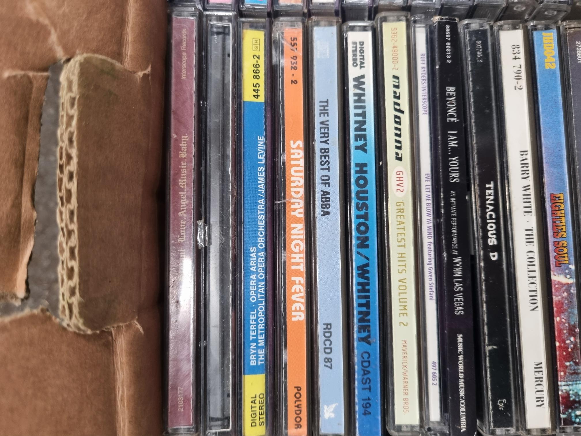 A large collection of compact discs (CDs) encompassing various genres including pop, rock, jazz, classical, and soundtracks. The collection is primarily housed in standard plastic jewel cases and stored within a green cardboard tray. Visible artists and titles include Oasis (What’s The Story) Morning Glory?, Eminem The Marshall Mathers LP, Lady Gaga The Fame Monster and Born This Way, ABBA The Very Best of ABBA, Metallica Load, R.E.M. Automatic for the People, Soungarden Superunknown, Rage Against the Machine, Whitney Houston Greatest Hits Volume 2 and many more. The assortment also includes numerous compilation albums such as Now That’s What I Call Music! volumes 50 and 98, various classical recordings from labels such as EMI and Deutsche Grammophon, and original cast recordings including Saturday Night Fever and Andrew Lloyd Webber collections. Labels present include Virgin, Columbia, Mercury, and Telstar. The collection features a mix of studio albums, greatest hits, and multi-artist compilations from the late 20th and early 21st centuries.