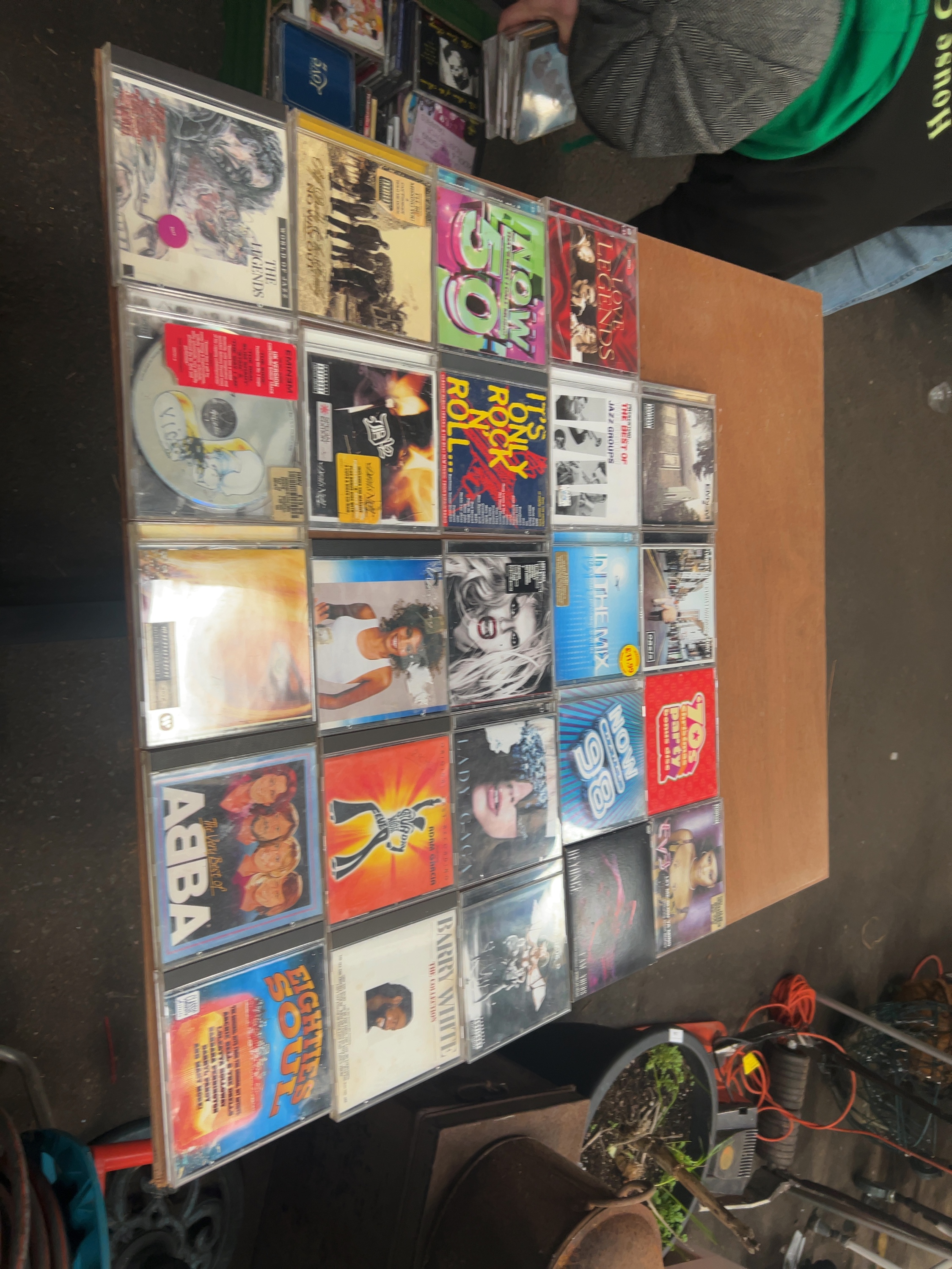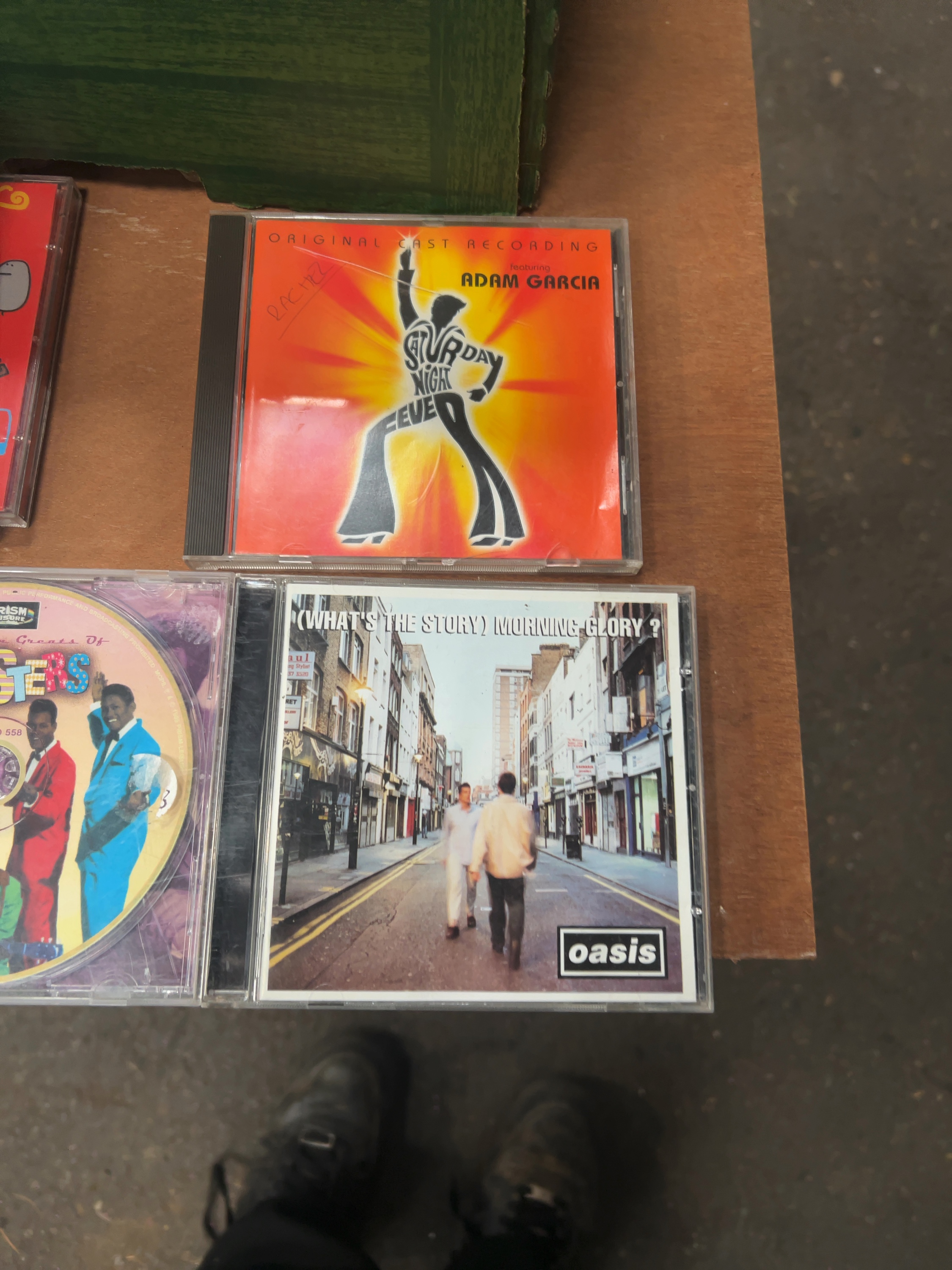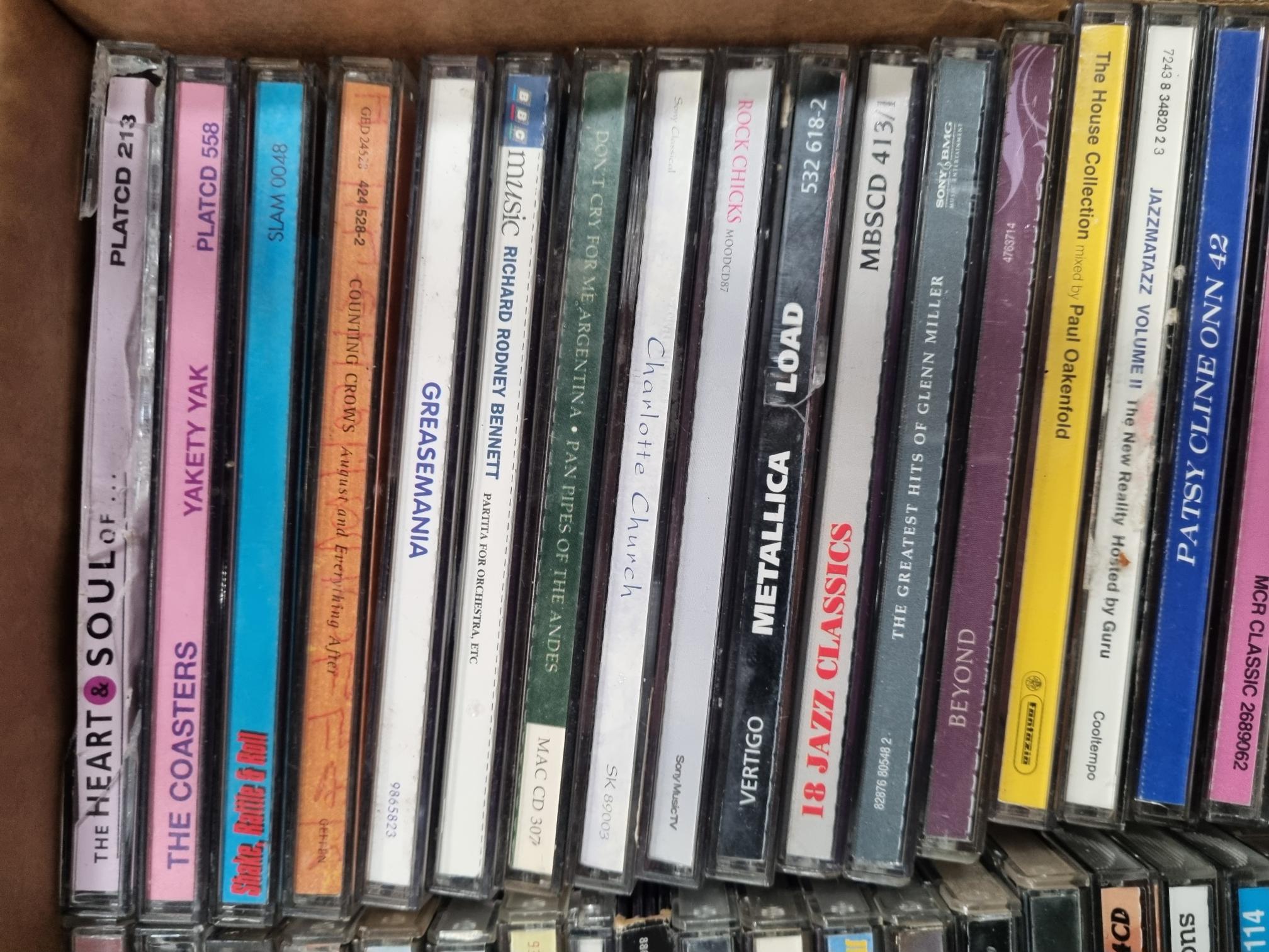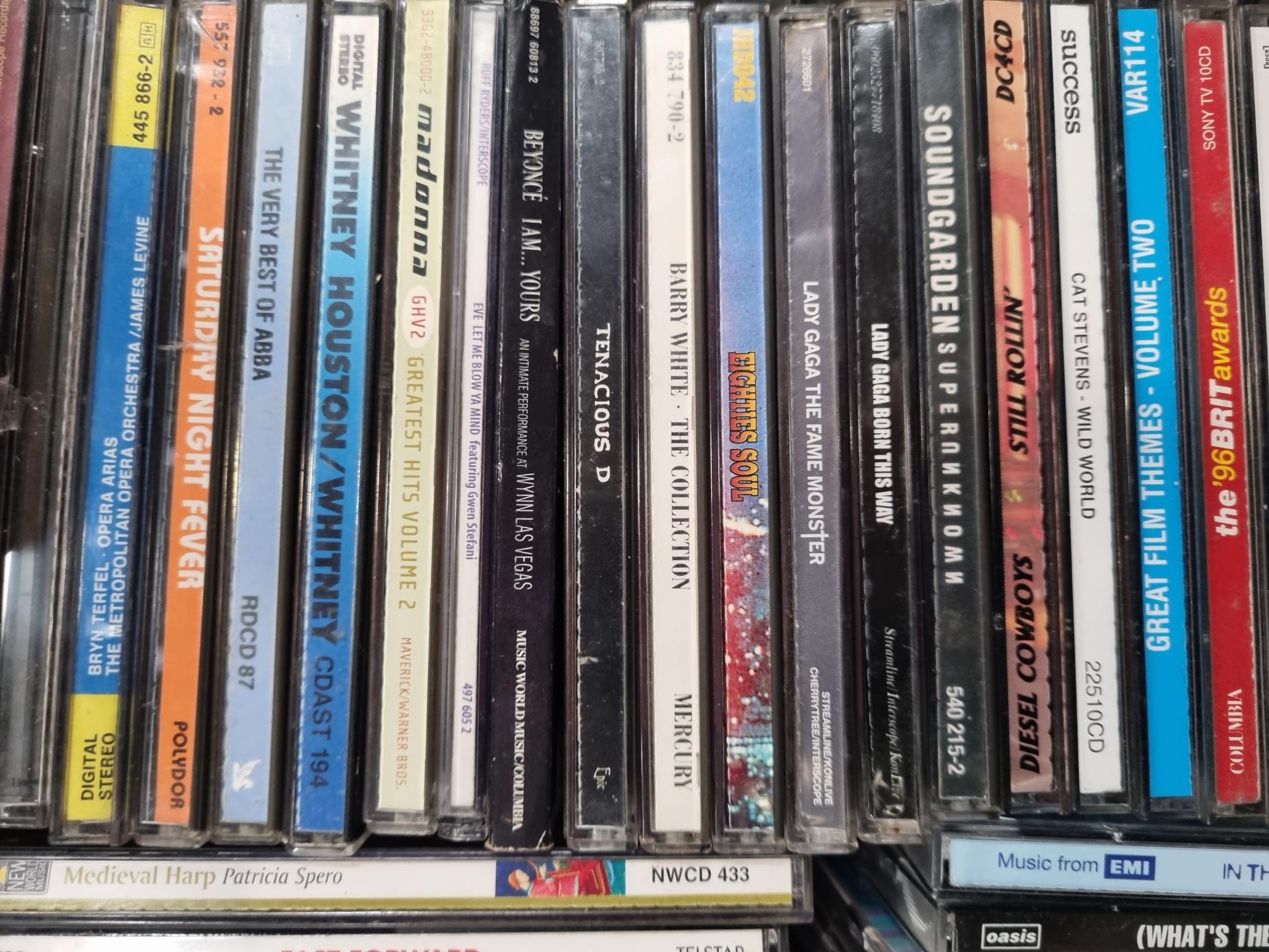 A large collection of compact discs (CDs) encompassing various genres including pop, rock, jazz, classical, and soundtracks. The collection is primarily housed in standard plastic jewel cases and stored within a green cardboard tray. Visible artists and titles include Oasis (What’s The Story) Morning Glory?, Eminem The Marshall Mathers LP, Lady Gaga The Fame Monster and Born This Way, ABBA The Very Best of ABBA, Metallica Load, R.E.M. Automatic for the People, Soungarden Superunknown, Rage Against the Machine, Whitney Houston Greatest Hits Volume 2 and many more. The assortment also includes numerous compilation albums such as Now That’s What I Call Music! volumes 50 and 98, various classical recordings from labels such as EMI and Deutsche Grammophon, and original cast recordings including Saturday Night Fever and Andrew Lloyd Webber collections. Labels present include Virgin, Columbia, Mercury, and Telstar. The collection features a mix of studio albums, greatest hits, and multi-artist compilations from the late 20th and early 21st centuries.