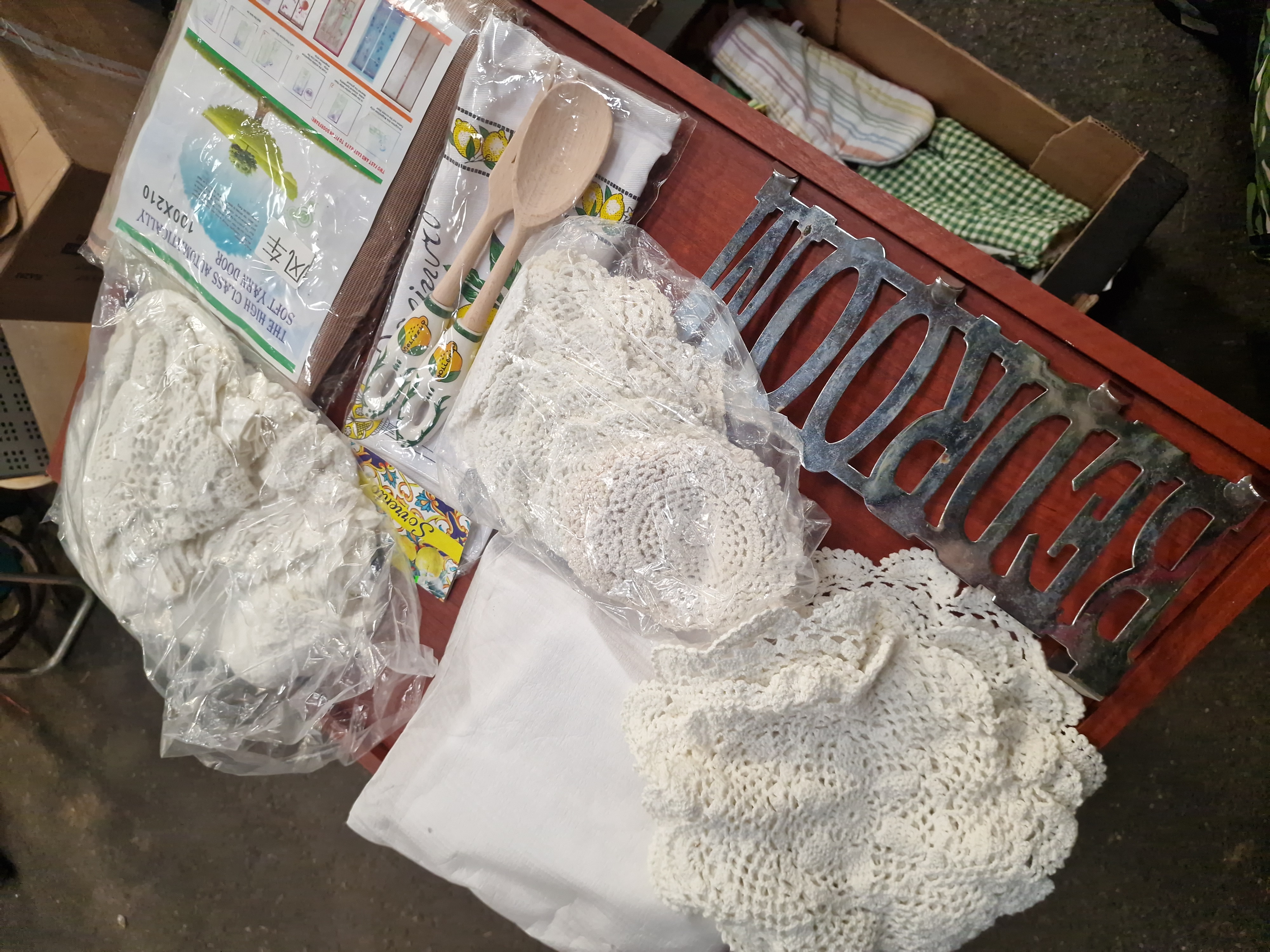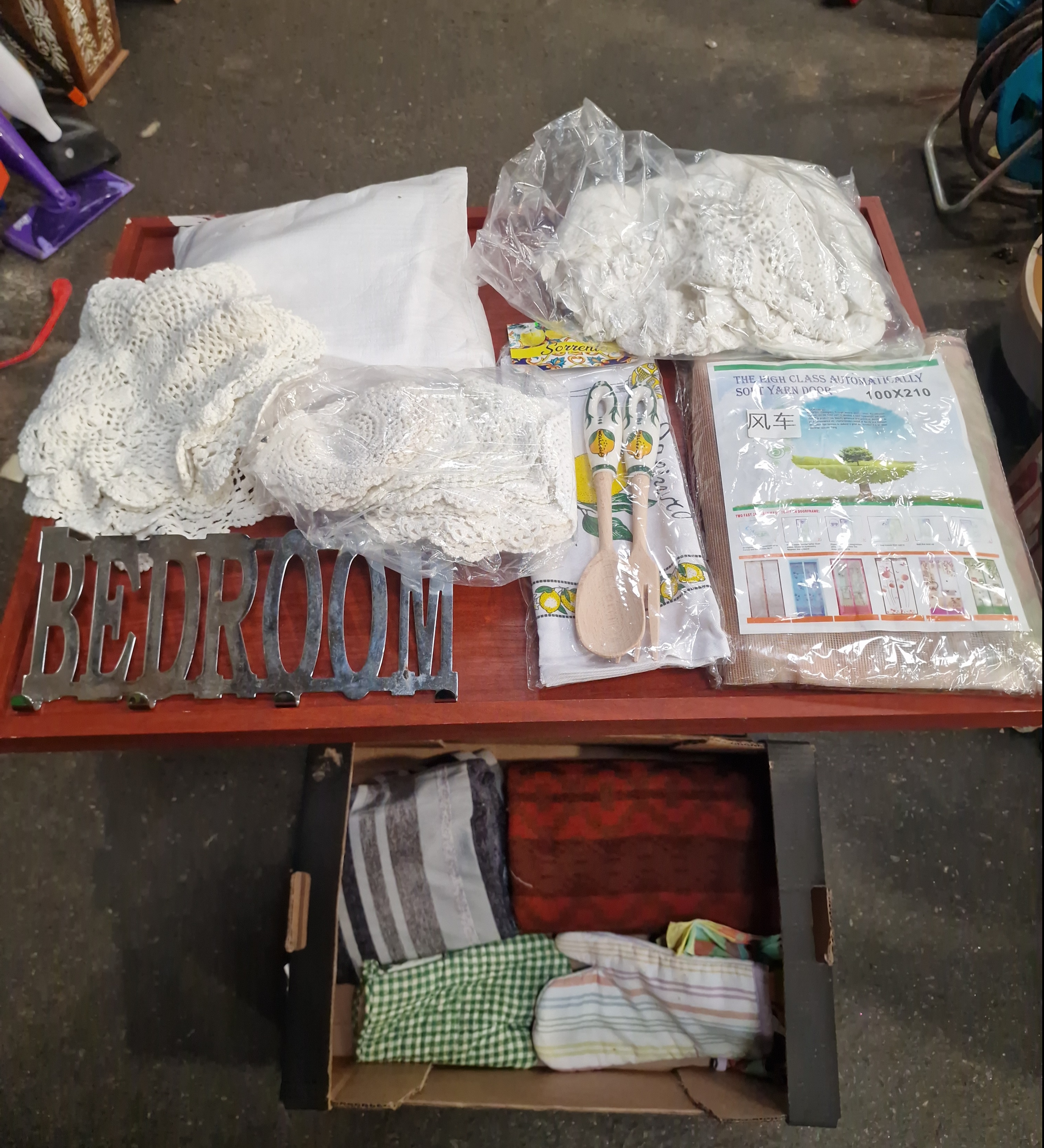 A collection of various household items and domestic textiles. The lot features a polished metal wall or door sign depicting the word BEDROOM in capitalised block lettering, attributed to the IKEA Lindrande series. Also included is a retail-packaged set of wooden salad servers with ceramic handles decorated with a lemon motif, paired with a coordinating tea towel bearing a Sorrento label. The lot is completed by an assortment of domestic textiles contained within a cardboard box, including various plaid and striped fabrics and several white crocheted lace doilies with floral and geometric patterns.