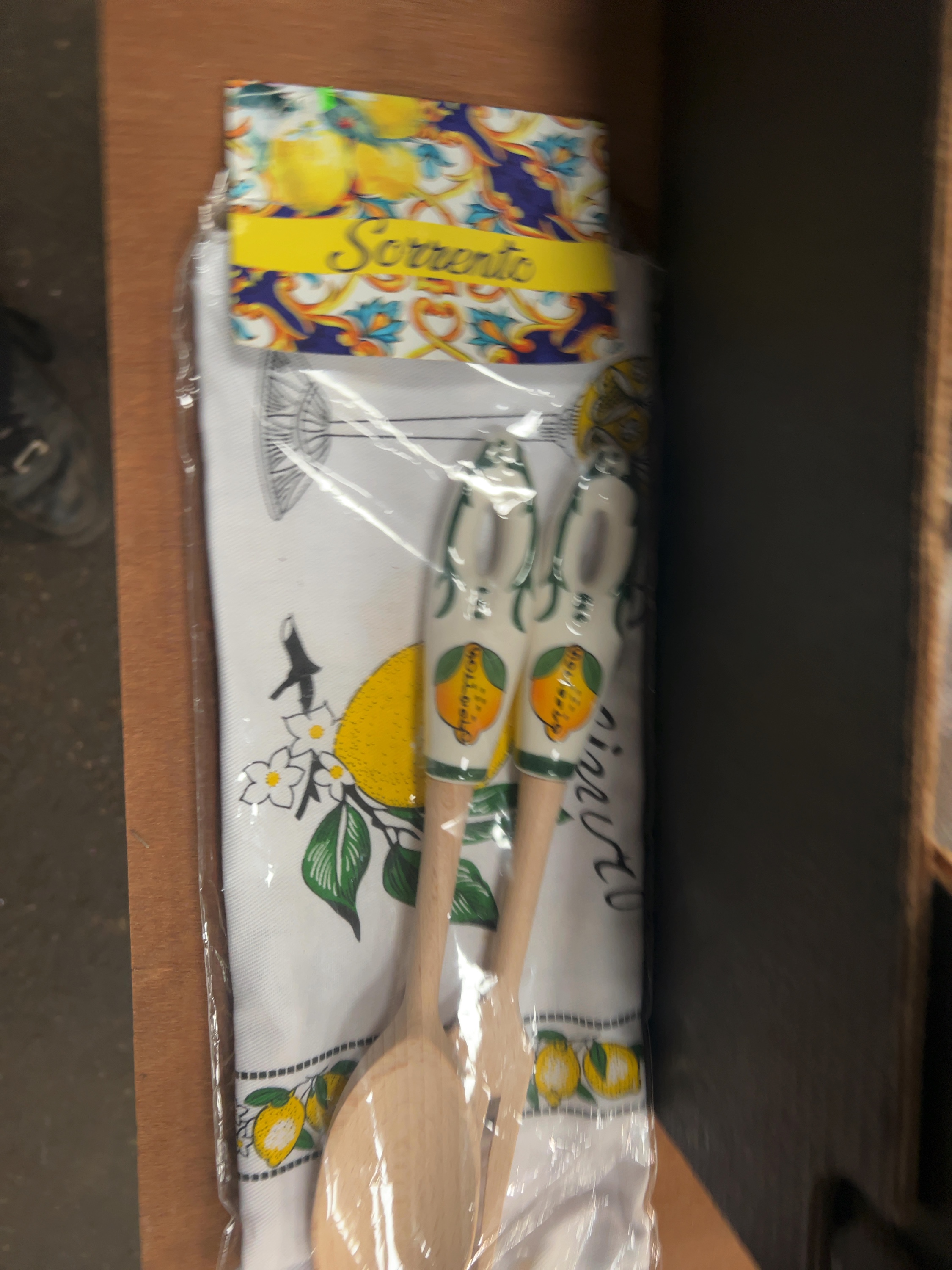 The items appear to be in good overall condition. The salad servers and coordinating tea towel remain in their original retail packaging. The textiles and metal sign show no significant signs of wear, staining, or damage upon visual inspection.