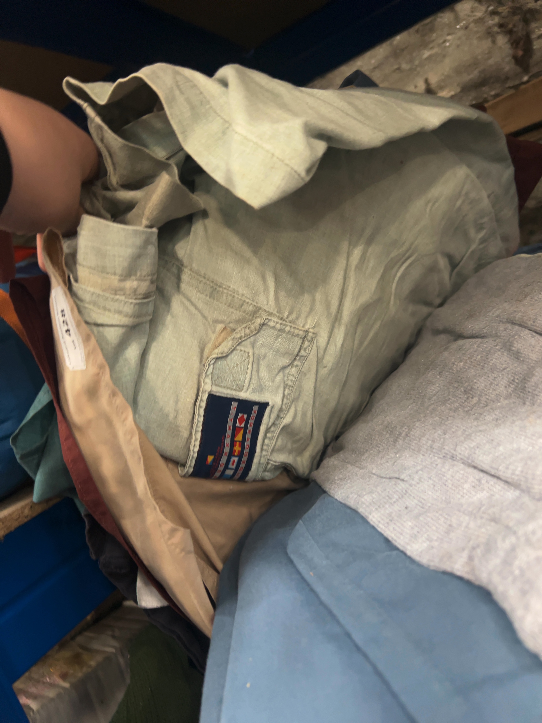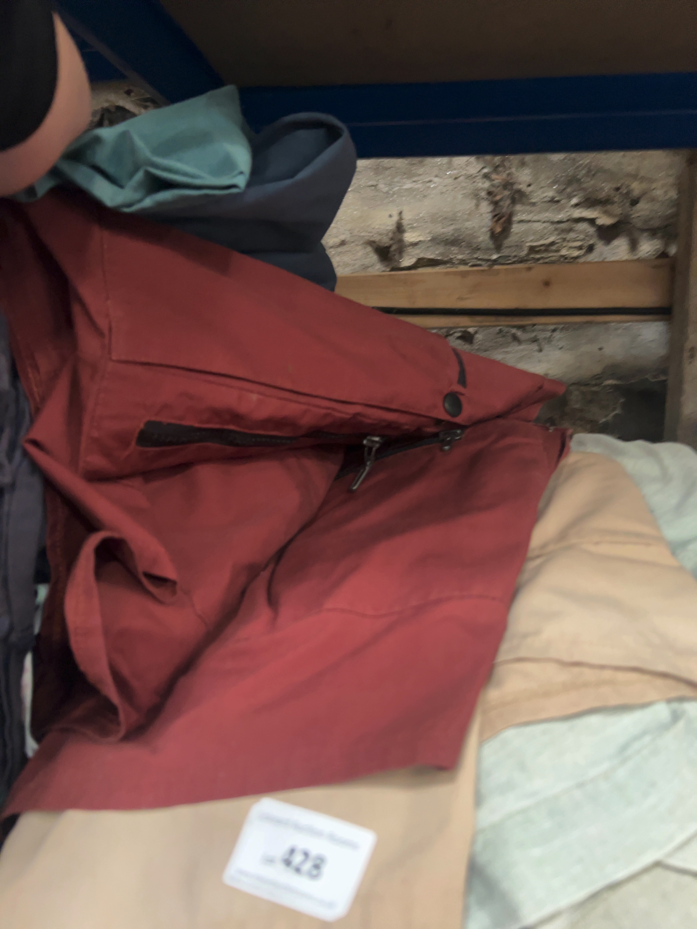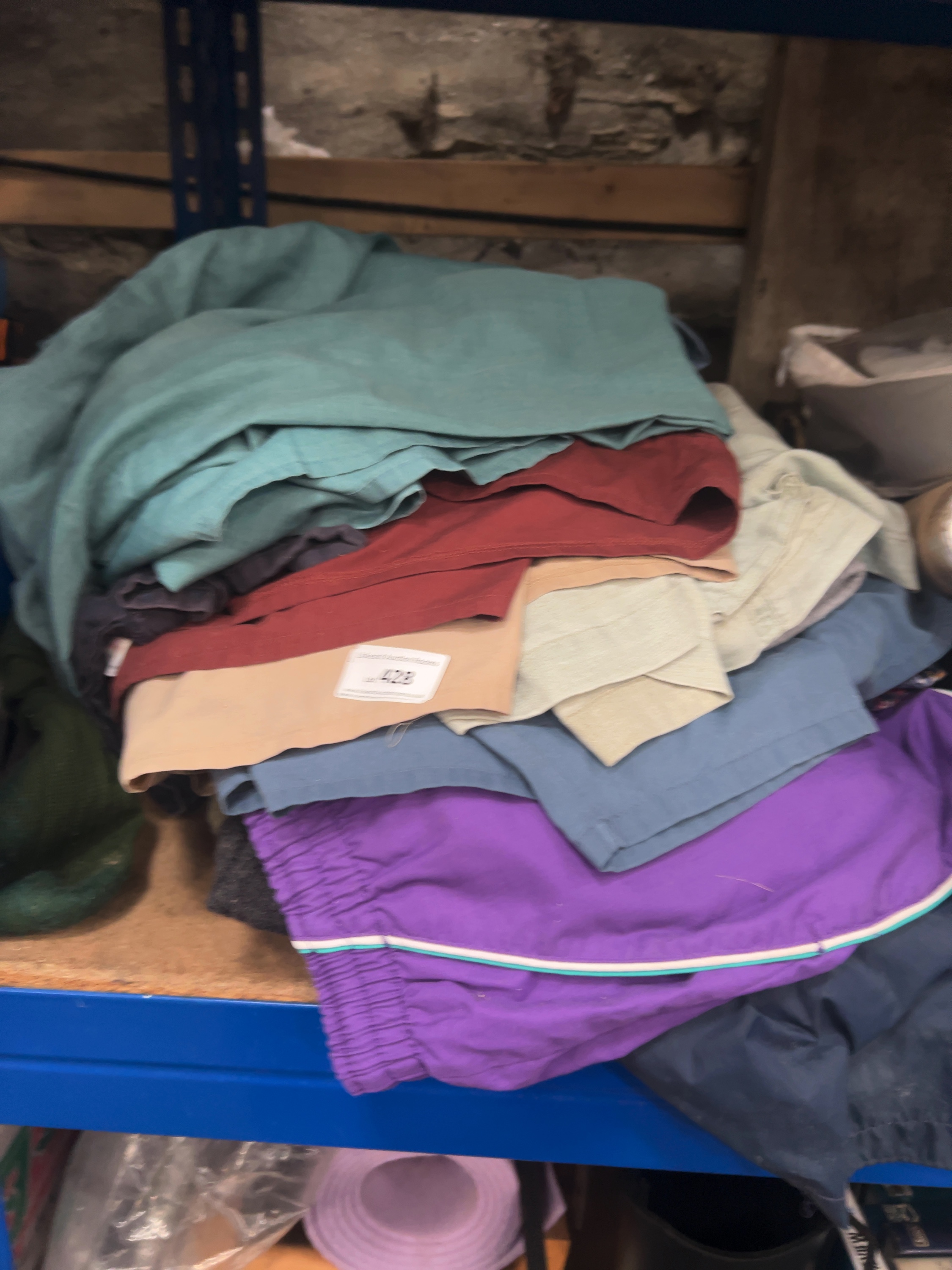 A collection of assorted contemporary and vintage casual clothing and sportswear, primarily dating from the late 20th century. The lot includes a light blue chambray-style long-sleeved shirt featuring a patch pocket on the breast with a woven navy blue rectangular label. The label is embroidered with the text FORWARD STATION above a series of five nautical signal flags. Also included is a pair of vibrant purple shorts with an elasticated waistband and a thin white and turquoise contrast stripe. The lot contains a reddish-brown utility garment, possibly a light jacket or trousers, featuring a zip-fastened pocket with a metal pull and a metal snap-button closure. Knitwear is represented by a dark grey or black knitted garment with horizontal stripes in light blue and olive green. Other folded garments are present in a palette of teal, tan, terracotta, and muted blue. Materials include cotton, denim, synthetic blends, and wool or acrylic knits. Several items bear adhesive lot stickers printed with the number 428.