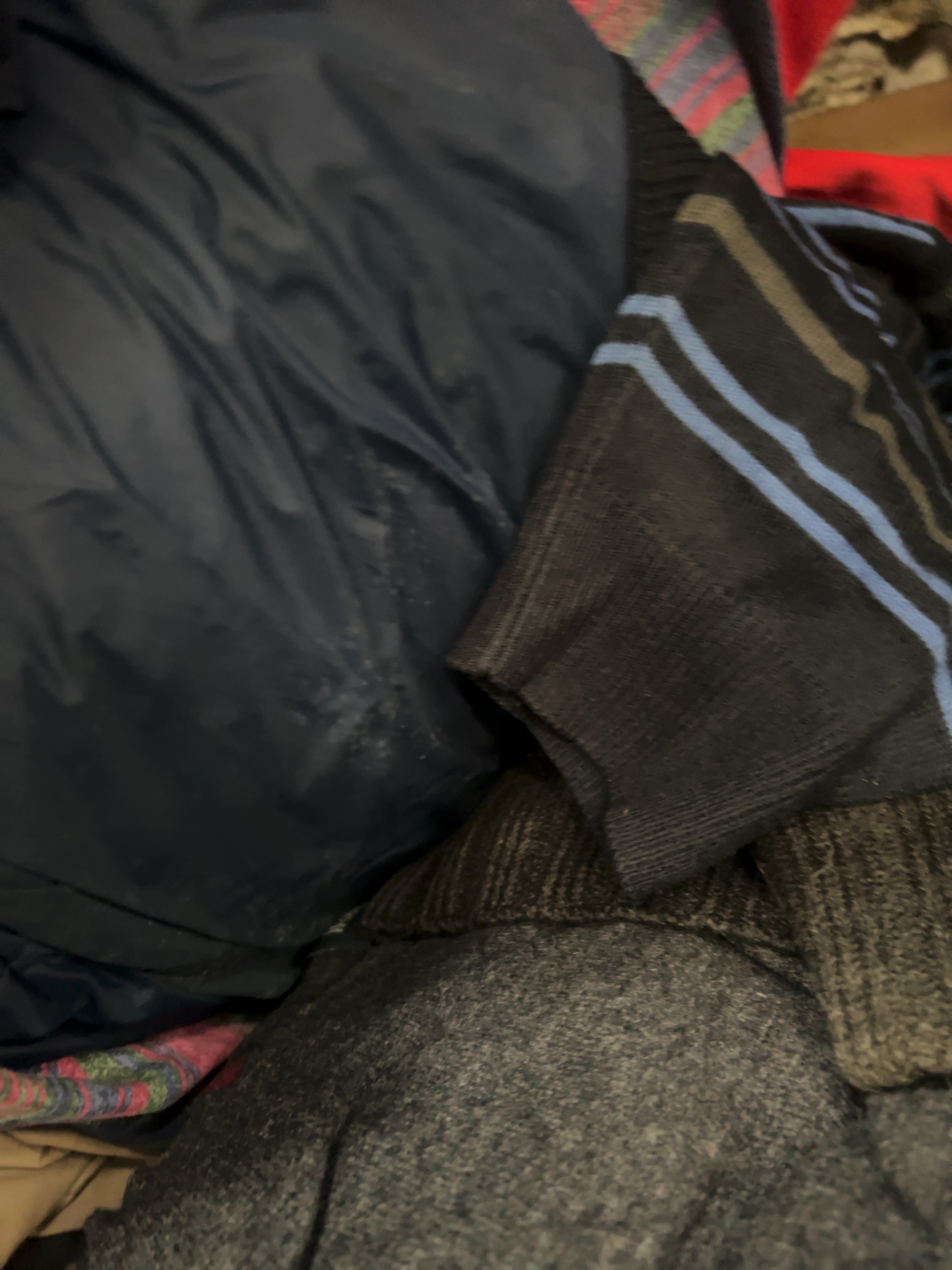 The items are in used, fair condition, showing signs of wear consistent with age and previous use. Some surface dust and marking are visible on the darker synthetic fabrics. The garments are presented in a folded, unpressed state and would benefit from laundering.