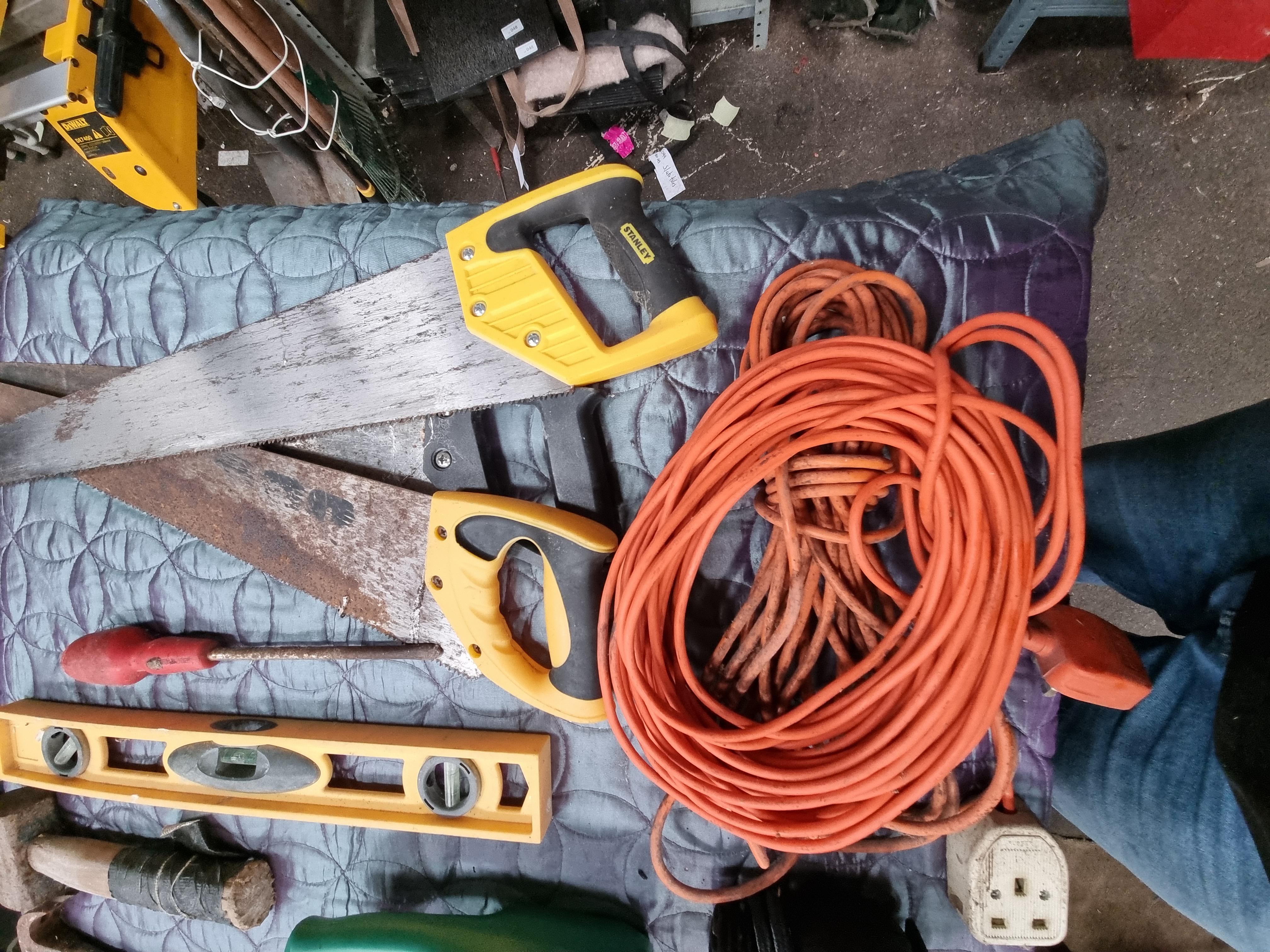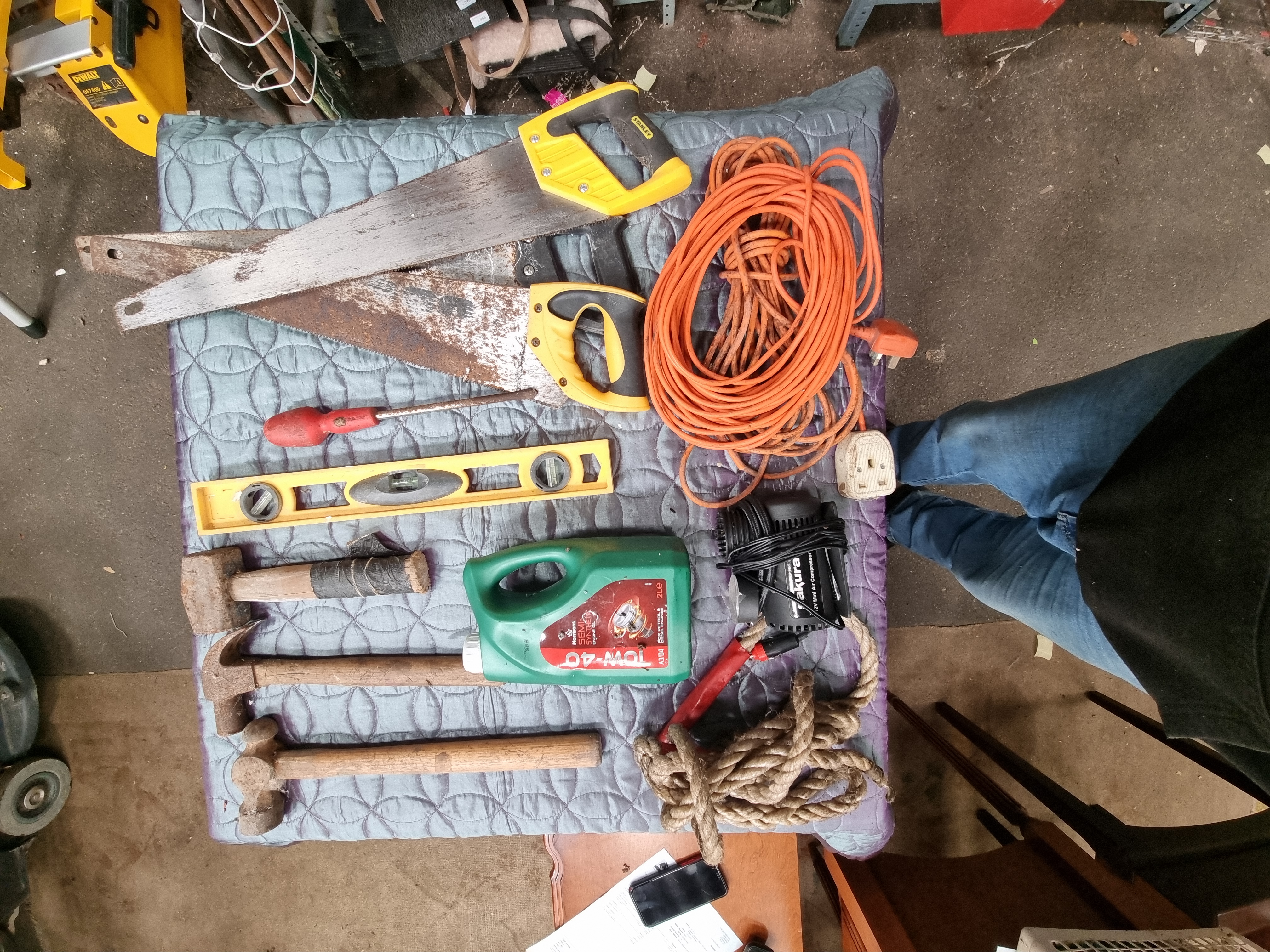 All items are in used condition and show varying degrees of wear, dirt, and surface corrosion. The steel saw blades and hammer heads show significant oxidation. The club hammer wooden handle has a repair using black tape. The rope shows fraying and signs of use. The electrical functionality of the 12V compressor and the extension lead has not been tested. Items are sold as seen.
