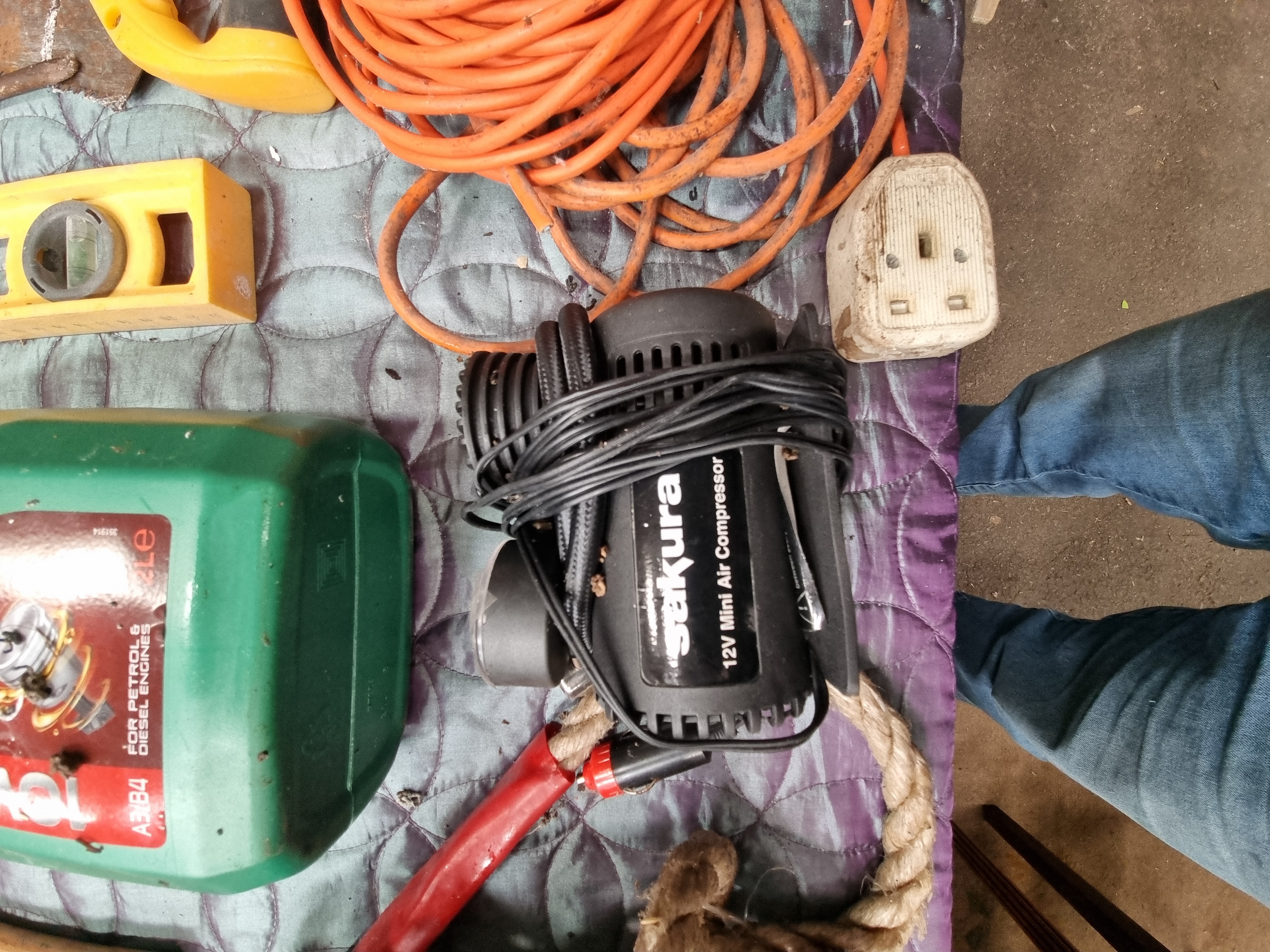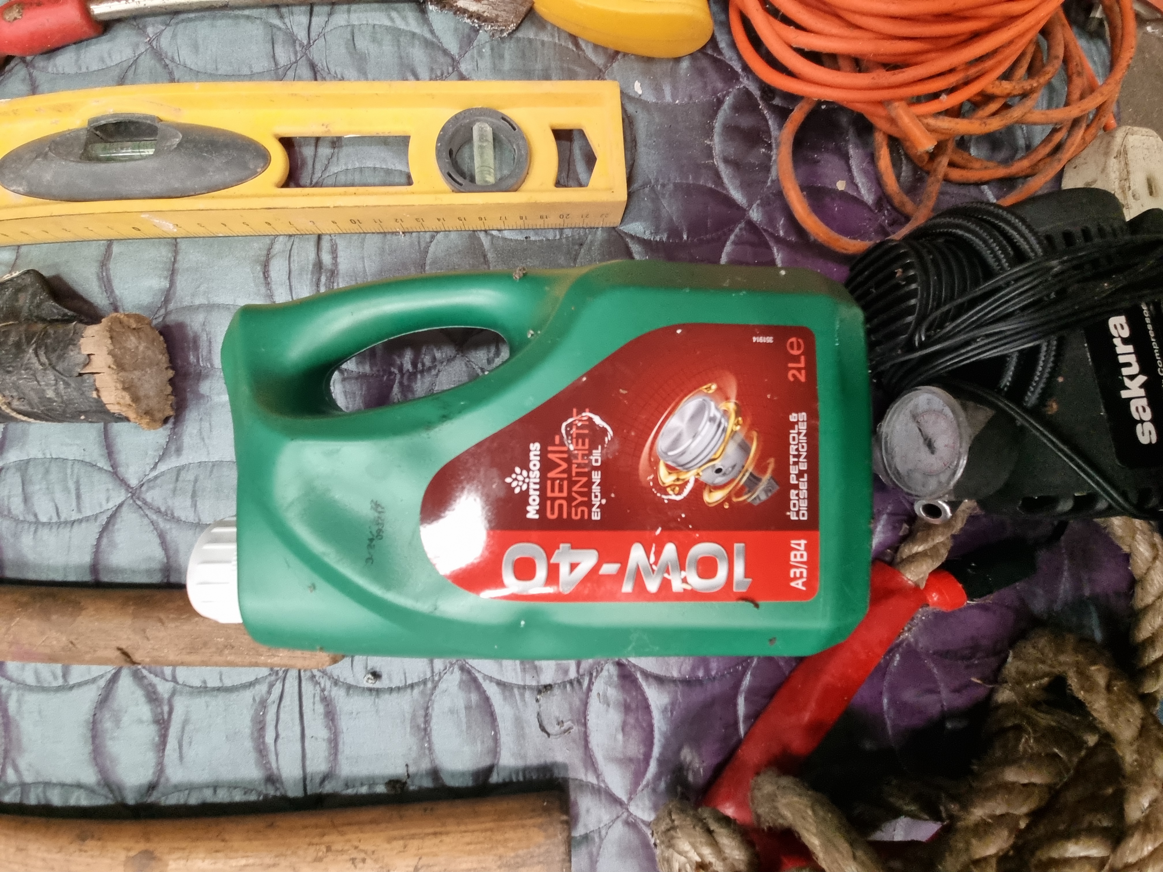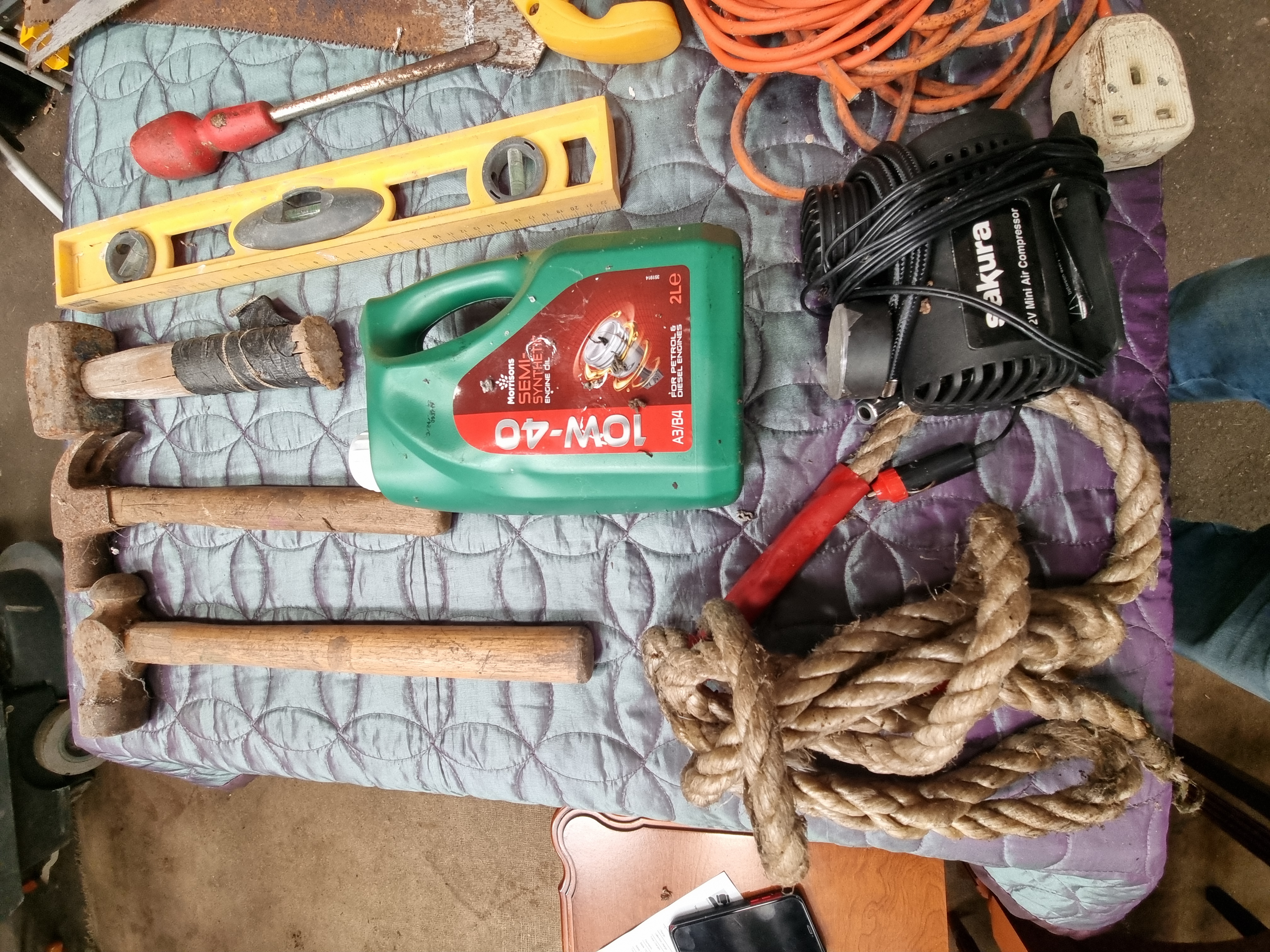 A collection of workshop and automotive equipment. The hand tools include two saws with composite handles, one bearing the Stanley mark. There are three hammers: a claw hammer, a ball-peen hammer, and a club hammer, all with wooden handles. A yellow plastic spirit level with three vials and a graduated ruler scale is included, alongside a screwdriver with a red plastic handle. Automotive items consist of a Sakura 12V mini air compressor with an integrated pressure gauge and car power adapter, and a 2-litre container of Morrisons 10W-40 semi-synthetic engine oil. Miscellaneous items include a coiled orange extension lead with a UK three-pin plug and a length of braided natural fibre rope.