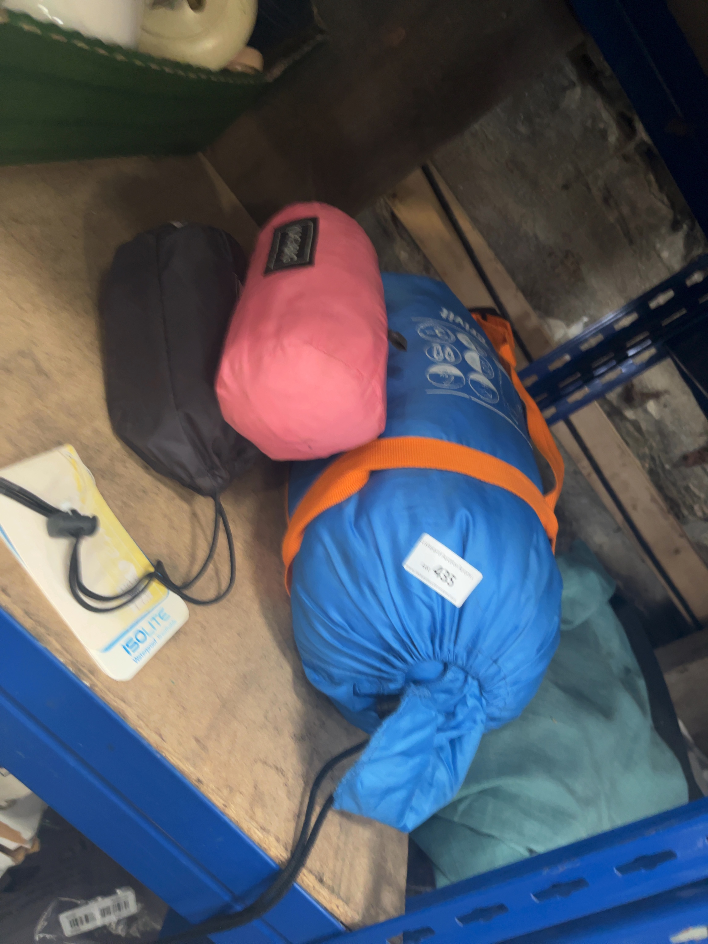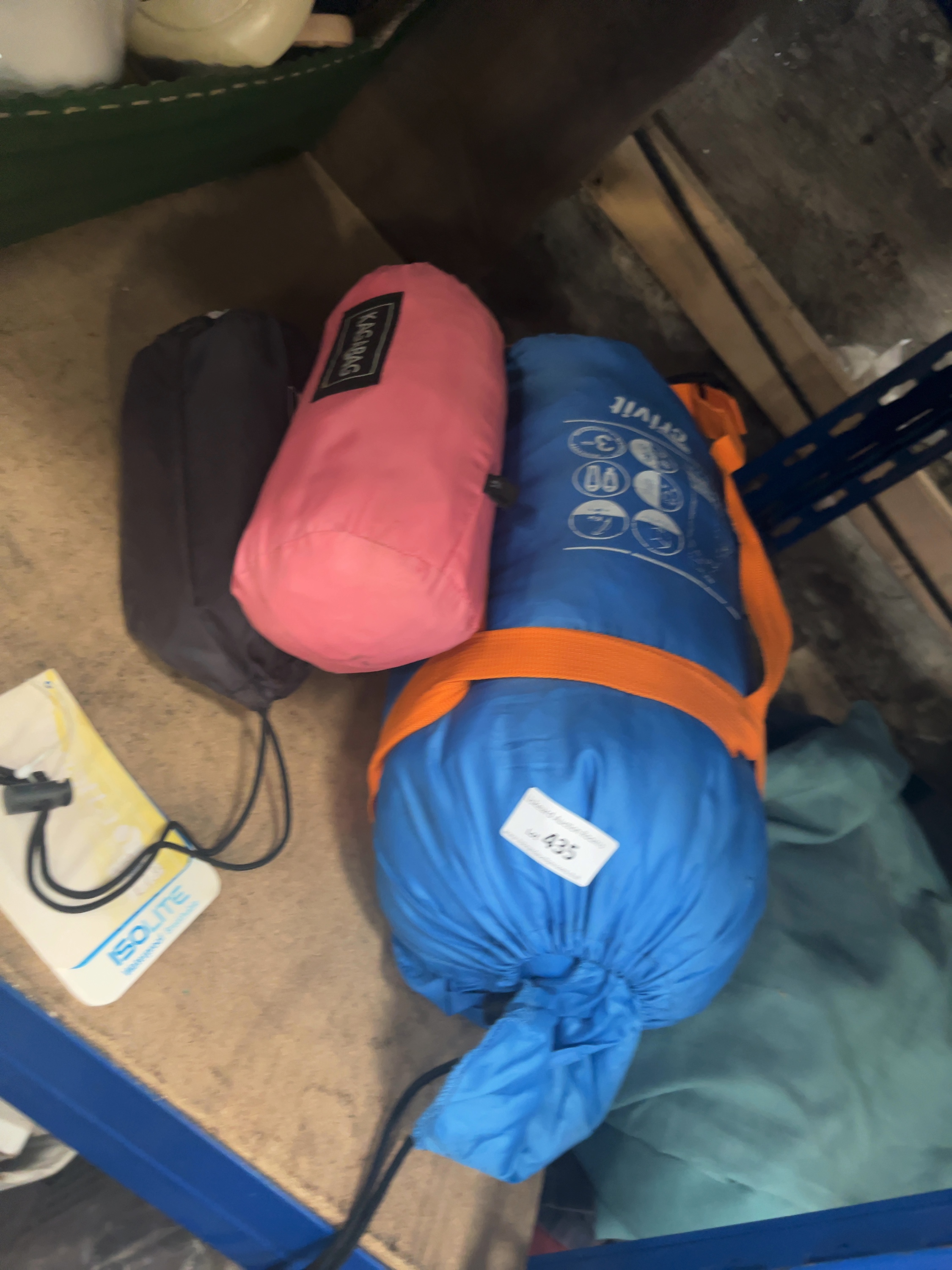 A collection of outdoor gear and sleeping bags. The lot features a blue Crivit equipment bag with orange compression straps and printed icons, identified by web consensus as containing a sleeping bag. Included is a pink Kagabag stuff sack with a black brand label and a black drawstring pouch. The lot also contains a white and yellow Regatta Isolite waterproof product tag or accessory pouch with a black cord and toggle. The items are made from synthetic textiles. A white auction sticker bearing the number 435 is attached to the largest item.