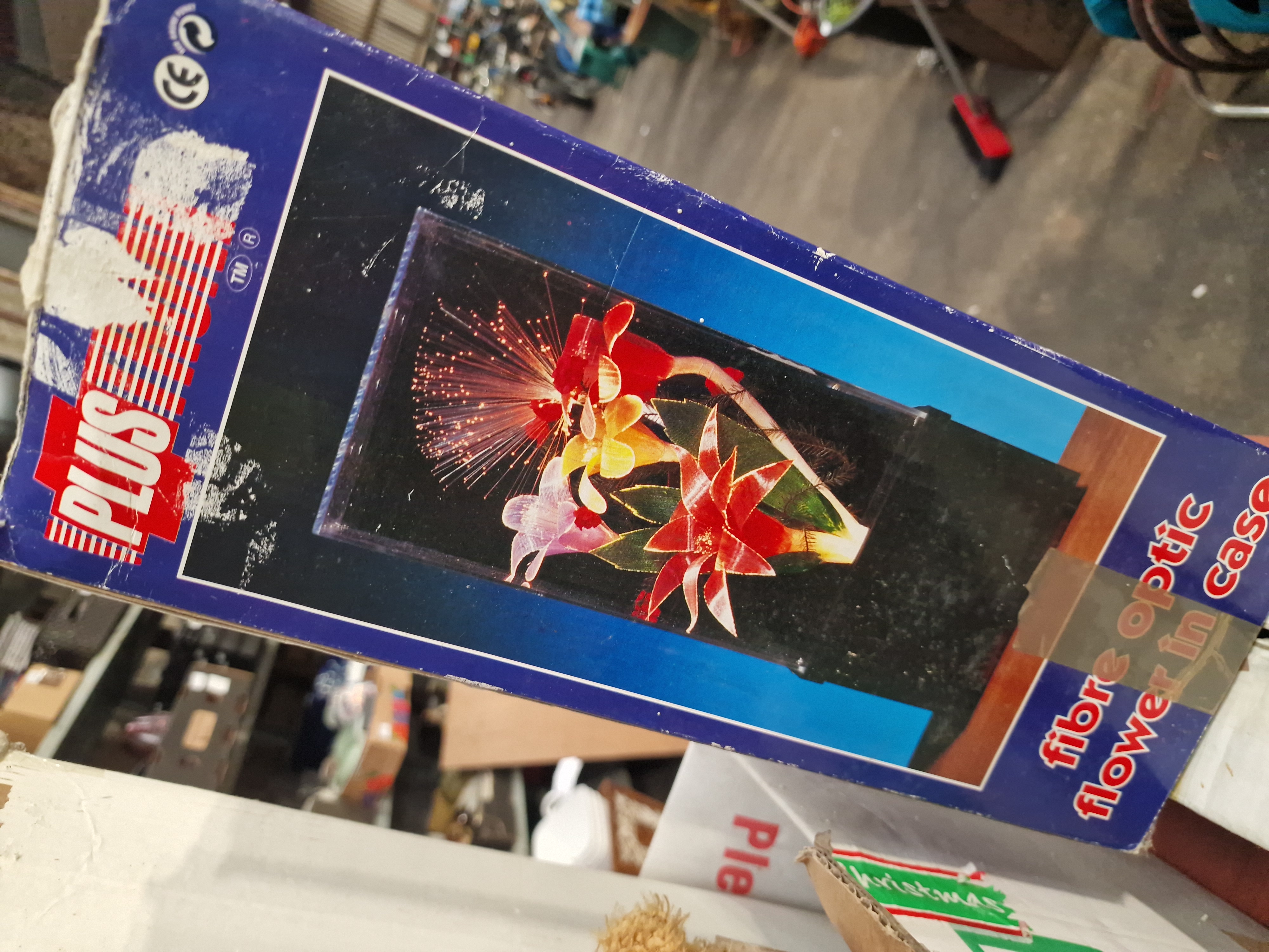 A collection of various boxed items and retail packaging containing household and decorative goods. The group includes festive-themed boxes decorated with graphic symbols of bells and crowns. One blue retail box is marked with the word PLUS and features an illustration of a bird. Also included is a shipping carton bearing a label with the following specifications: QTY: 1, N.W.: 0.86 KG, G.W.: 1.17 KG, and dimensions 84 x 13 x 13 CM. This carton also displays a CE mark and standard disposal symbols.