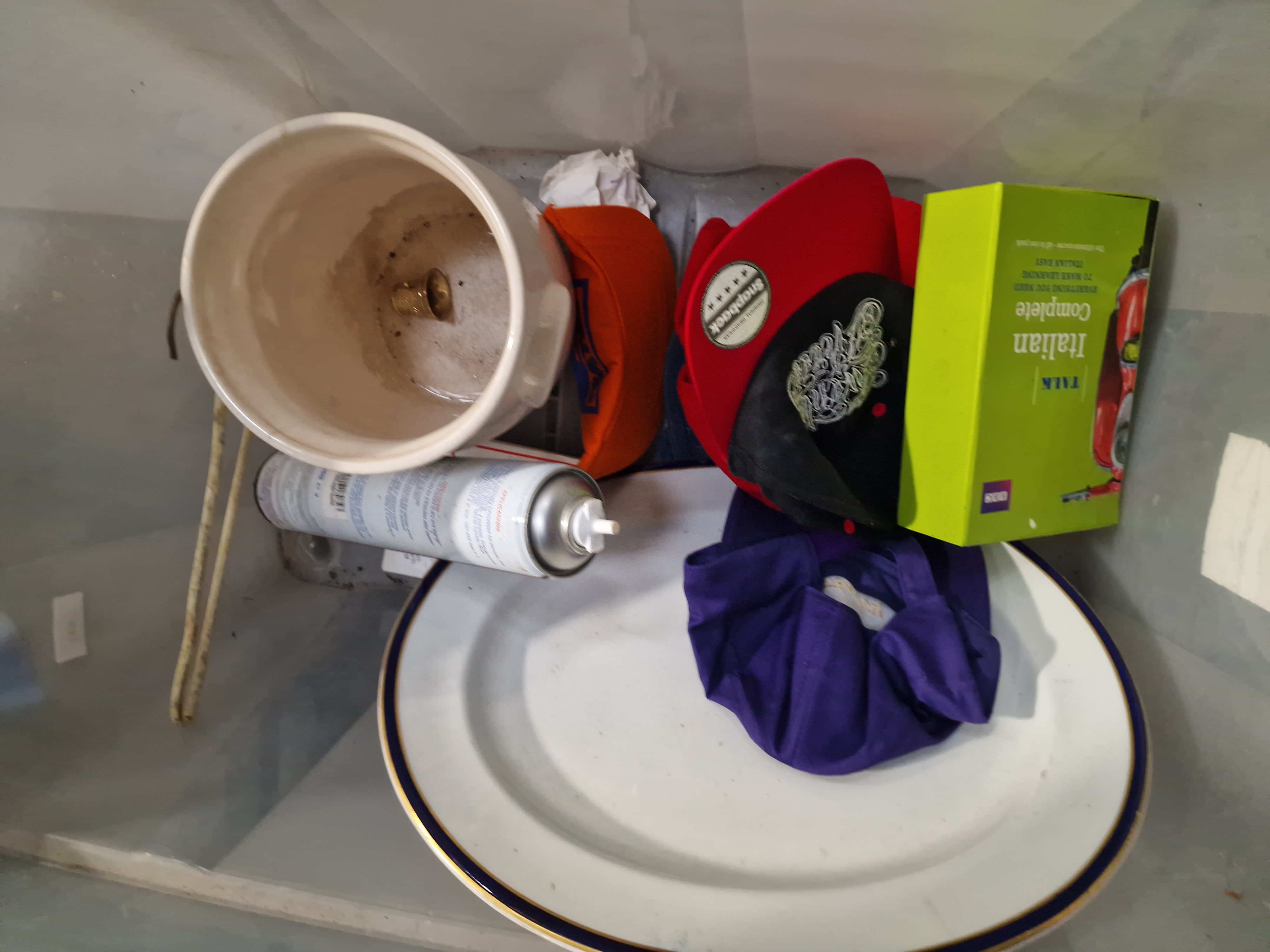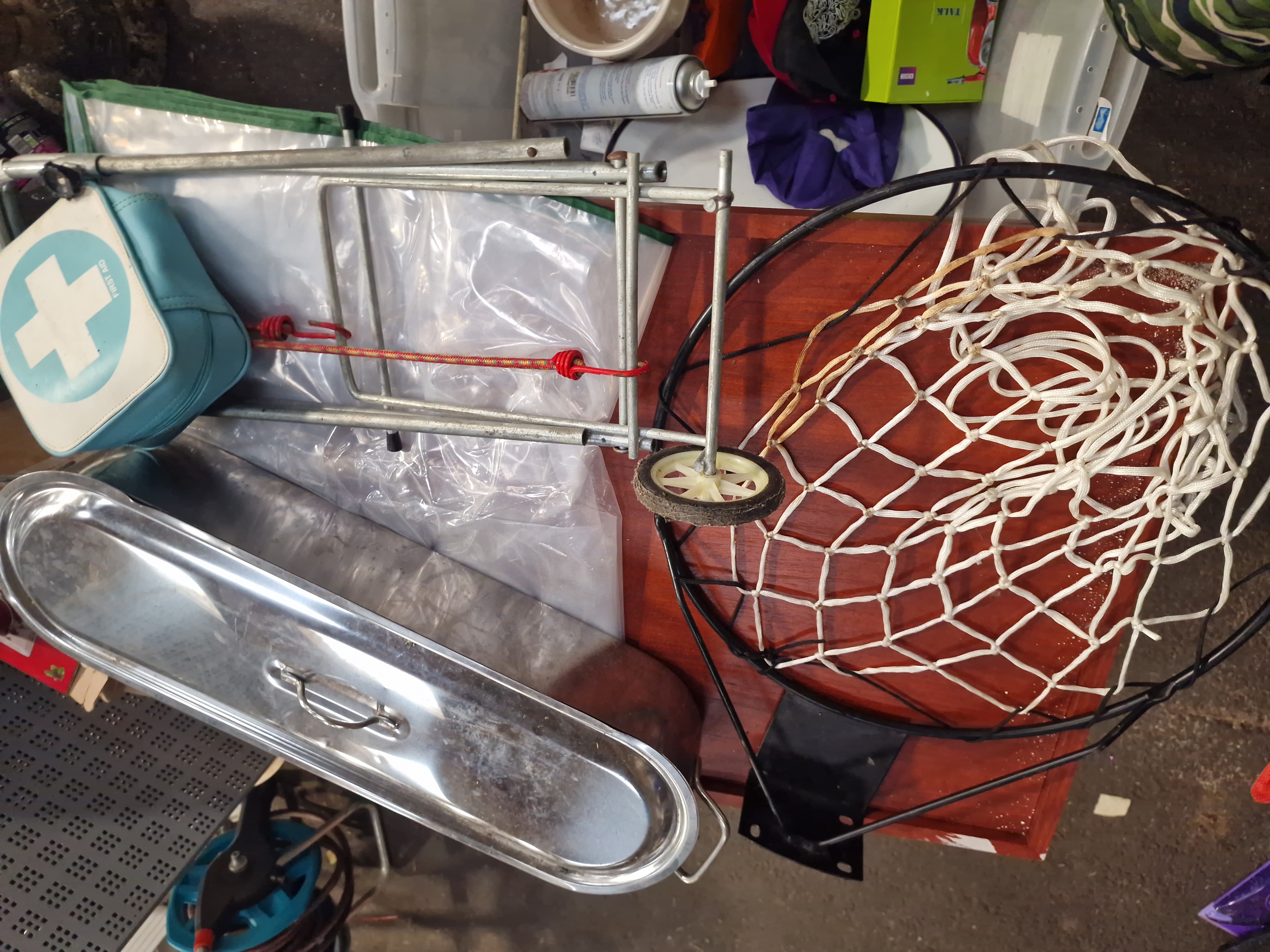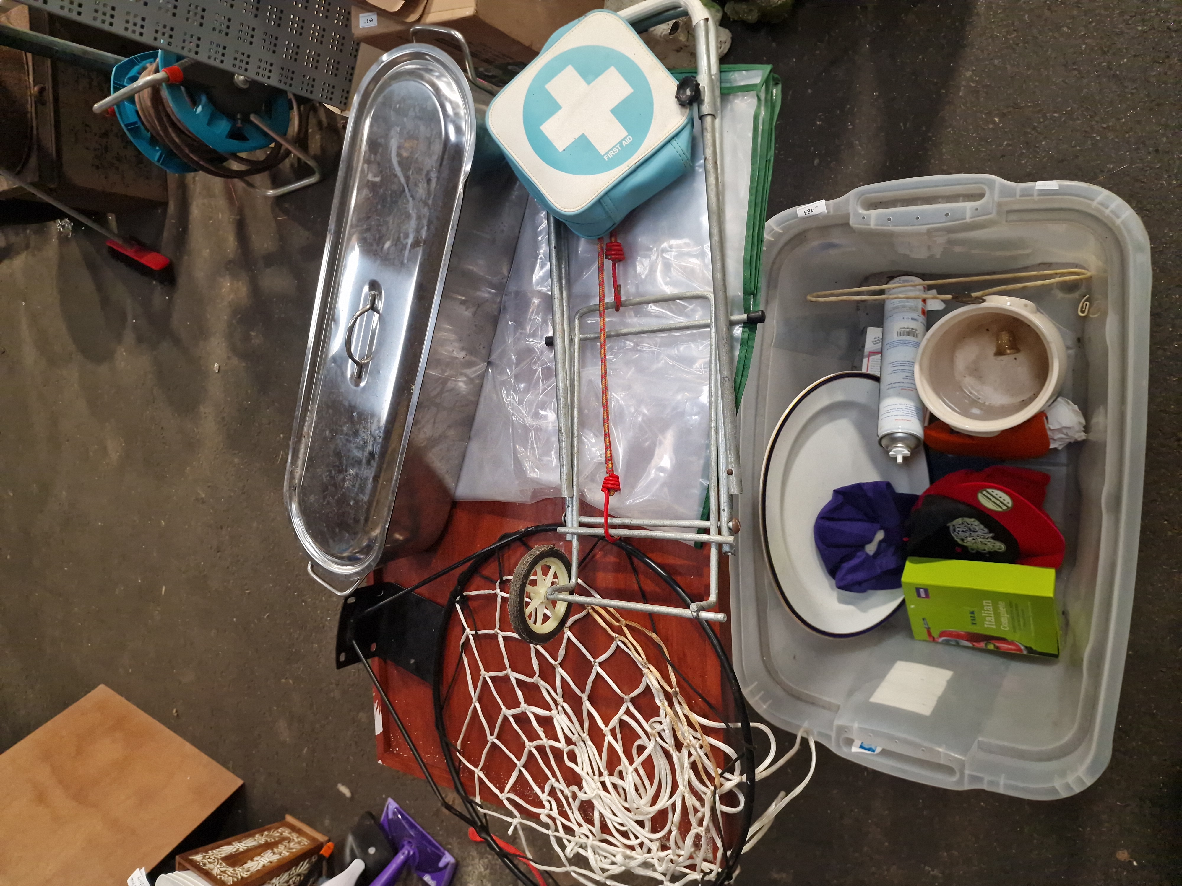 The items are in used condition, consistent with a general auction lot. The wooden table and lamp appear to be in fair condition with minor surface wear. Items within the storage containers are loose and show signs of previous use, including potential surface scratches and dust accumulation. The basketball net shows signs of wear.