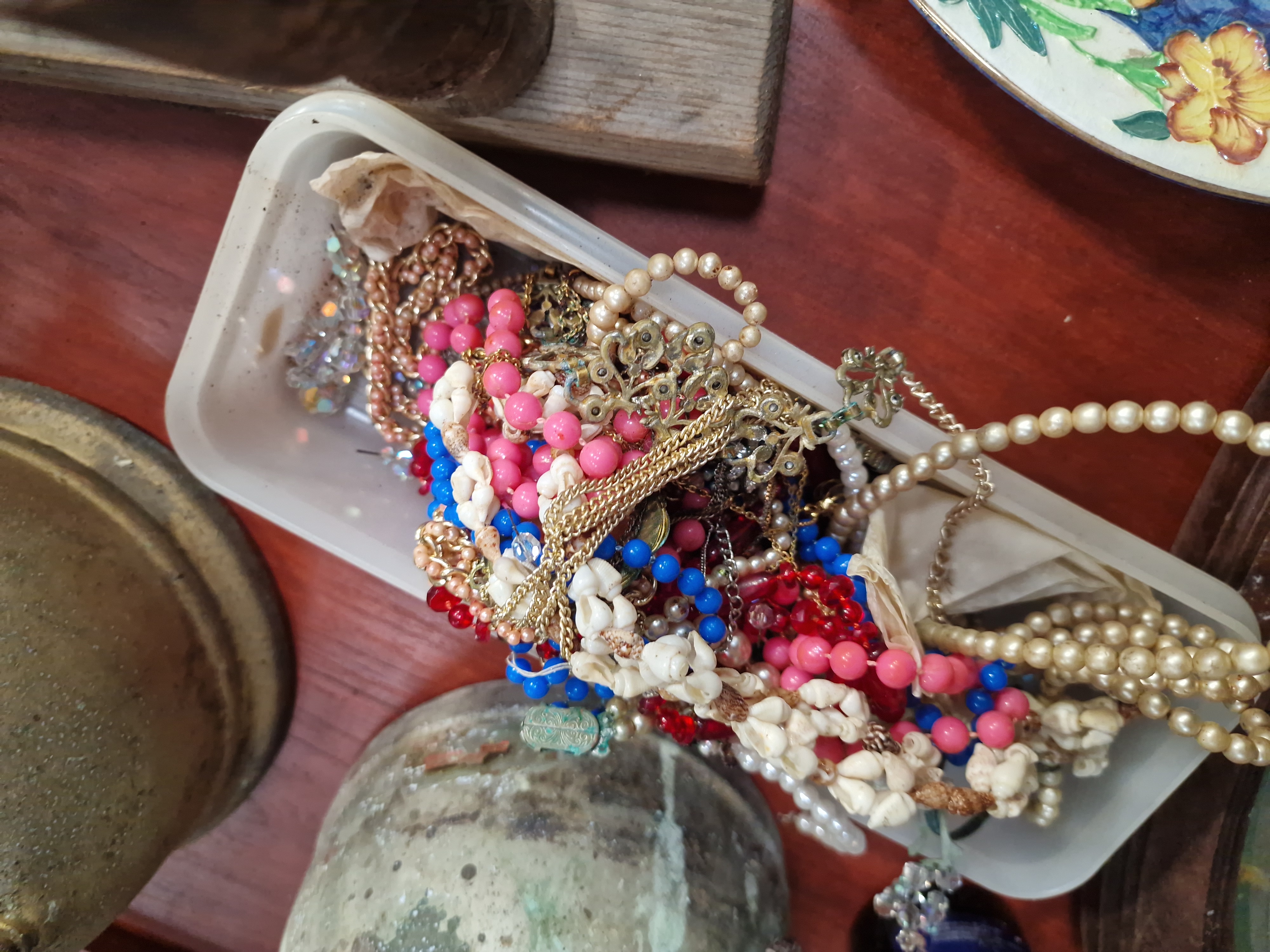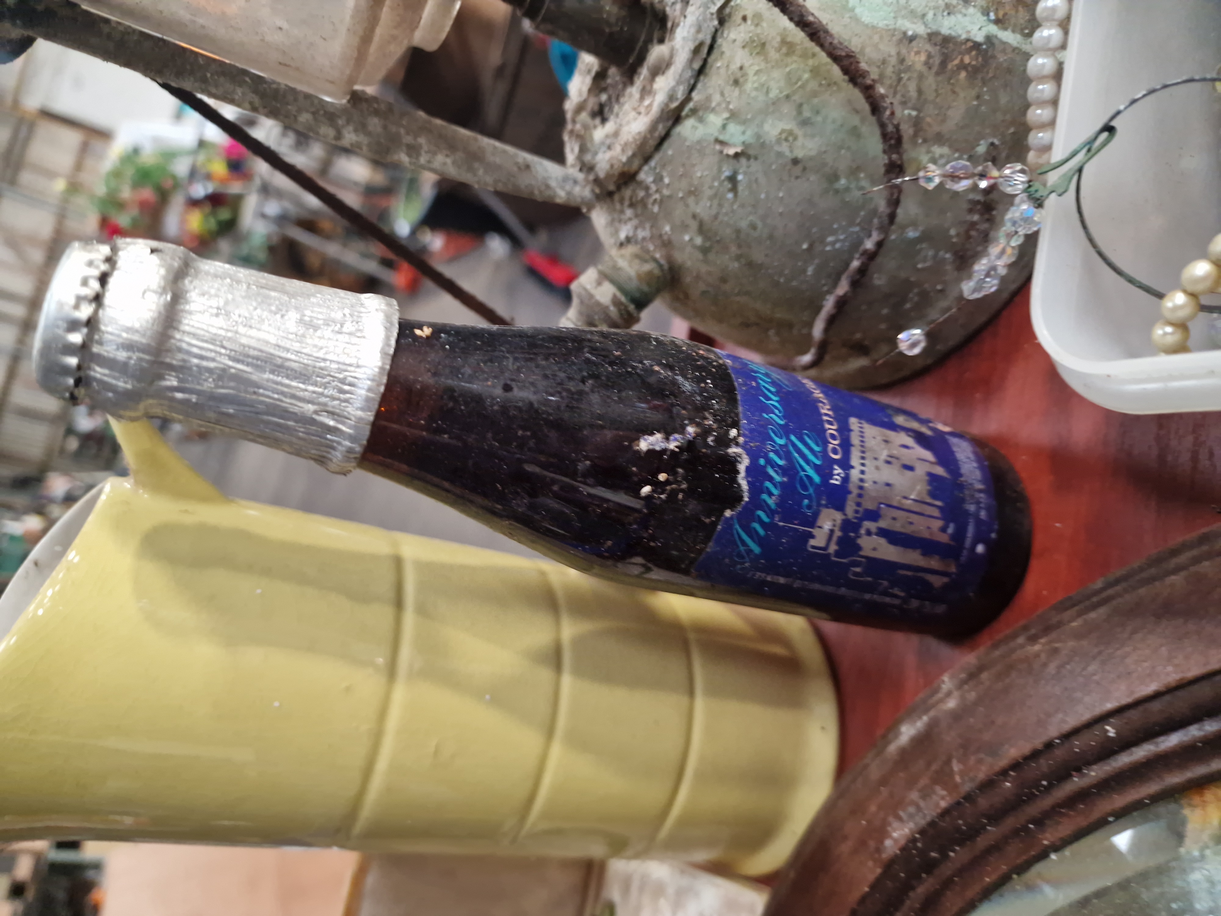 The items are in a weathered condition consistent with prolonged storage. The metal components exhibit heavy rust and surface oxidisation. The paper goods show signs of wear and age-related discolouration, and all items are covered in a layer of dirt and dust.