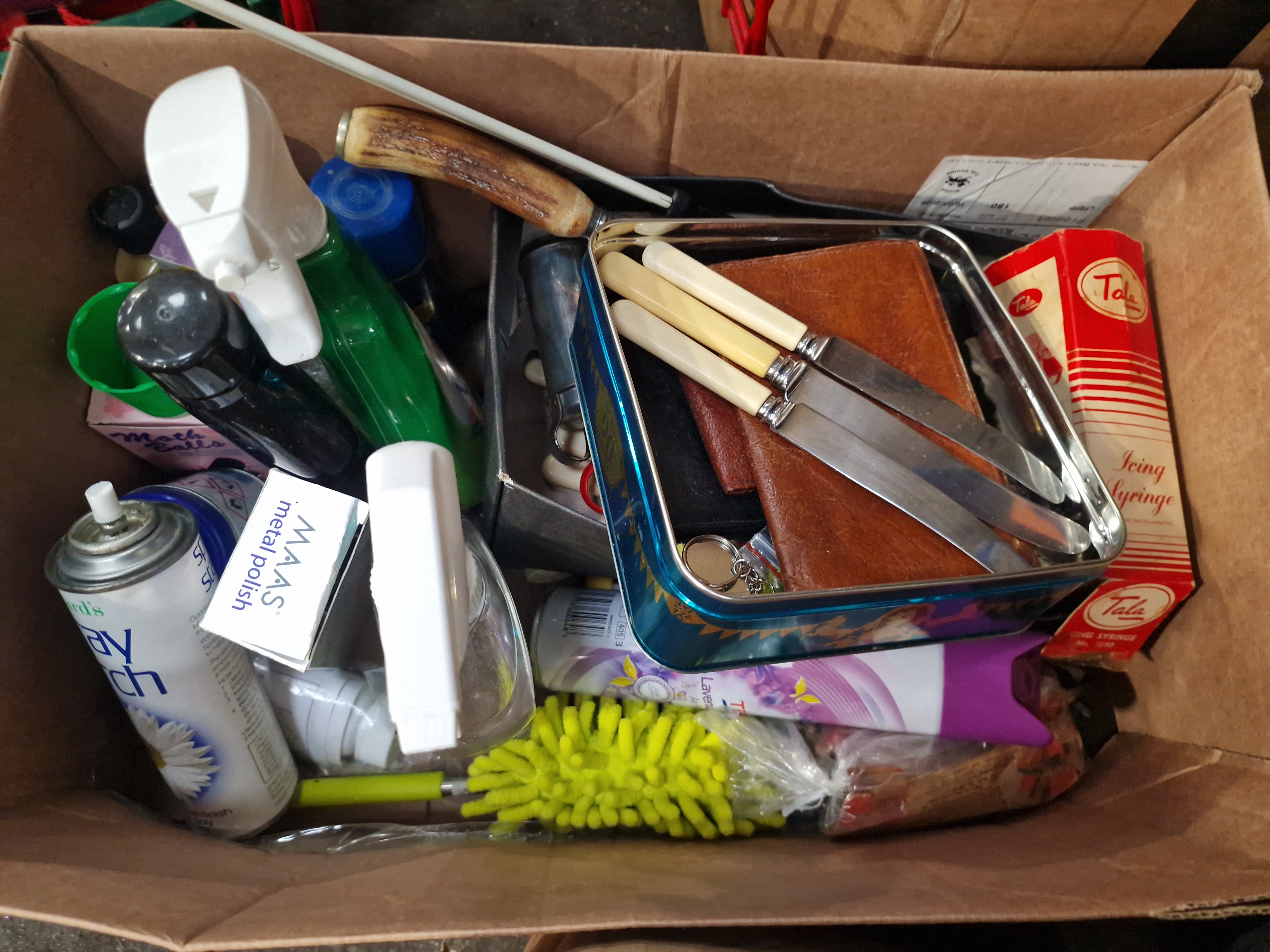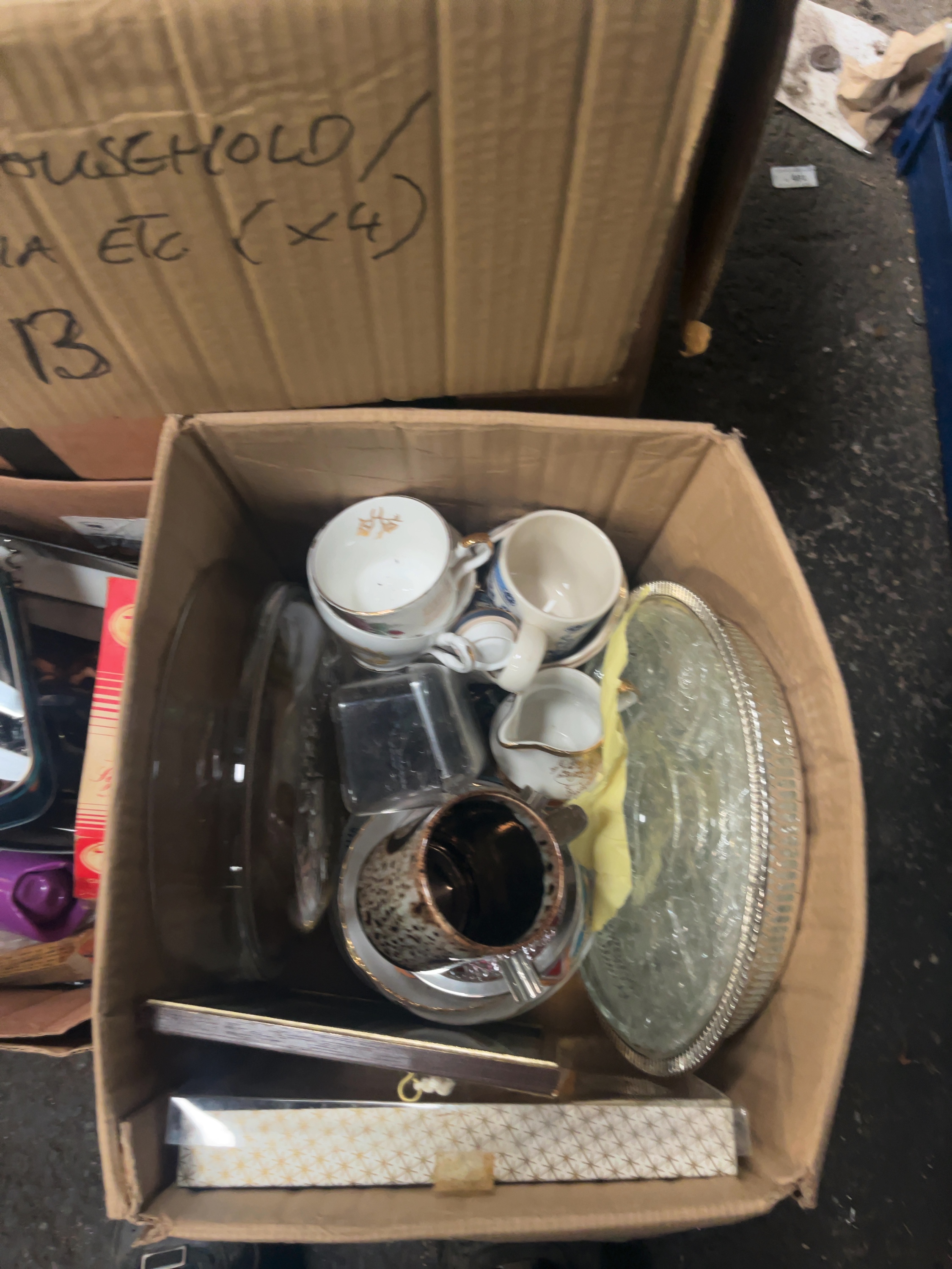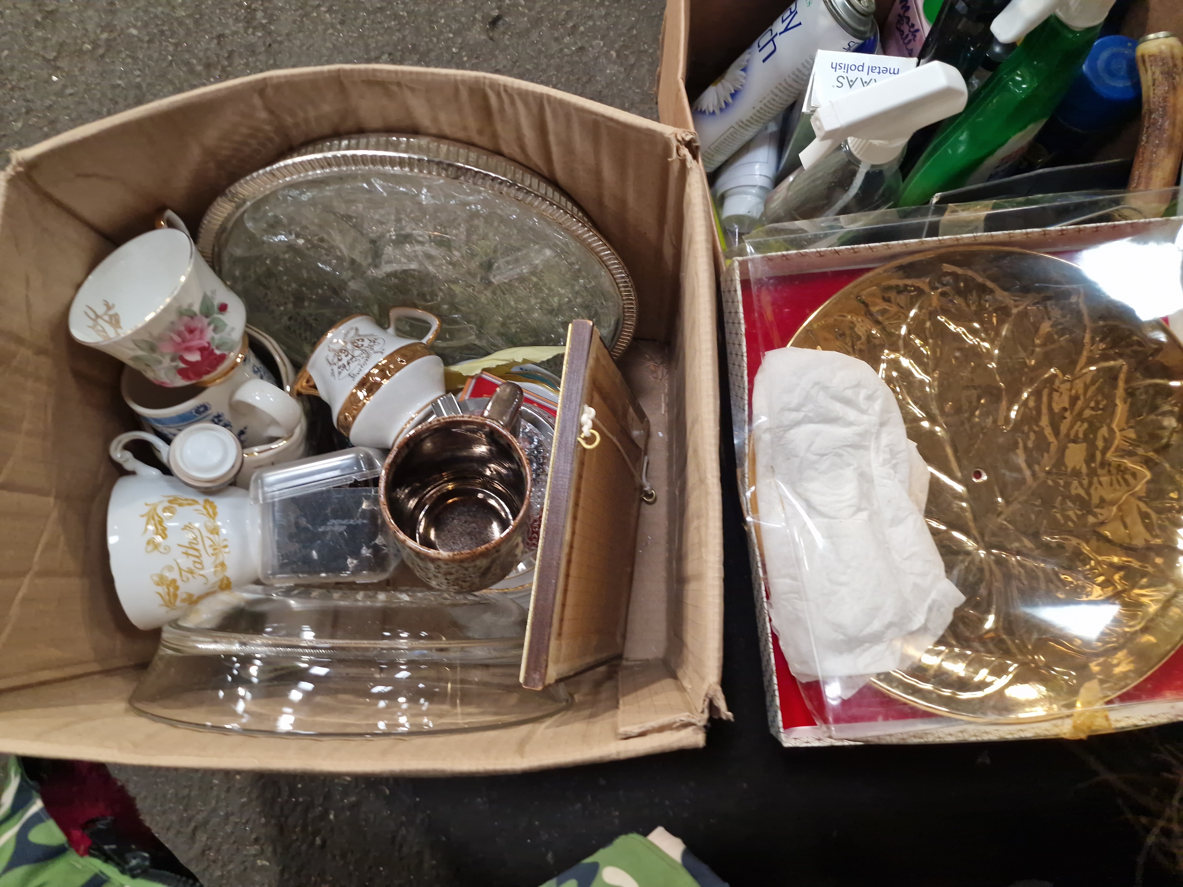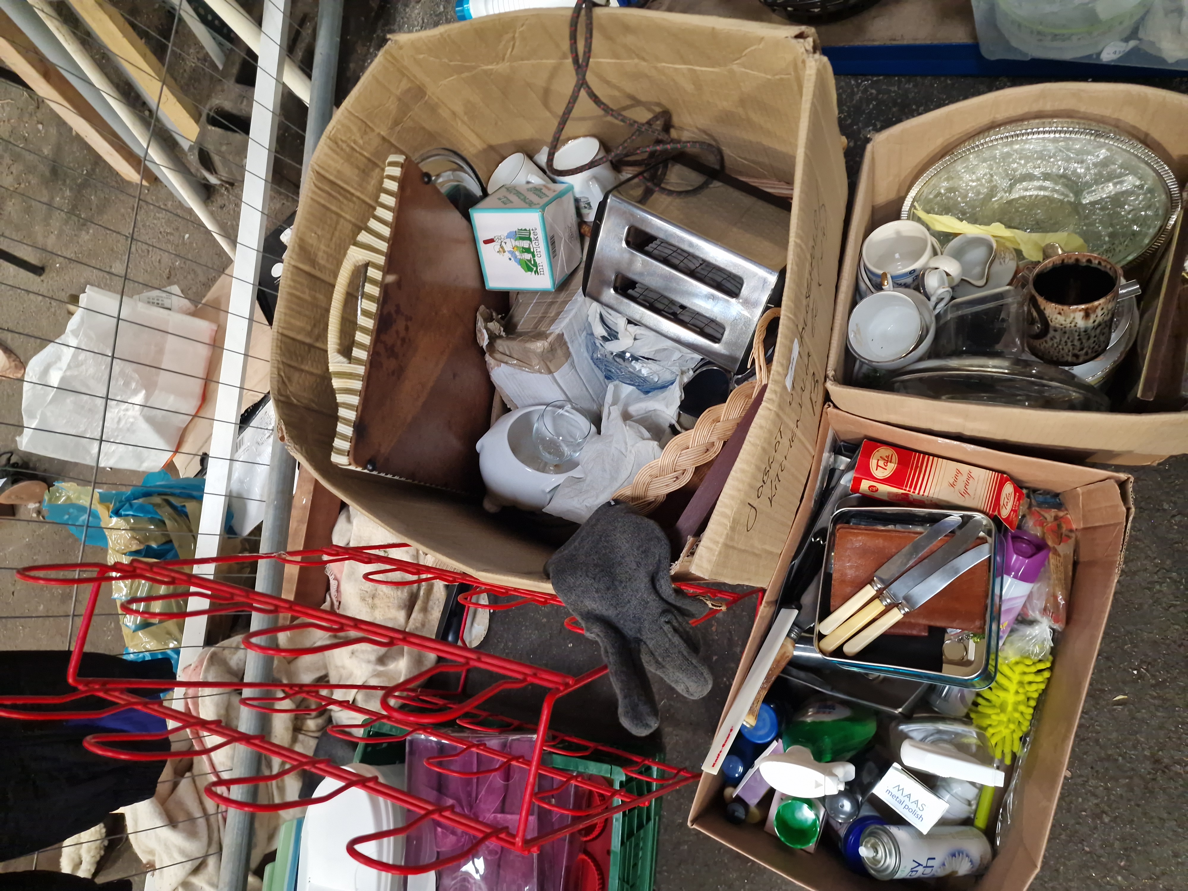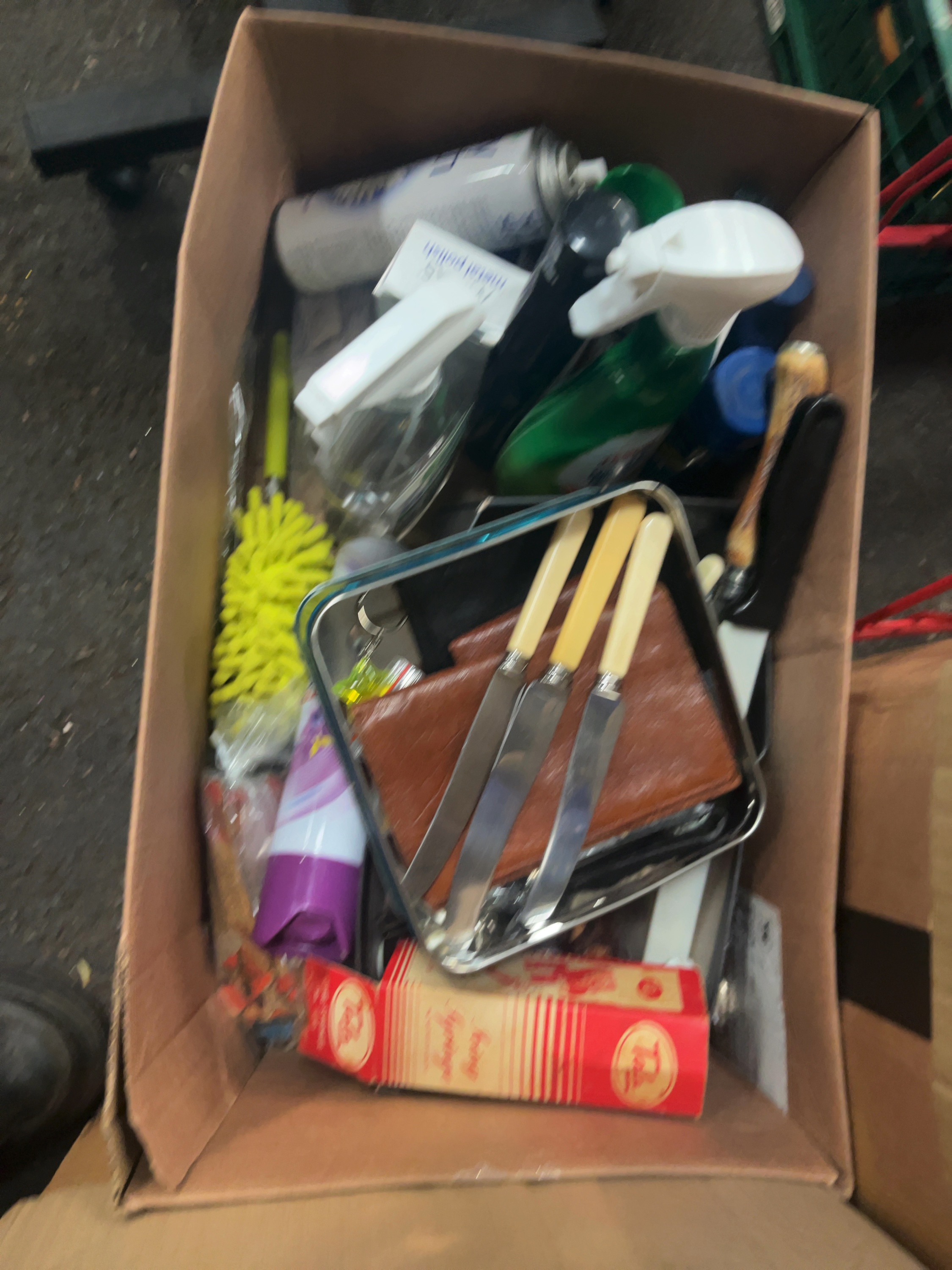 This lot comprises several boxes containing a variety of domestic items and kitchen equipment. The kitchenware includes ceramic teacups and saucers featuring floral patterns and gold-tone rims, alongside a small cream jug. Glassware consists of a large circular serving tray with a decorative metal rim, clear glass dishes, and storage containers. A set of three knives with cream-coloured synthetic handles is included, presented with a brown leather-style pouch. The small appliances include a two-slot stainless steel toaster and other miscellaneous white-cased electrical items. The lot also contains various household cleaning and maintenance supplies, such as spray bottles, an aerosol canister, metal polish, and a yellow synthetic duster. Miscellaneous items include a decorative box with a geometric star pattern and a small framed item. The goods are presented loose within multiple cardboard shipping boxes.