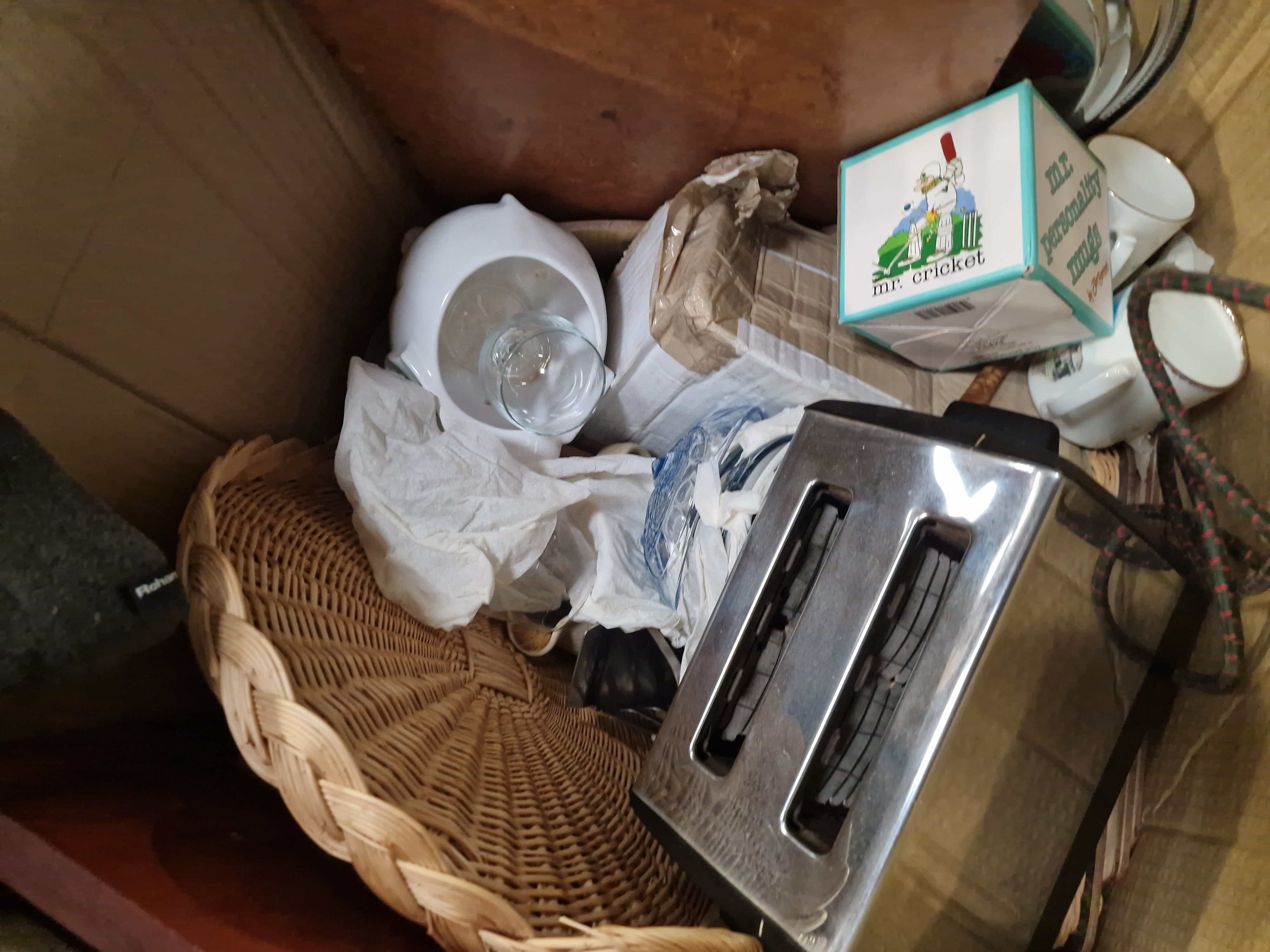 The items are in used, pre-owned condition and show signs of wear consistent with previous use. Electrical appliances are untested for functionality. Items are stored loose in boxes and have not been inspected for completeness. One red cardboard box appears damaged.