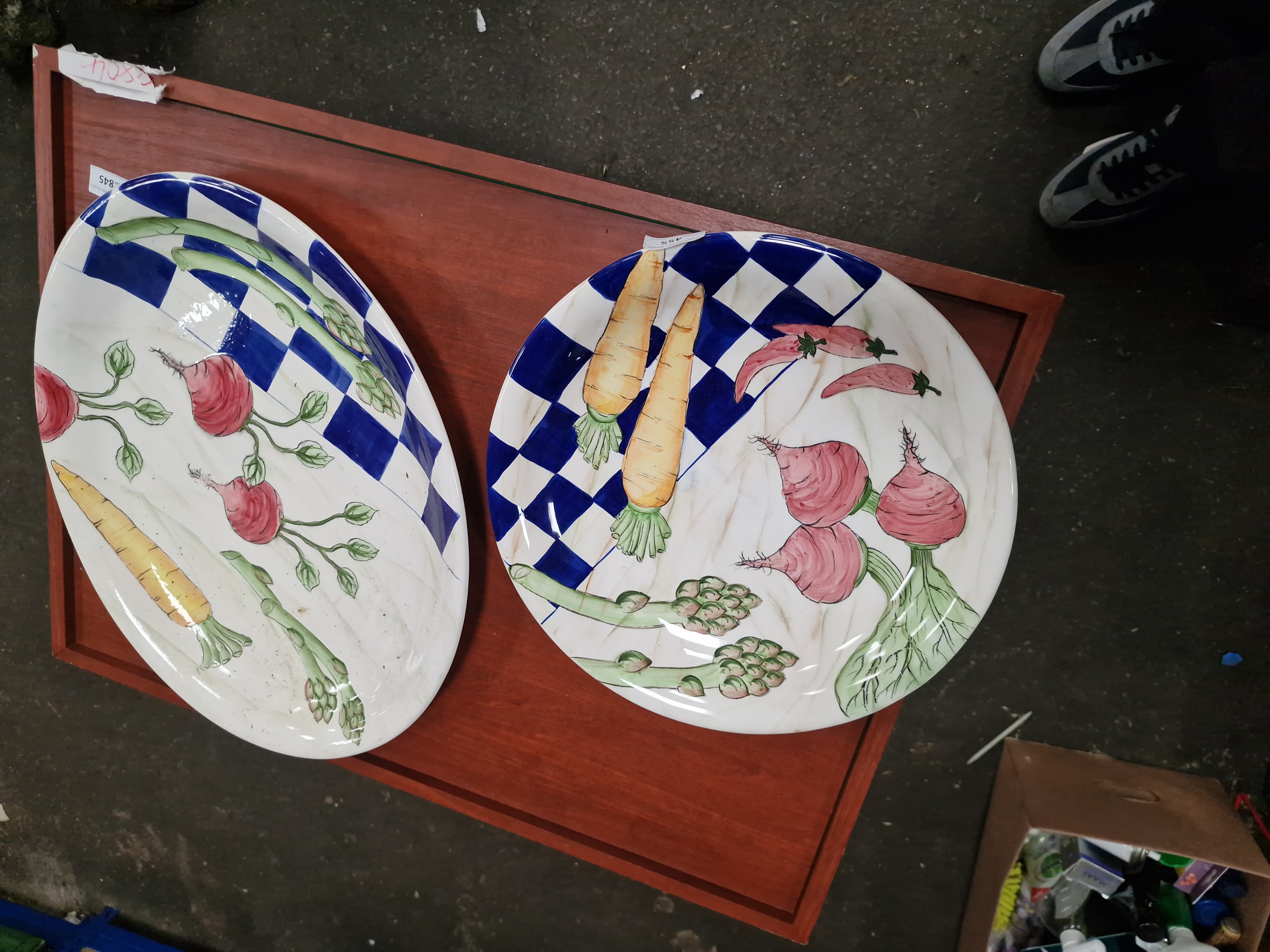 A pair of large decorative glazed earthenware serving platters, comprising one circular and one oval example. The platters feature a matching hand-painted design in a whimsical country style. The decoration is divided between a bold cobalt blue and white chequerboard pattern and a pale beige marbled ground. Overlaid on these patterns are hand-painted vegetable motifs, including carrots, asparagus spears, radishes, and red chillies. The style is characteristic of contemporary European decorative earthenware, frequently seen in Mediterranean imports from Italy or Portugal. No factory marks or signatures are visible on the front of the items. One platter bears a lot sticker for Liskeard Auction Rooms.