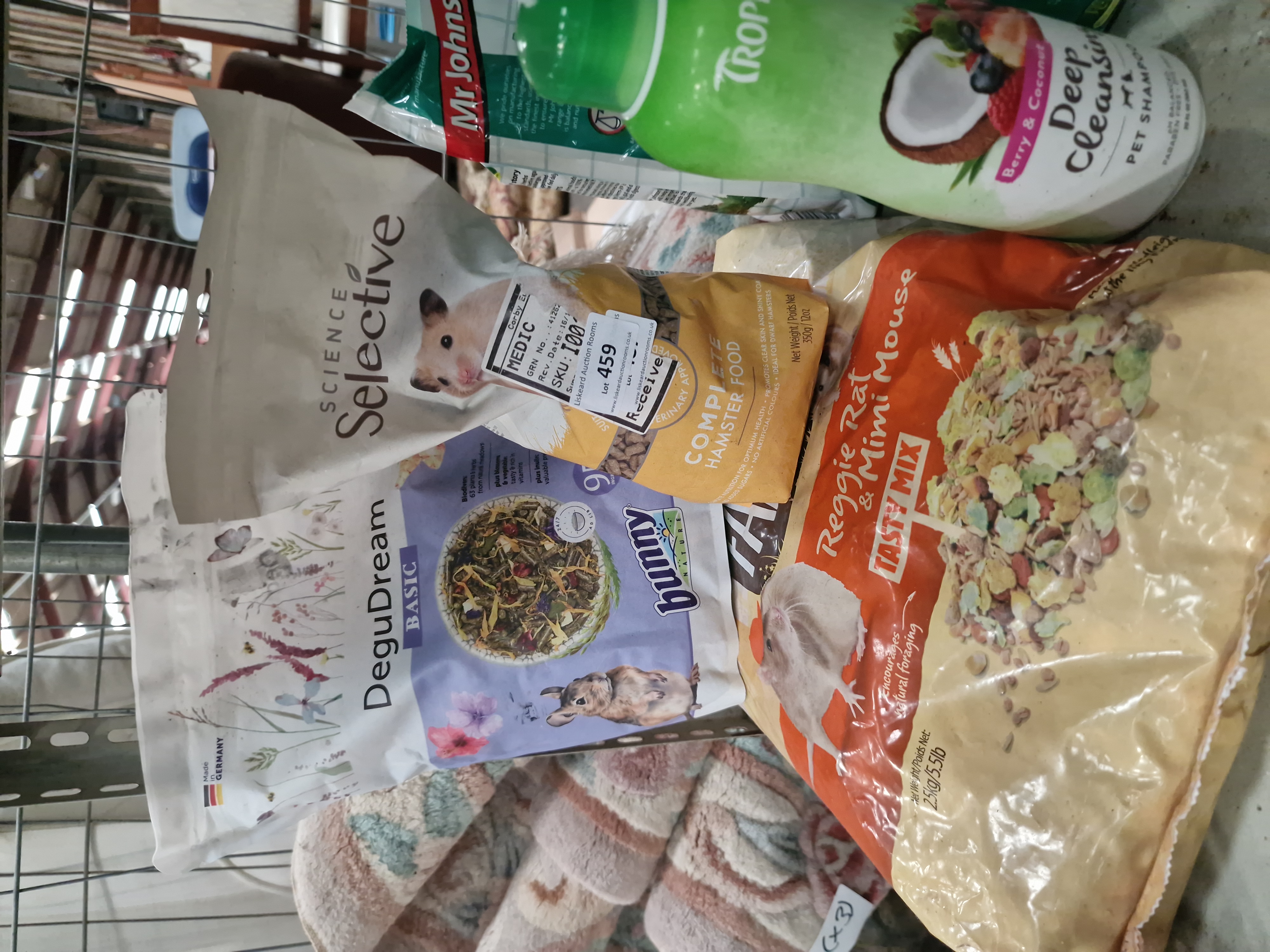 An assortment of small animal pet care products from various manufacturers including Mr Johnson’s, TropiClean, Science Selective, Bunny Nature, and Supreme Petfoods. The lot contains multiple bags of Mr Johnson’s Advance Hamster and Gerbil Food alongside a bag of Supreme Petfoods Reggie Rat & Mimi Mouse Tasty Mix. Specialist dietary items include a bag of Science Selective Complete Hamster Food and a bag of Bunny Nature DeguDream Basic. Grooming supplies consist of a bottle of TropiClean Berry & Coconut Deep Cleansing Pet Shampoo. All items are contained within their original retail packaging. One item bears a regional auction house identification label from Liskeard Auction Rooms.