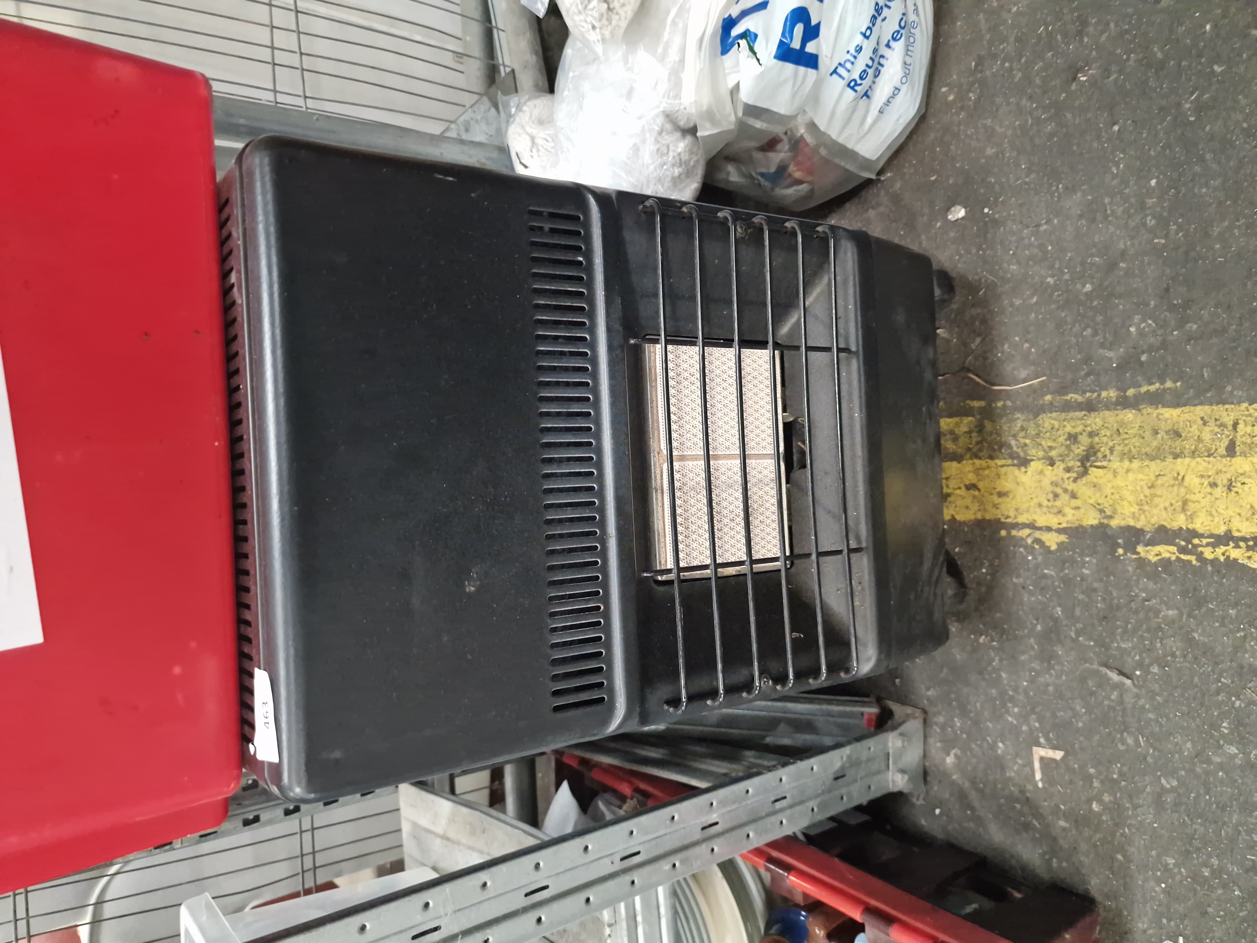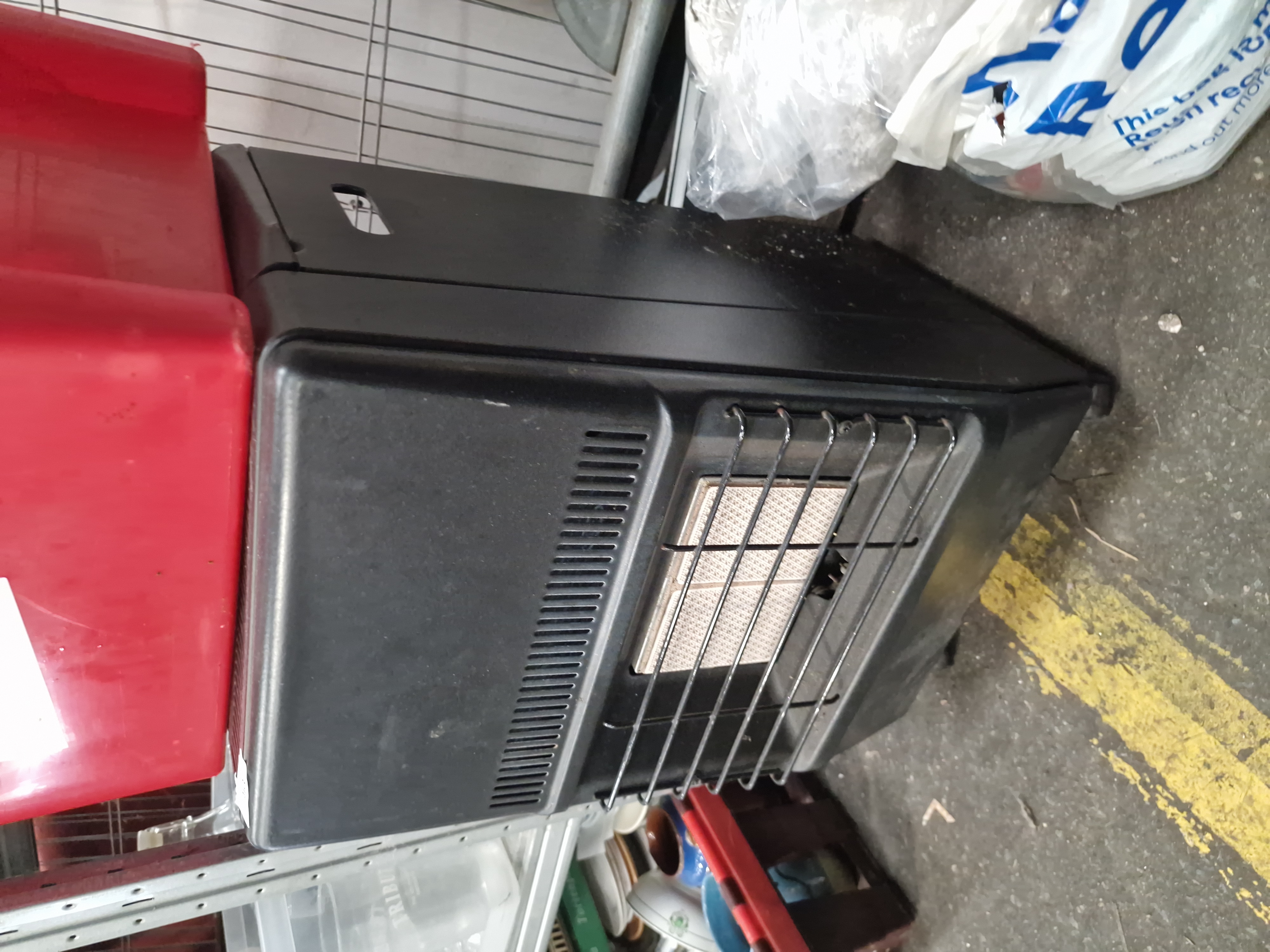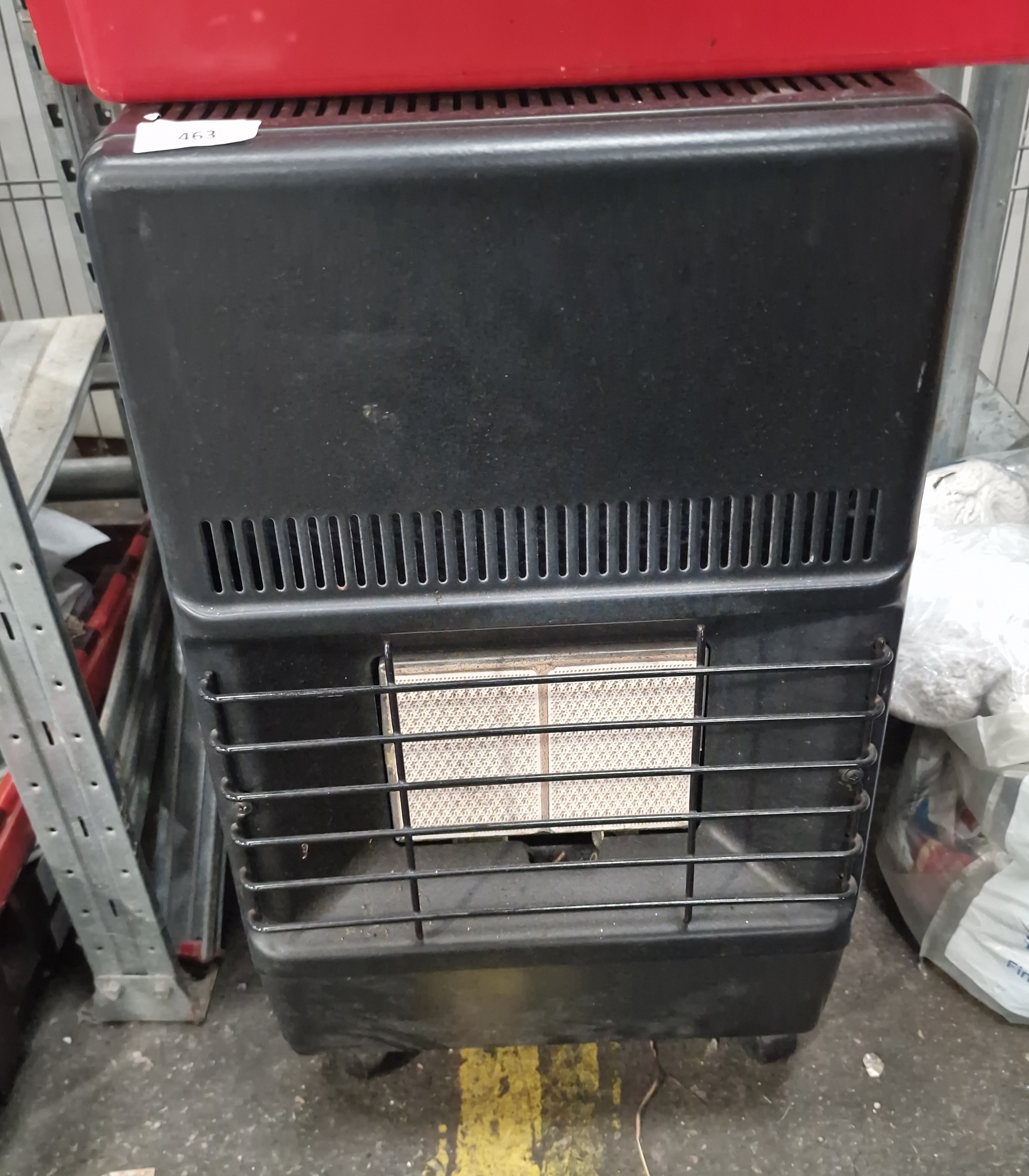 A portable gas cabinet heater of contemporary design featuring a black-coated metal casing. The unit is equipped with ceramic heating plaques positioned behind a protective horizontal metal wire safety grill. The exterior casing includes vertical ventilation slats located on the upper front and side sections. The heater is mounted on four small castors to facilitate portability. A small white adhesive label is affixed to the top front corner, marked with the digits 4, 6, and 3. No manufacturer marks or branding are visible on the exterior of the casing.