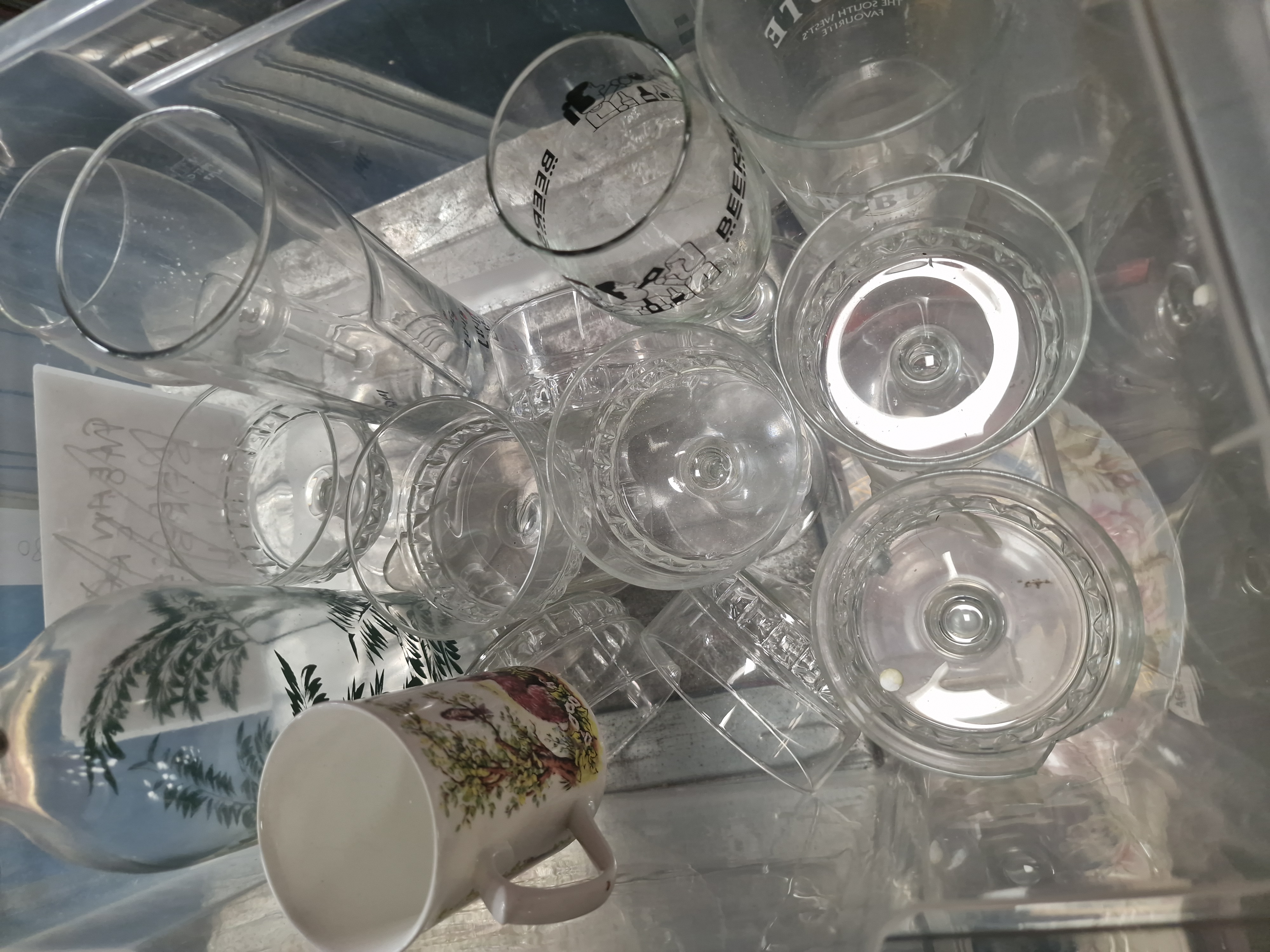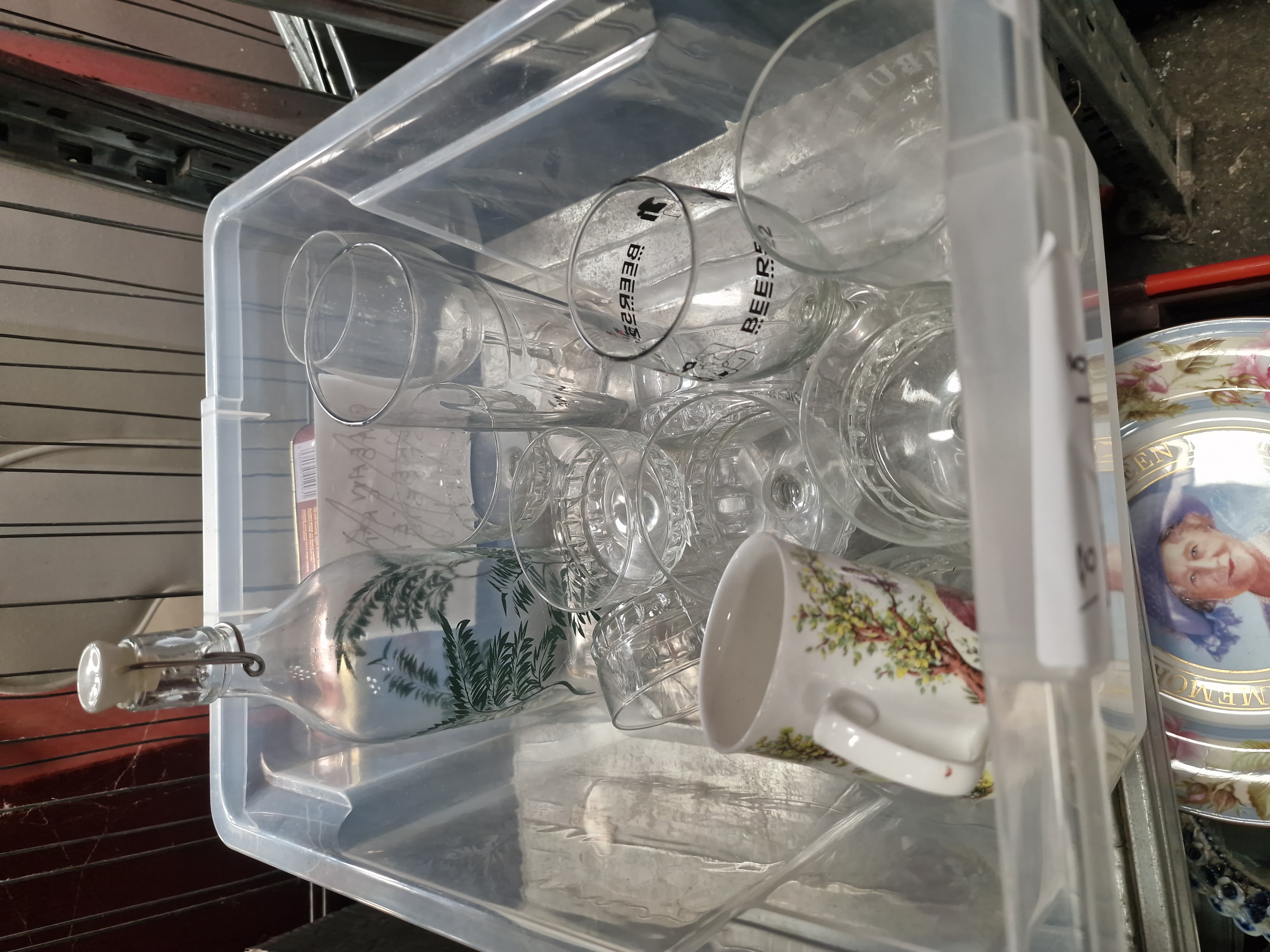 An assortment of various household and promotional glassware and ceramics. The collection includes several clear glass stemmed goblets with moulded geometric patterned bases, tall slender flutes, and printed tumblers. One tumbler is decorated with the word BEER in black capital letters, while another features promotional text including THE SOUTH WESTS FAVOURITE. The group also features a clear glass bottle decorated with green foliage motifs and a white ceramic swing-top closure, alongside a ceramic mug with a polychrome botanical design. Included is a commemorative porcelain plate featuring a portrait of Queen Elizabeth II with a floral border and the words IN MEMORIAM. The items are presented in a clear plastic storage bin with a lid.