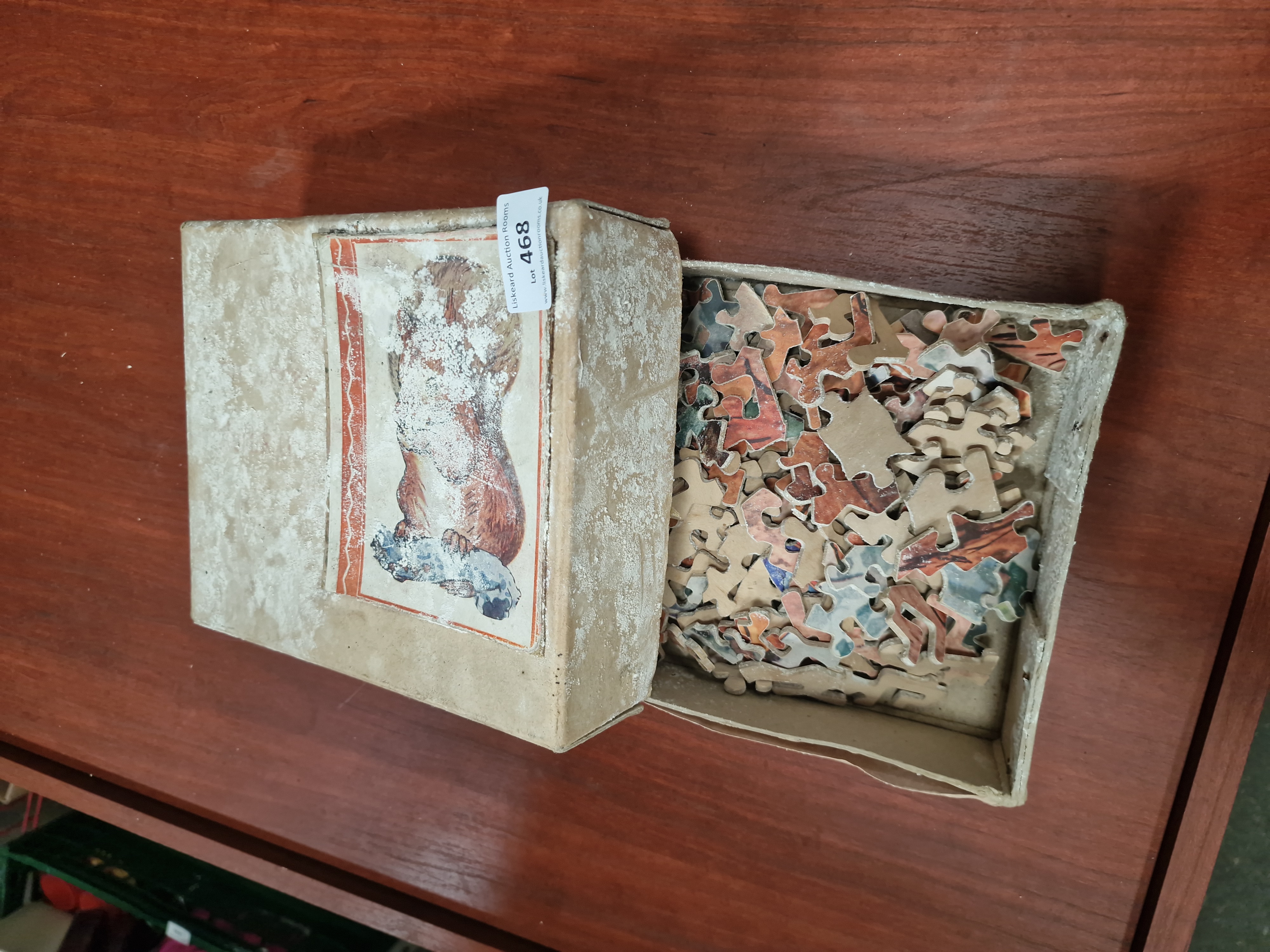 A vintage interlocking wooden jigsaw puzzle, attributed to Victory (G. J. Hayter and Co.). The puzzle is constructed from plywood pieces and is housed in its original heavy cardboard box. The lid features a pictorial paper label depicting a red squirrel holding a nut. The cutting style is consistent with British-made dissected puzzles of the mid-20th century. A modern adhesive auction label is present on the lid.