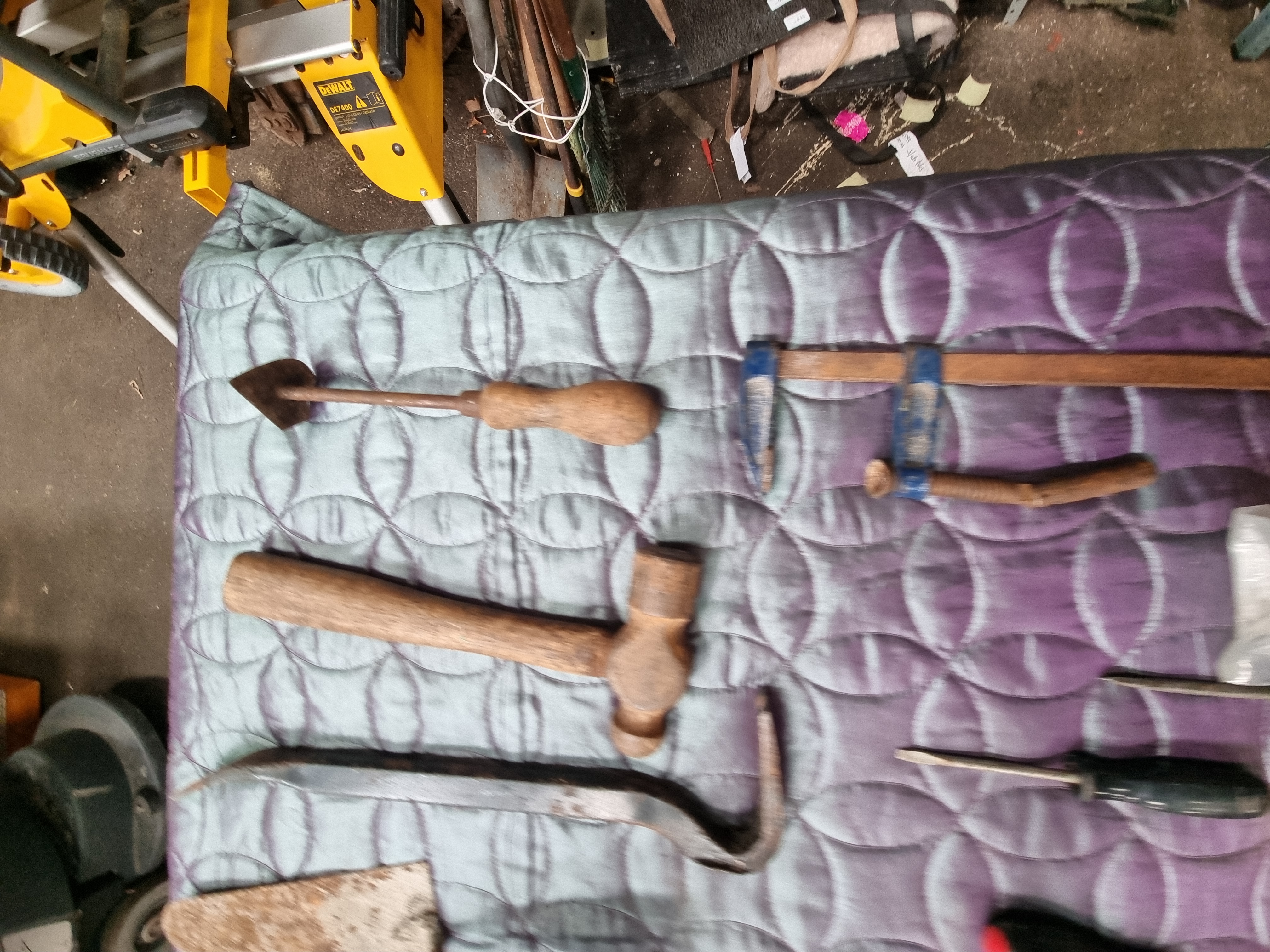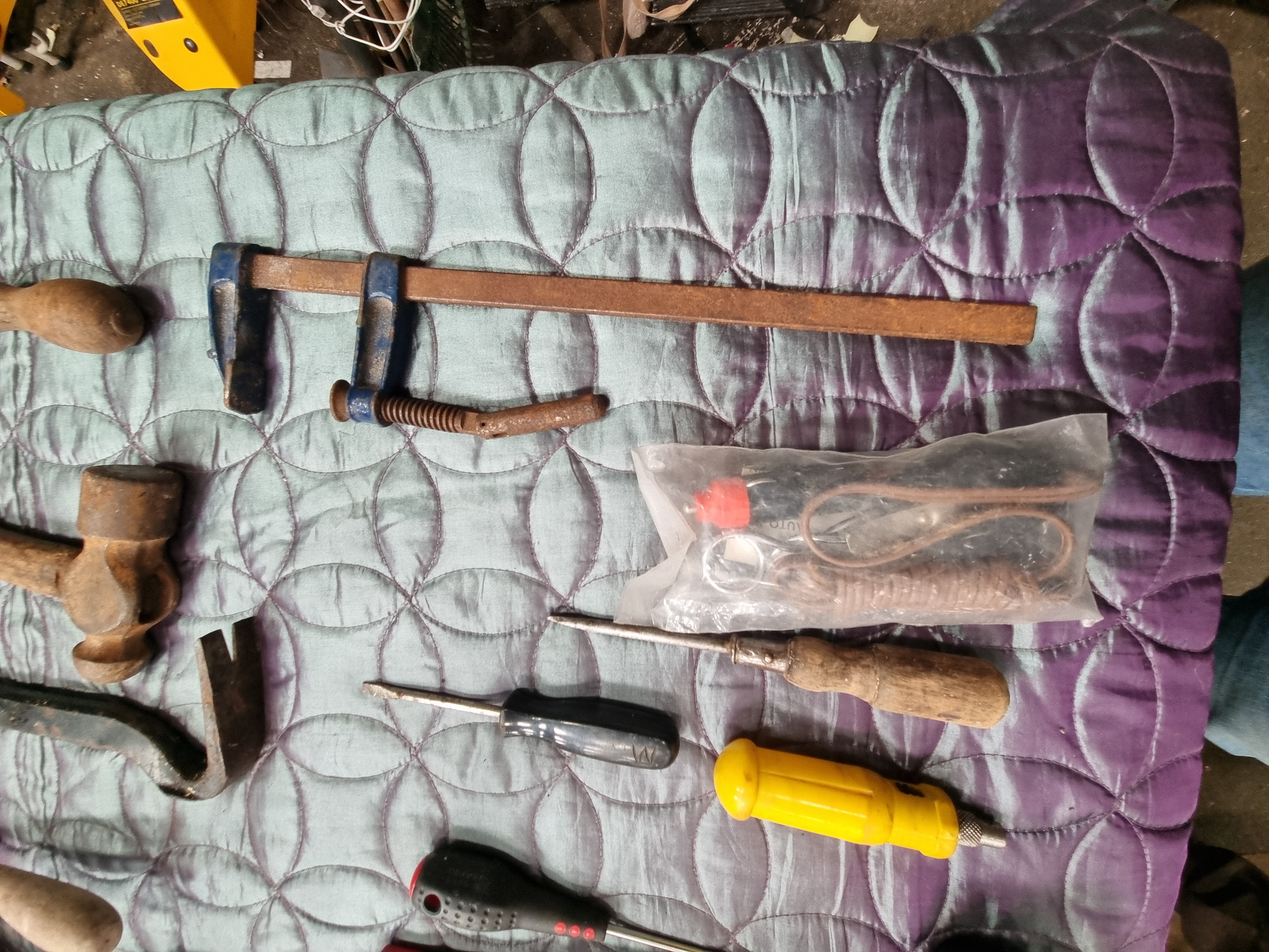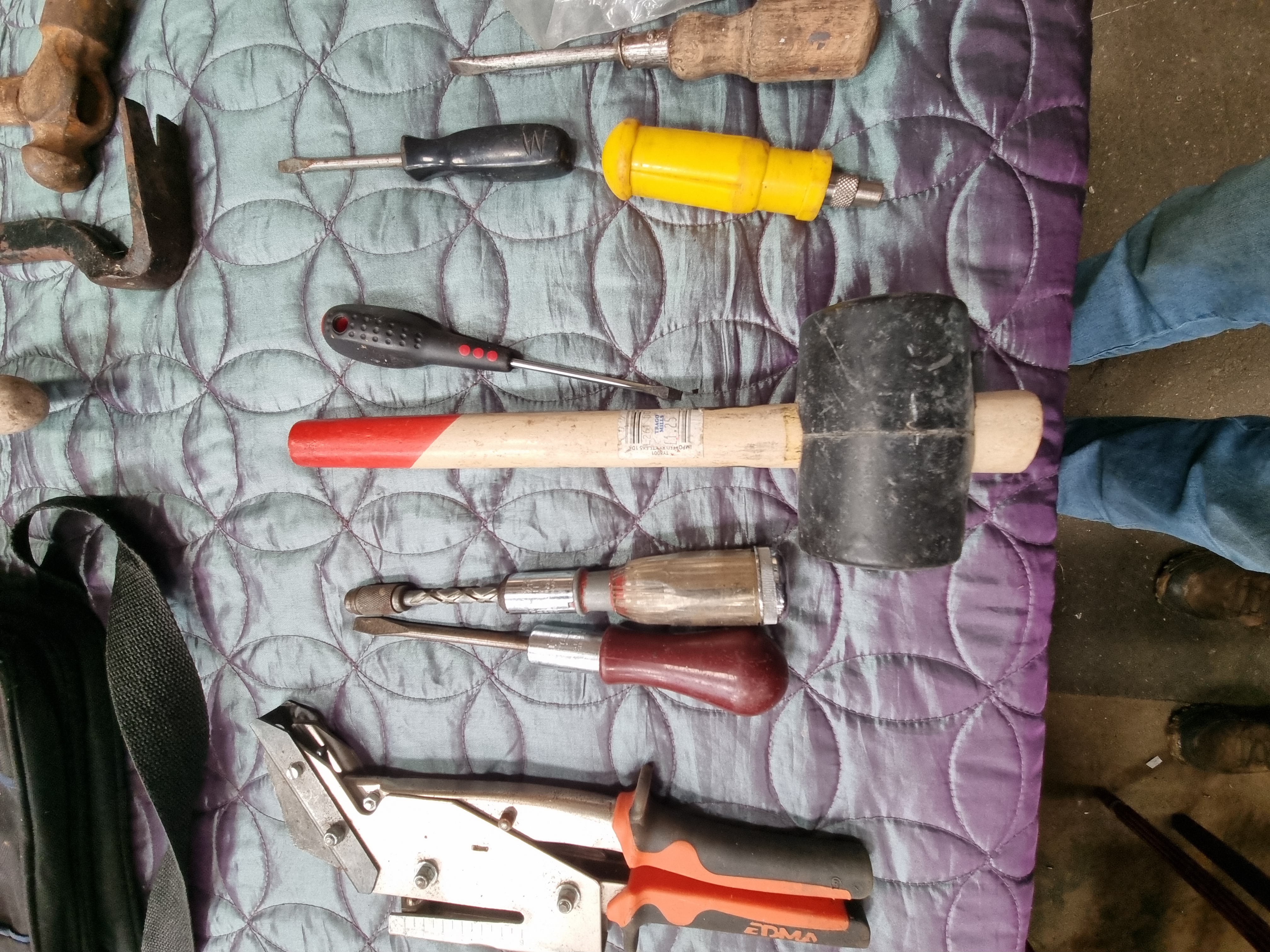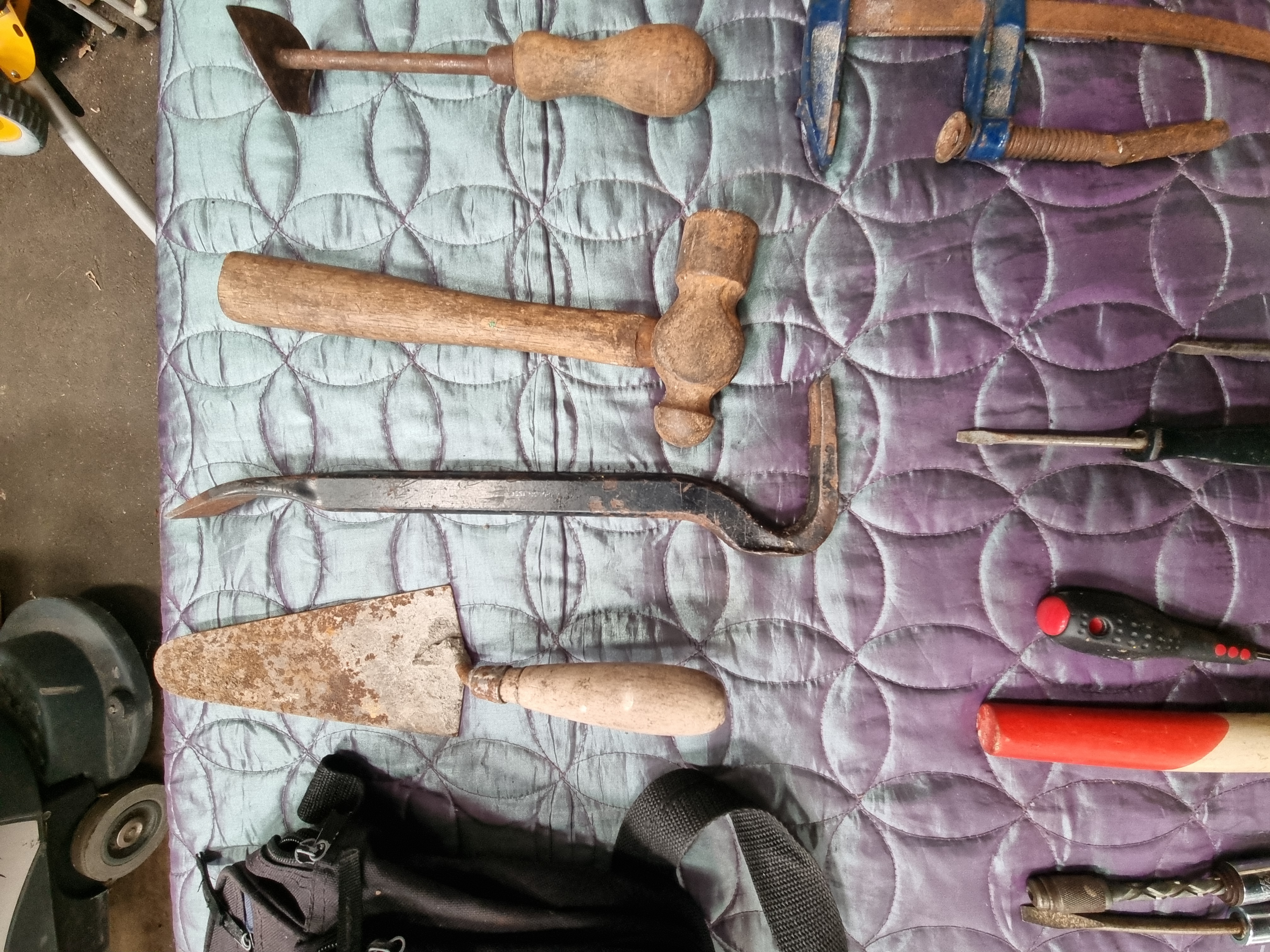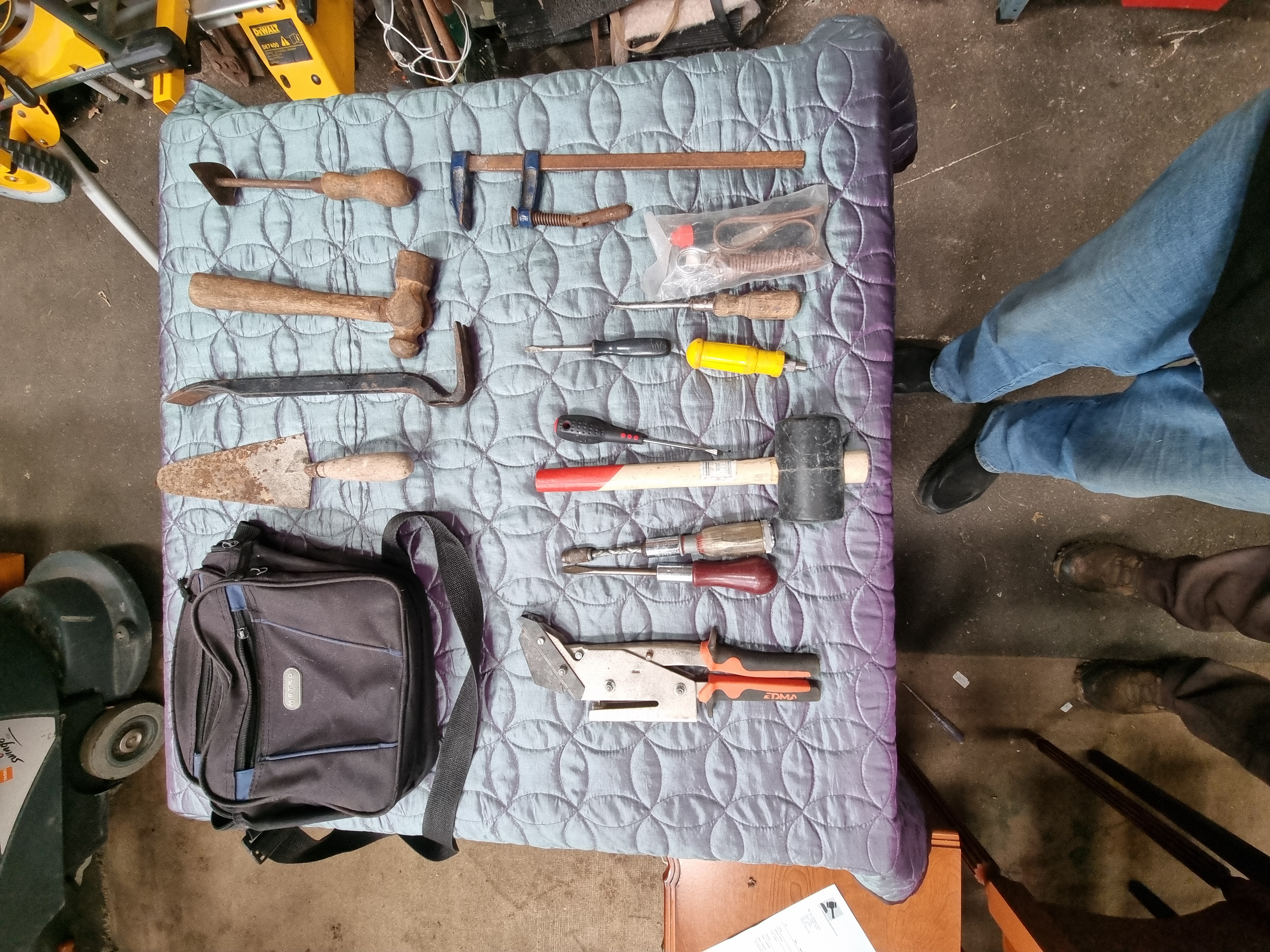 The items are in mixed condition. Modern tools including the EDMA cutter and rubber mallet show signs of regular use but remain functional. Several metal items, specifically the ball-peen hammer, pointing trowel, crowbar, and bar clamp, exhibit significant surface rust and pitting. The spiral screwdriver shows oxidation on the metal shaft. The bar clamp appears to be incomplete, missing a handle or lever on the screw mechanism. The textile bag shows signs of wear consistent with use in a workshop environment. Functionality of individual items has not been tested.