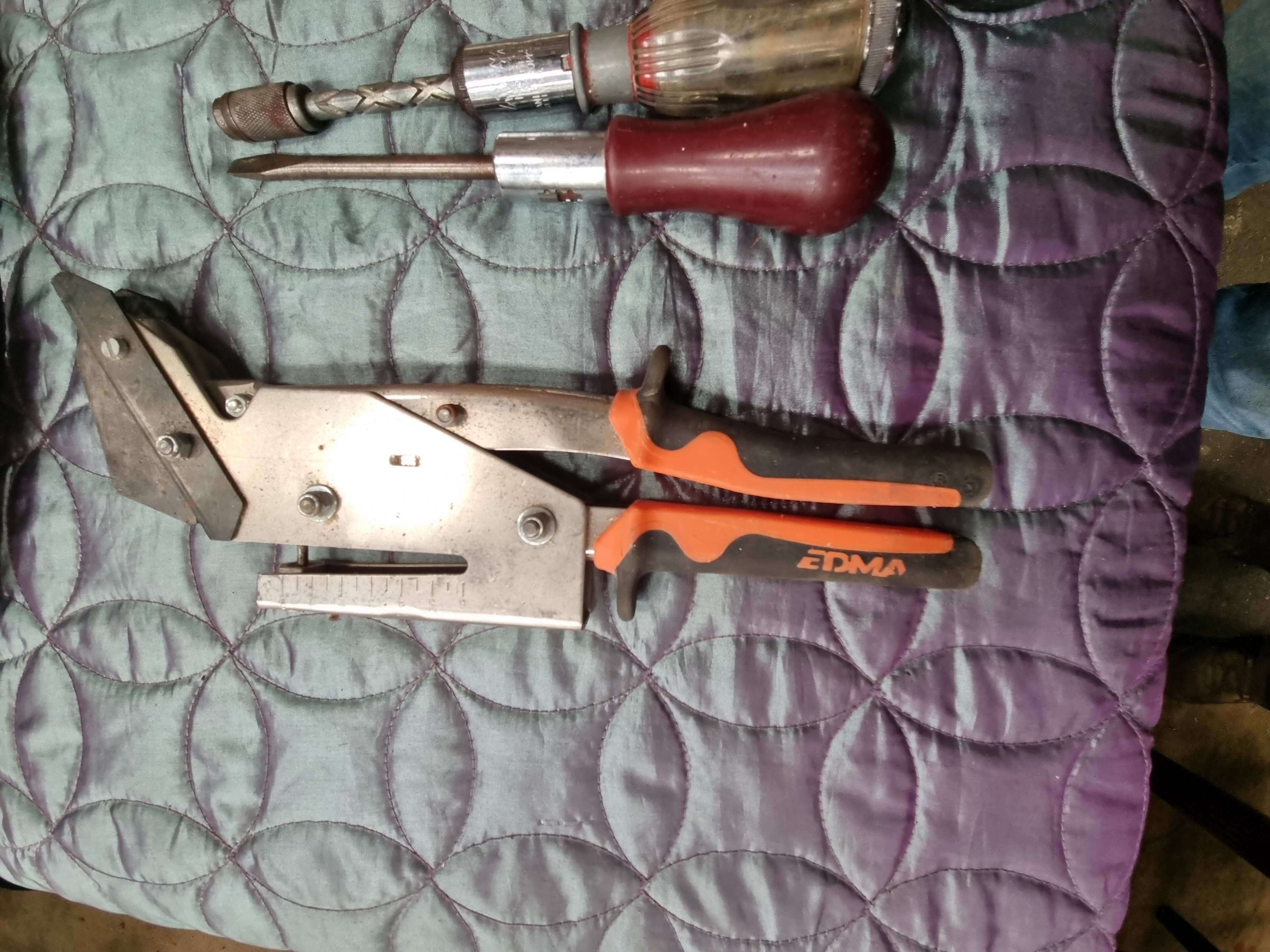 This lot comprises a collection of hand tools and accessories suitable for various trades including roofing, masonry, and general maintenance. The primary item is a manual roofing or slate cutter featuring orange and black ergonomic handles, bearing the maker’s mark EDMA. The collection includes a variety of screwdrivers such as a Yankee-style spiral-drive model, several flat-head and Phillips-head drivers with modern plastic handles in black, yellow, and red, and a precision screwdriver. Striking tools consist of a large rubber mallet with a wooden handle and a vintage ball-peen hammer with a wooden handle. Prying and masonry equipment includes a steel crowbar and a triangular pointing trowel. Also present is a shave hook with a triangular blade and wooden handle, and a single bar clamp with blue-painted jaws. The lot is accompanied by a black textile shoulder bag with blue accents marked METRO and a small plastic bag containing a leather strap and a 12V automotive-style plug.