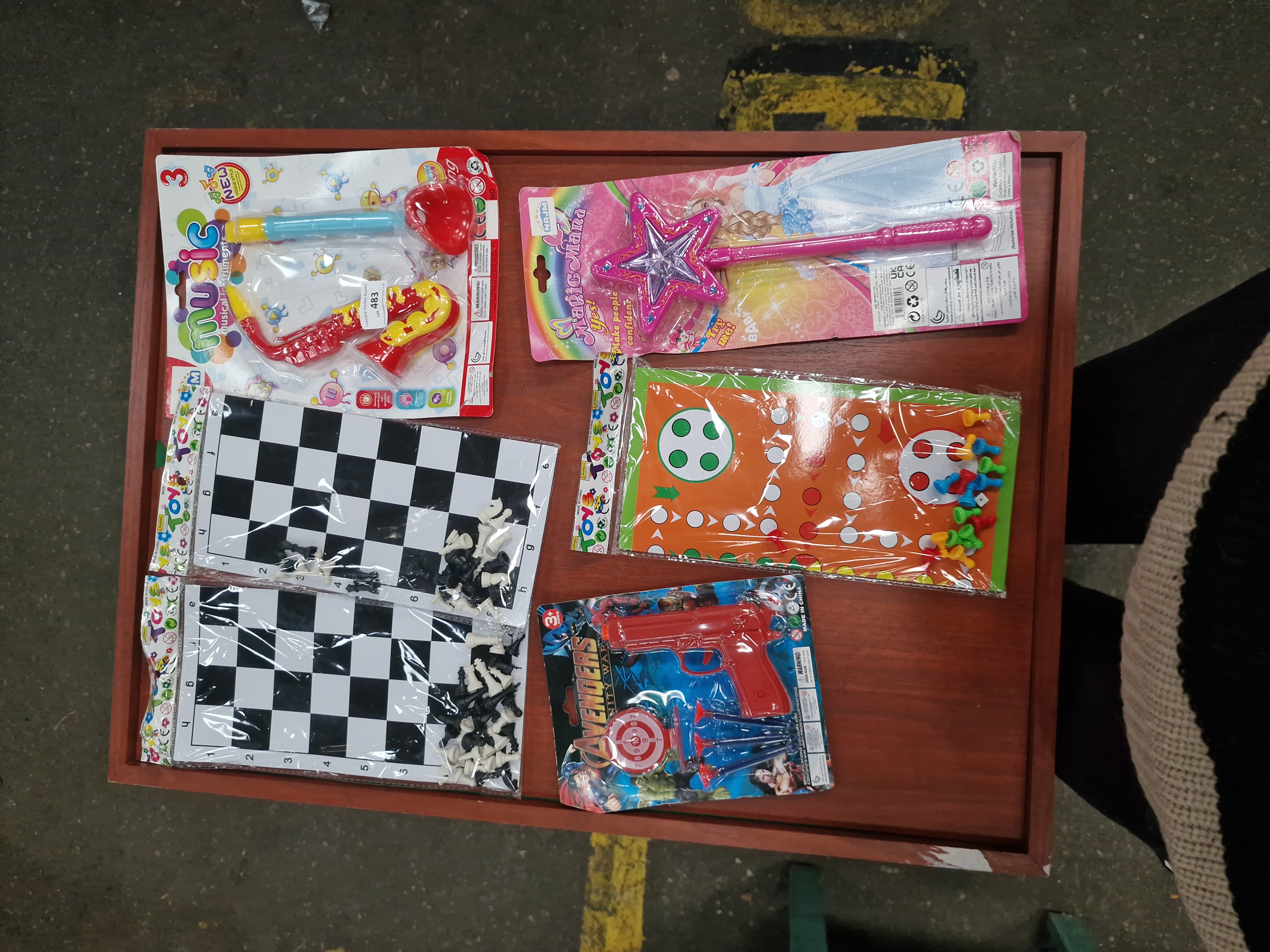 A collection of five contemporary plastic novelty toys of various types. The group includes a musical instrument set comprising a red and yellow saxophone and a heart-shaped rattle mounted on a blister card. Also included is a pink NAJM branded Magic Wand featuring a star-shaped topper and a Try Me function. The collection further contains two travel chess sets, each with a folding board and black and white plastic pieces housed in polythene bags with header cards. There is a peg-based racing board game with coloured pegs in a similar header card bag. The final item is a projectile toy set featuring a red pistol, three suction cup darts, and a circular target, with packaging branded Avengers Infinity War. All items are constructed from moulded plastic and card. One item features a white auction lot sticker numbered 483.