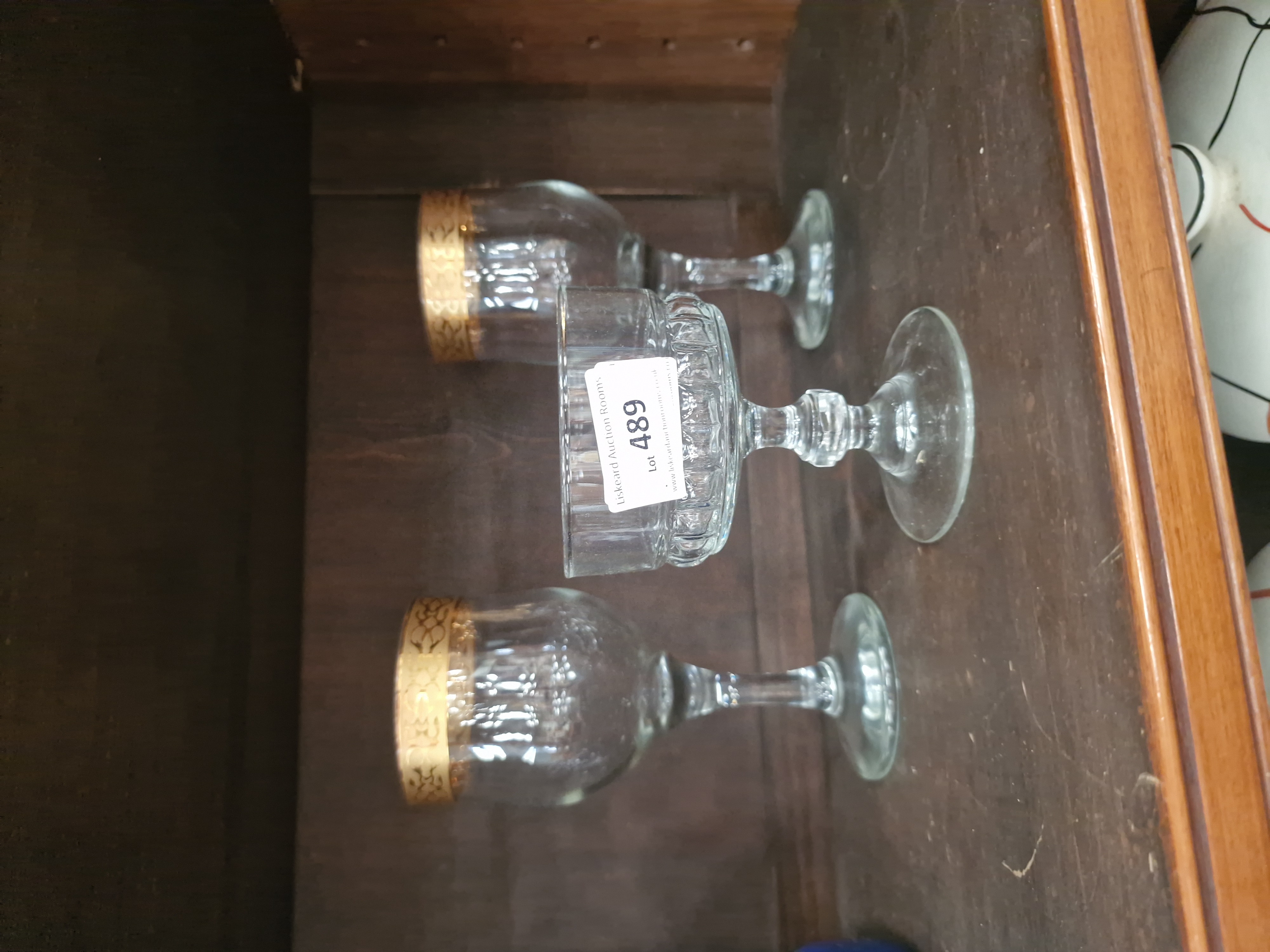 A collection of three items of glassware. The pair of wine glasses are attributed to Cristalleria Fratelli Fumo, featuring clear tulip-shaped bowls with a wide, applied gilt band at the rim. The gilt decoration consists of a repeating pattern of interlocking scrolls and circular motifs. Each glass is supported by a plain, tapering stem on a simple circular foot. The third item is a moulded glass comport or dessert glass with a rectangular-profile bowl. The lower section of the bowl is decorated with a pattern of vertical ribs and horizontal banding. The stem features a central faceted knop and rests on a plain circular foot. A modern paper lot sticker for Liskeard Auction Rooms, Lot 489, is present on the comport. No maker marks or etched signatures are visible on any of the pieces.