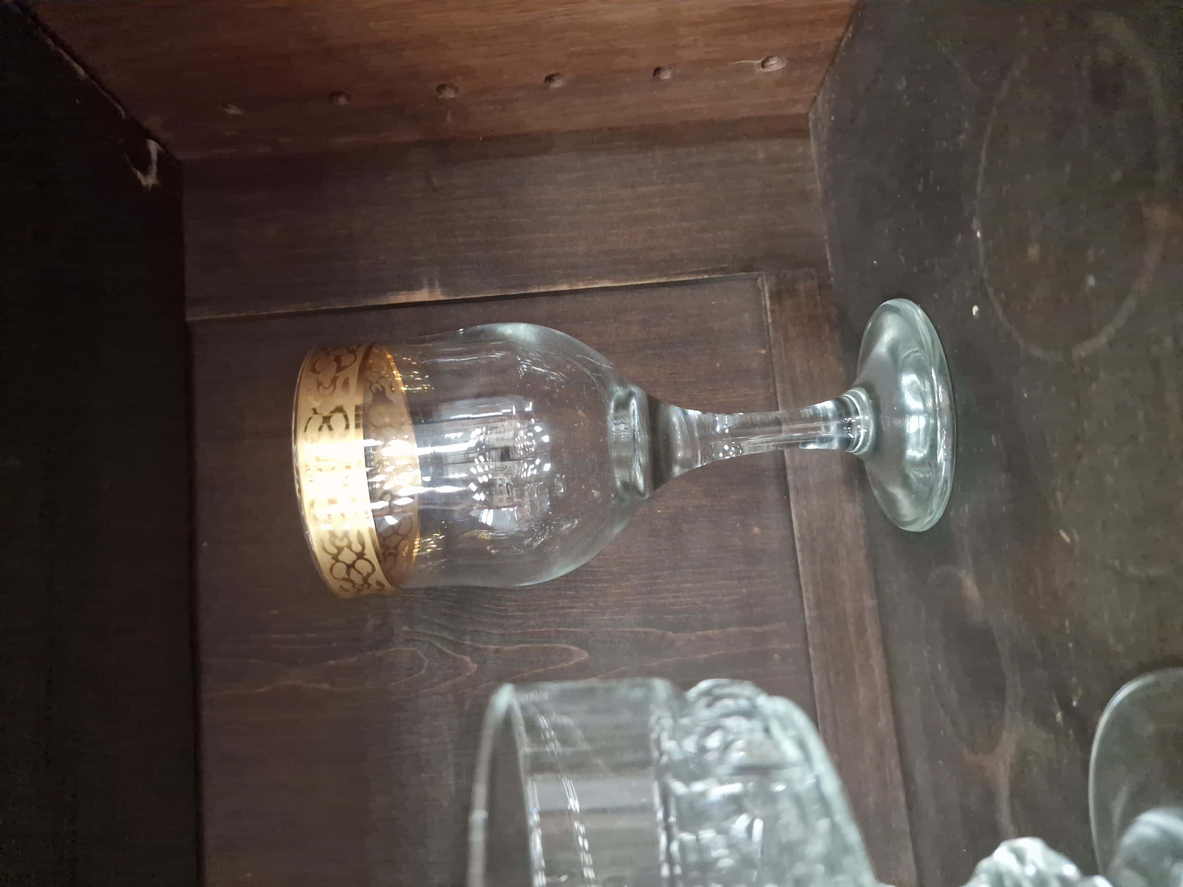 The items are in good overall condition. There are no visible chips, cracks, or significant clouding to the glass. The gilt rims on the pair of wine glasses show minor surface wear and light rubbing consistent with age and use.