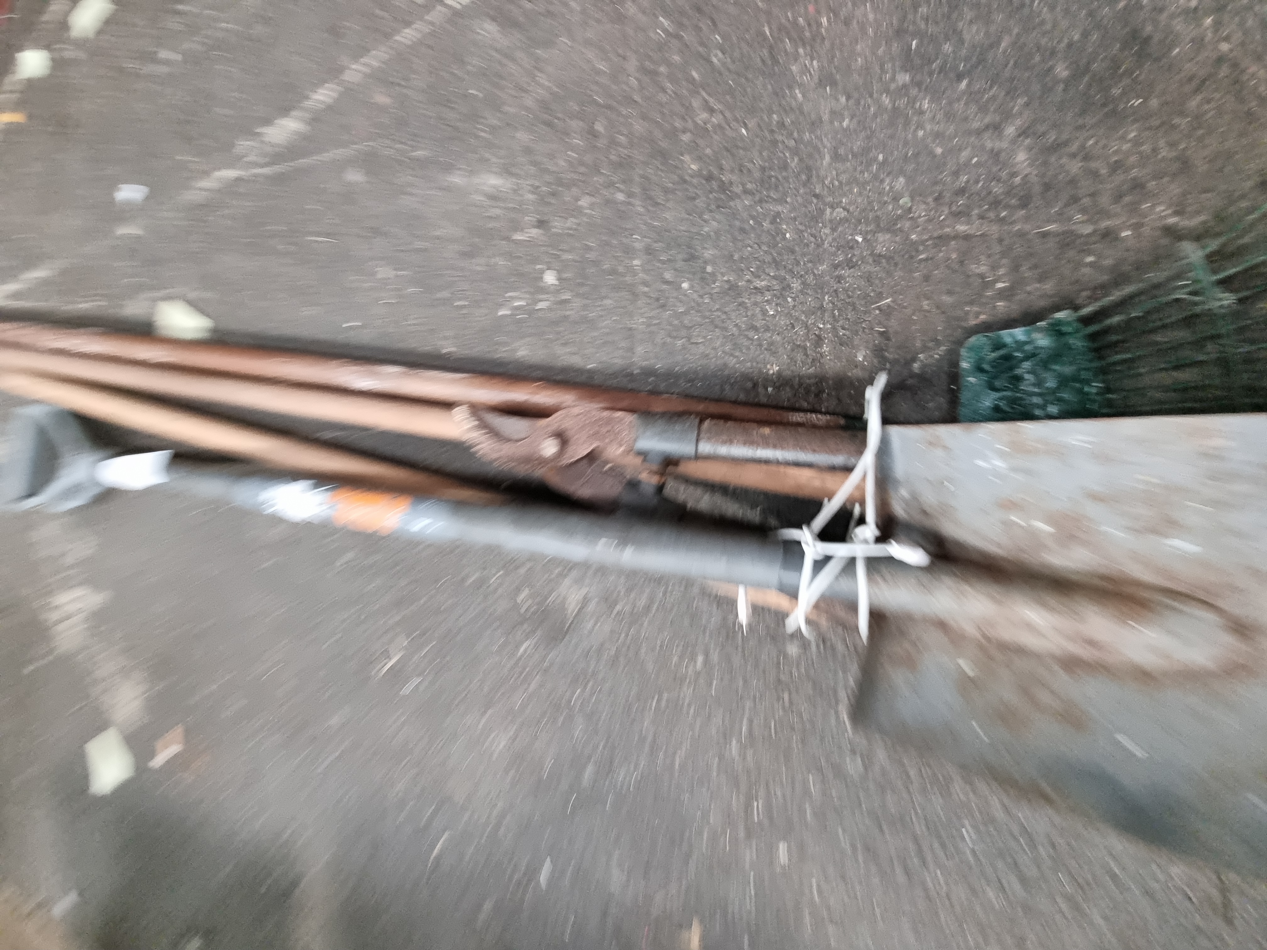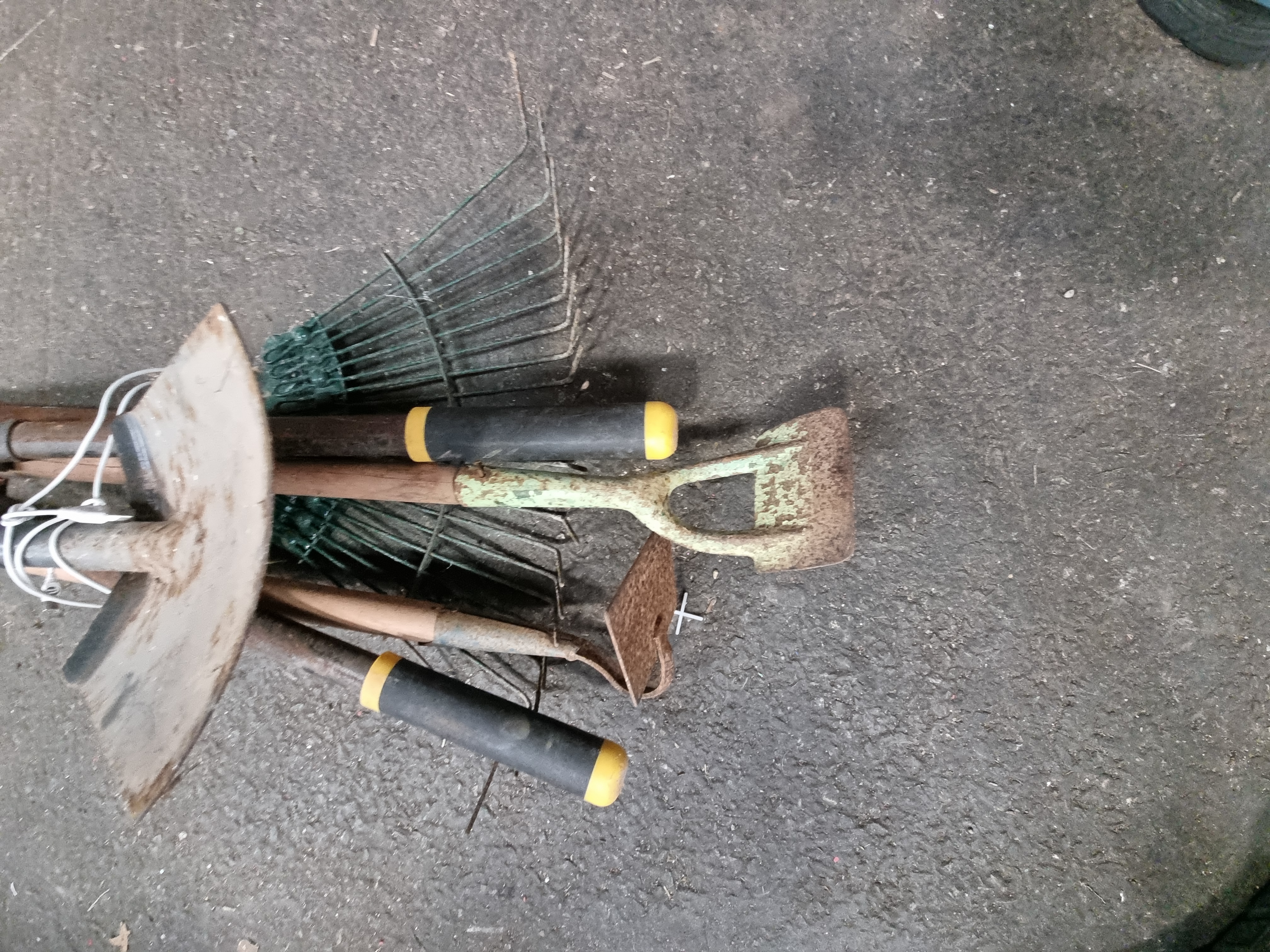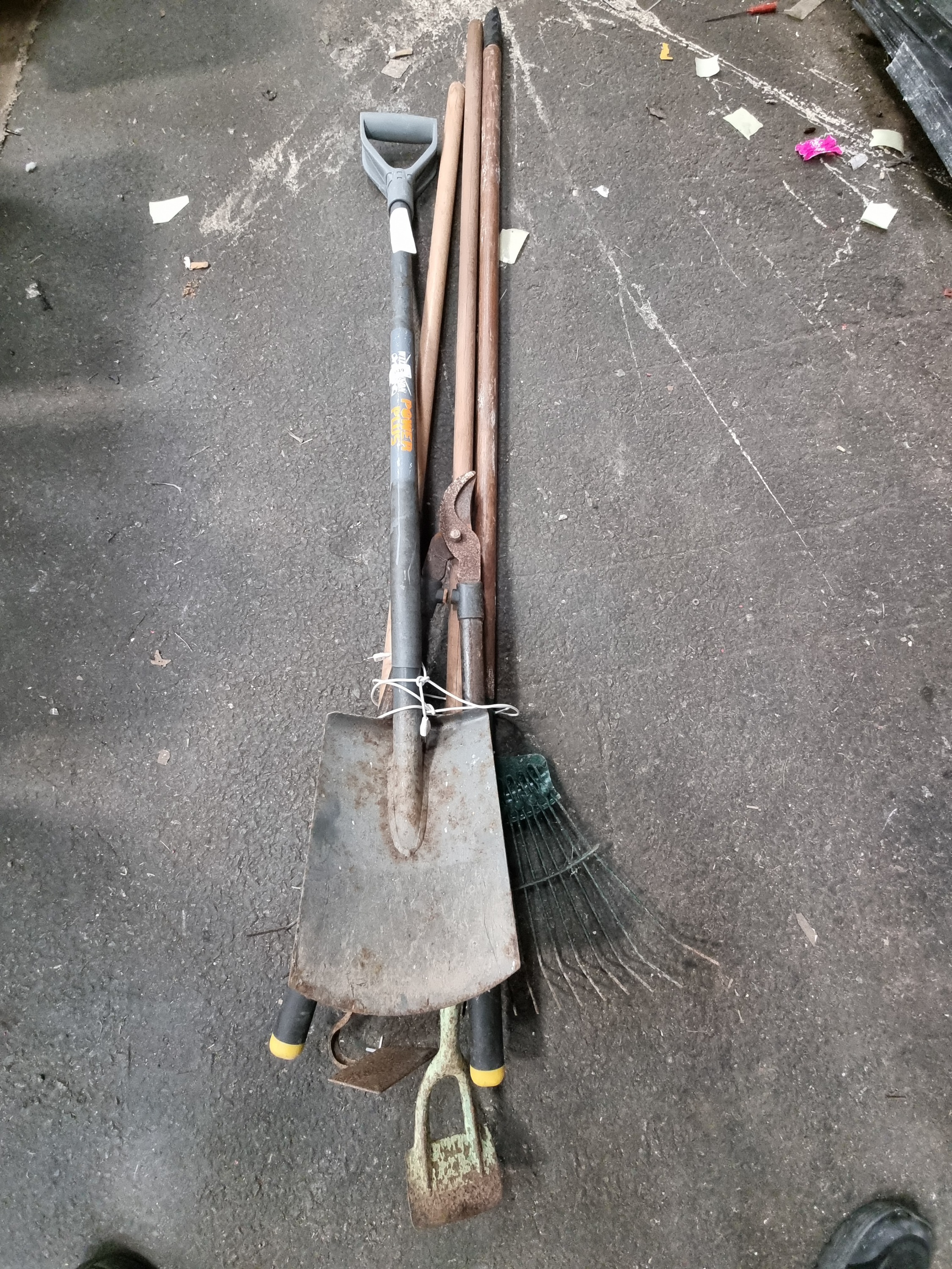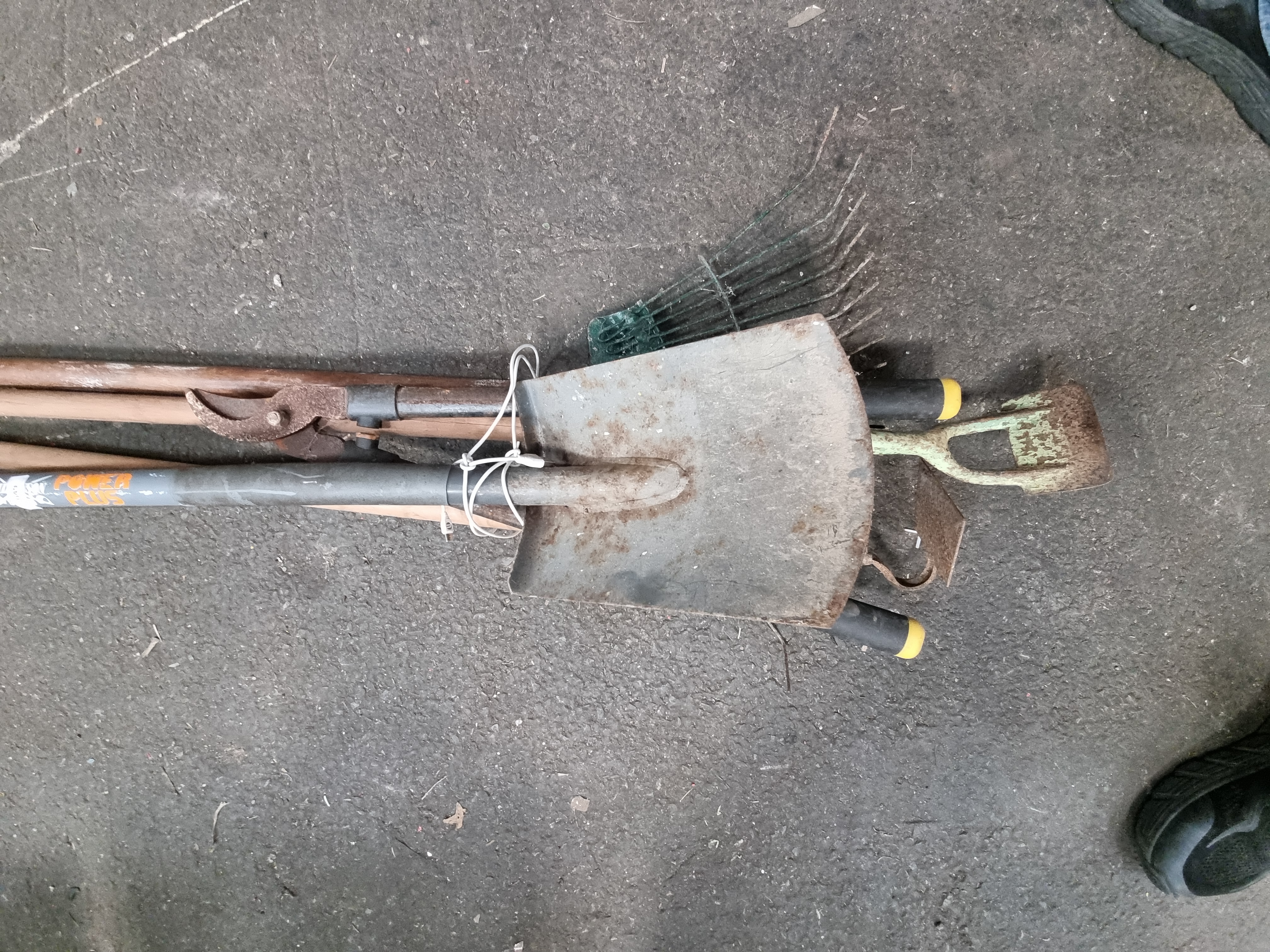 The items are in used, as found condition. There is significant surface oxidation and rust visible on the metal heads, particularly on the spade, loppers, and rake. The wooden handles show signs of weathering, staining, and typical wear from outdoor use. The tools appear structurally complete, though they have not been tested for mechanical performance.