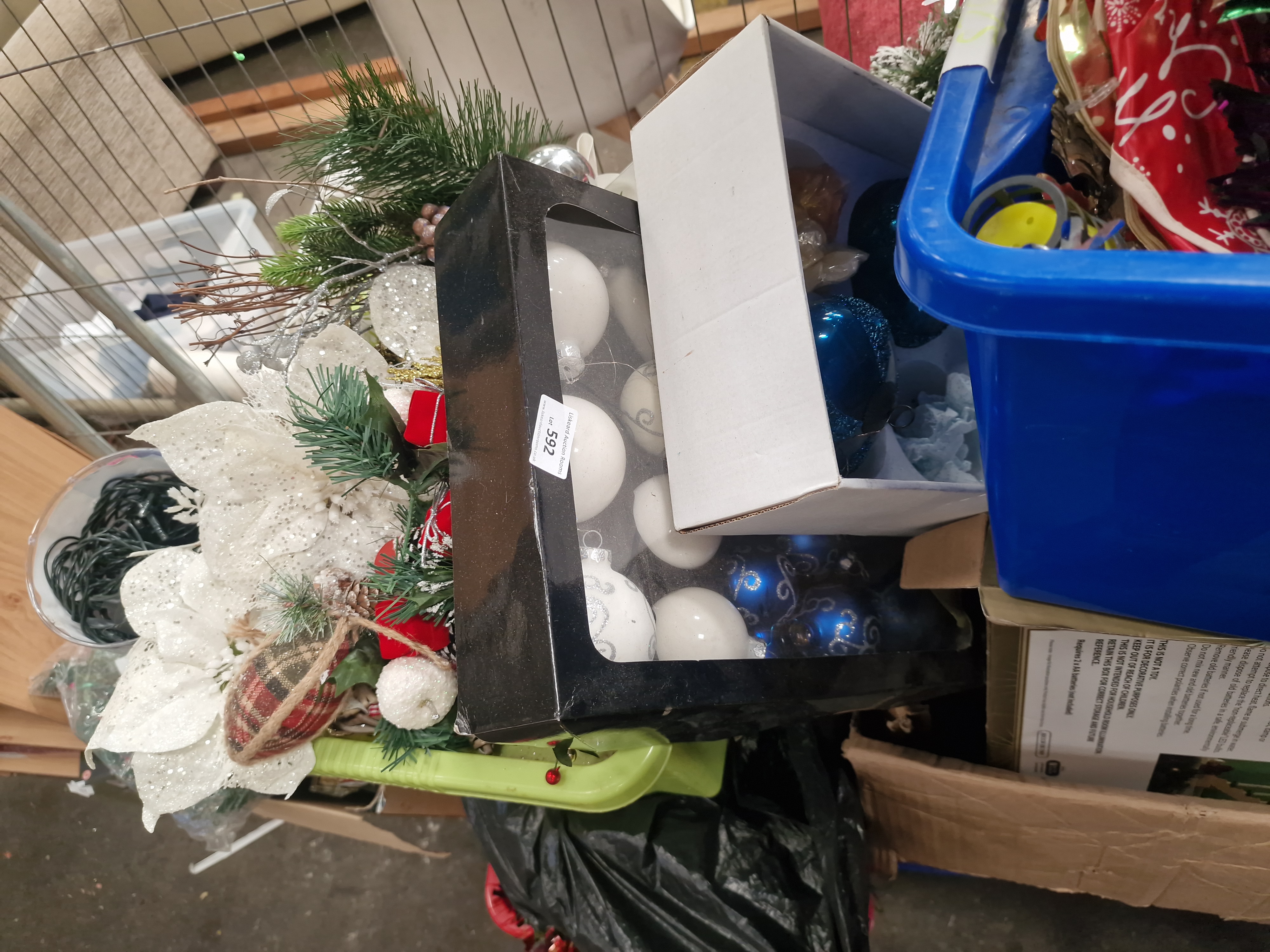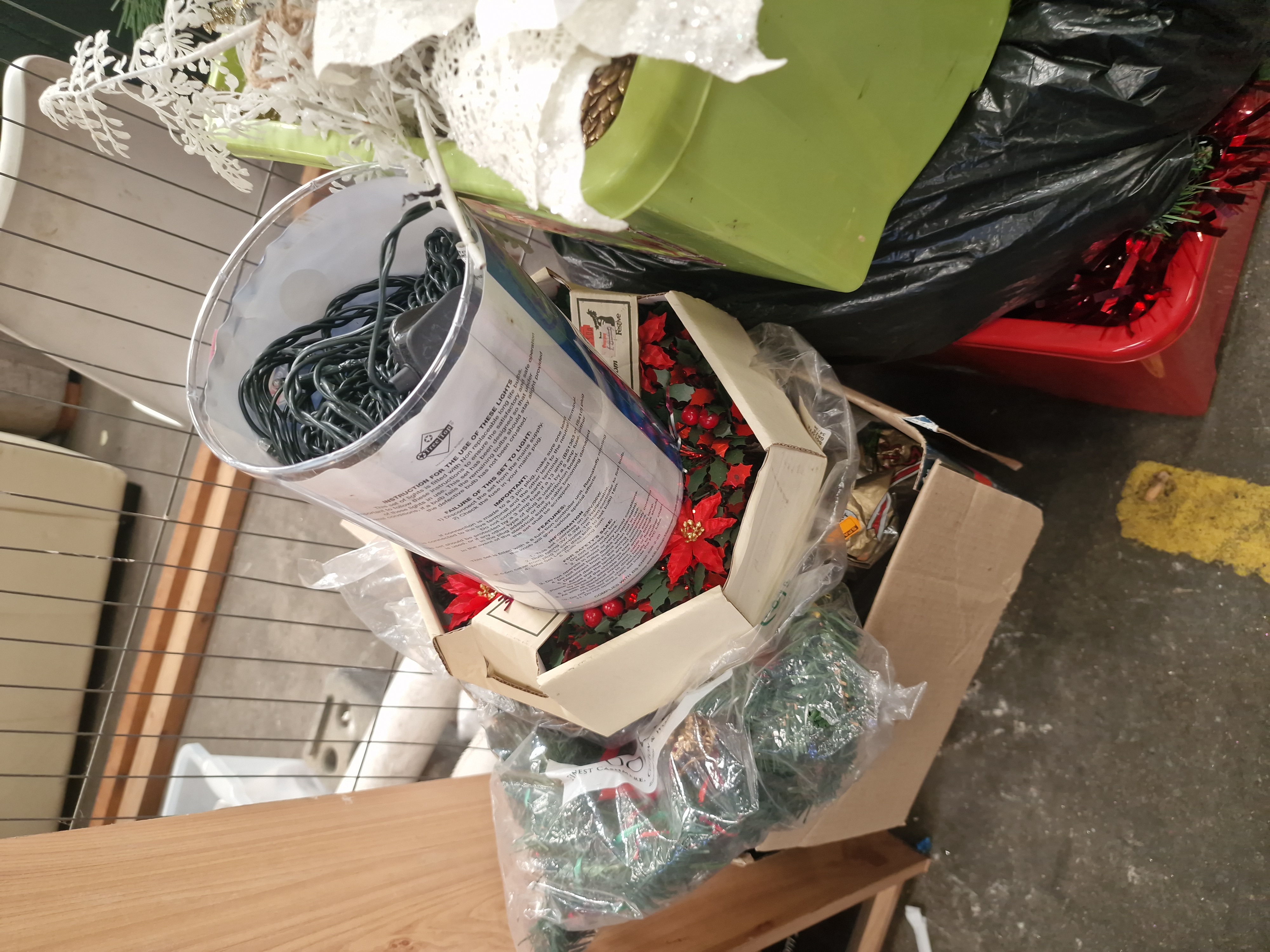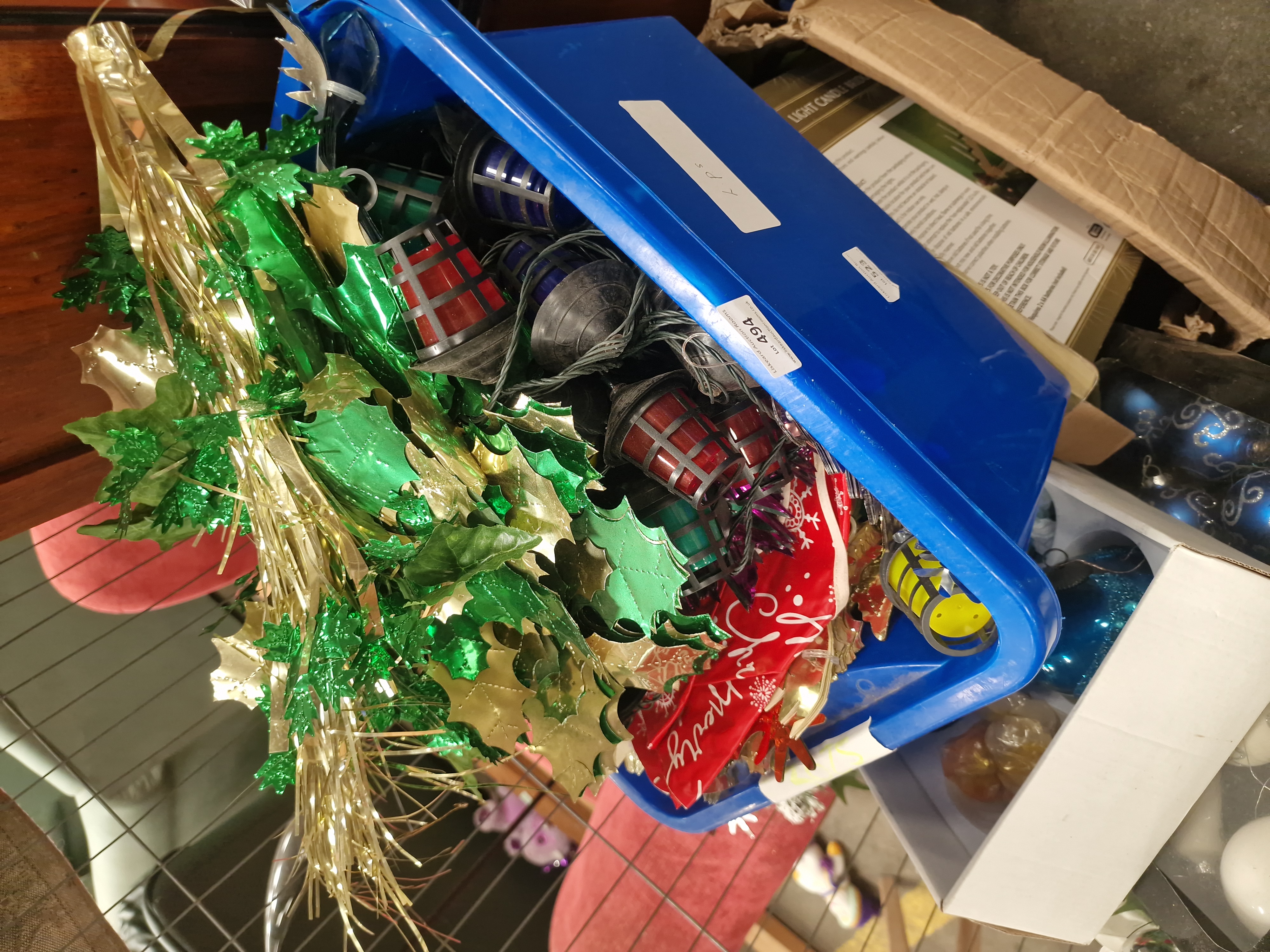 A mixed collection of Christmas decorations and lighting housed in various storage containers. The lot includes multiple sets of string lights, with one set contained within a clear plastic cylinder and others stored loosely. A boxed 7 light candle bridge is included. Ornamentation consists of several boxes of baubles in white, blue, and silver tones, some of which remain in original retail packaging. Decorative foliage includes artificial pine branches, white fabric poinsettias, and holly garlands. Additional decorative items include green and gold tinsel, red fabric Merry Christmas bunting, and a set of small decorative lanterns in red, blue, and green stored within a blue plastic bin. Branding for Festive and Treetop is visible on lighting instructions and packaging. The items are presented in a variety of plastic bins, cardboard boxes, and clear bags. Several items bear lot stickers for Liskeard Auction Rooms with numbers 494 and 592.