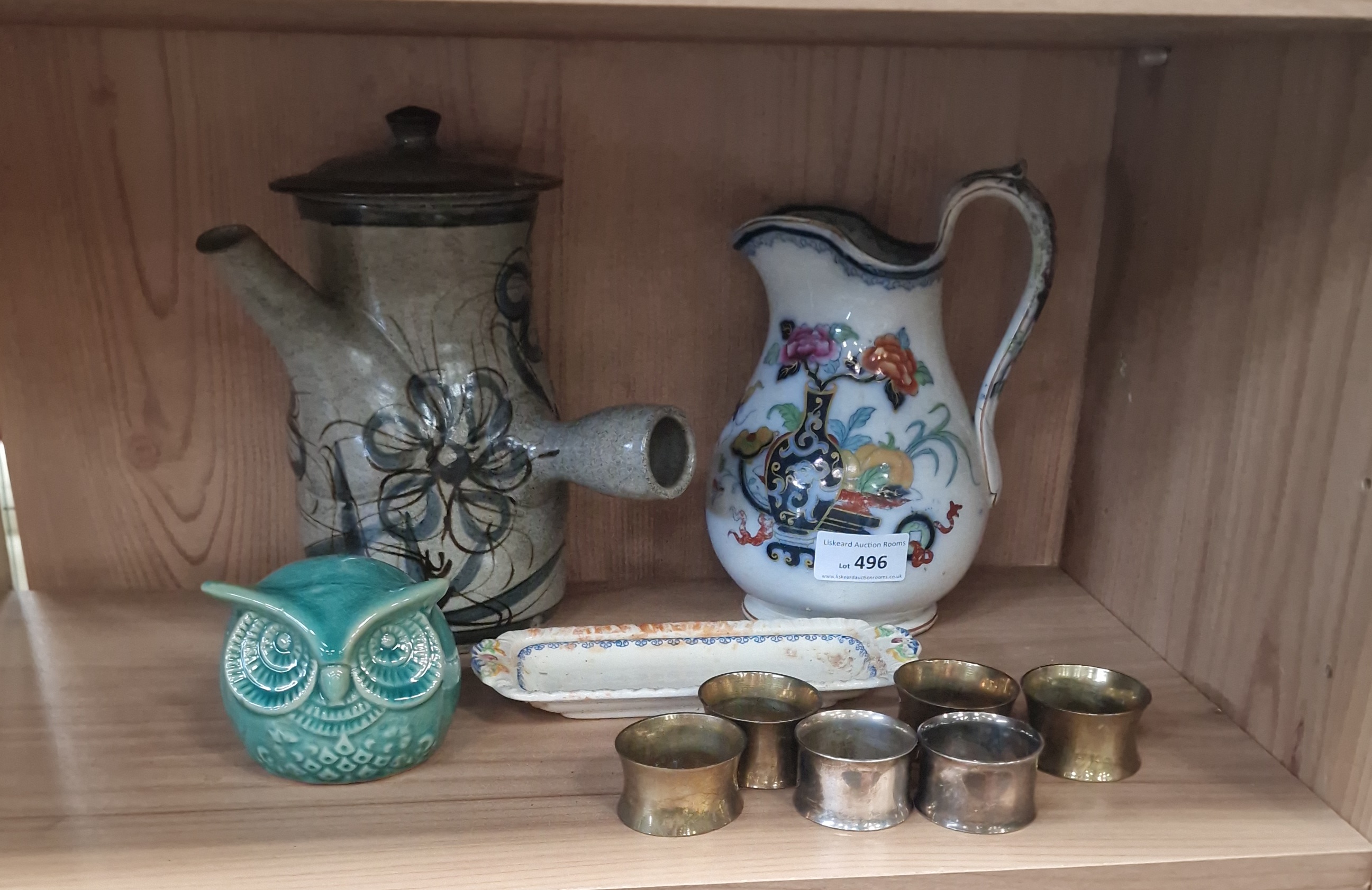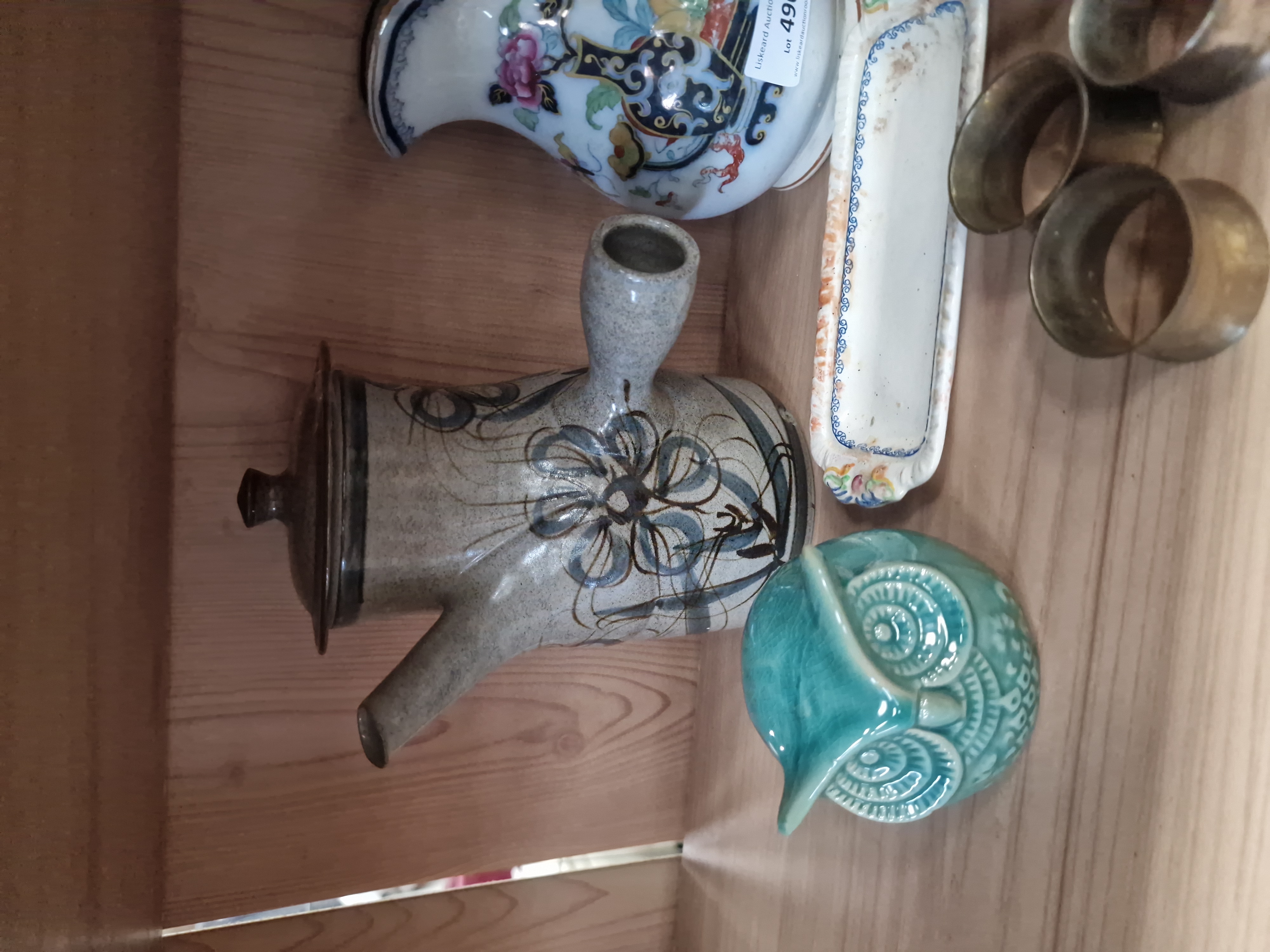 An assortment of decorative items and tableware displayed across wooden shelving. The group includes a white ceramic pitcher with polychrome decoration in an Oriental style featuring floral and vase motifs. Also present is a rustic stoneware pouring vessel with a side handle and dark lid, decorated with stylised floral designs in blue and black. The collection further comprises a moulded ceramic owl figurine with a turquoise glaze, a small rectangular ceramic dish with a blue and yellow patterned border, and several metal napkin rings in brass and silver-toned finishes. Additional items include a green and white malachite-effect lidded urn with gilt accents, two white ribbed ceramic pots, a small glazed ceramic bowl, and various pieces of clear and cut glassware. No maker’s marks are visible on the surfaces of the items.