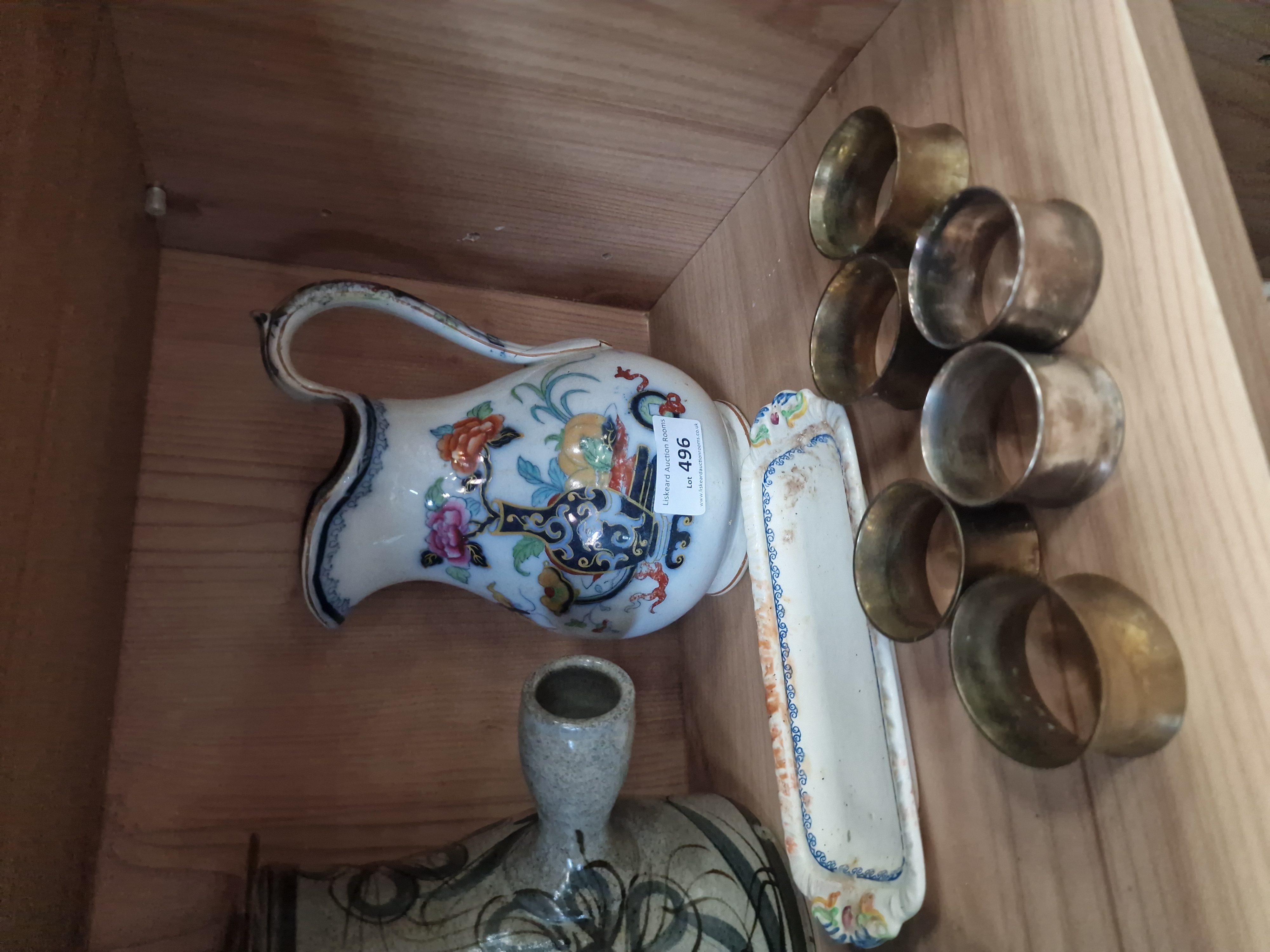 The items are in generally fair condition. The small rectangular dish shows surface wear and staining. The metal napkin rings exhibit tarnish and surface oxidisation. General light wear and minor surface marks consistent with age and use are present across the collection.