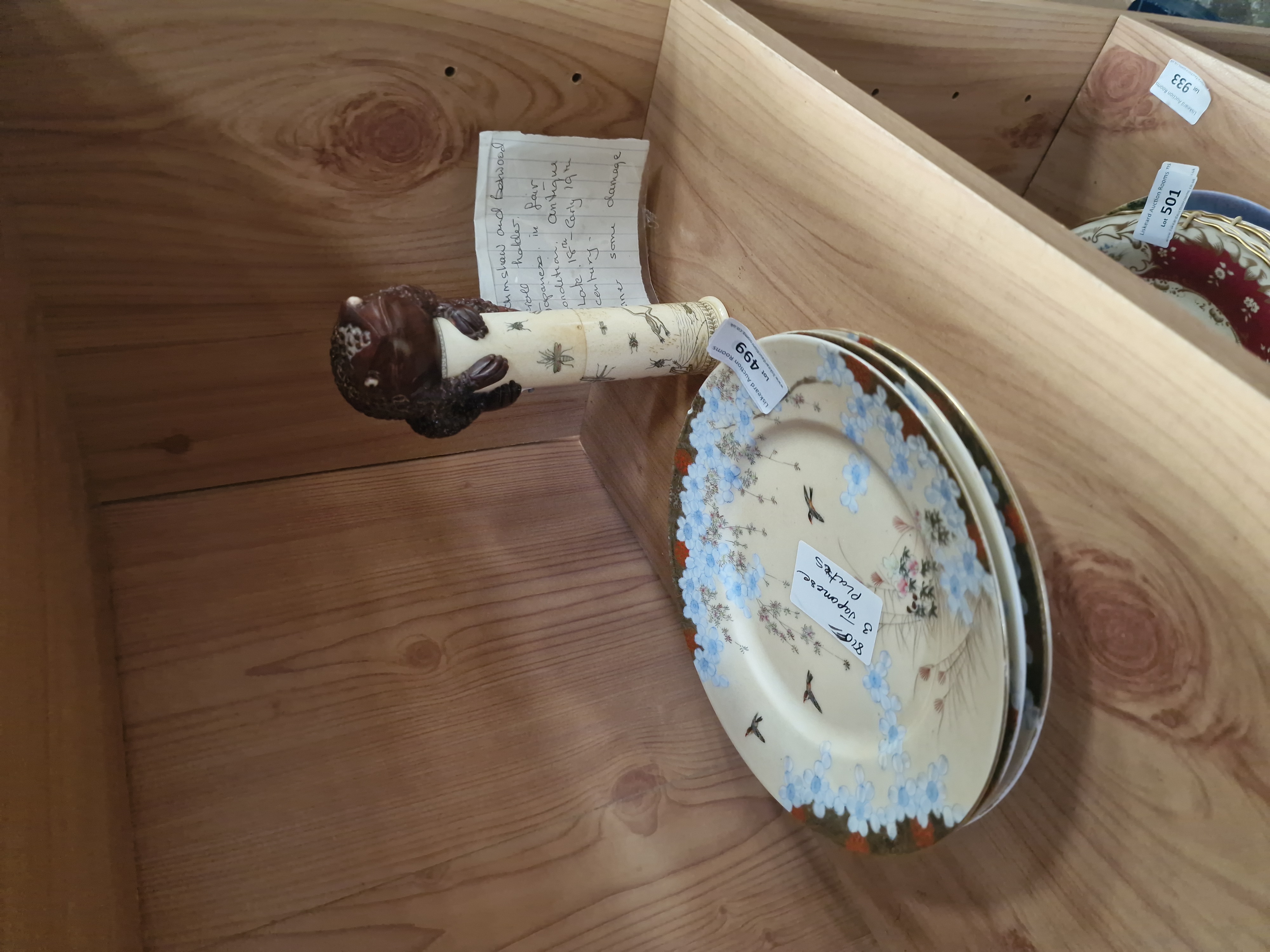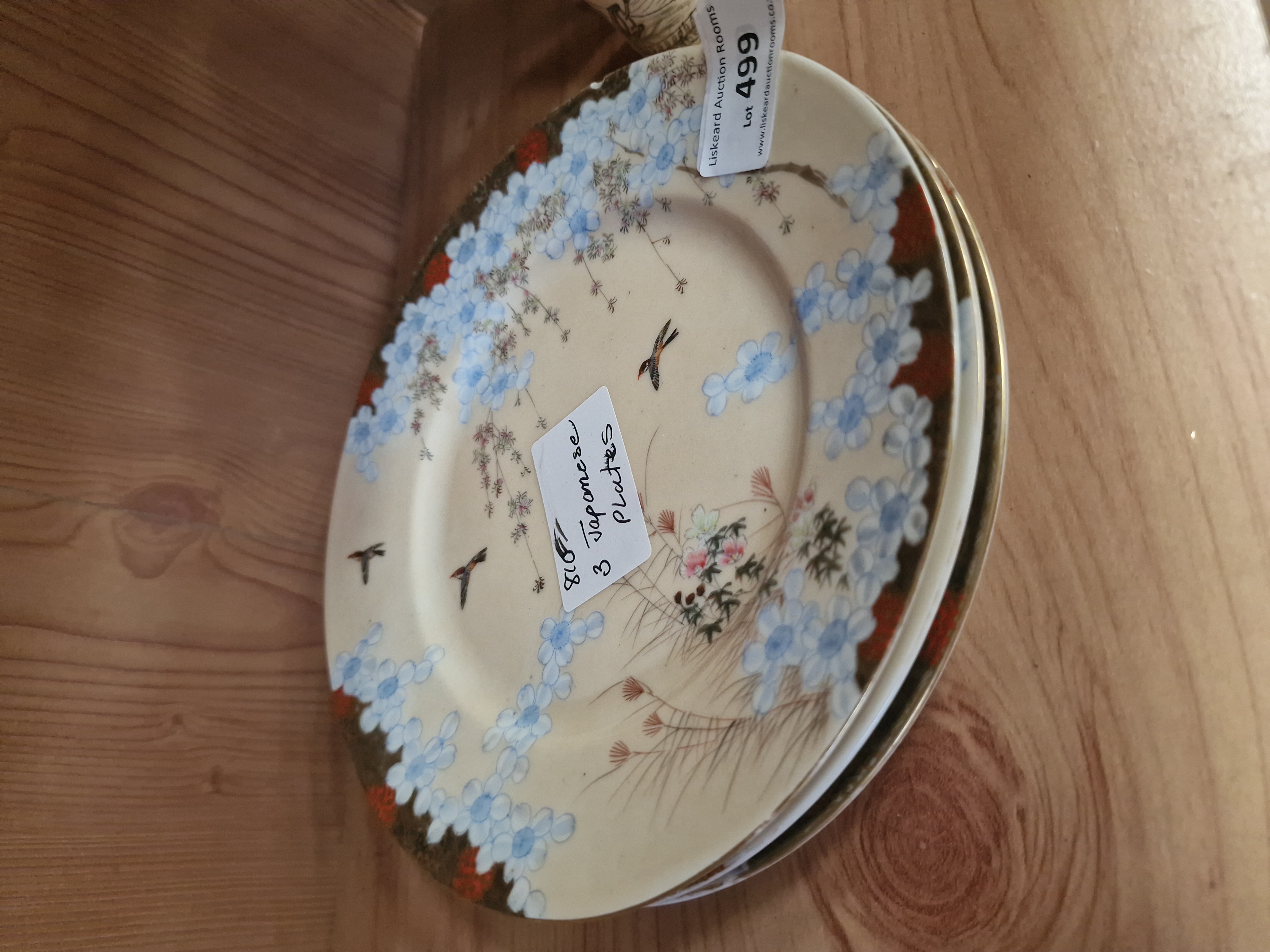 Lot 499: A Trio of Japanese Meiji Porcelain Plates and a Late Edo Boxwood and Bone Scroll Holder