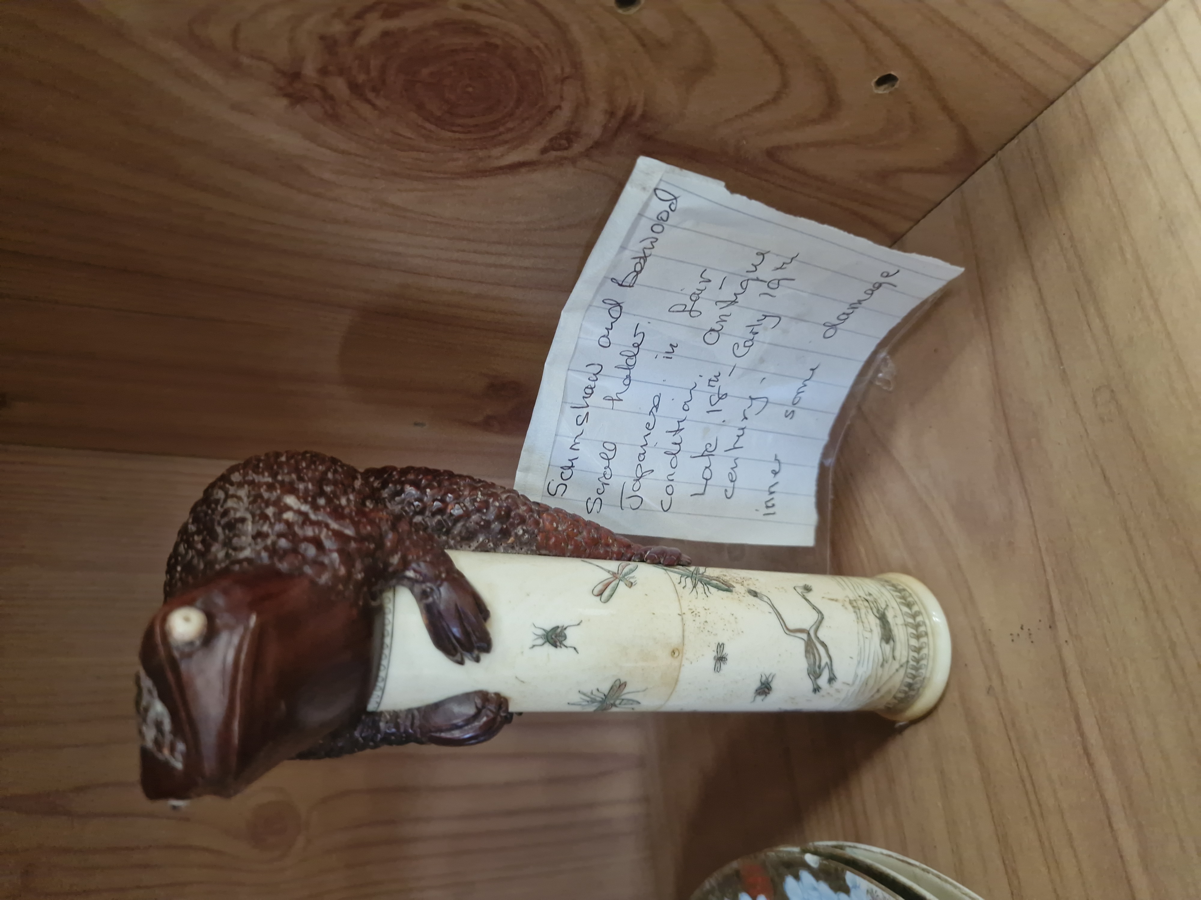 A set of three porcelain dessert plates dating to the Meiji (1868-1912) or Taisho (1912-1926) period. The plates are decorated with hand-painted birds in flight amongst grasses and flowering branches, with a border of light blue blossoms and iron-red highlights. Also included is a Japanese scroll holder from the late Edo period (late 18th to early 19th century). The holder consists of a central bone sleeve with scrimshaw engravings depicting insects and a frog, held by a carved boxwood figure of a toad with a textured surface and inlaid eyes. No maker marks are visible on any of the items.