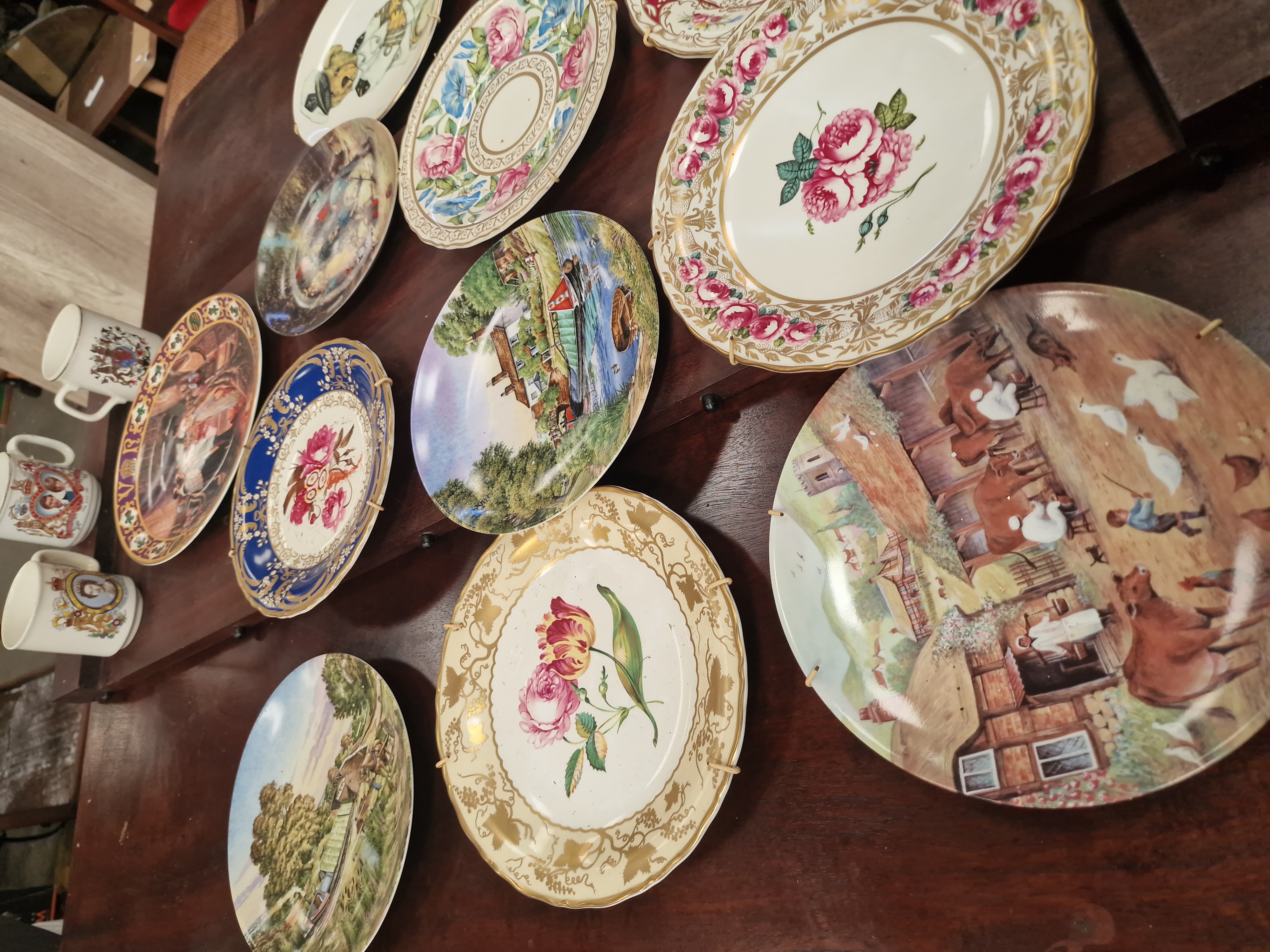An assortment of sixteen ceramic items comprising thirteen decorative cabinet plates and three commemorative mugs. The collection features a variety of British topographical, floral, and royal themes, primarily dating from the mid-to-late 20th century. Included is a large plate commemorating the coronation of Queen Victoria, decorated with a central scene and the monogram V. R. within the border. The three cylindrical mugs include a 1977 Silver Jubilee of Queen Elizabeth II example, a 1981 Royal Wedding commemorative for Prince Charles and Lady Diana Spencer, and one featuring a royal coat of arms. The pictorial plates include four scenes of English rural canals with narrowboats, one bearing the name HERON, alongside a traditional farmyard scene with livestock and a winter scene with children. One plate depicts a teddy bear in a naval officer’s uniform. The floral plates feature central sprays of roses and tulips with decorative borders in claret, cobalt blue, and cream, many accented with gilt scrollwork and patterns. Several plates are fitted with wire wall-hanging frames. The items are constructed from a mix of glazed earthenware and fine bone china. No maker’s marks are visible on the surfaces; however, the subjects and style indicate British manufacture, likely from the Staffordshire potteries region.