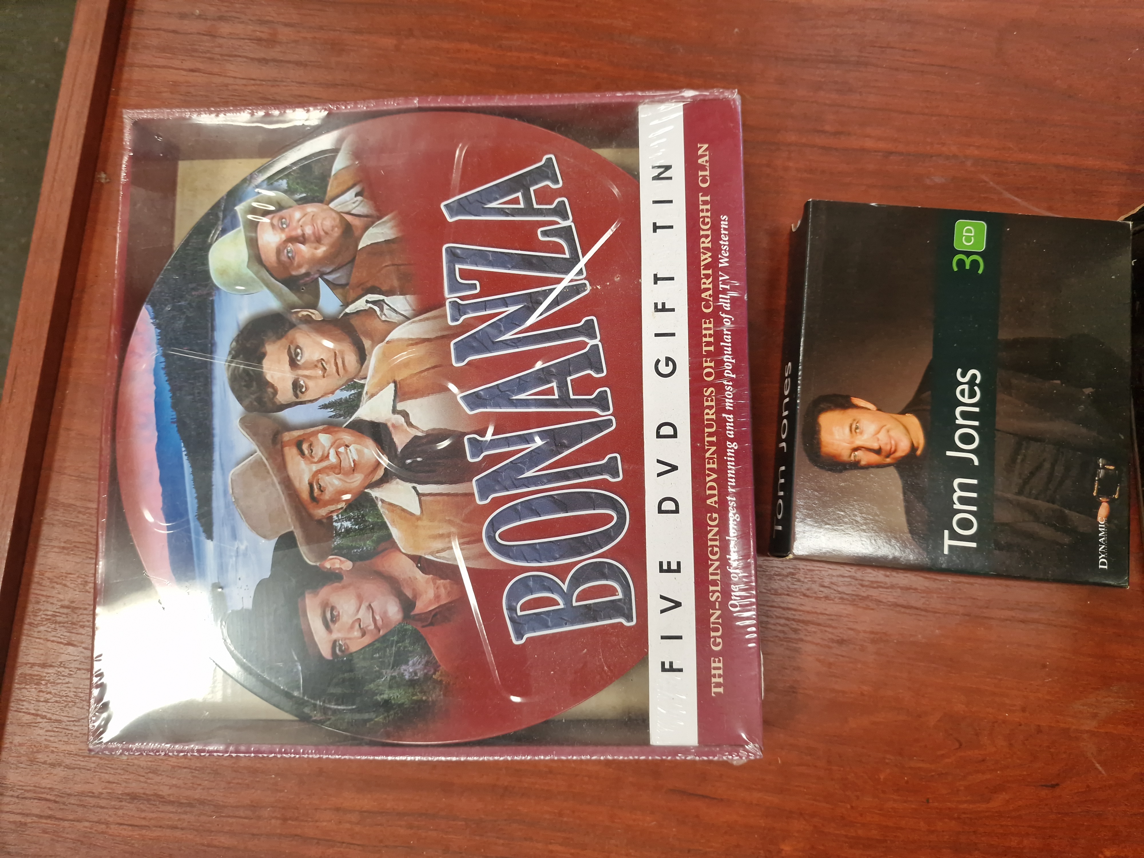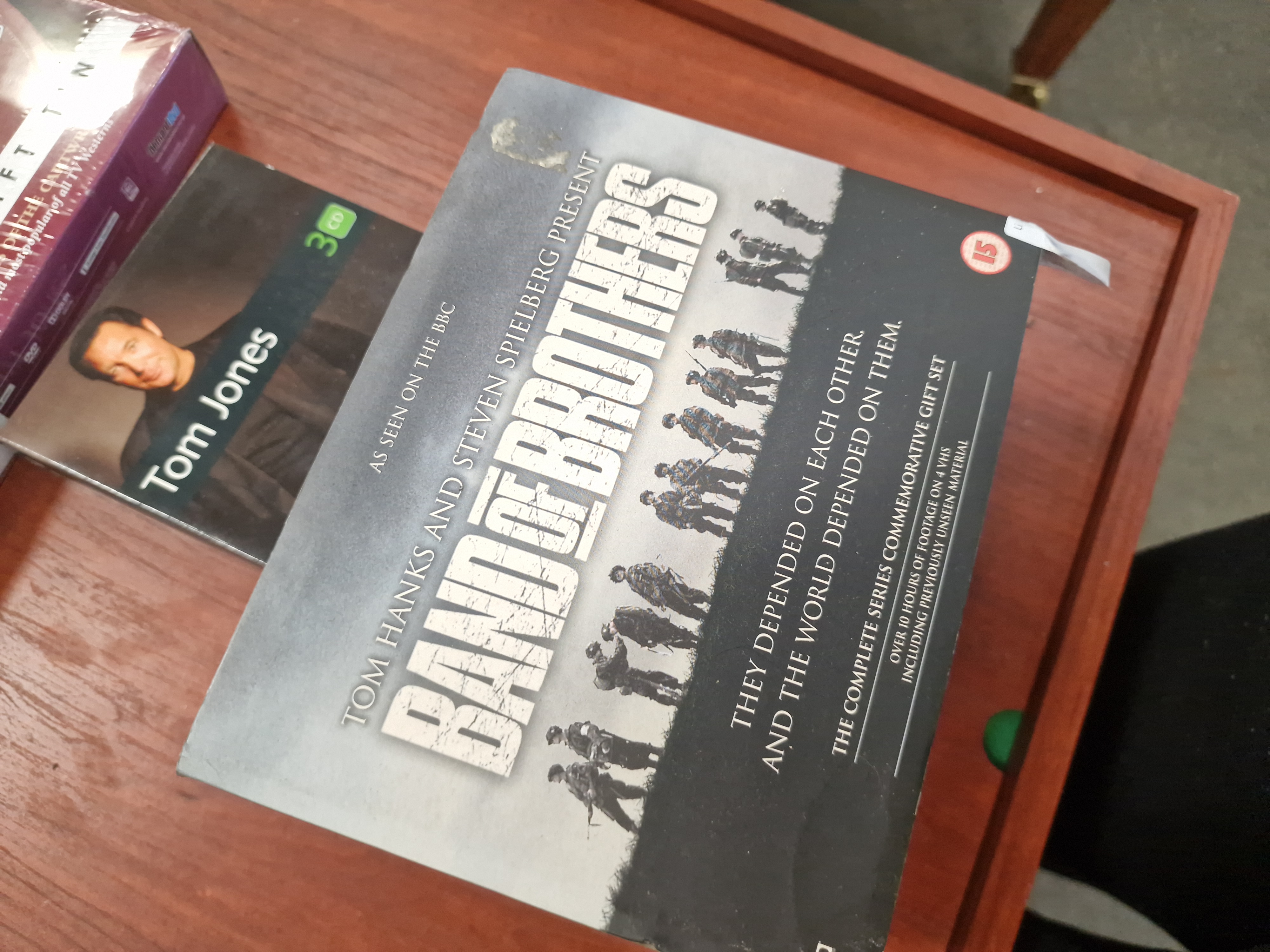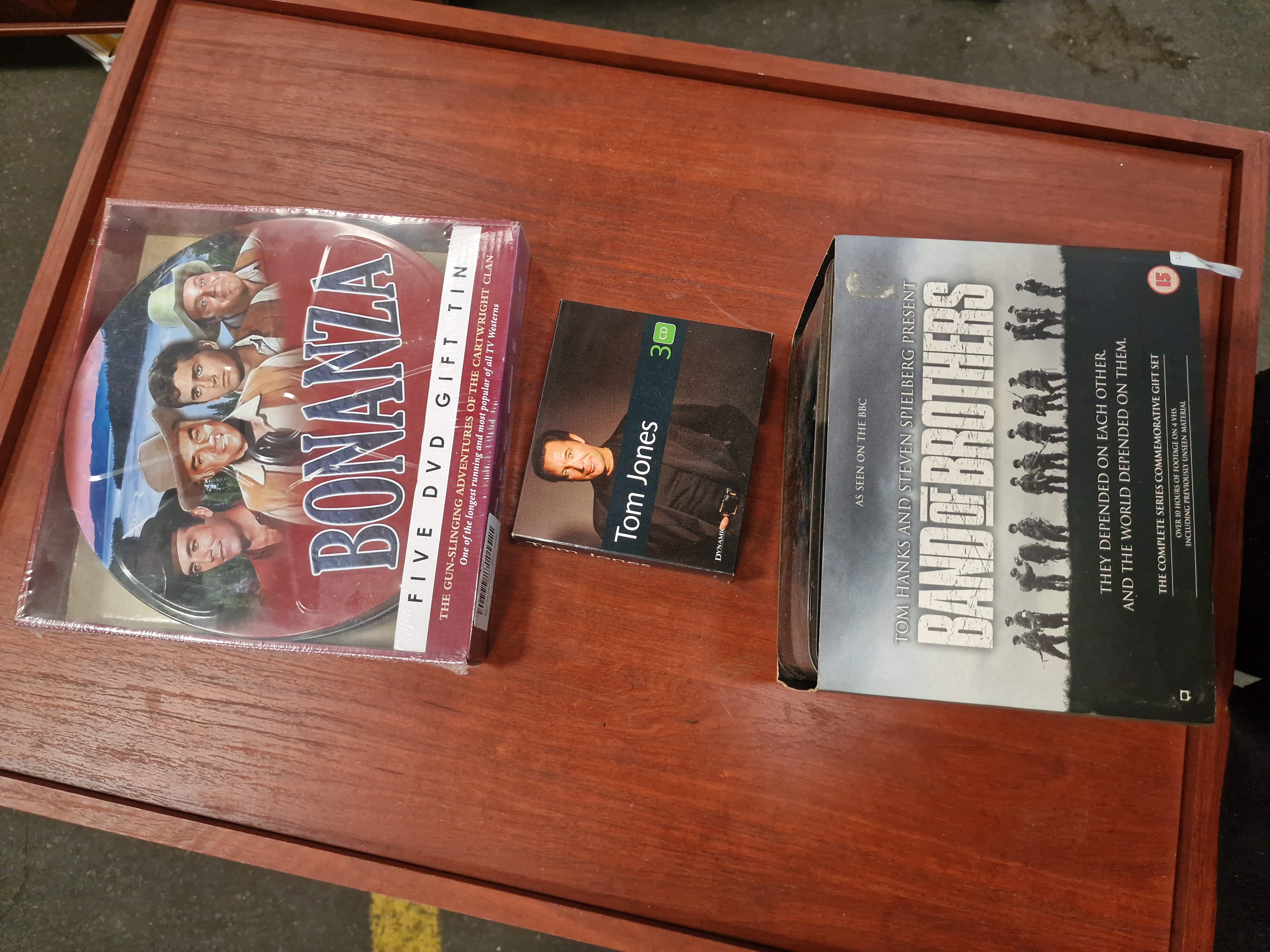 The Bonanza DVD set is factory sealed in its original plastic shrink-wrap. The Tom Jones CD set is in good used condition. The Band of Brothers VHS slipcase exhibits minor shelf wear, including rubbing and light compression to the corners and edges, with a small piece of adhesive tape or sticker residue on the top right edge.
